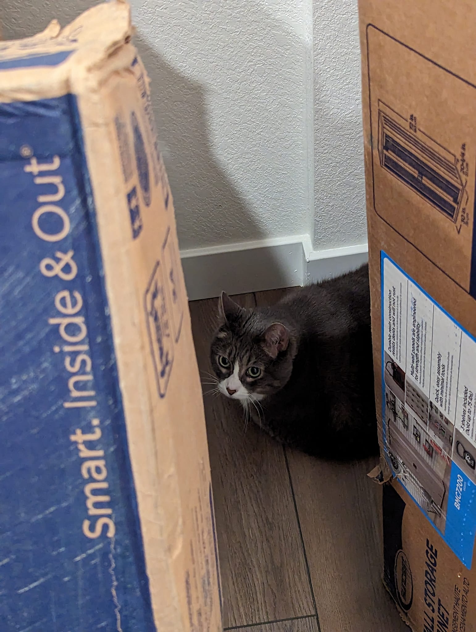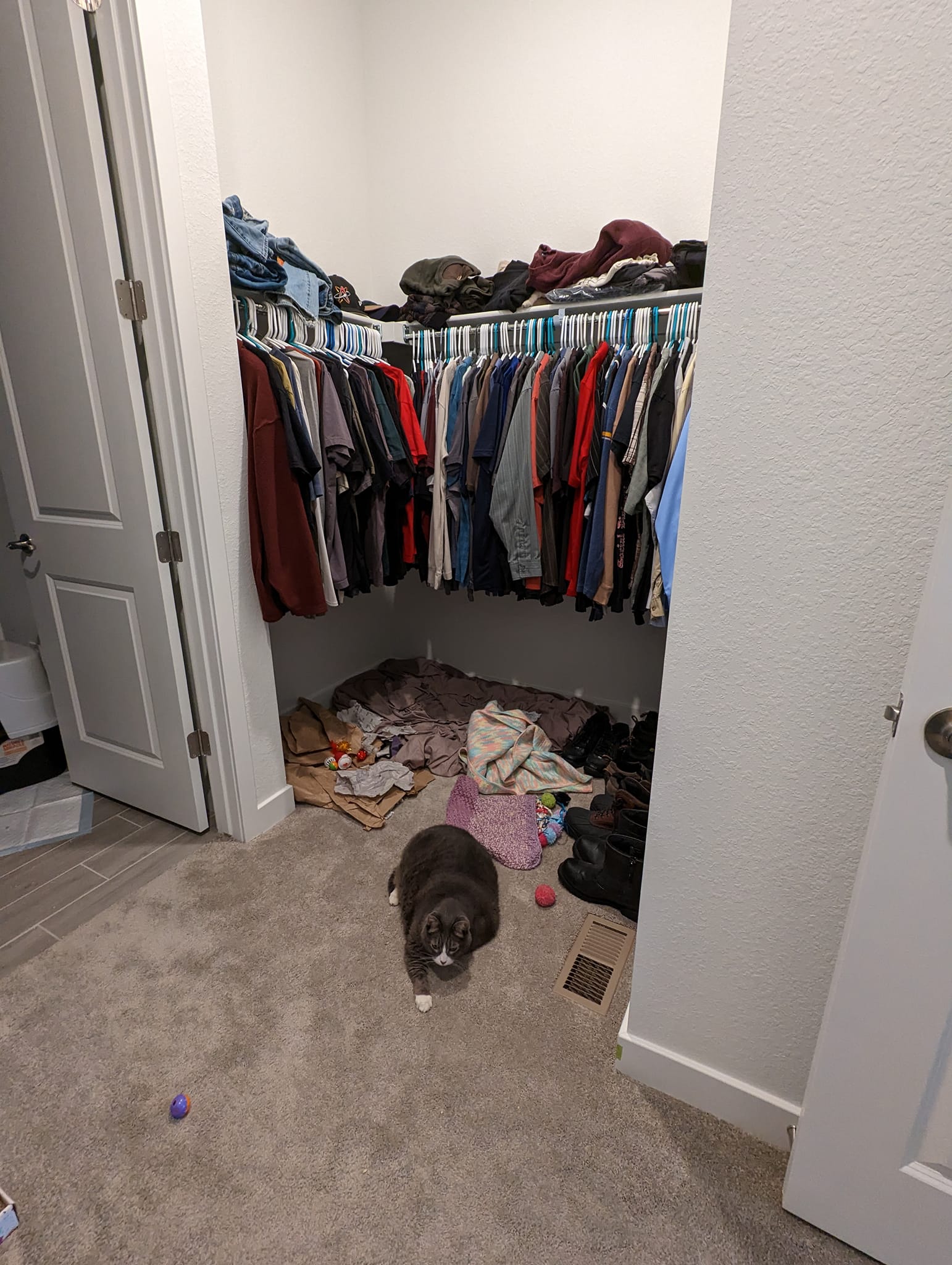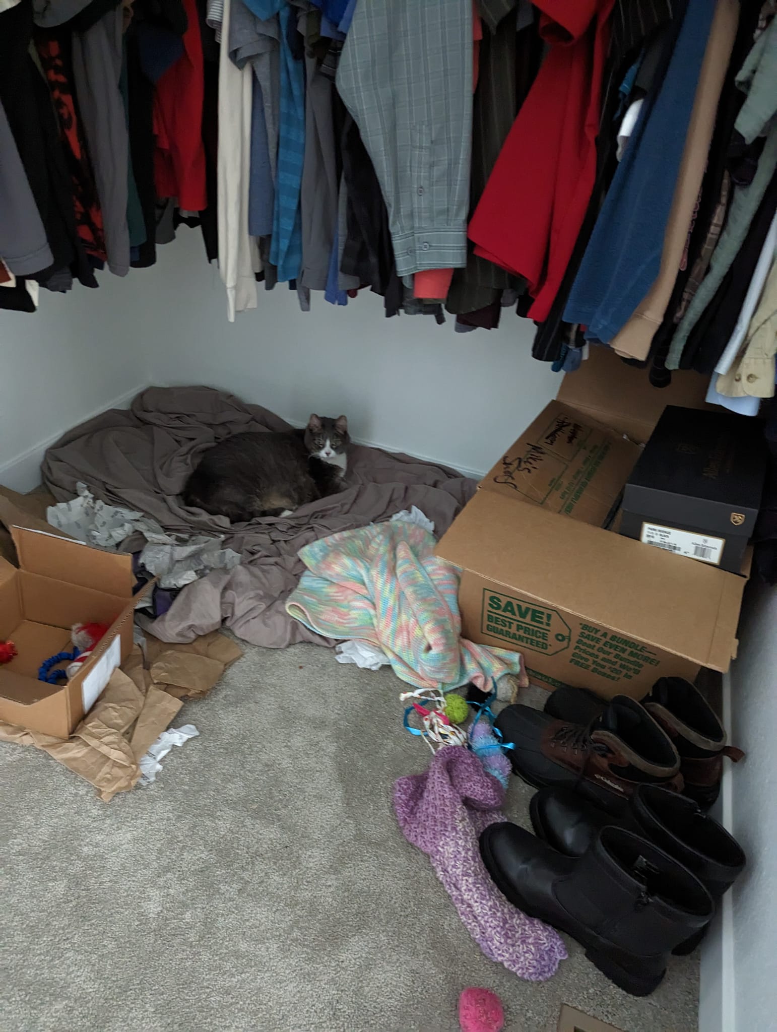 Yesterday's project....our closet is now box free! (and not because I just moved them ??. Really unpacked) Ziggy's nest remains. It is definitely a favorite spot.