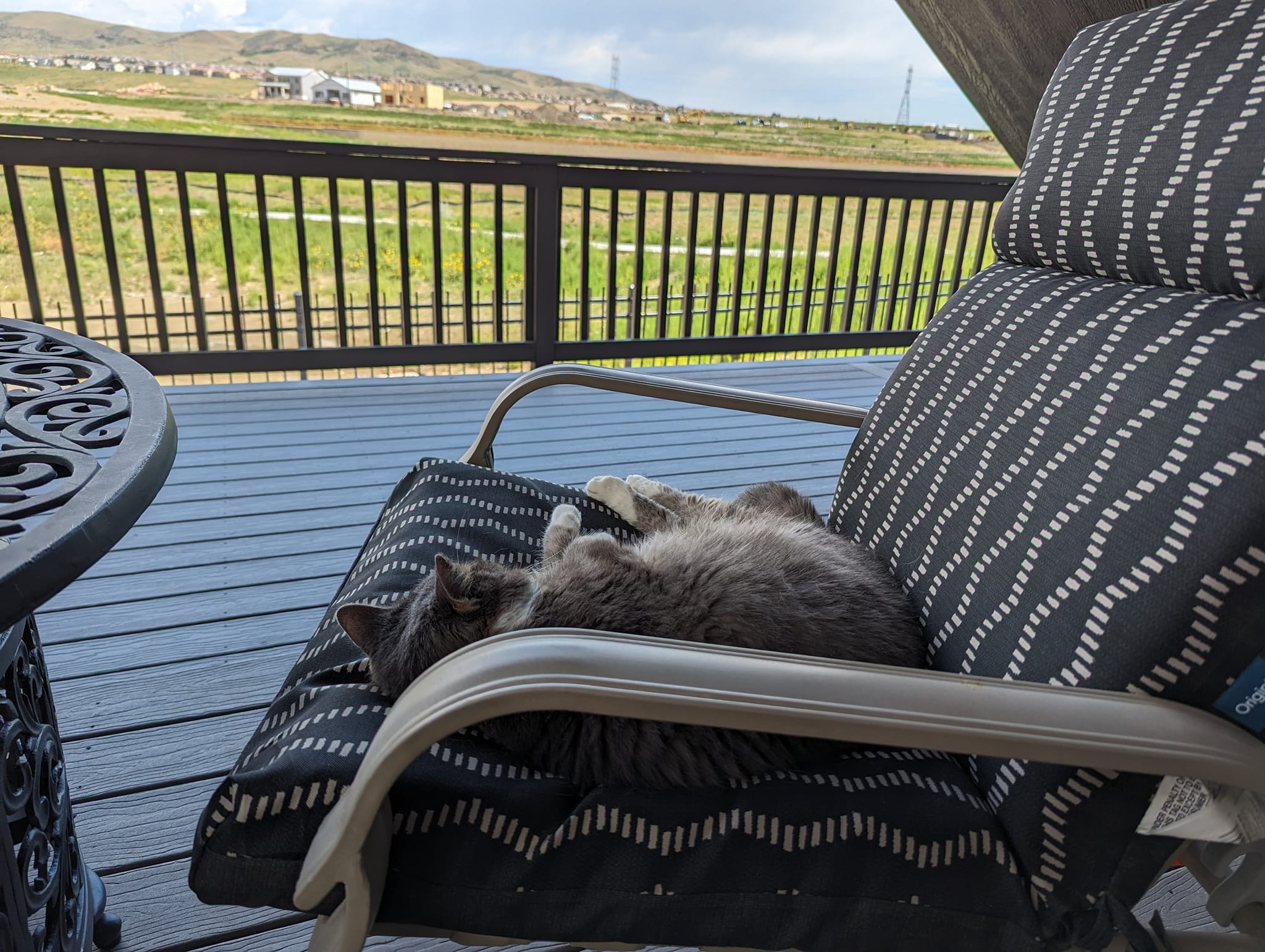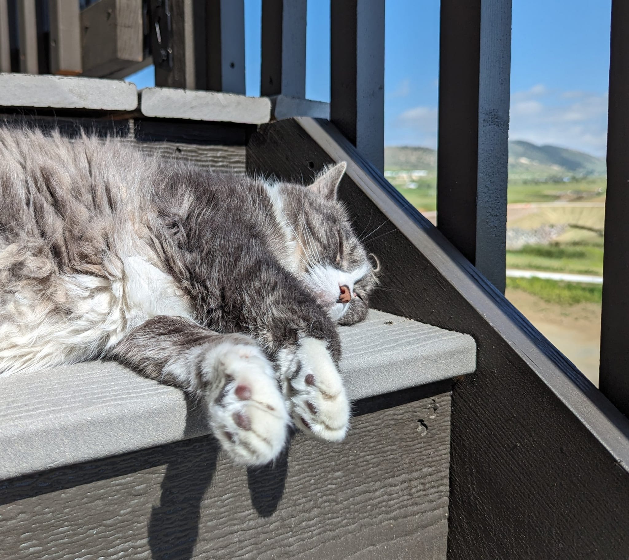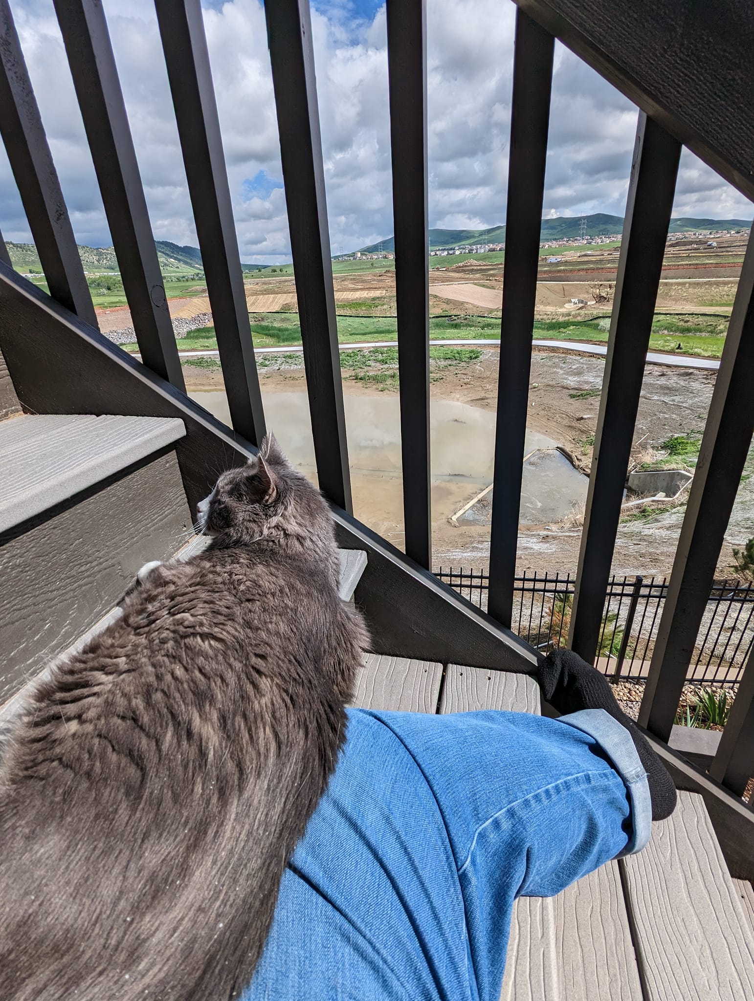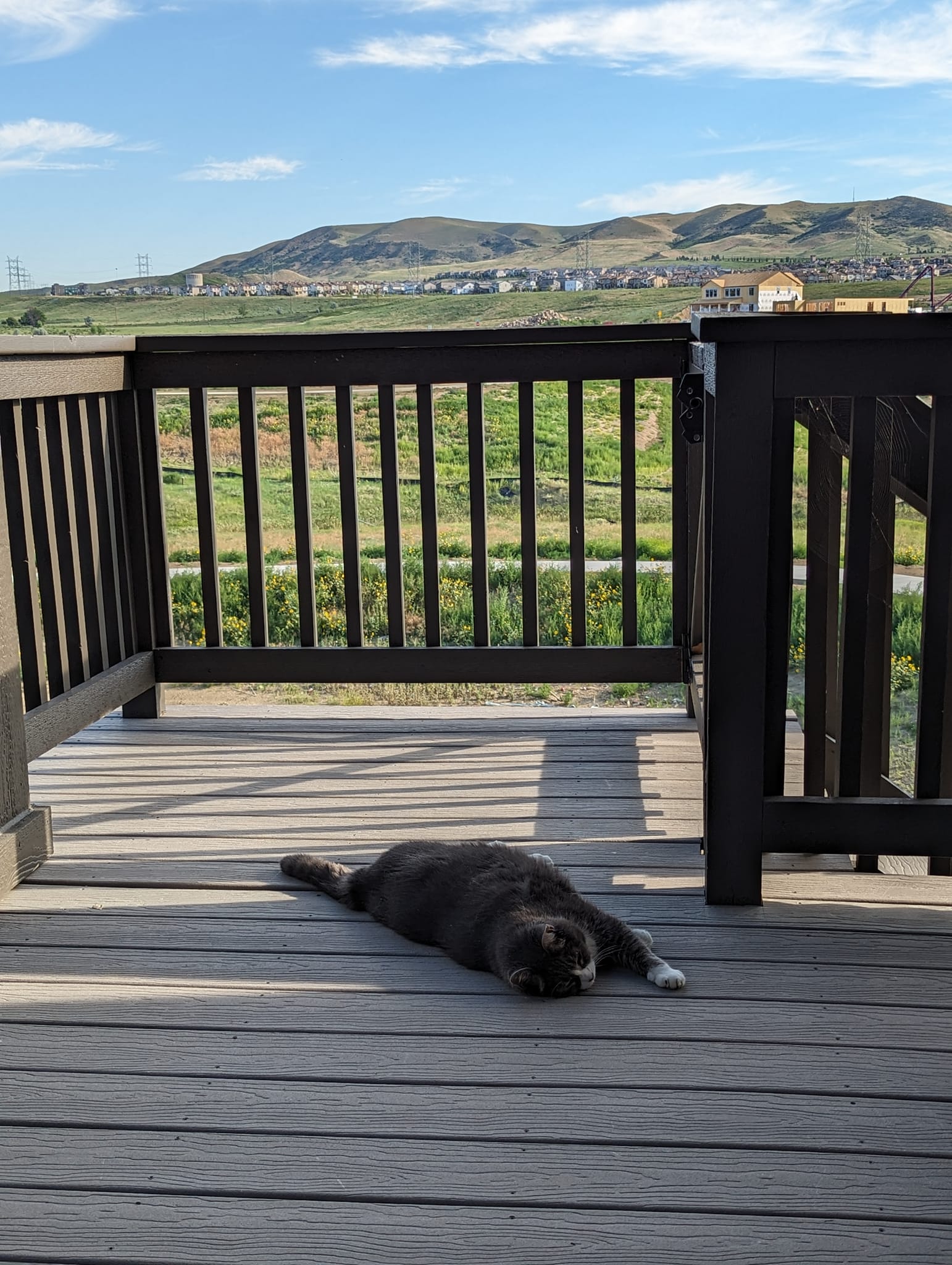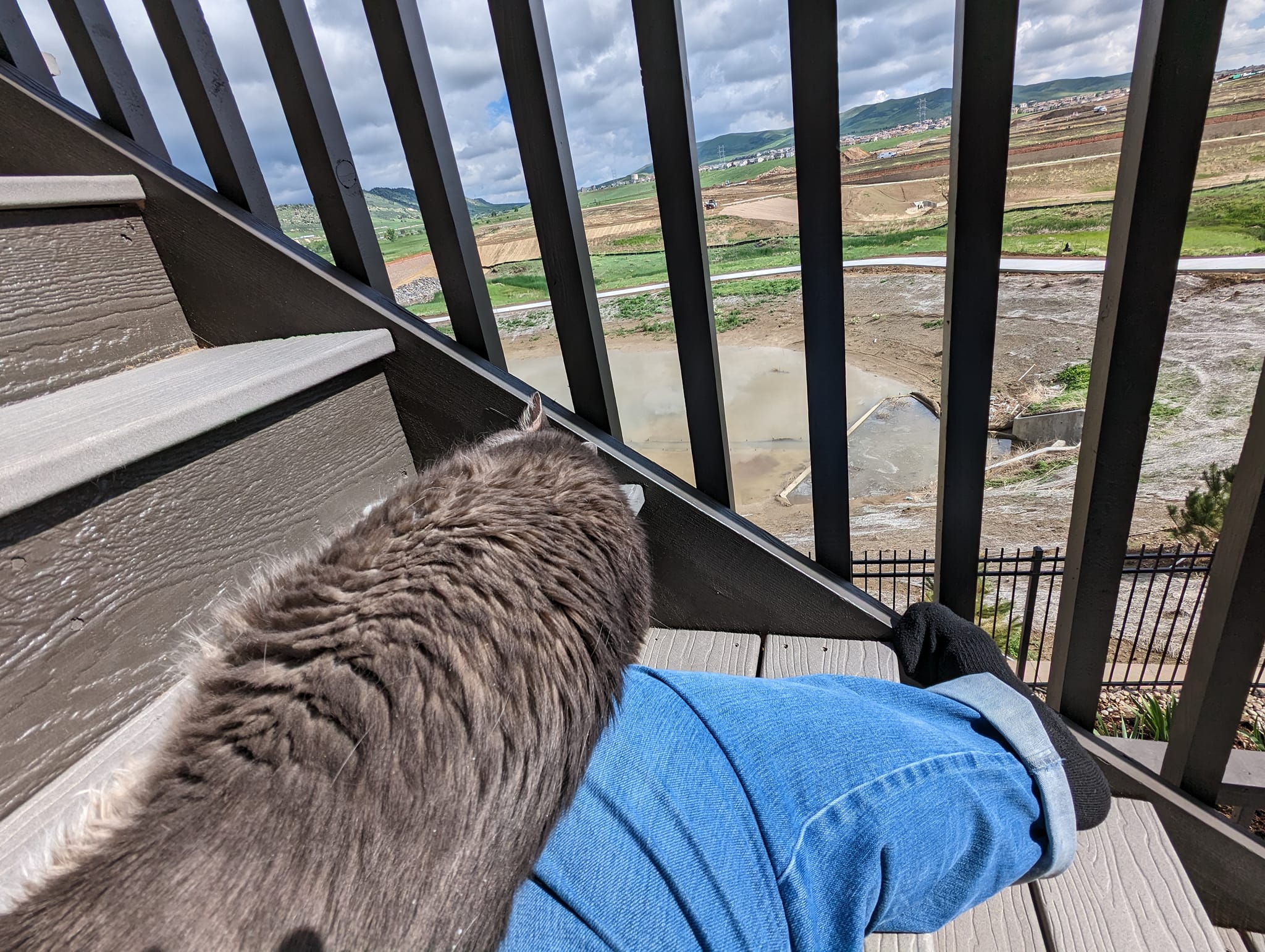 Long day of meetings for a budget replan, but finally getting free of meetings and stepping out of the office to a beautiful twilight view and a sleepy cat was so nice! ??