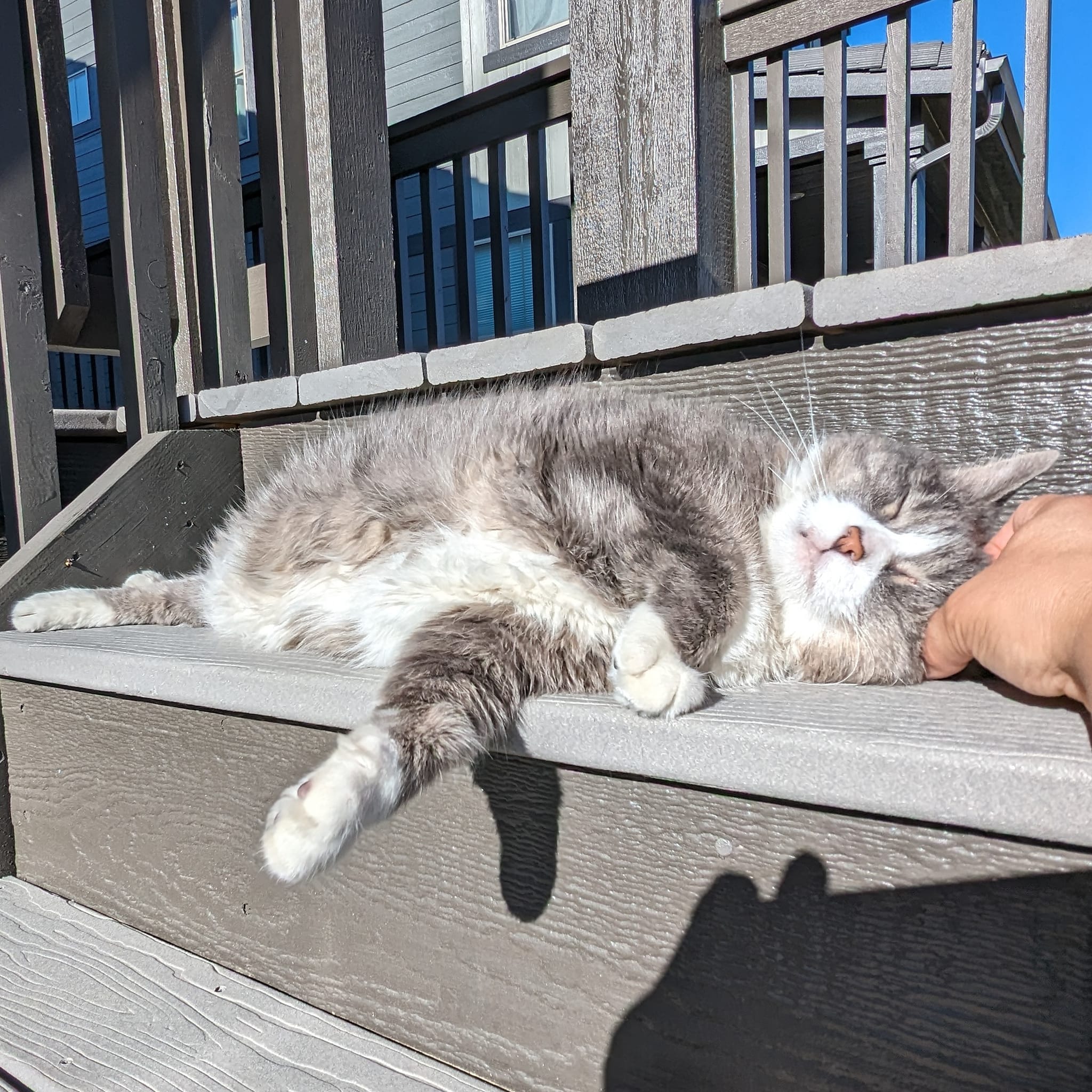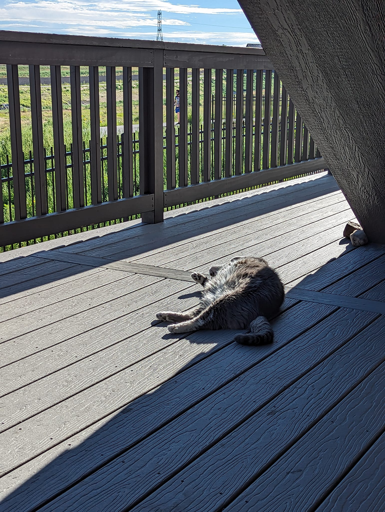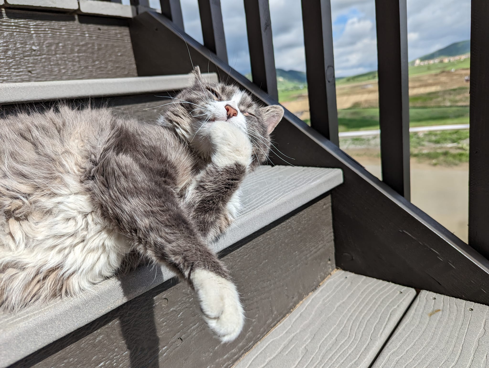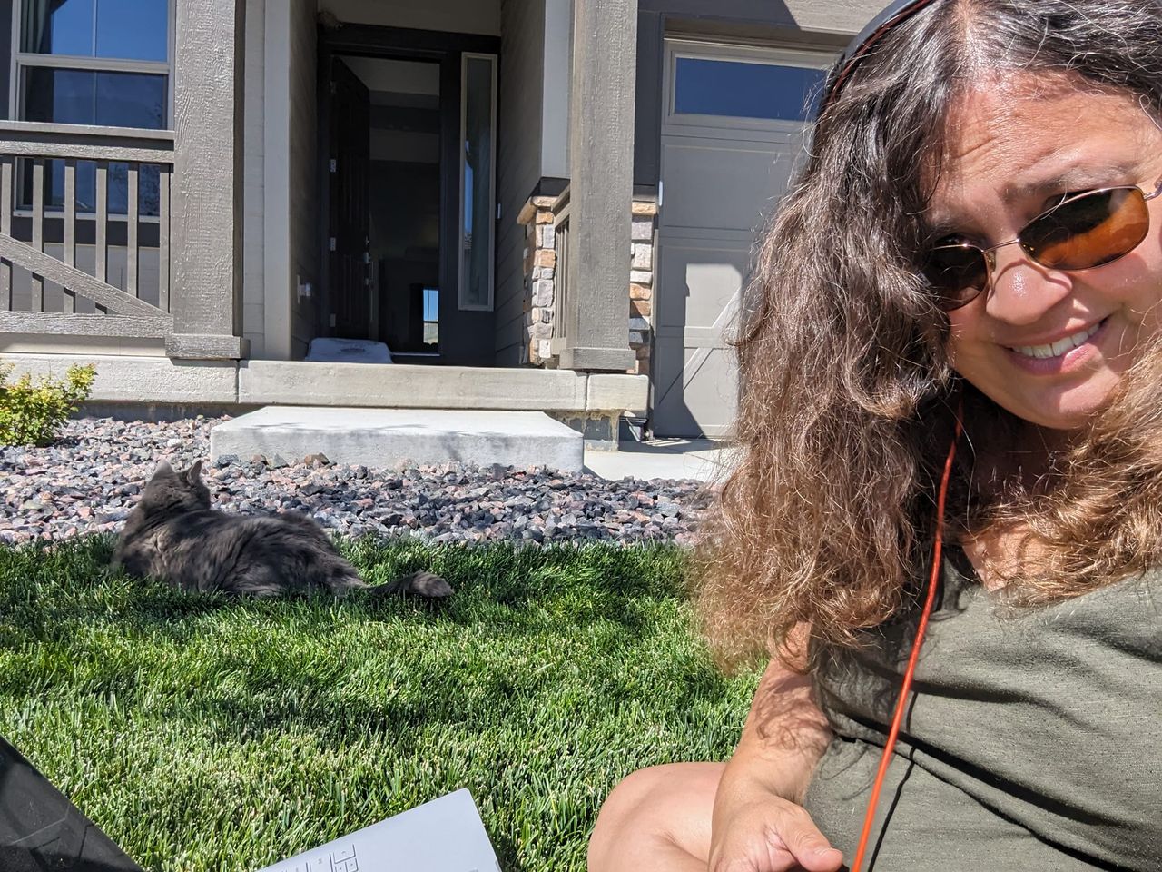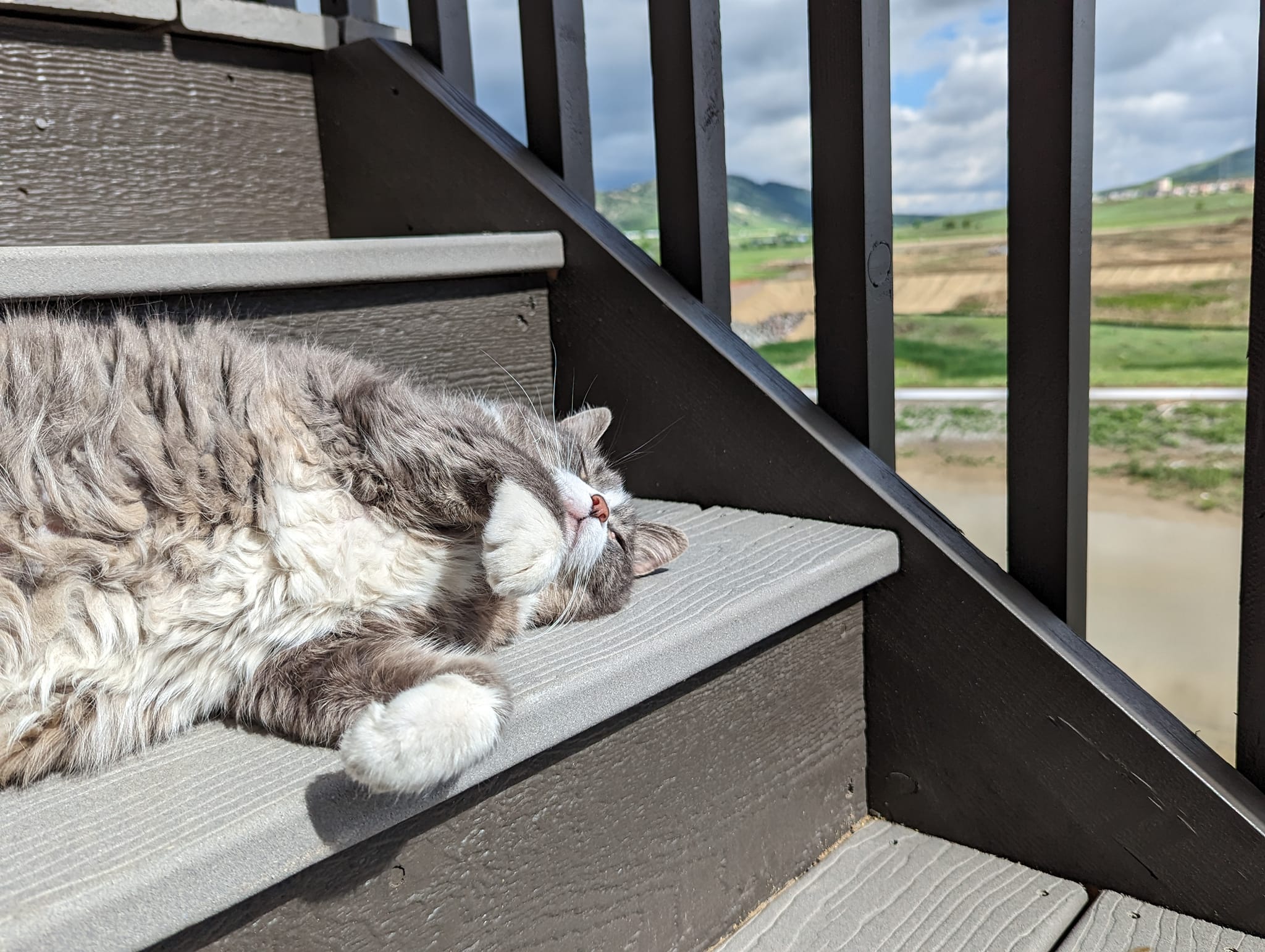 Long day of meetings for a budget replan, but finally getting free of meetings and stepping out of the office to a beautiful twilight view and a sleepy cat was so nice! ??