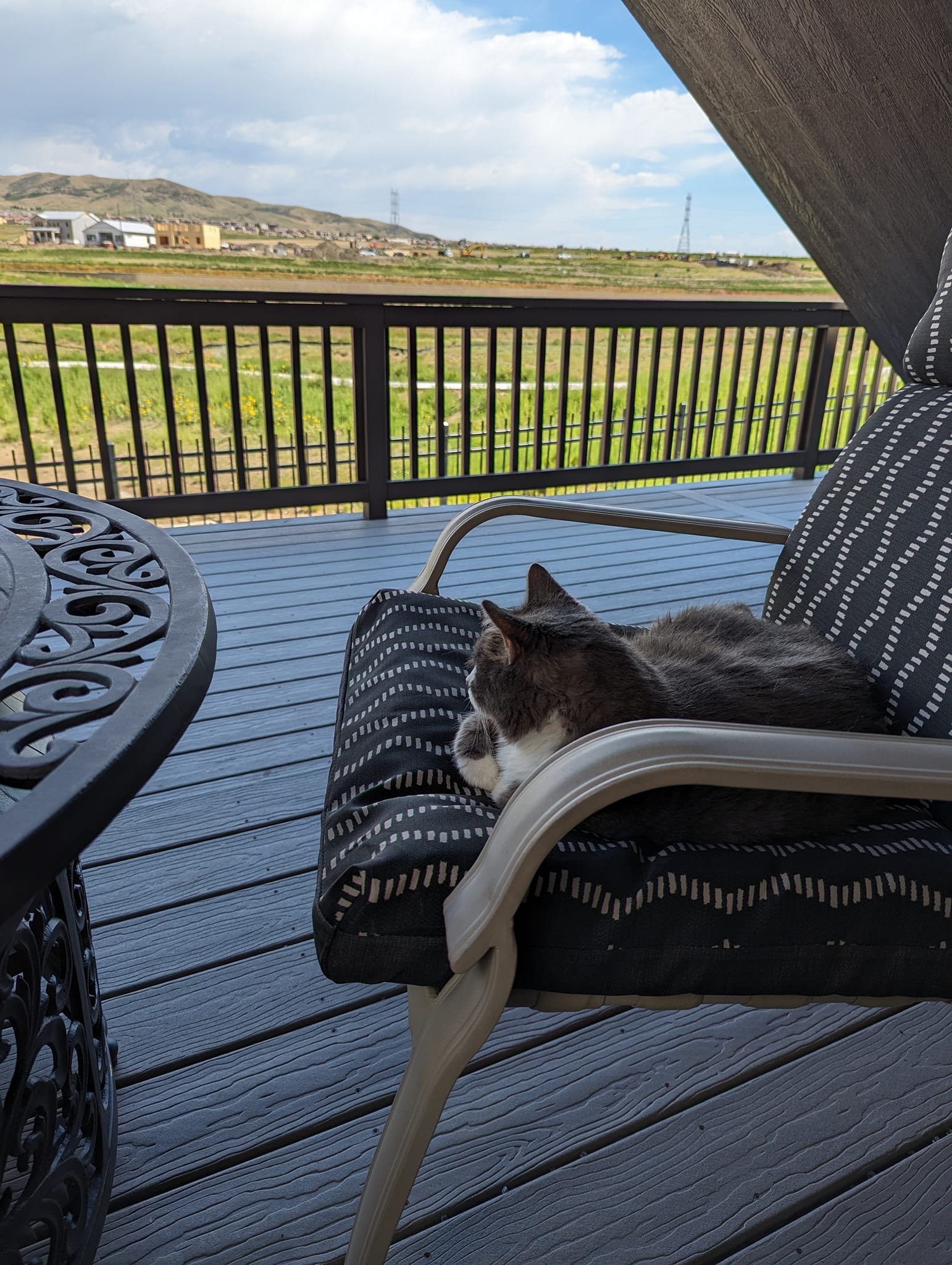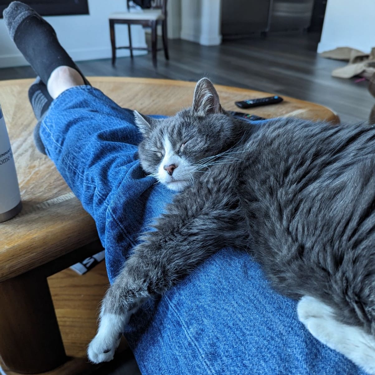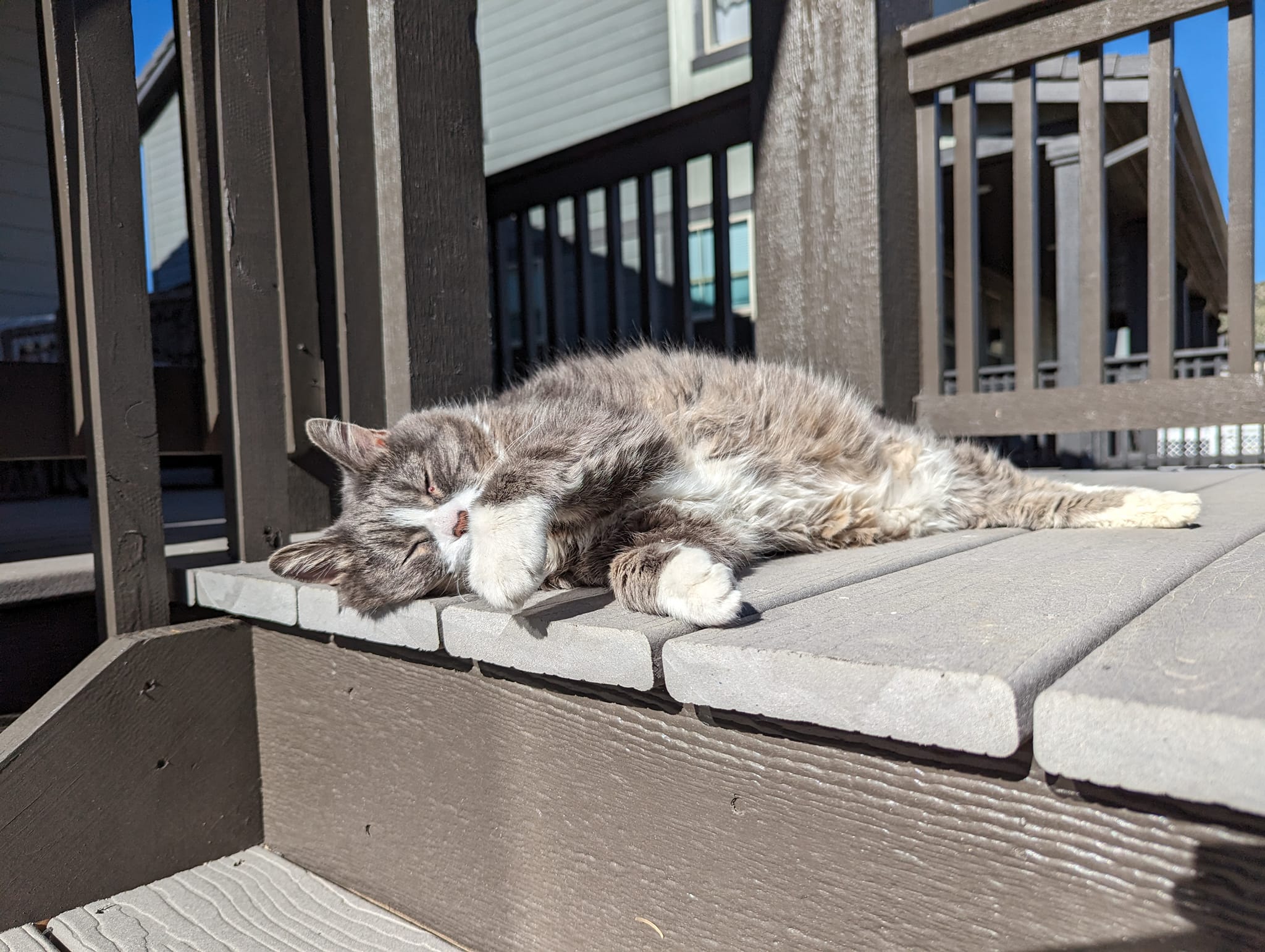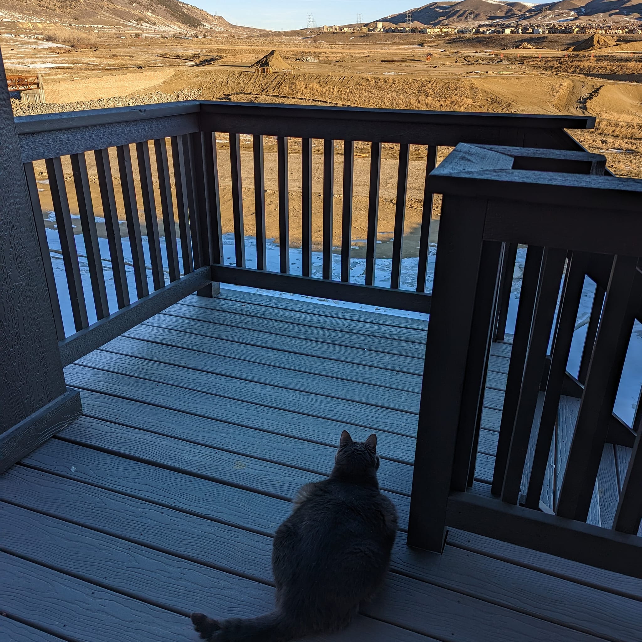 Long day of meetings for a budget replan, but finally getting free of meetings and stepping out of the office to a beautiful twilight view and a sleepy cat was so nice! ??