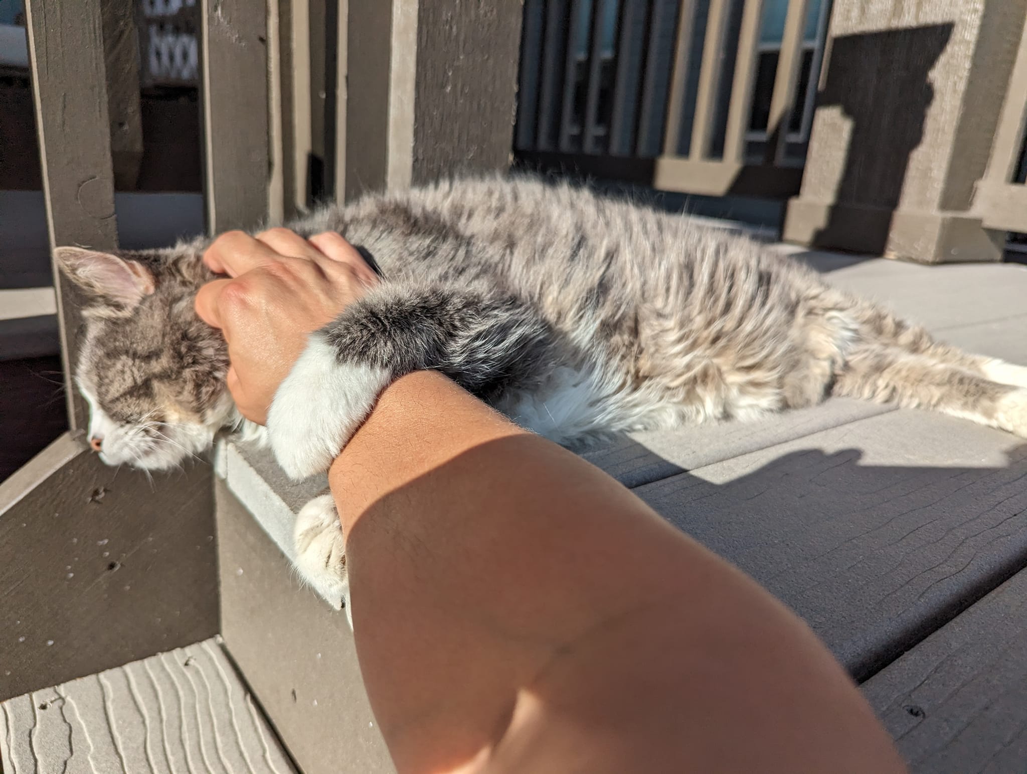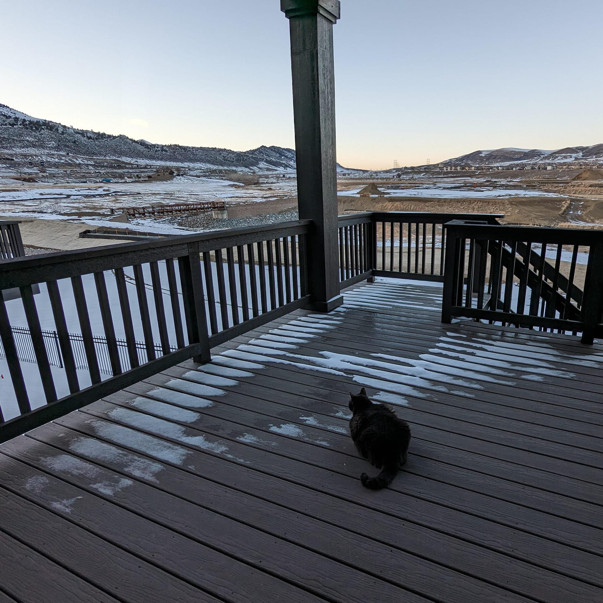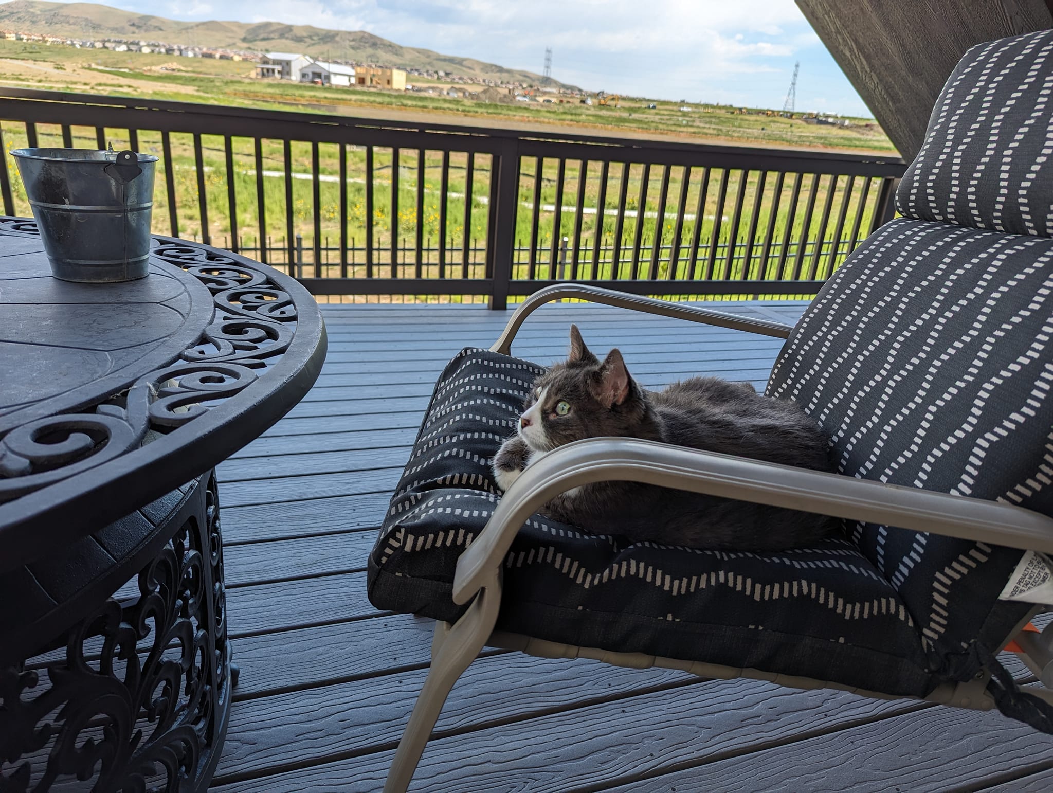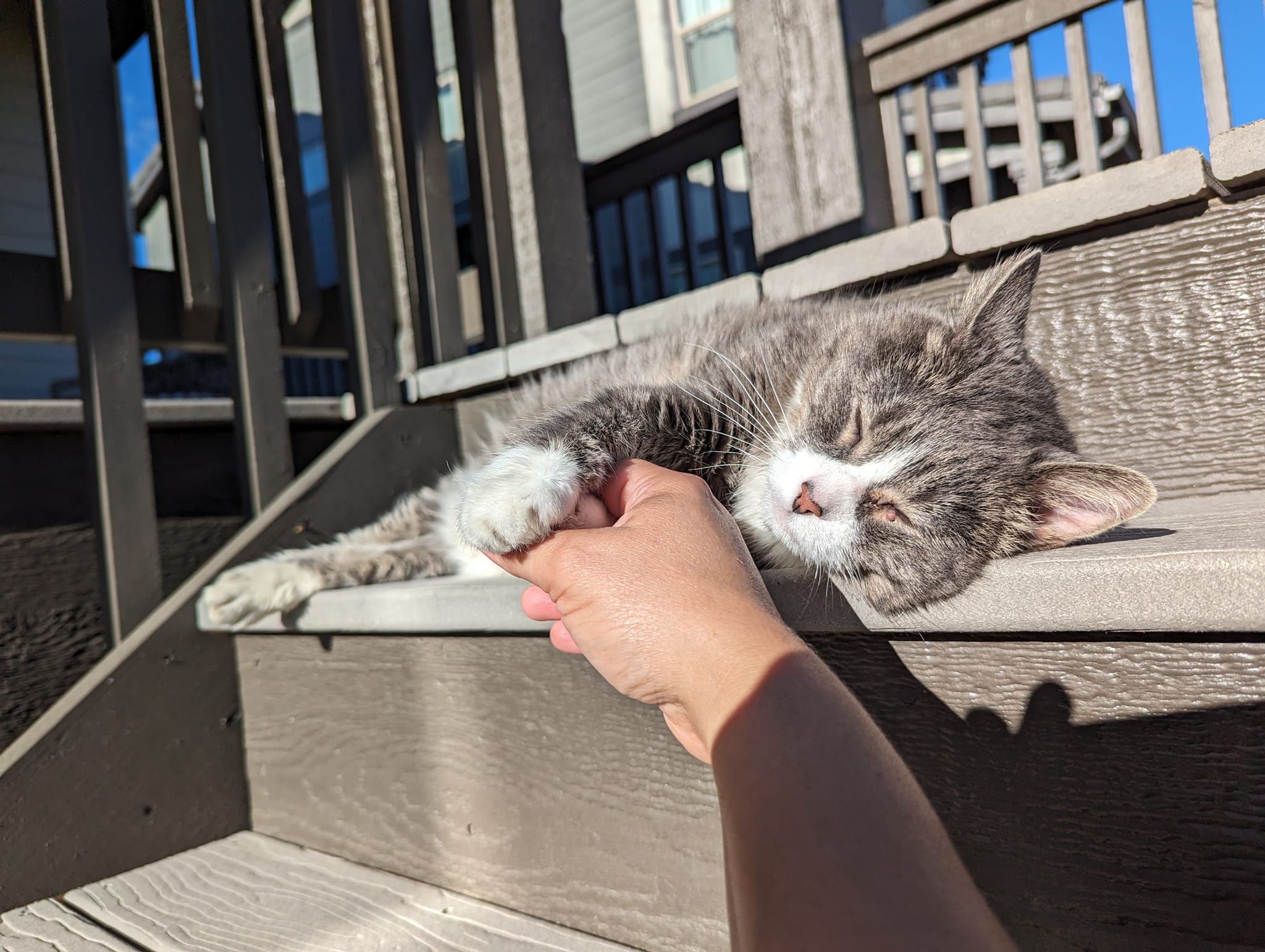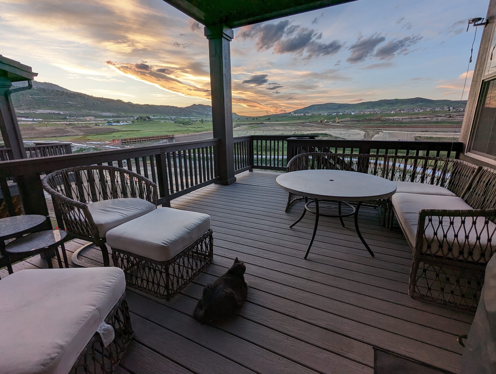 Long day of meetings for a budget replan, but finally getting free of meetings and stepping out of the office to a beautiful twilight view and a sleepy cat was so nice! ??