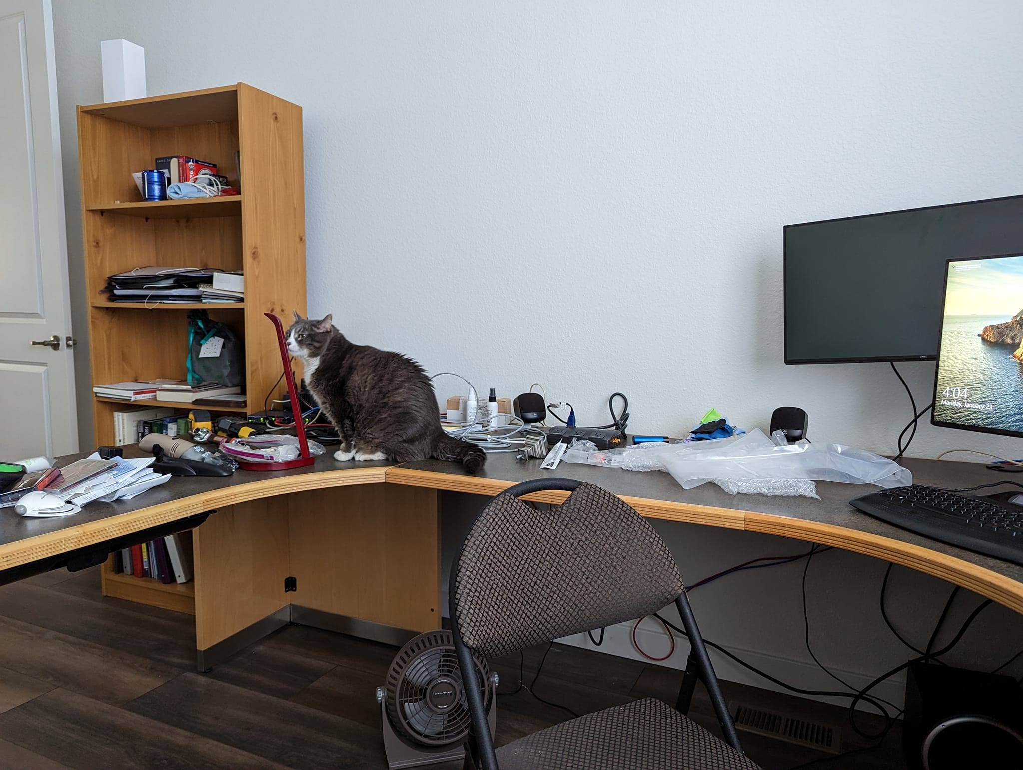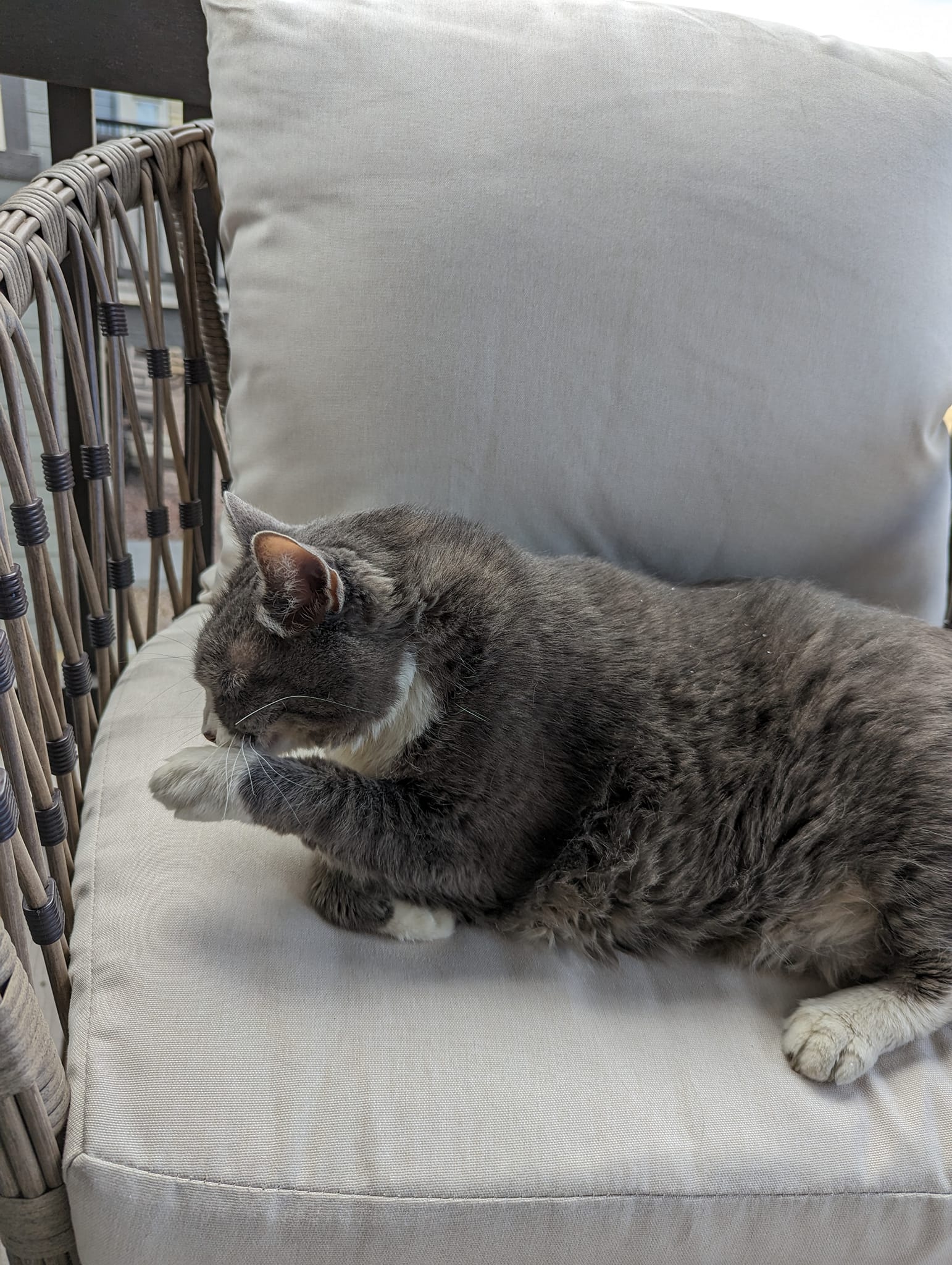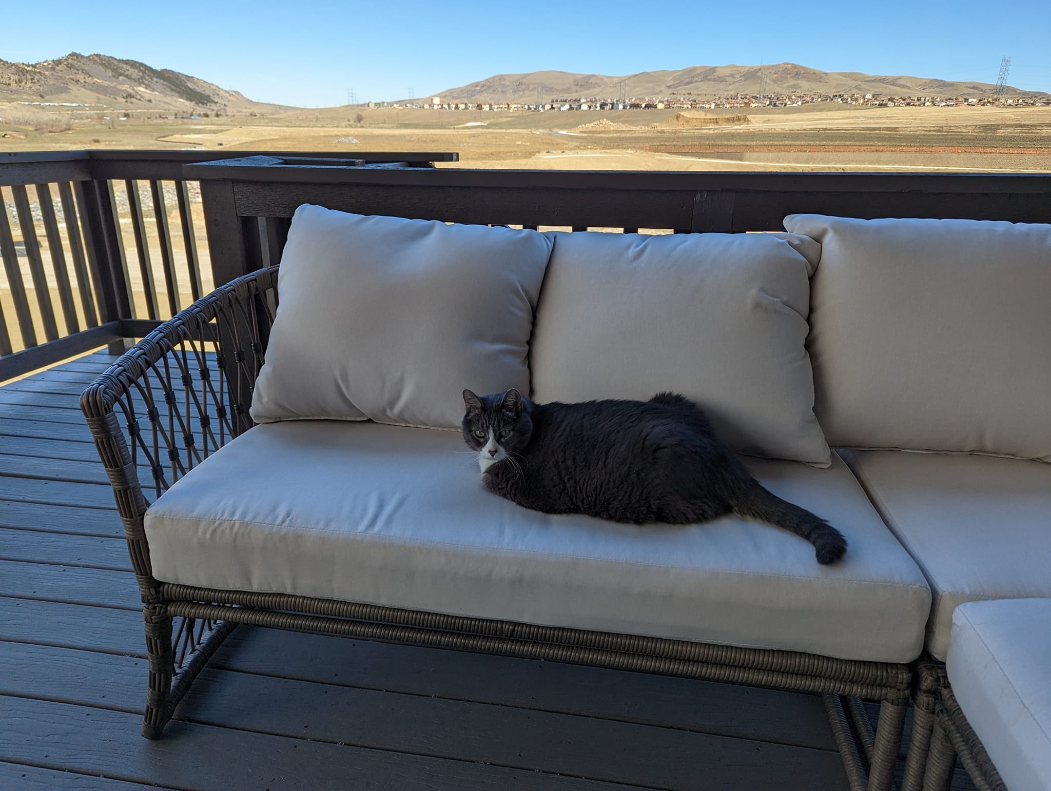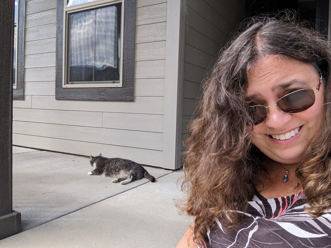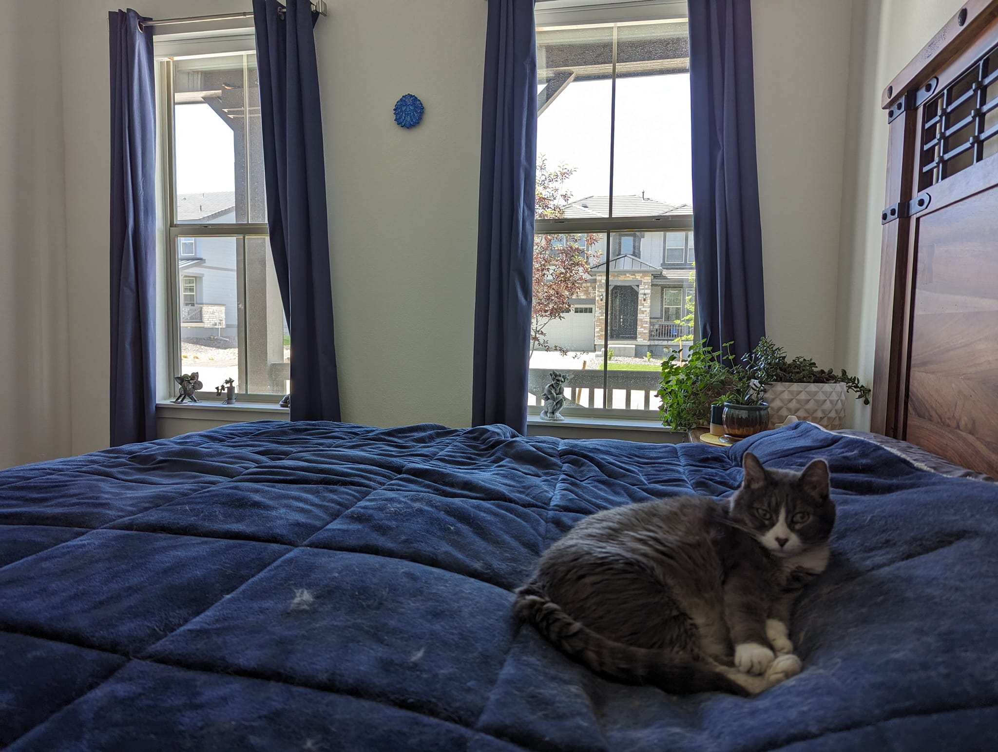 Long day of meetings for a budget replan, but finally getting free of meetings and stepping out of the office to a beautiful twilight view and a sleepy cat was so nice! ??