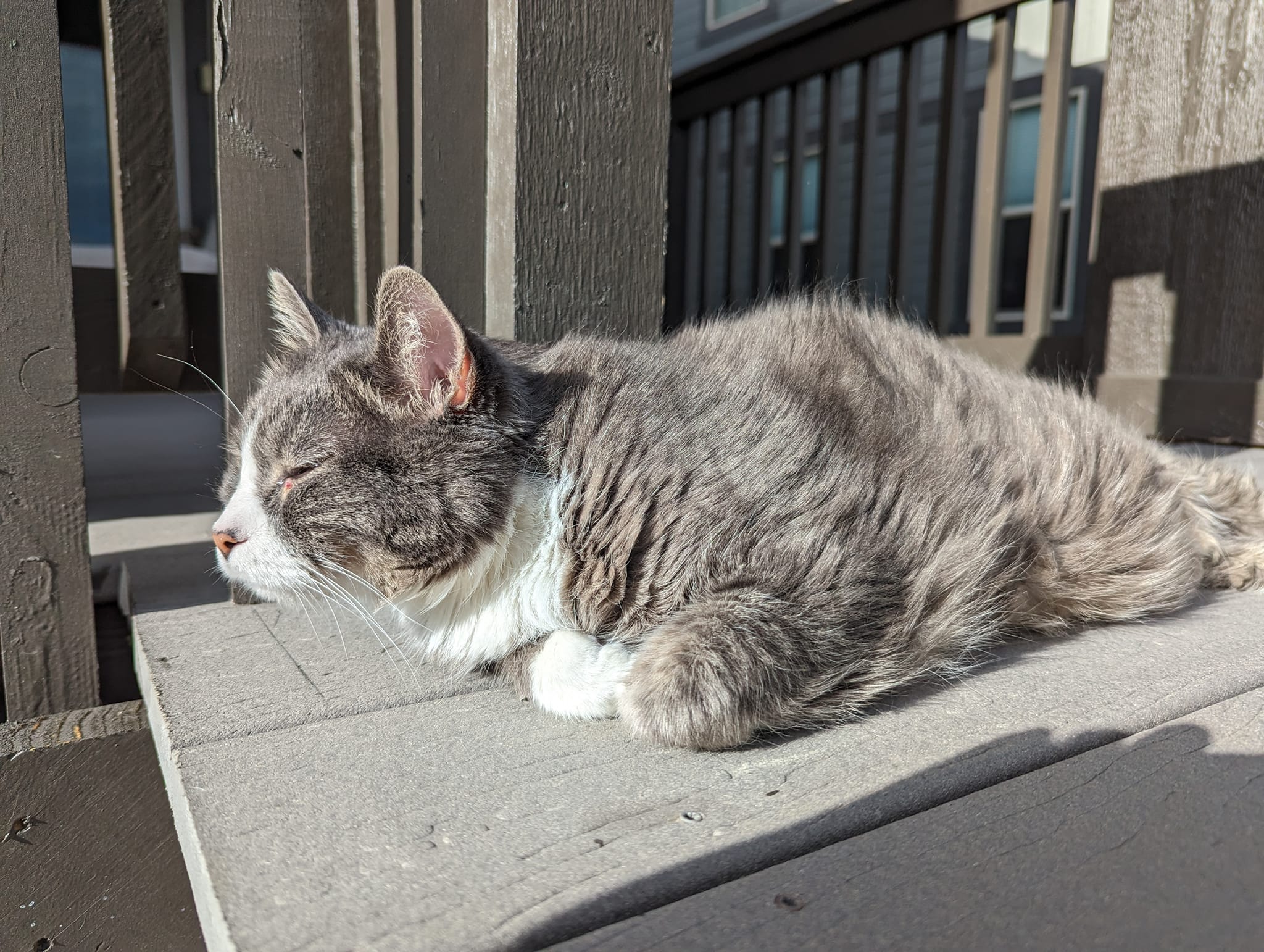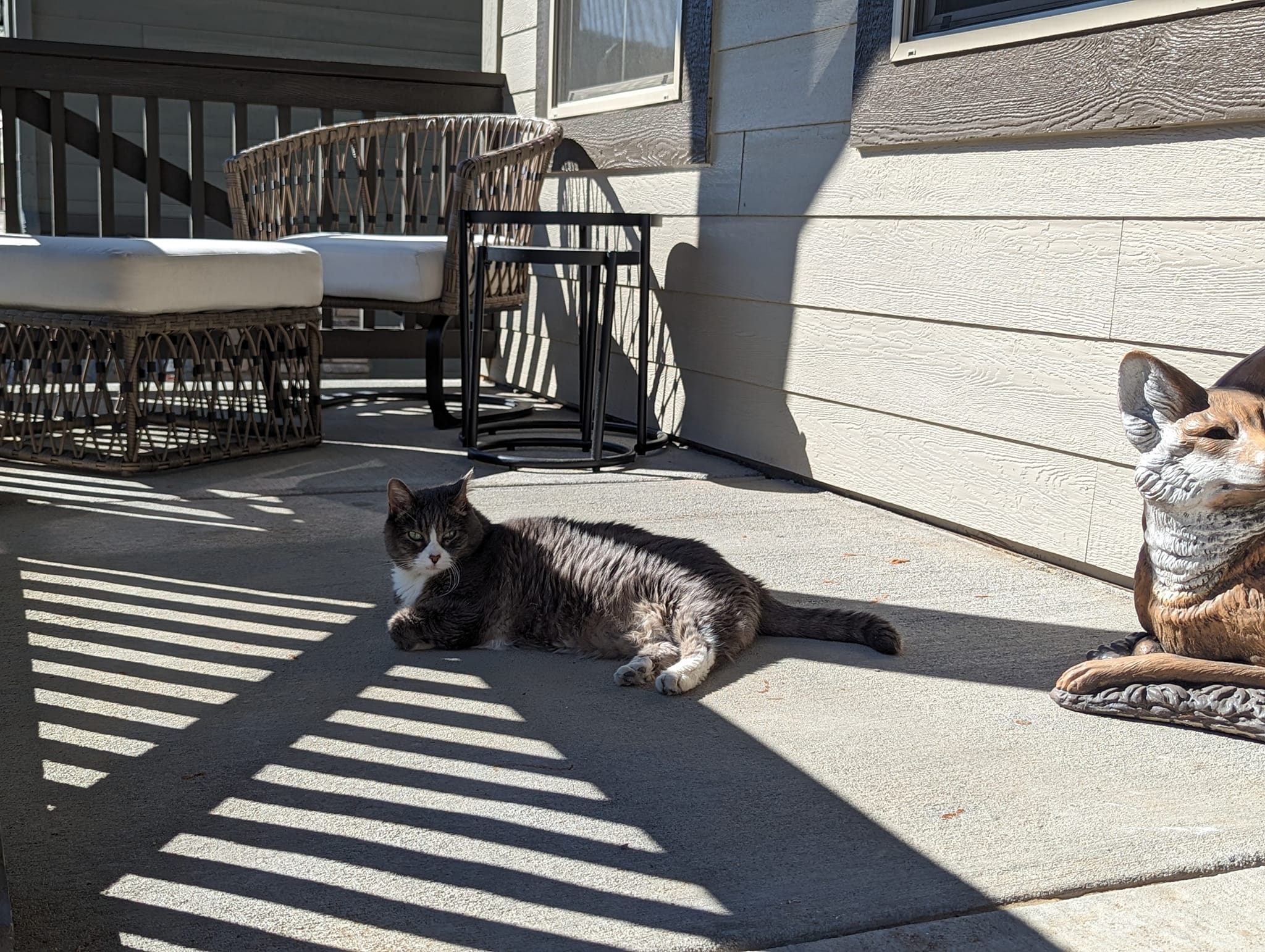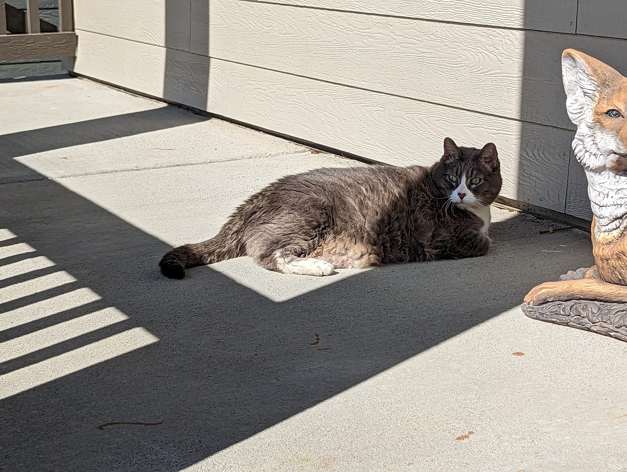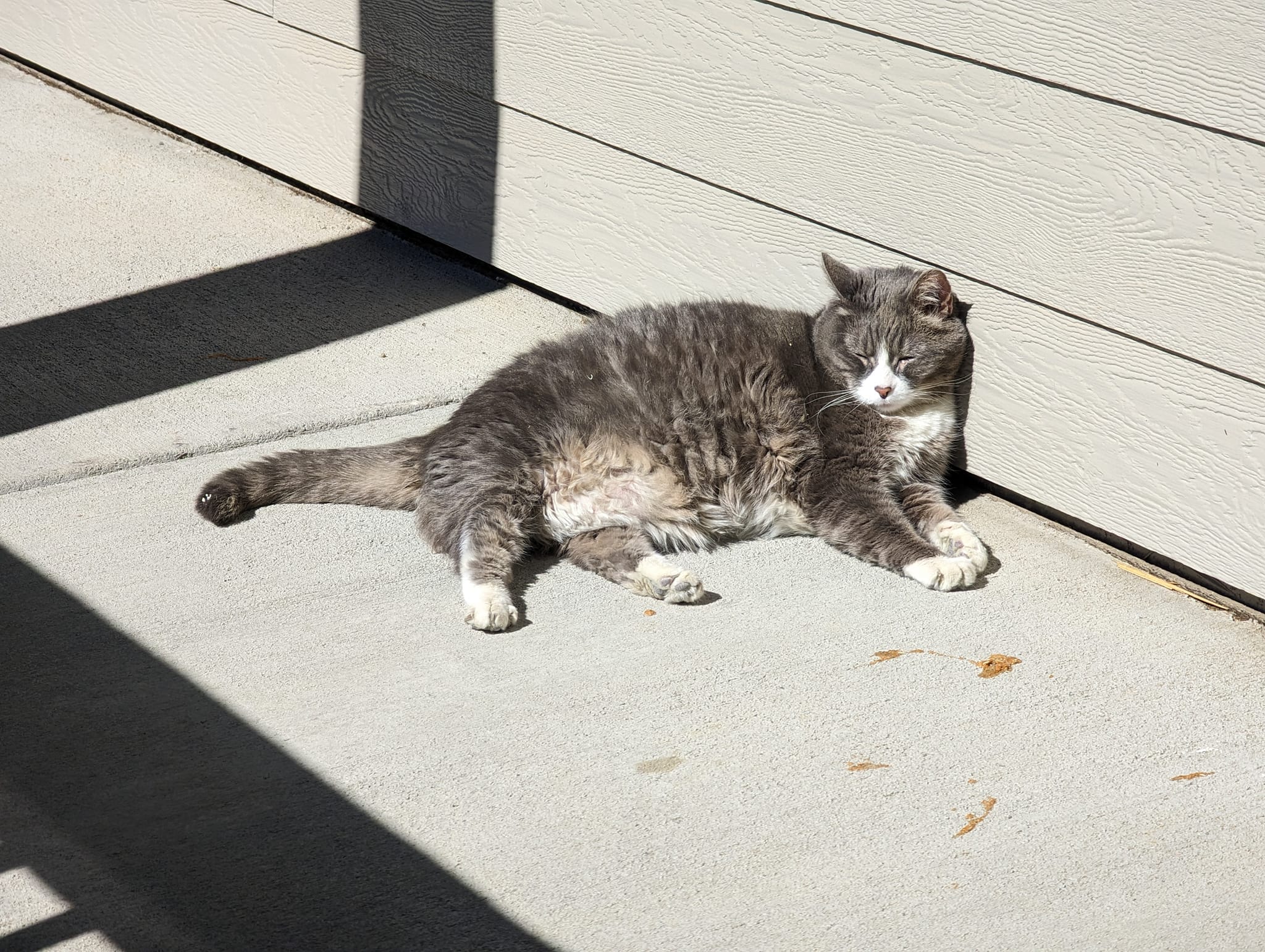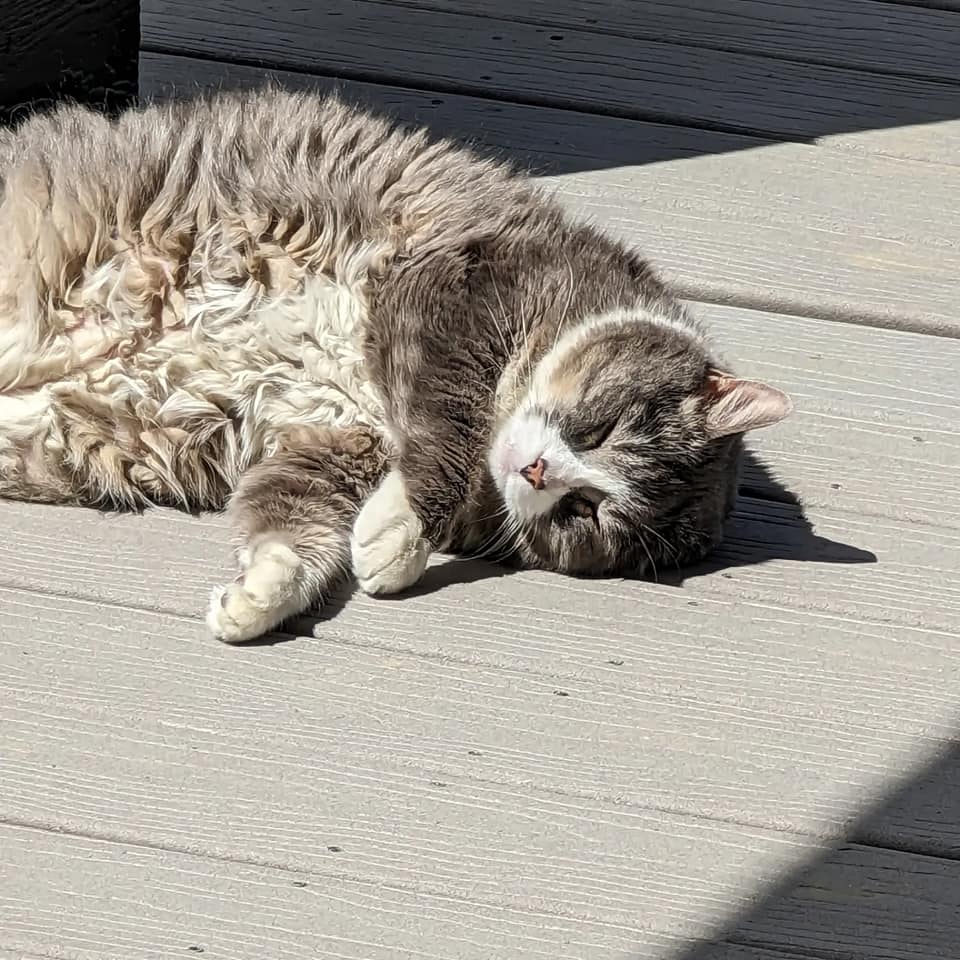 So far, so good. The fluids and anti nausea meds seem to have helped. Ziggy had a large lunch, followed by a sun bath.