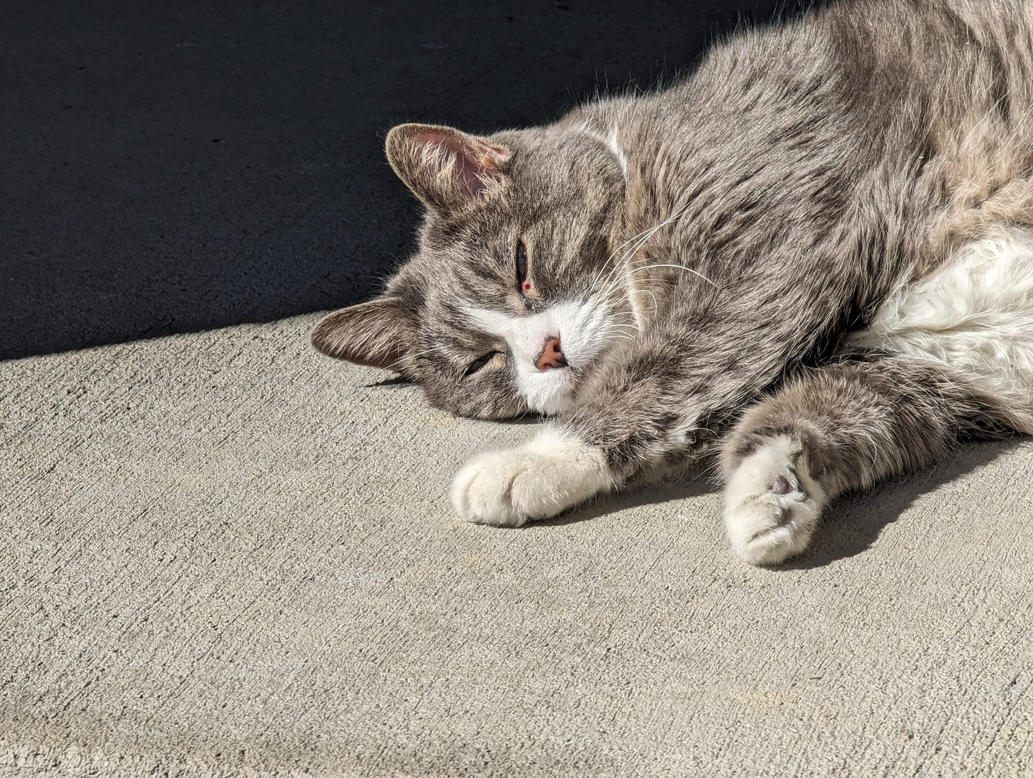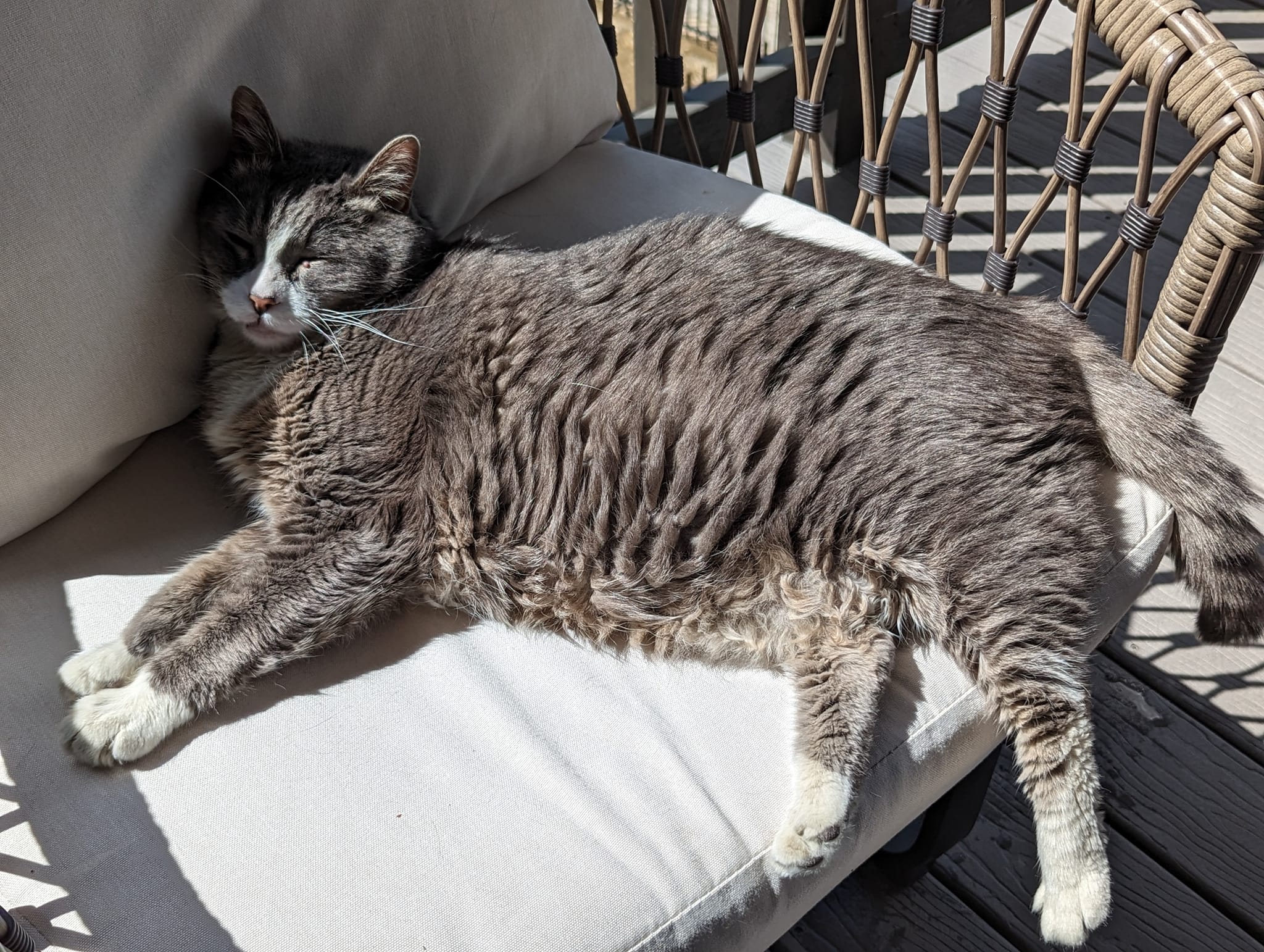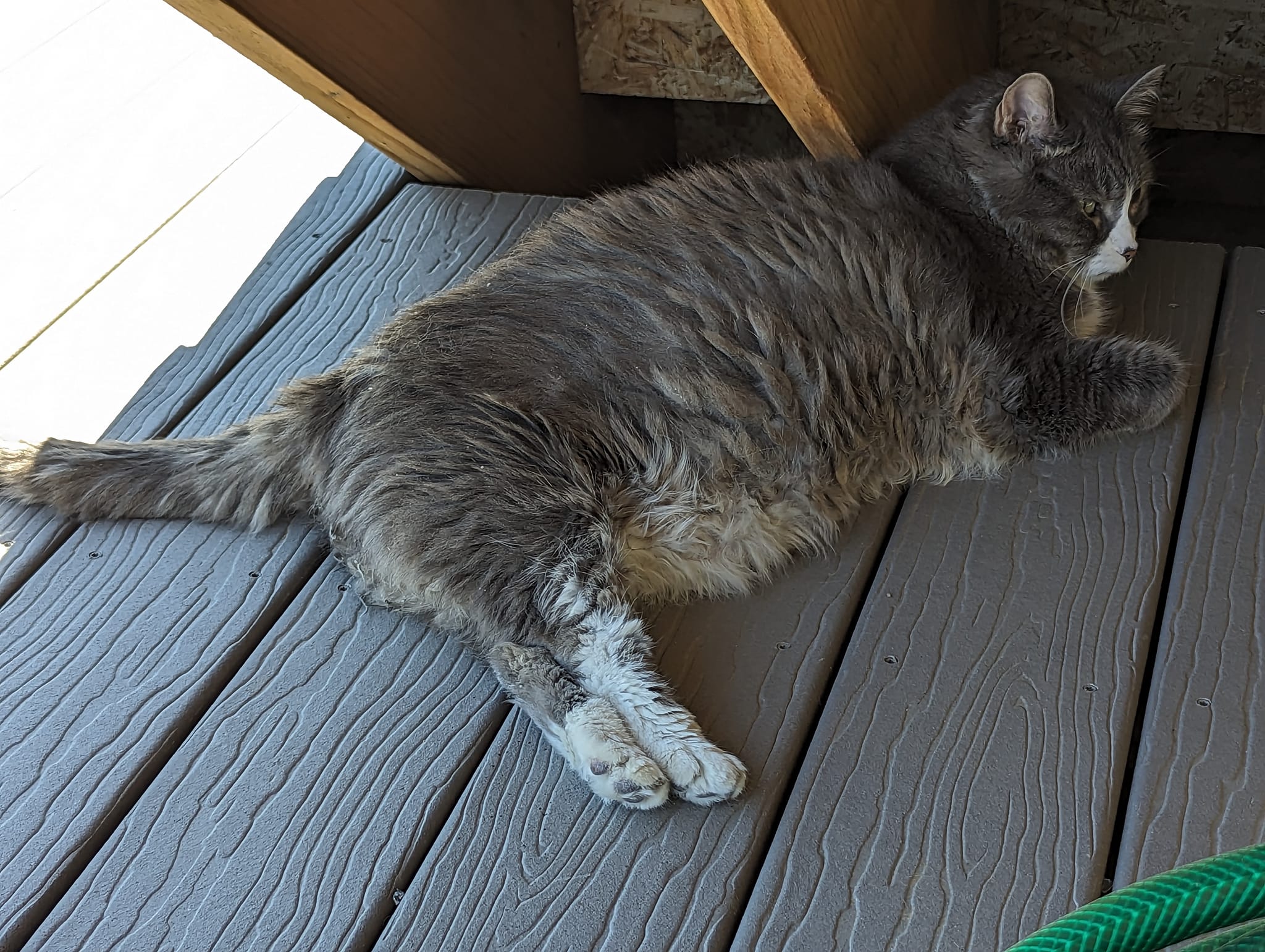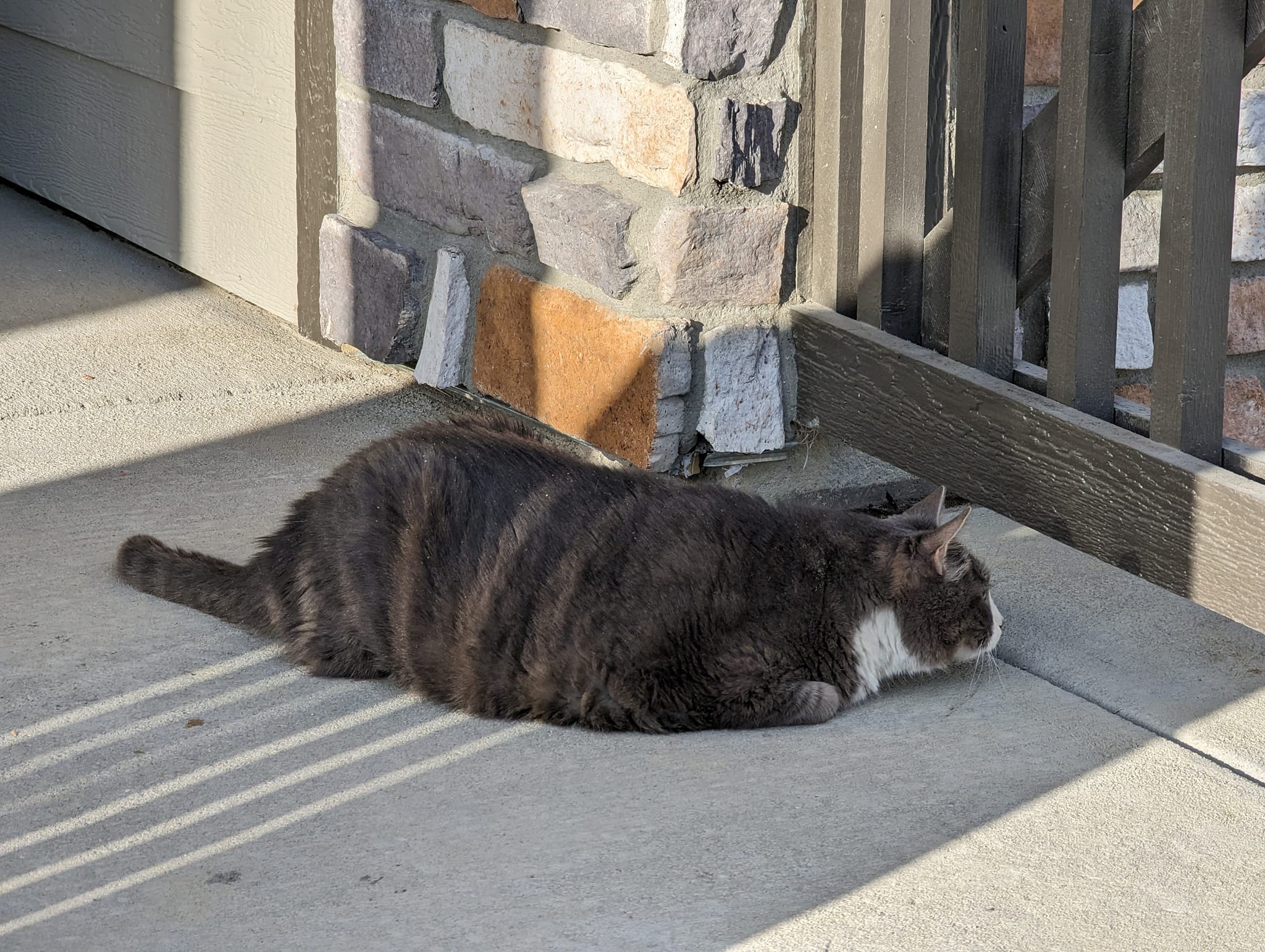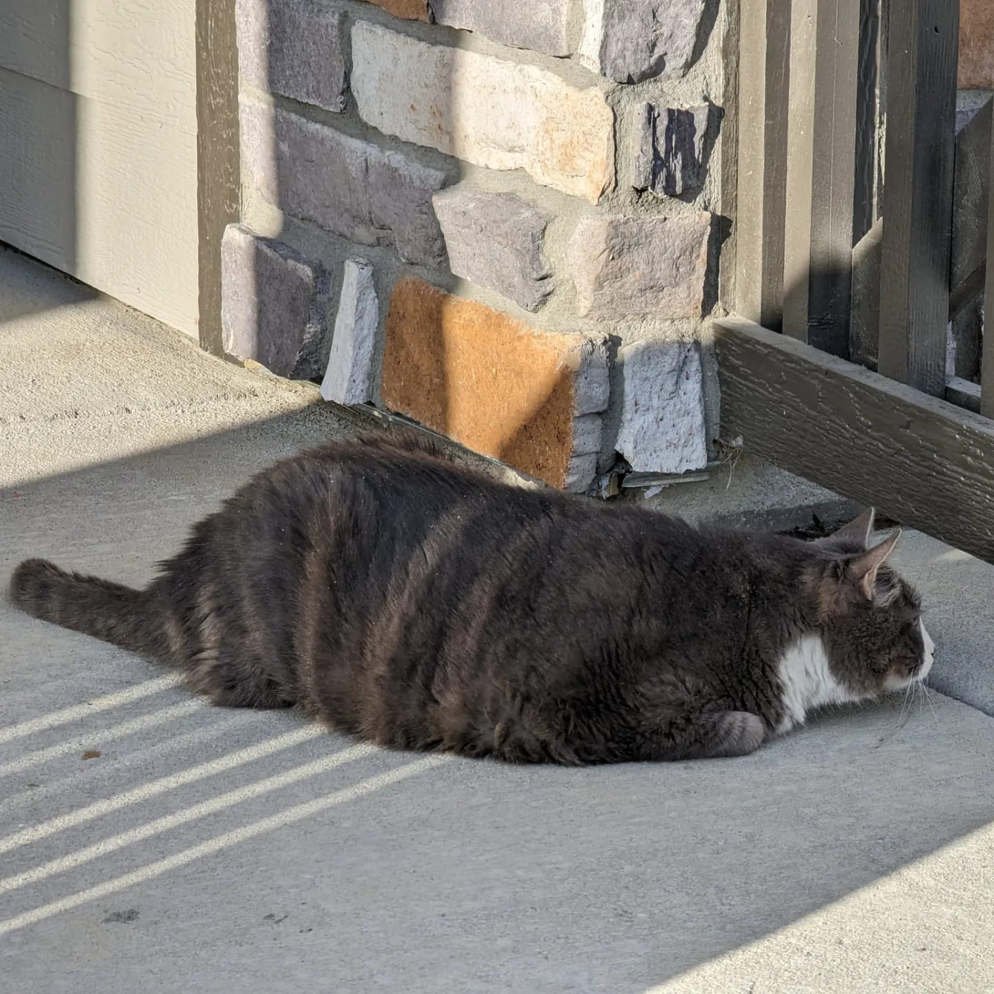 So far, so good. The fluids and anti nausea meds seem to have helped. Ziggy had a large lunch, followed by a sun bath.
