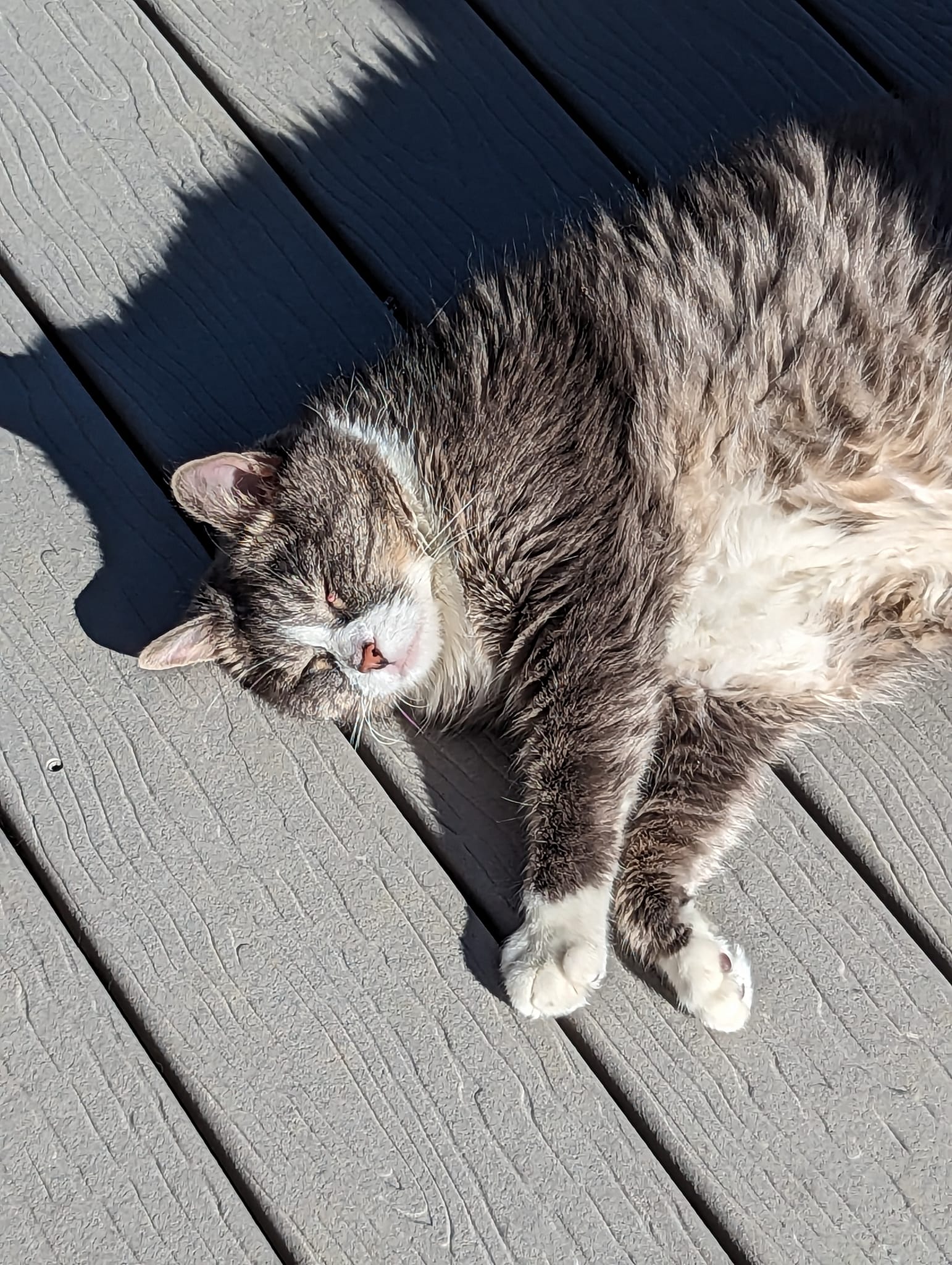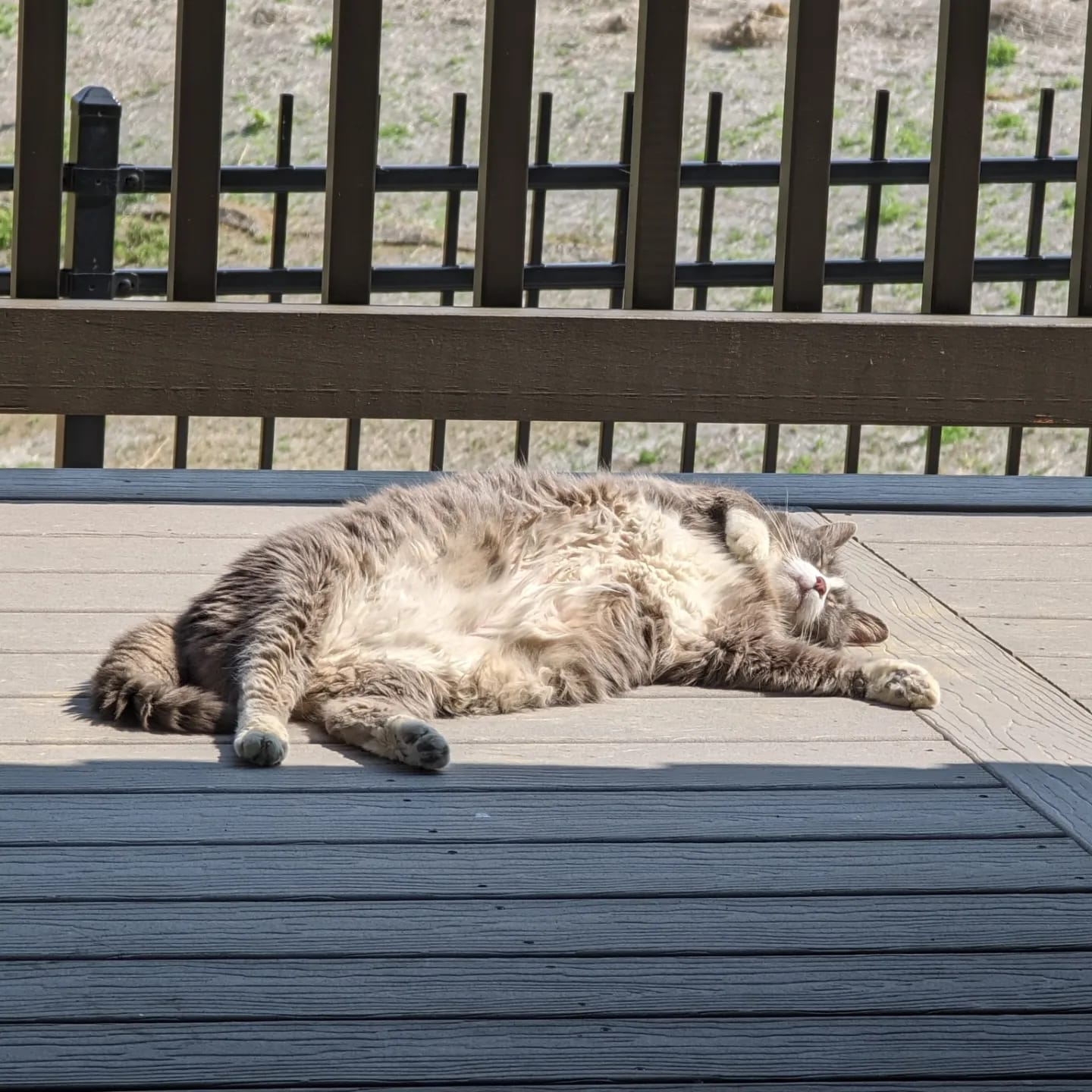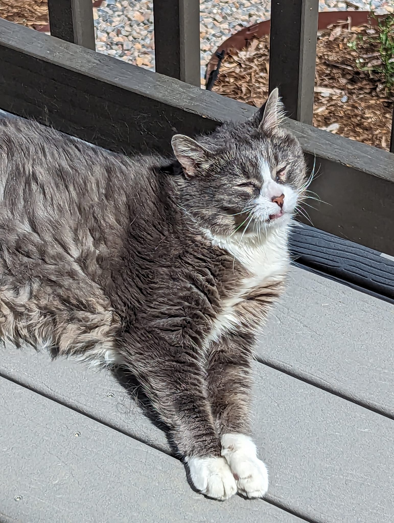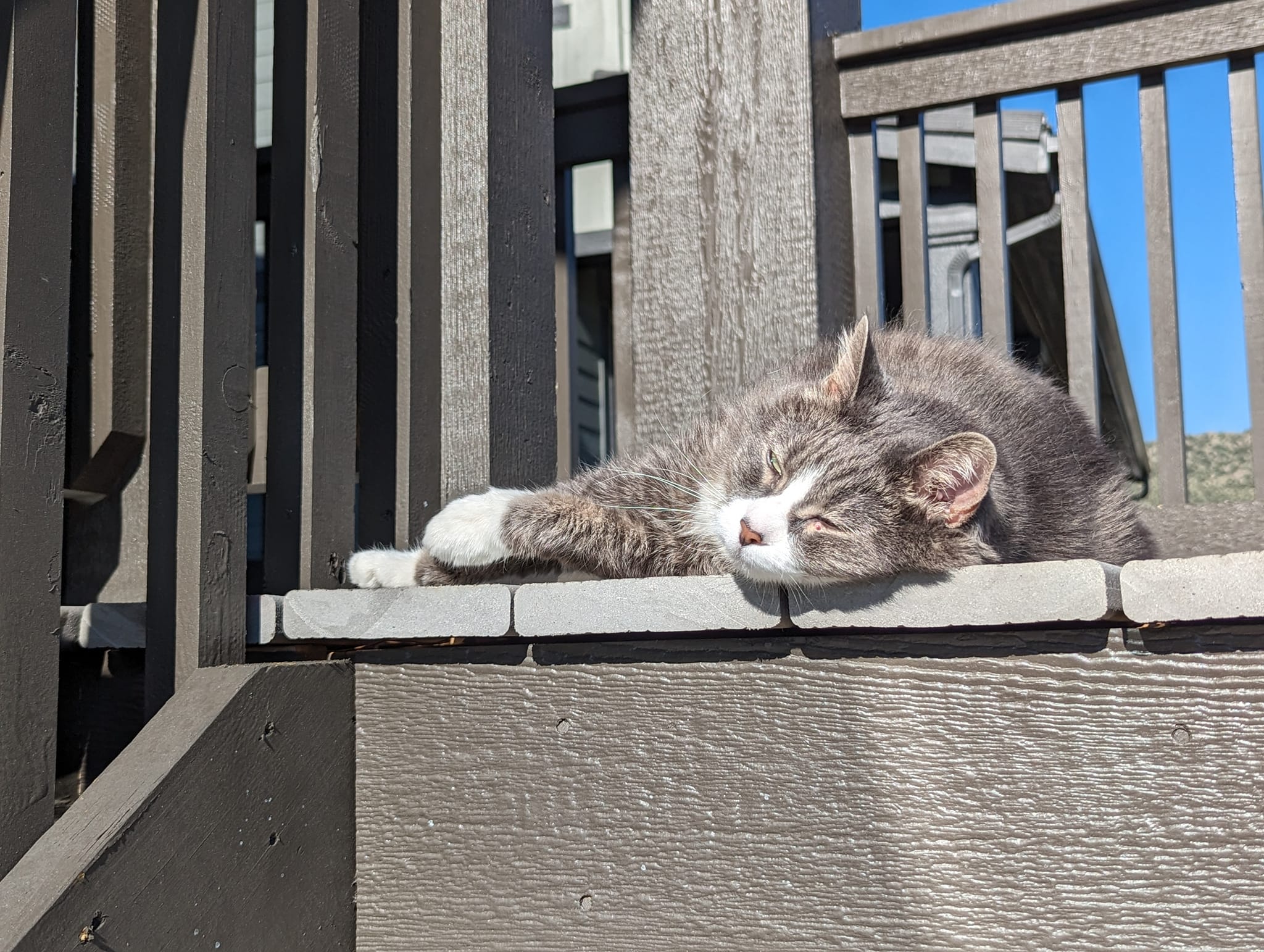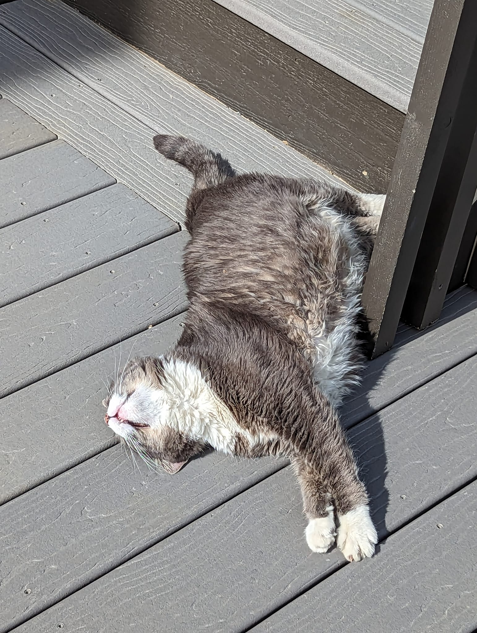 So far, so good. The fluids and anti nausea meds seem to have helped. Ziggy had a large lunch, followed by a sun bath.