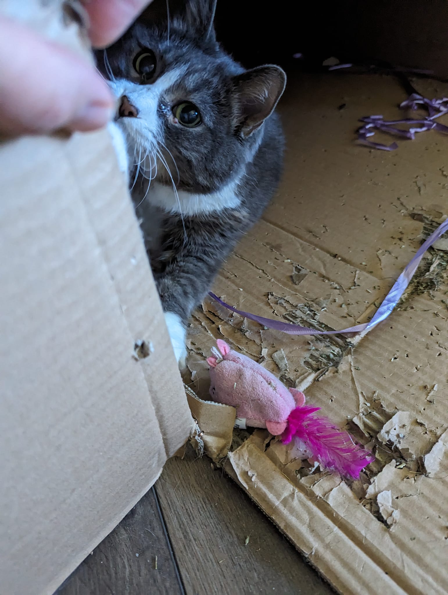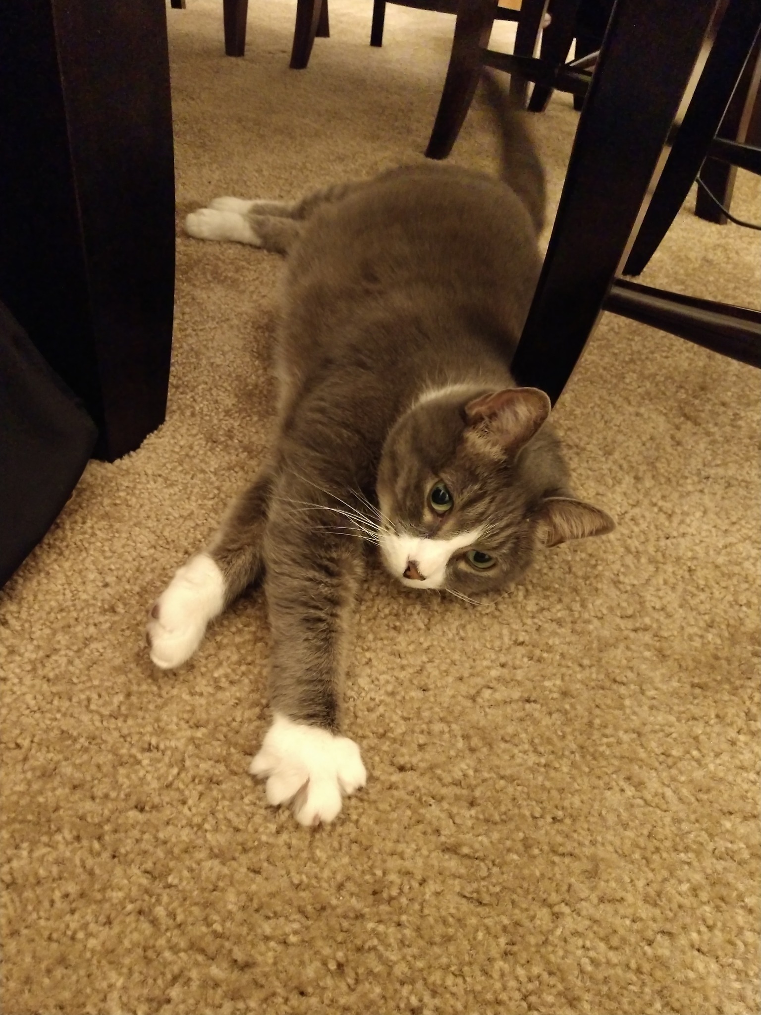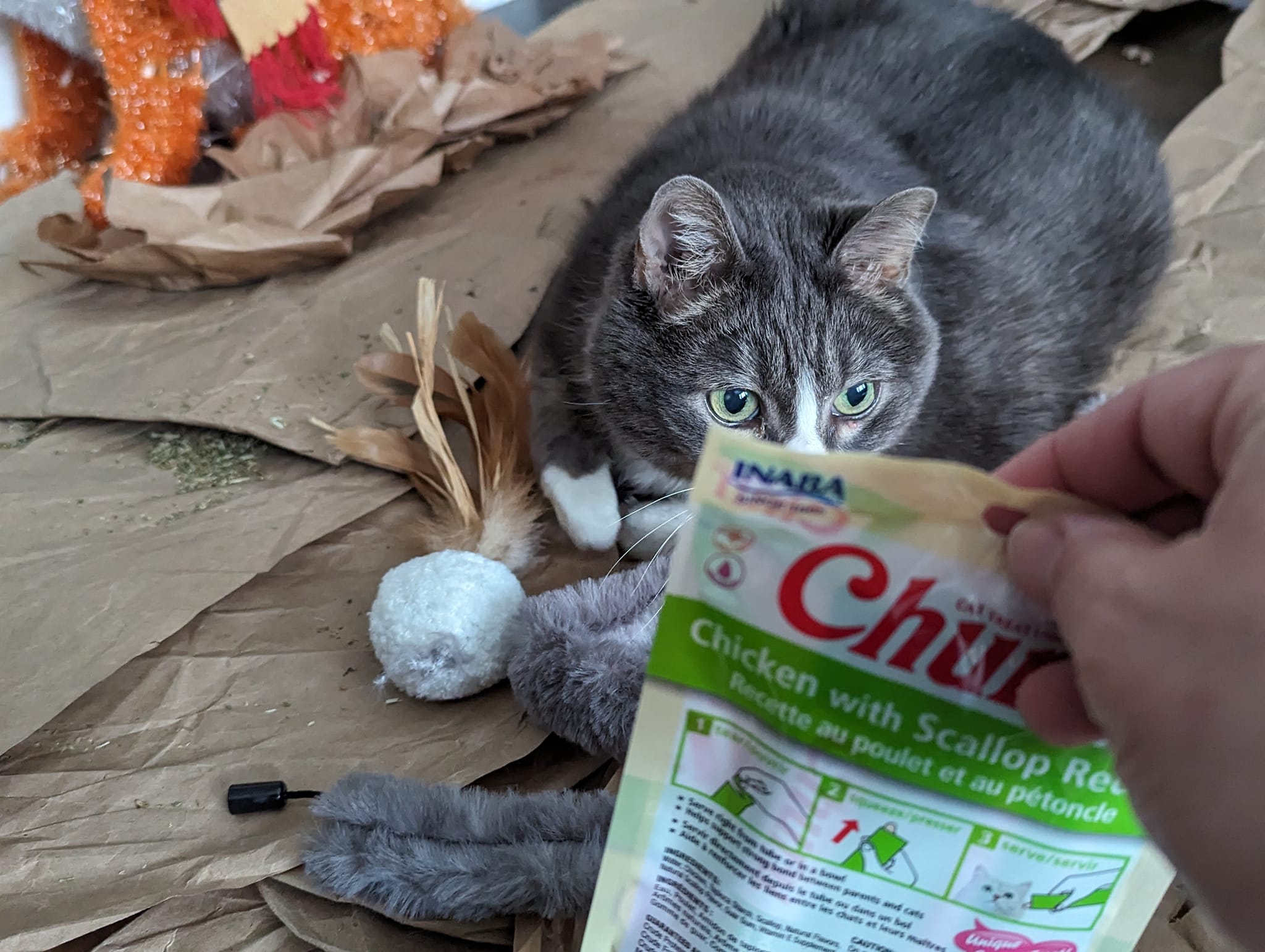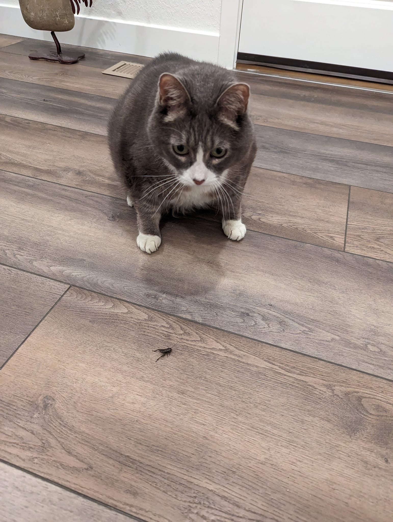 I have asked our cricket hunter to please not bring crickets inside from the garage. Nonetheless, the cricket has been safely released outside and the huntress was rewarded for her efforts with some temptations treats. ??????