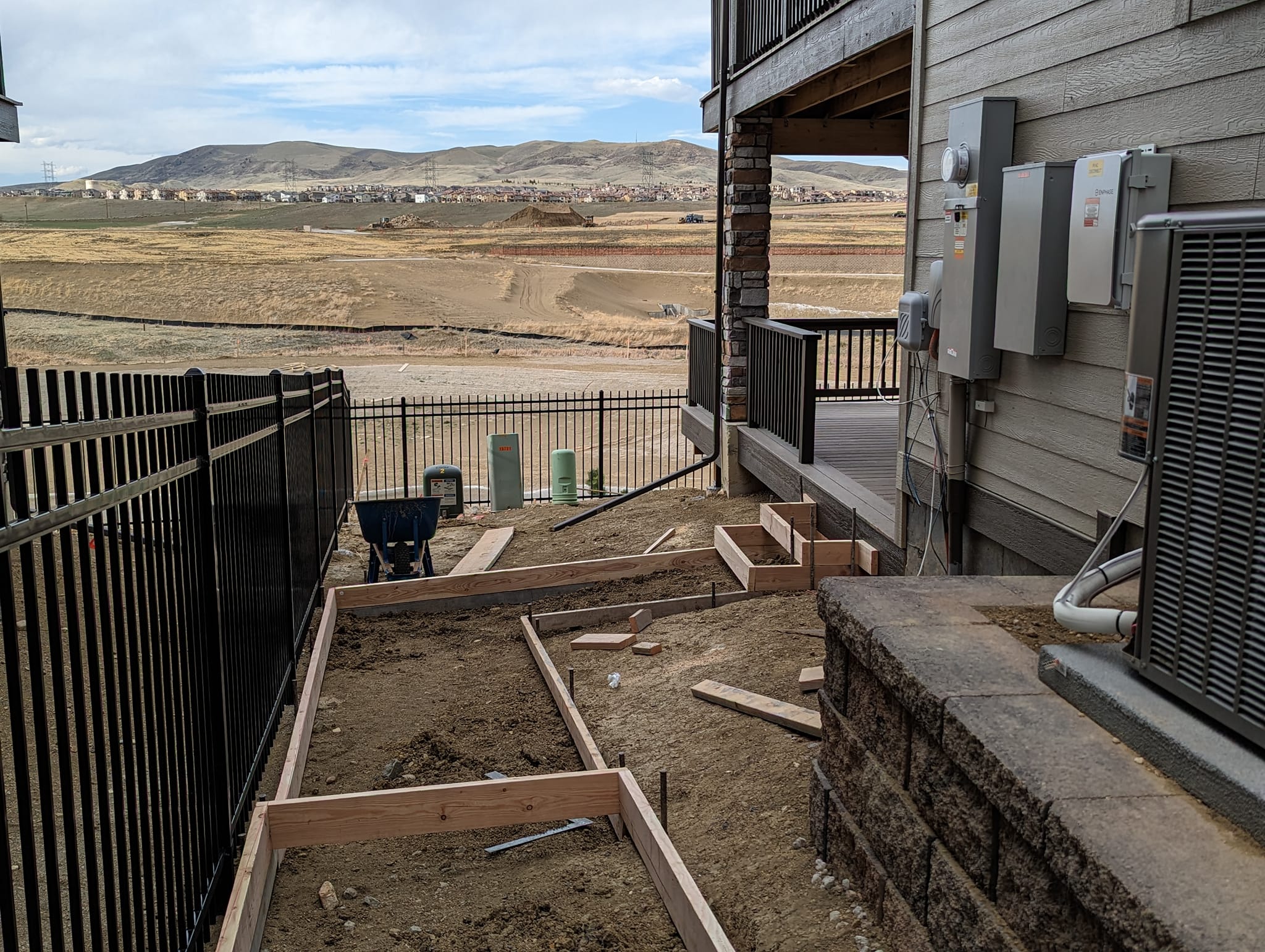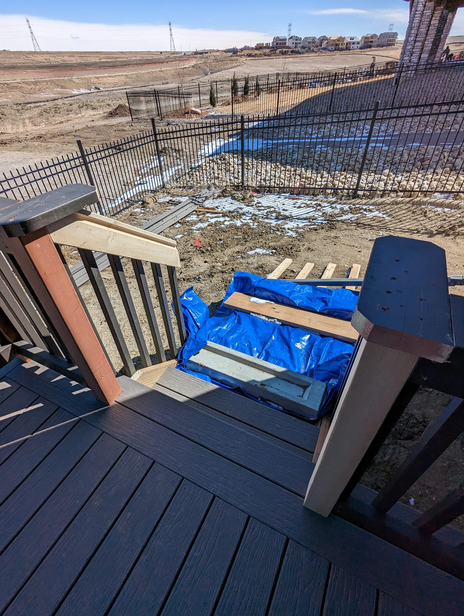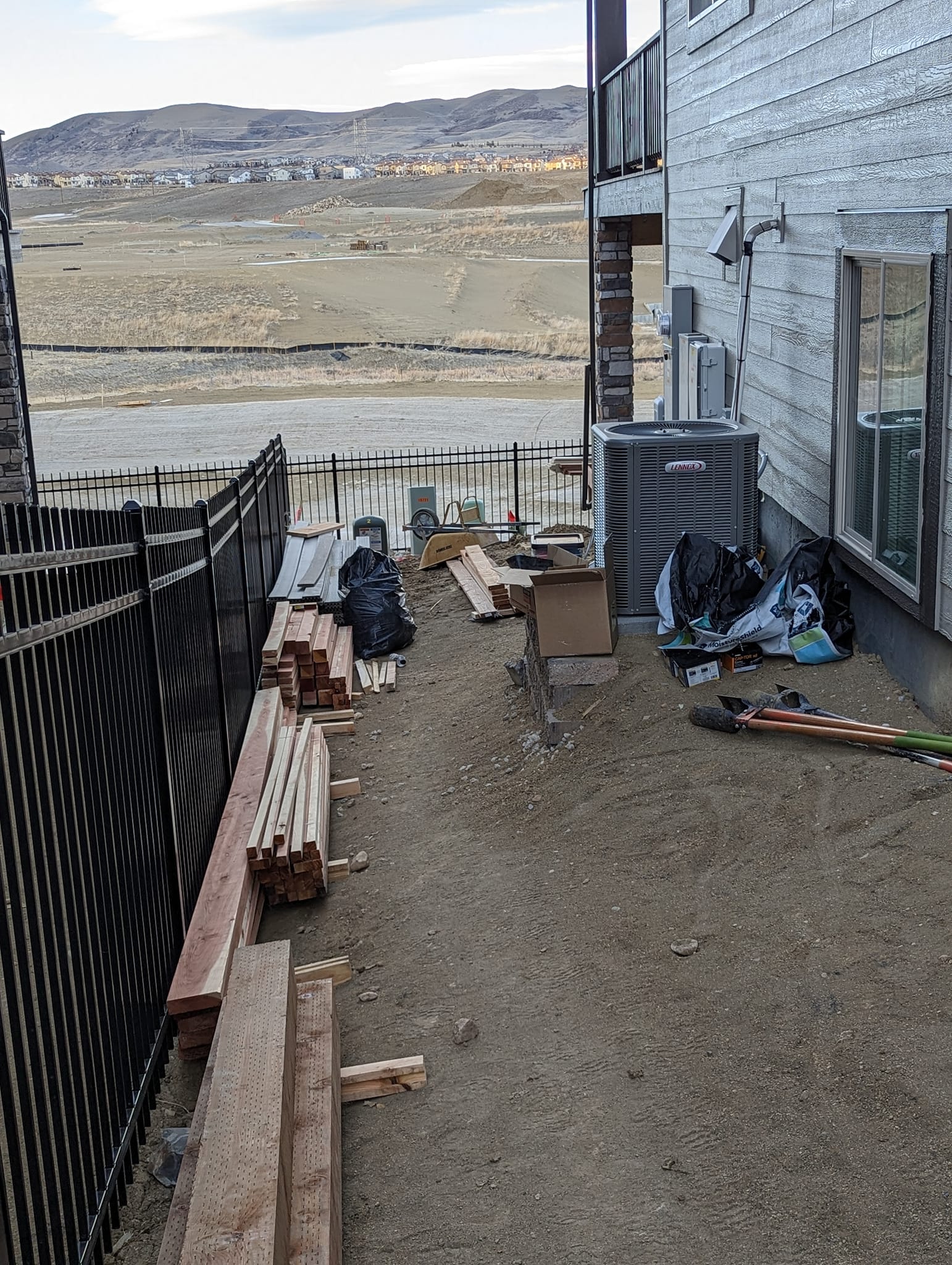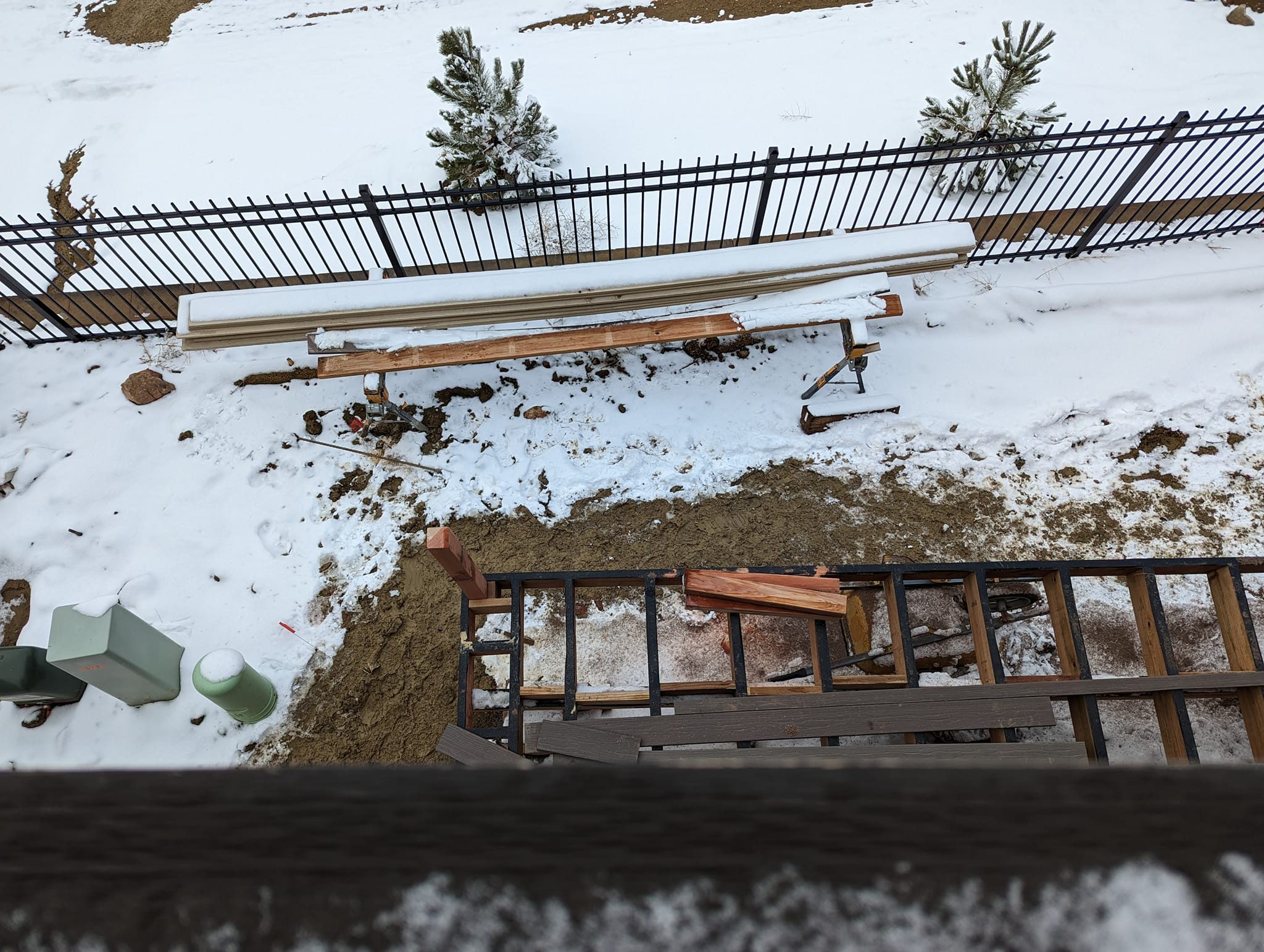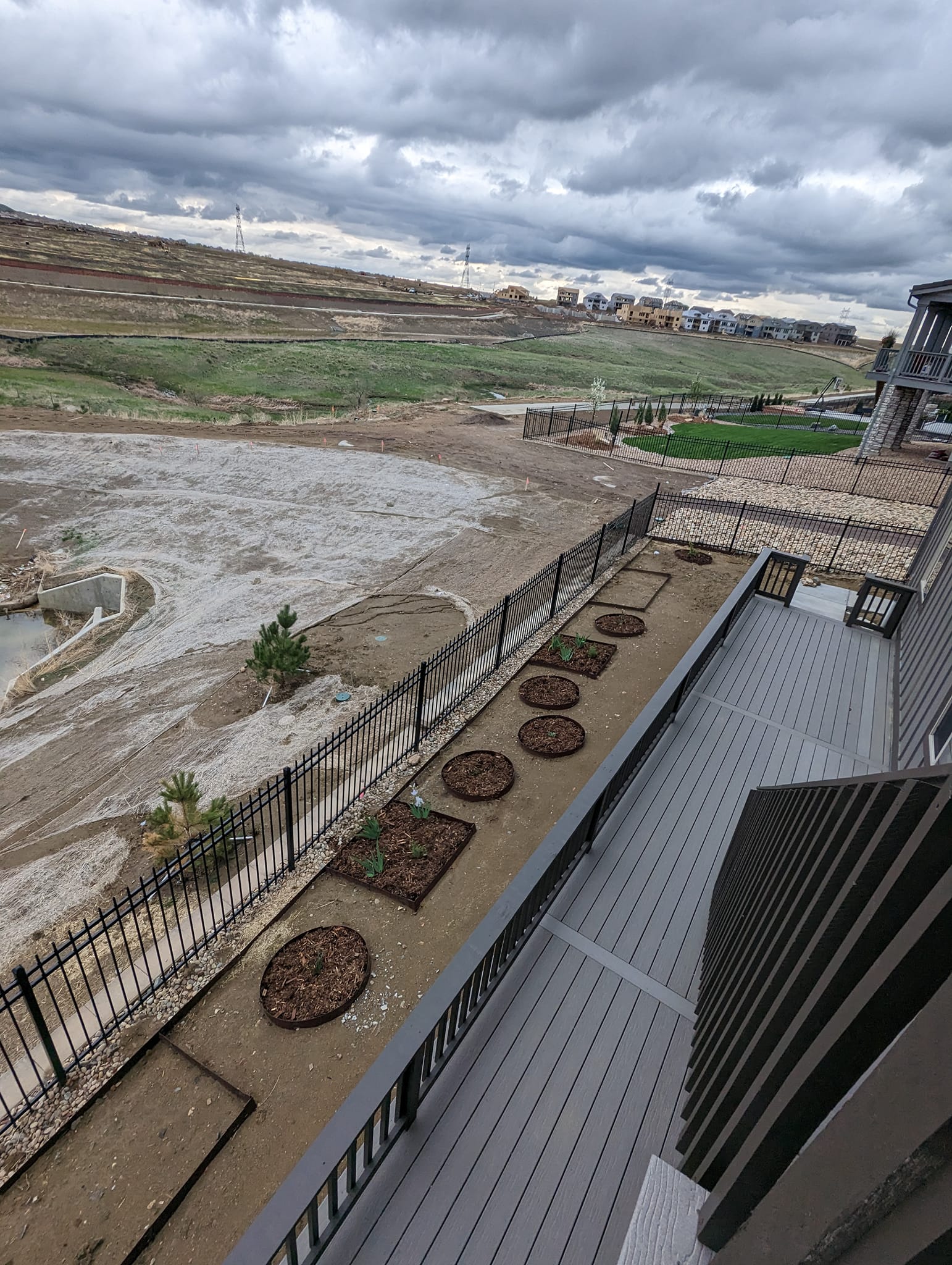 It's deck day! When we bought the house, the builder had landscaped the front yard, but the sides and back have been mud. Part 1 of our landscaping plan is to install a new deck in the back yard. It will come out from the basement door and wrap around the back of the house. (Foundation warranty and HOA rules are that we can't change the grade of the dirt, and it is a pretty steep slope, so we are going over the top with a deck in order to get some usable level ground)