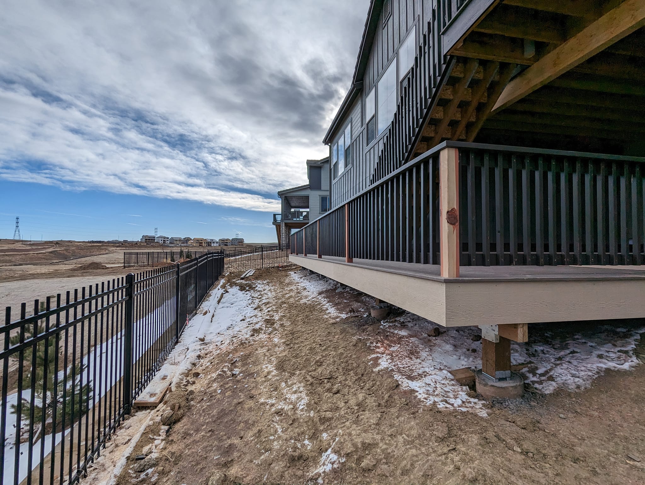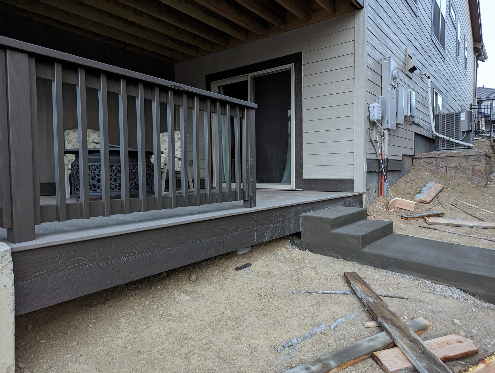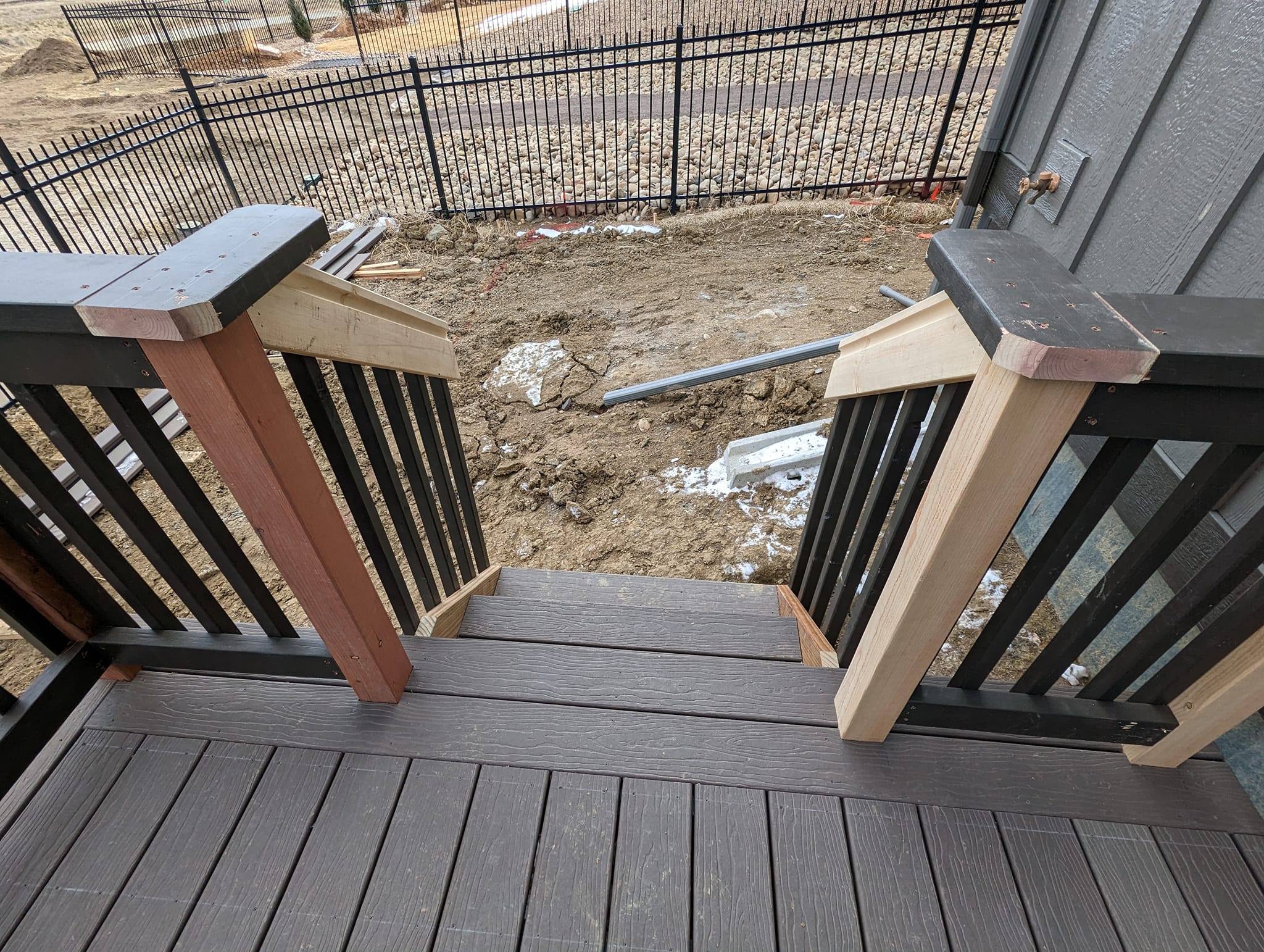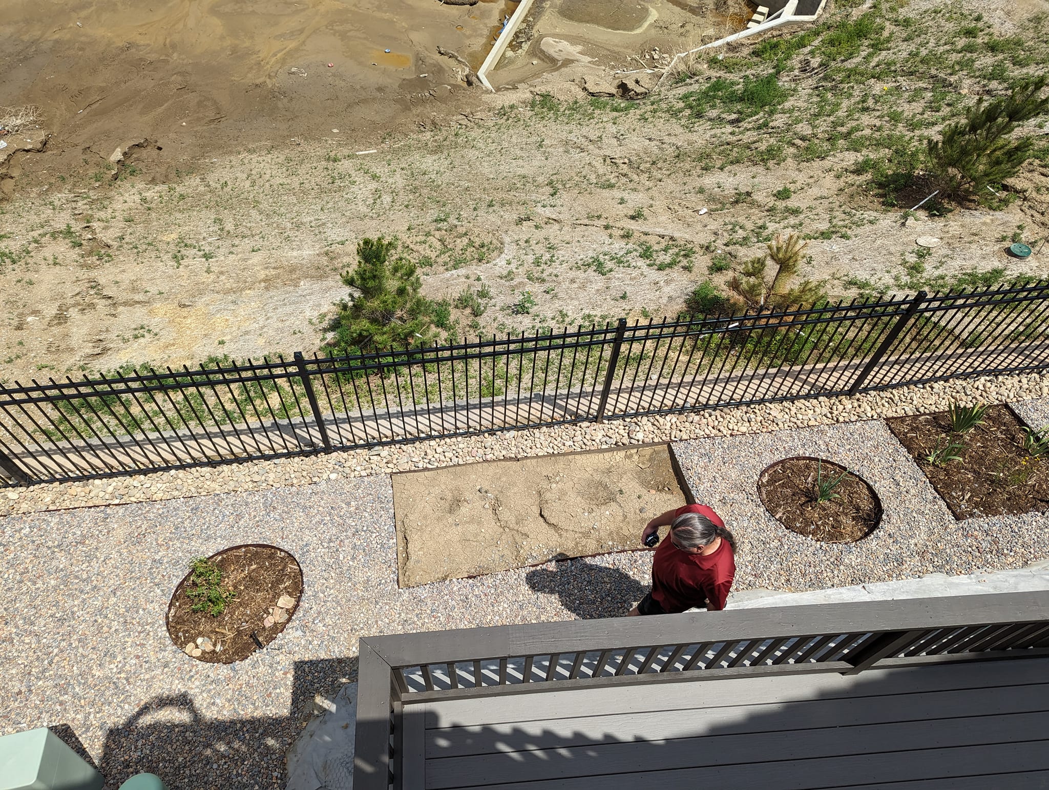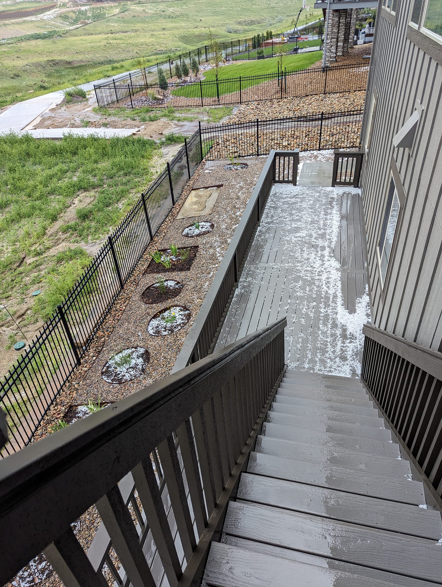 It's deck day! When we bought the house, the builder had landscaped the front yard, but the sides and back have been mud. Part 1 of our landscaping plan is to install a new deck in the back yard. It will come out from the basement door and wrap around the back of the house. (Foundation warranty and HOA rules are that we can't change the grade of the dirt, and it is a pretty steep slope, so we are going over the top with a deck in order to get some usable level ground)