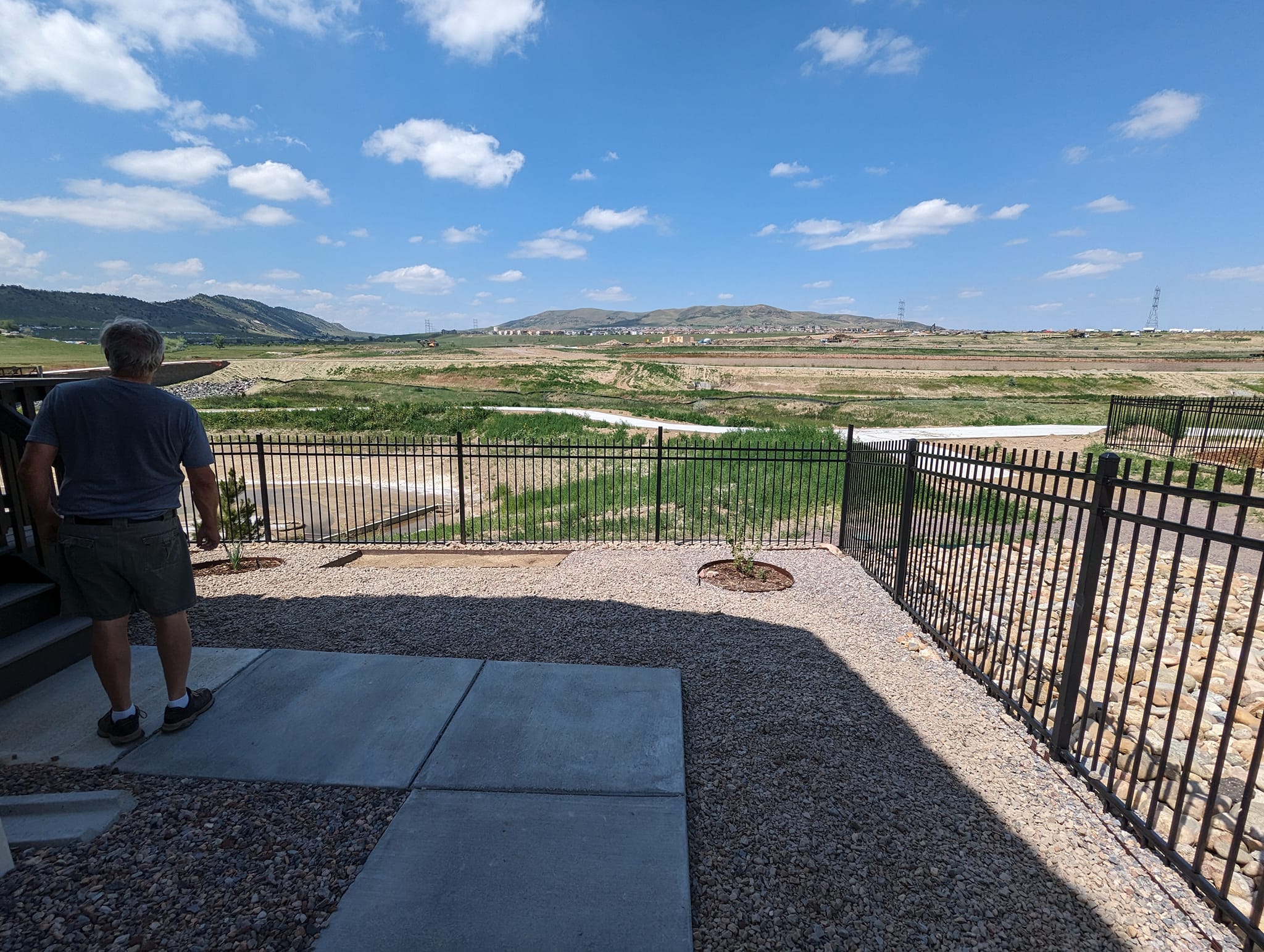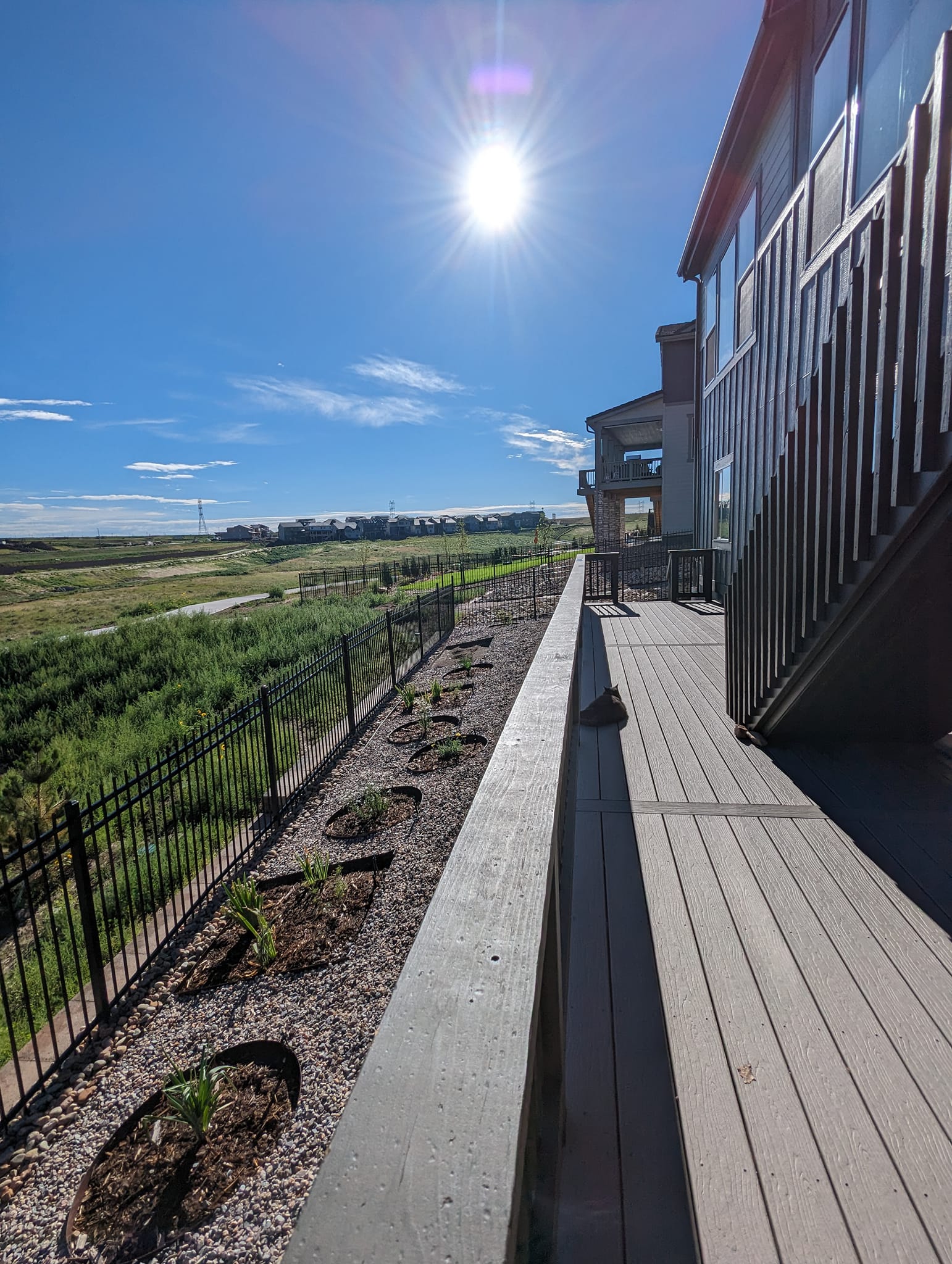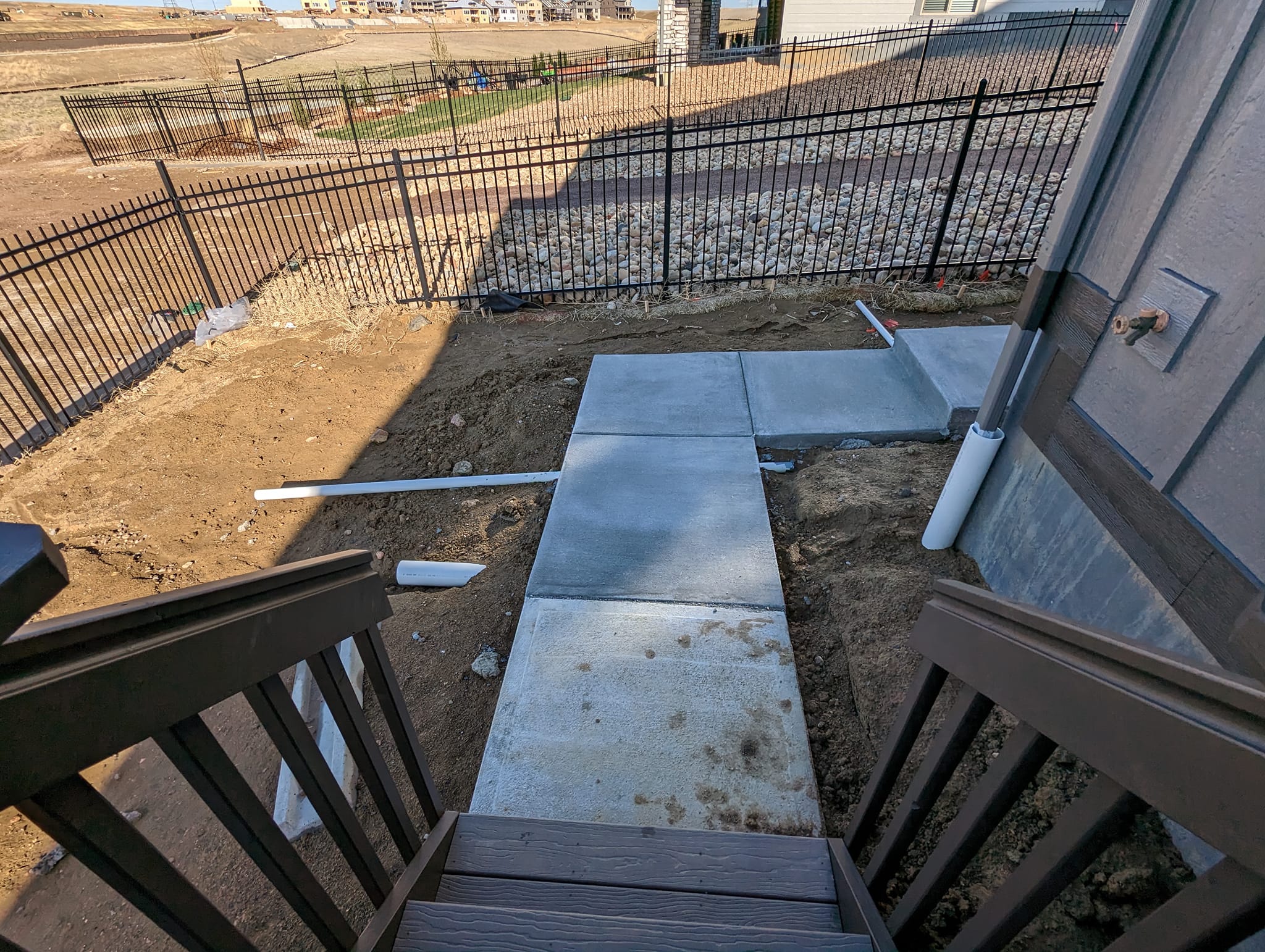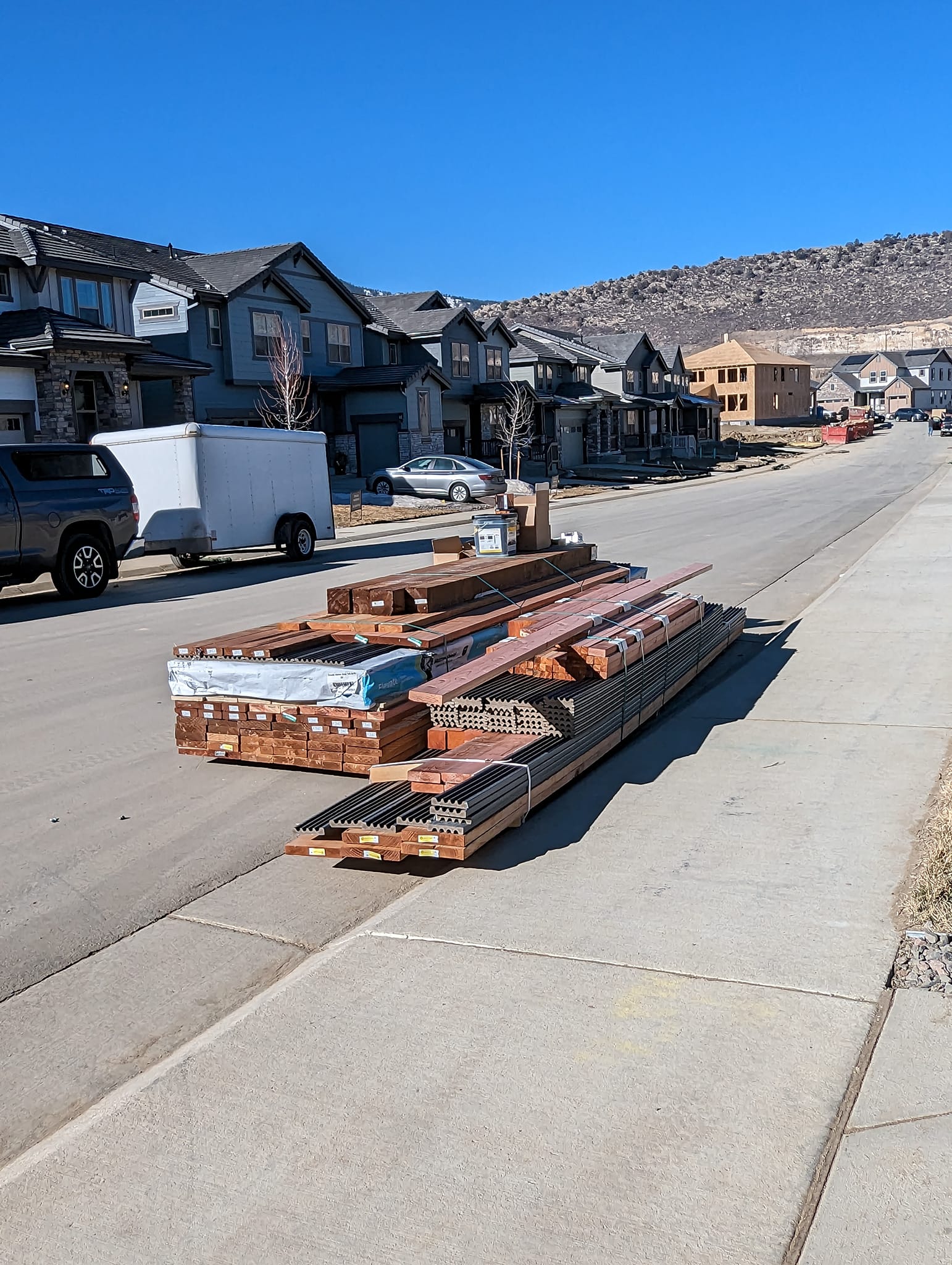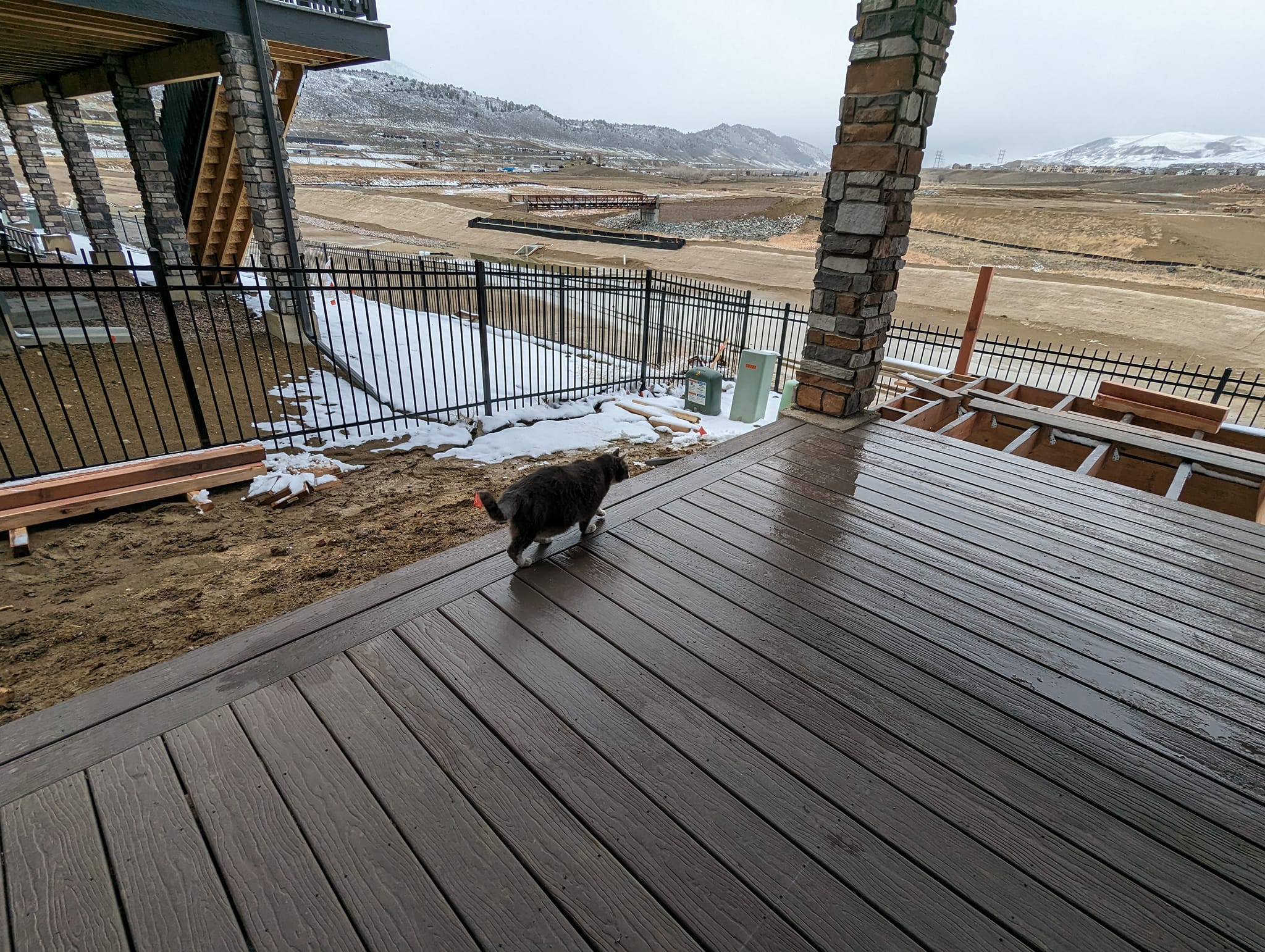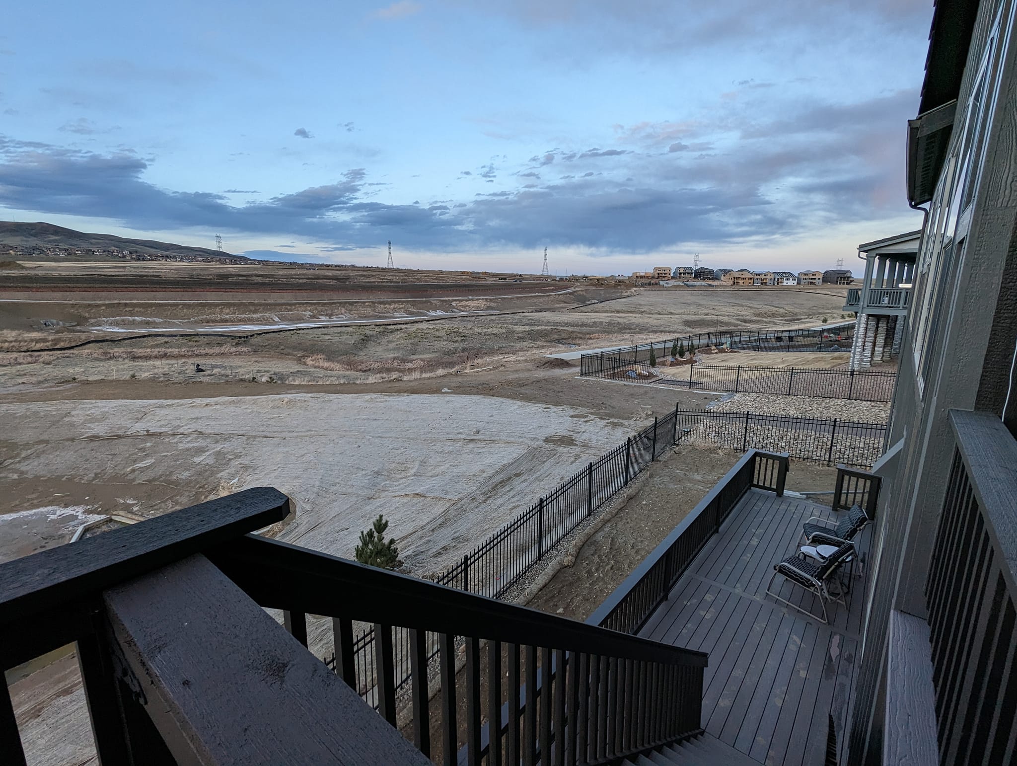 It's deck day! When we bought the house, the builder had landscaped the front yard, but the sides and back have been mud. Part 1 of our landscaping plan is to install a new deck in the back yard. It will come out from the basement door and wrap around the back of the house. (Foundation warranty and HOA rules are that we can't change the grade of the dirt, and it is a pretty steep slope, so we are going over the top with a deck in order to get some usable level ground)