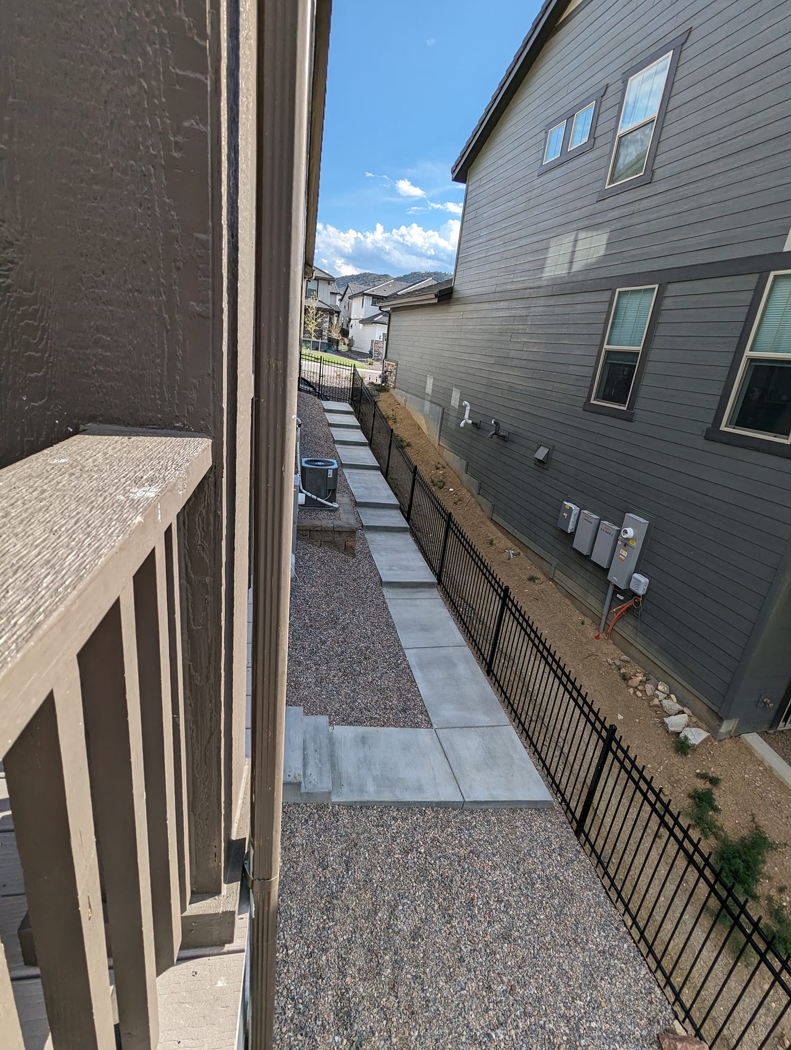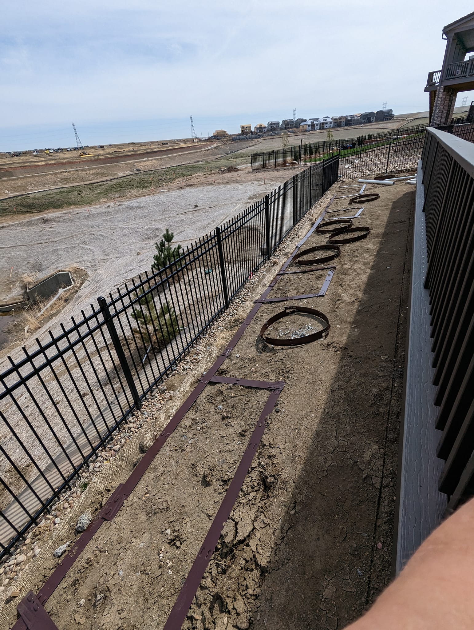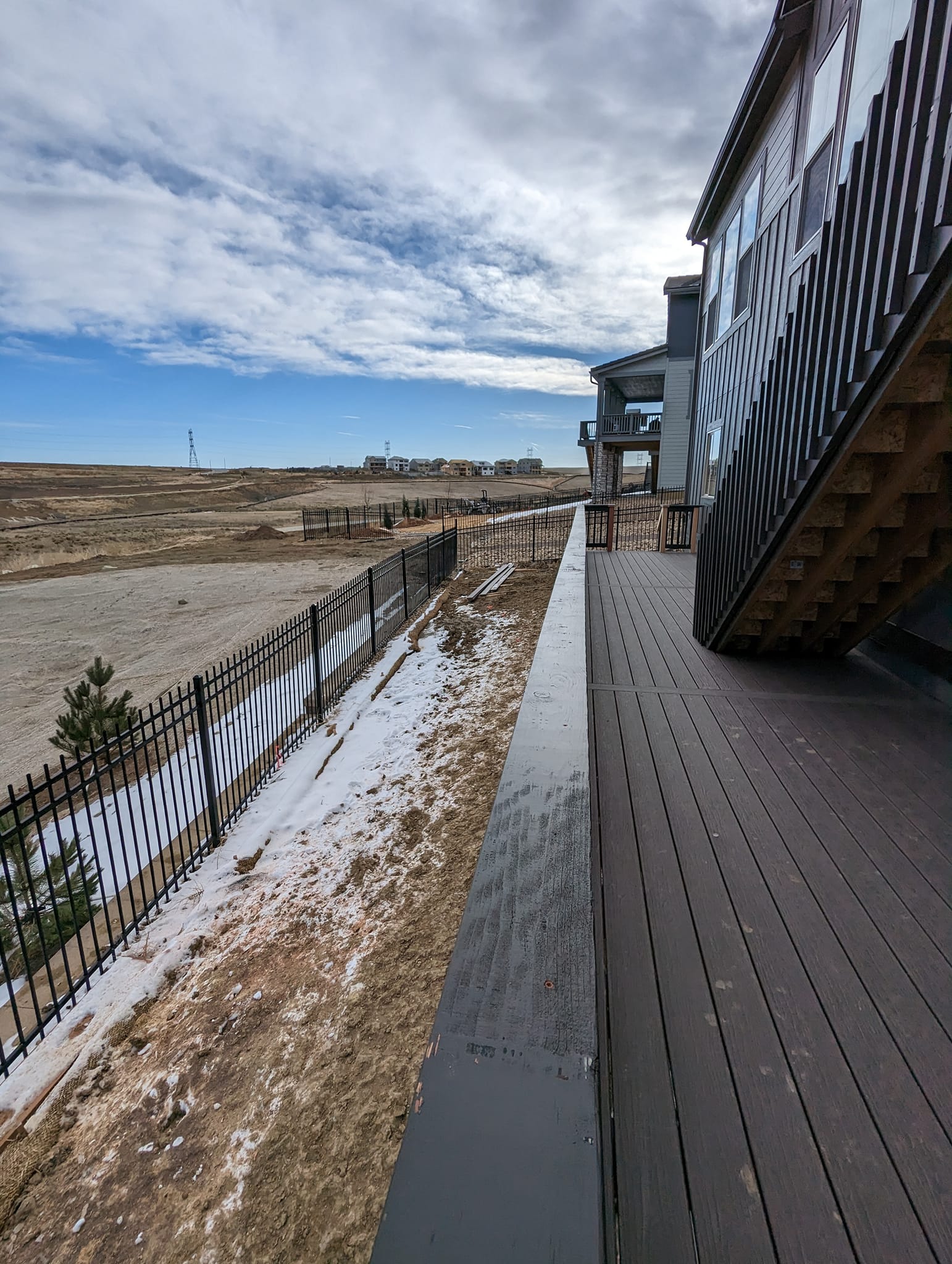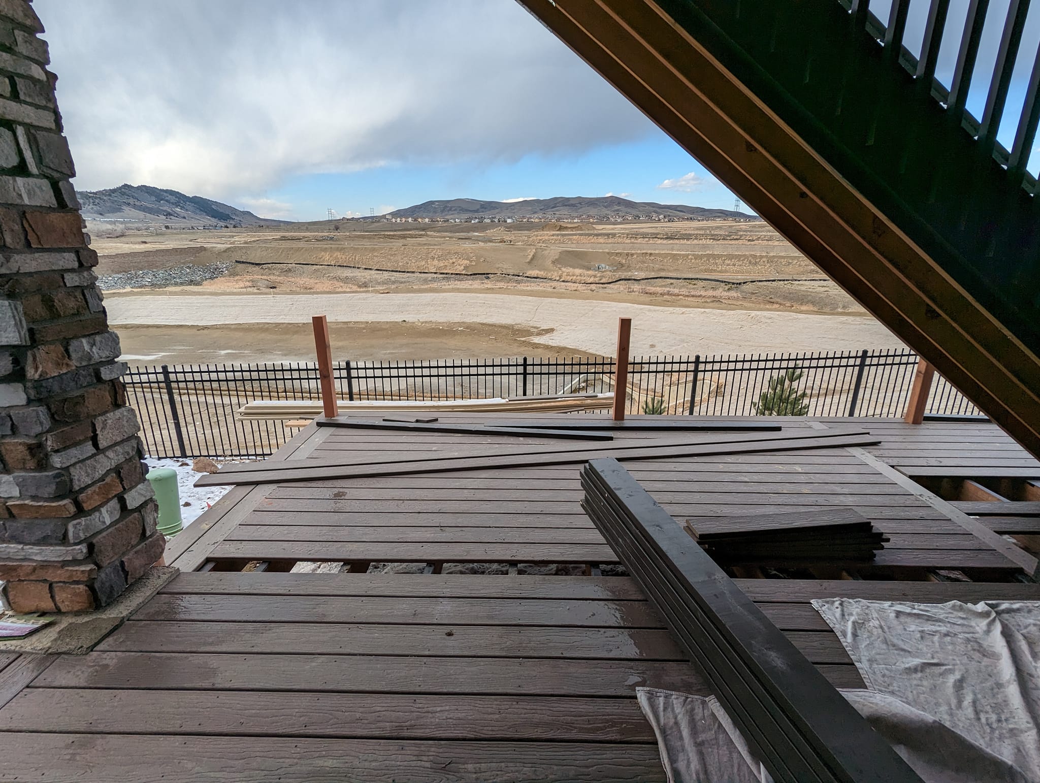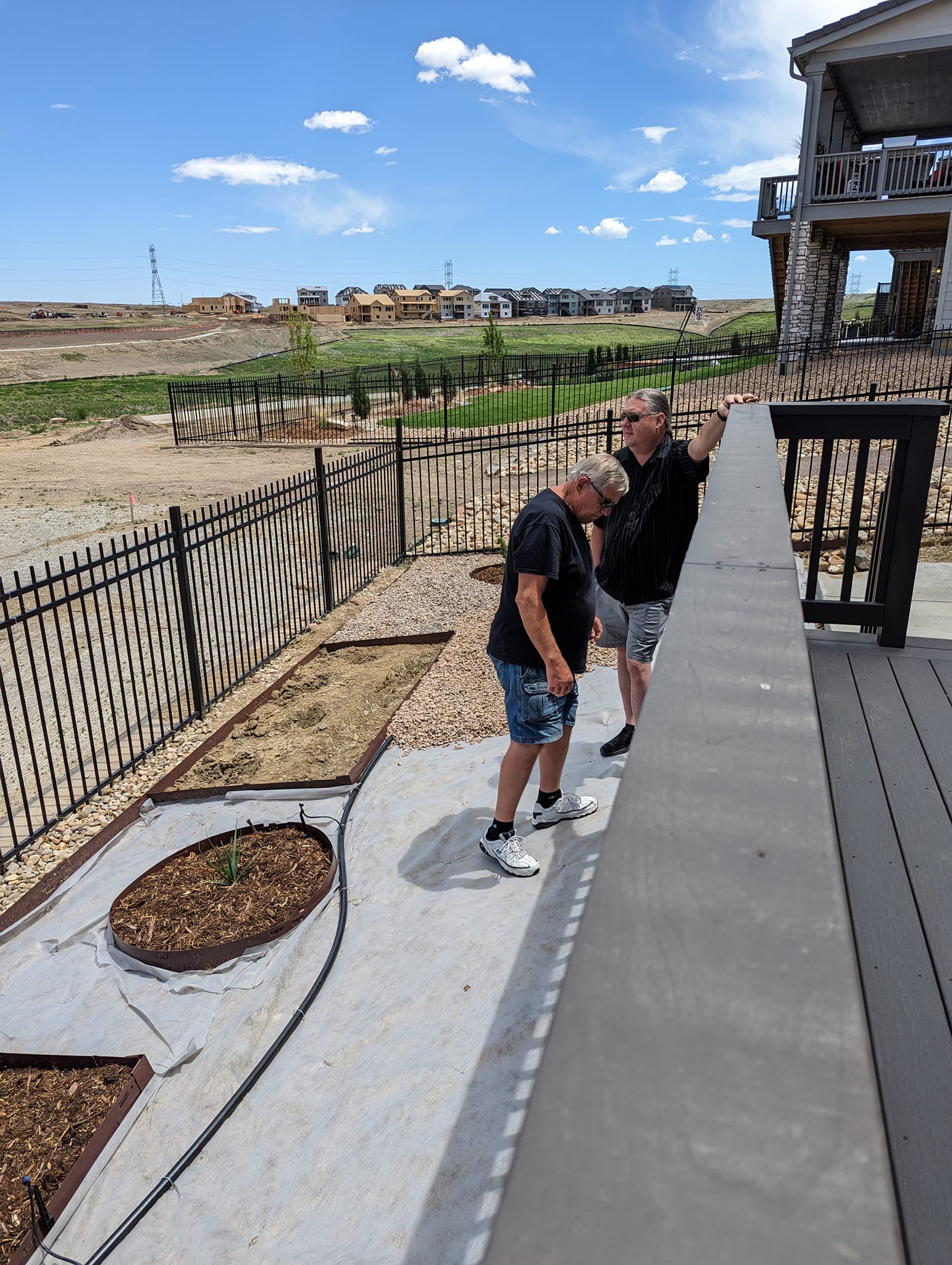 It's deck day! When we bought the house, the builder had landscaped the front yard, but the sides and back have been mud. Part 1 of our landscaping plan is to install a new deck in the back yard. It will come out from the basement door and wrap around the back of the house. (Foundation warranty and HOA rules are that we can't change the grade of the dirt, and it is a pretty steep slope, so we are going over the top with a deck in order to get some usable level ground)