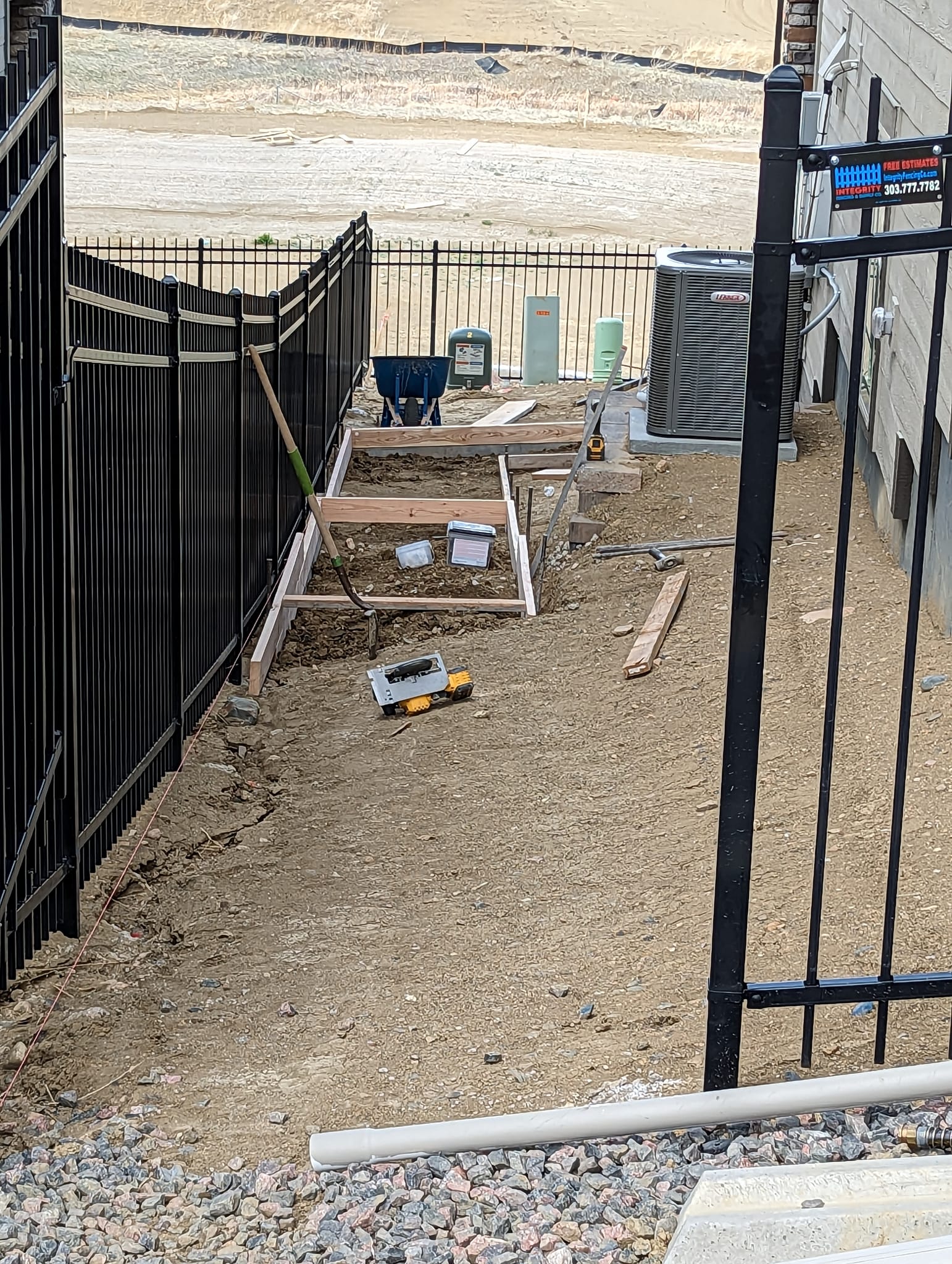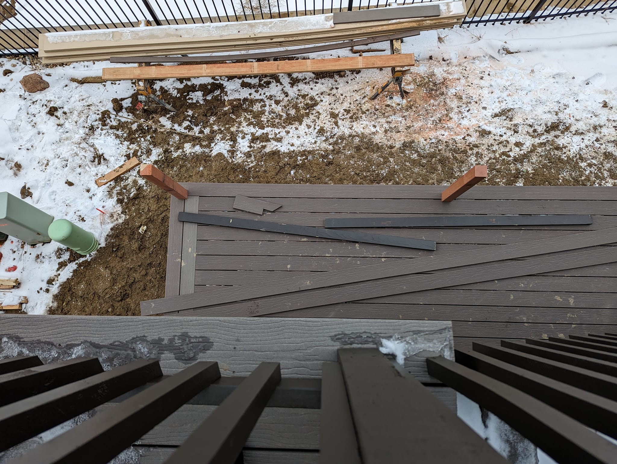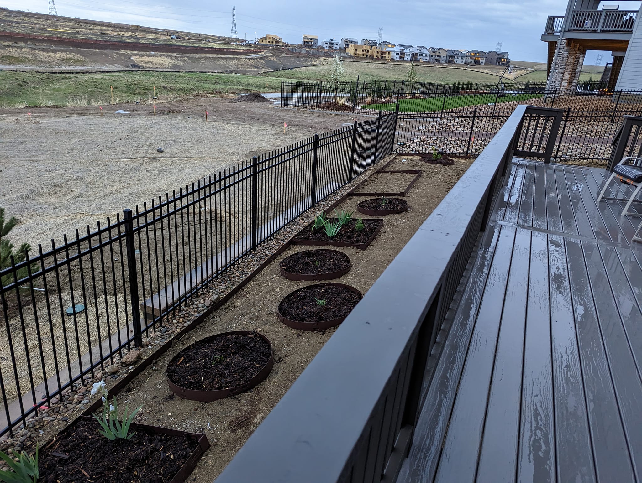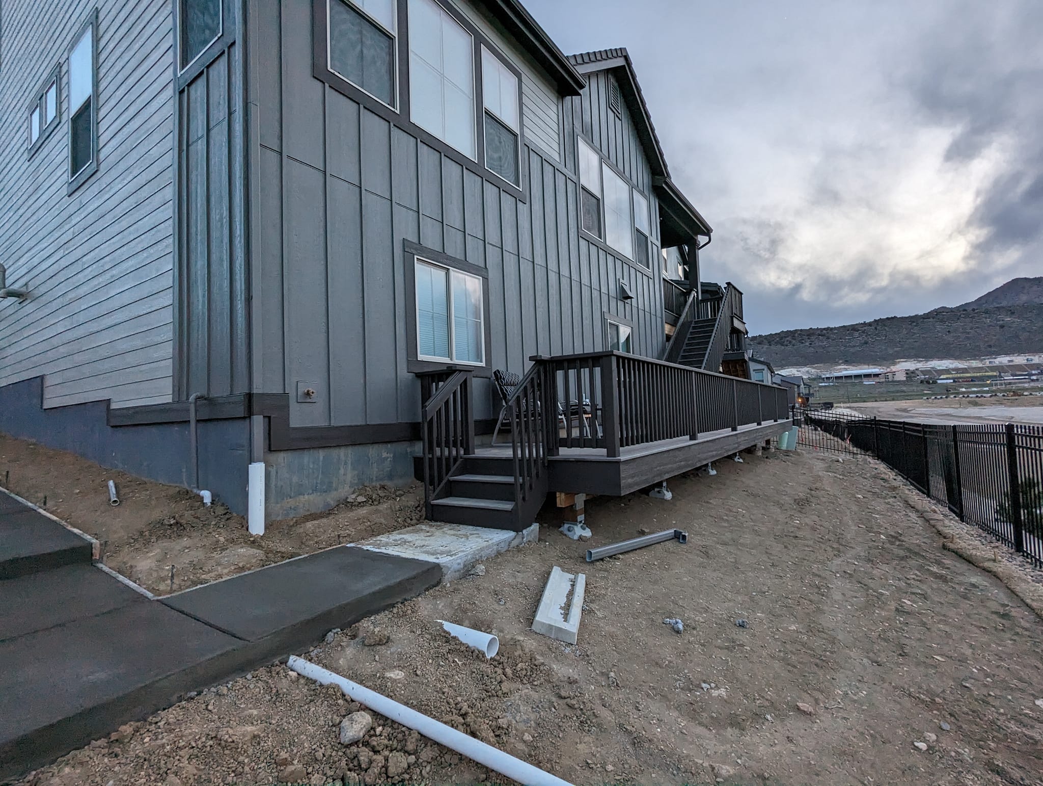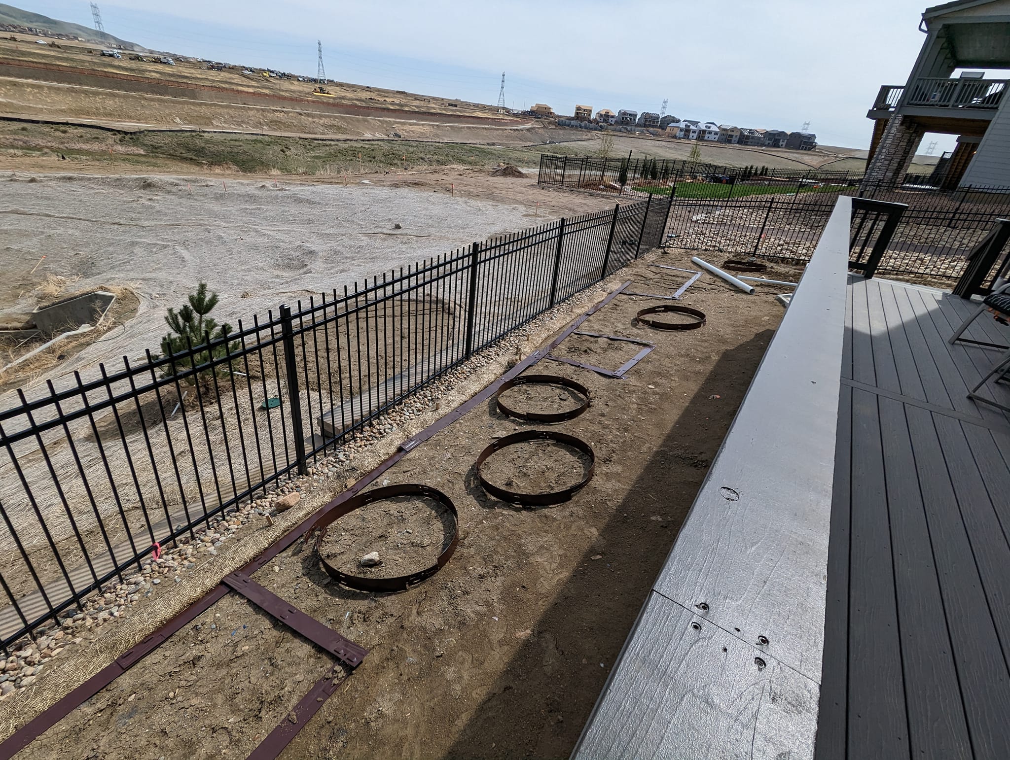 It's deck day! When we bought the house, the builder had landscaped the front yard, but the sides and back have been mud. Part 1 of our landscaping plan is to install a new deck in the back yard. It will come out from the basement door and wrap around the back of the house. (Foundation warranty and HOA rules are that we can't change the grade of the dirt, and it is a pretty steep slope, so we are going over the top with a deck in order to get some usable level ground)