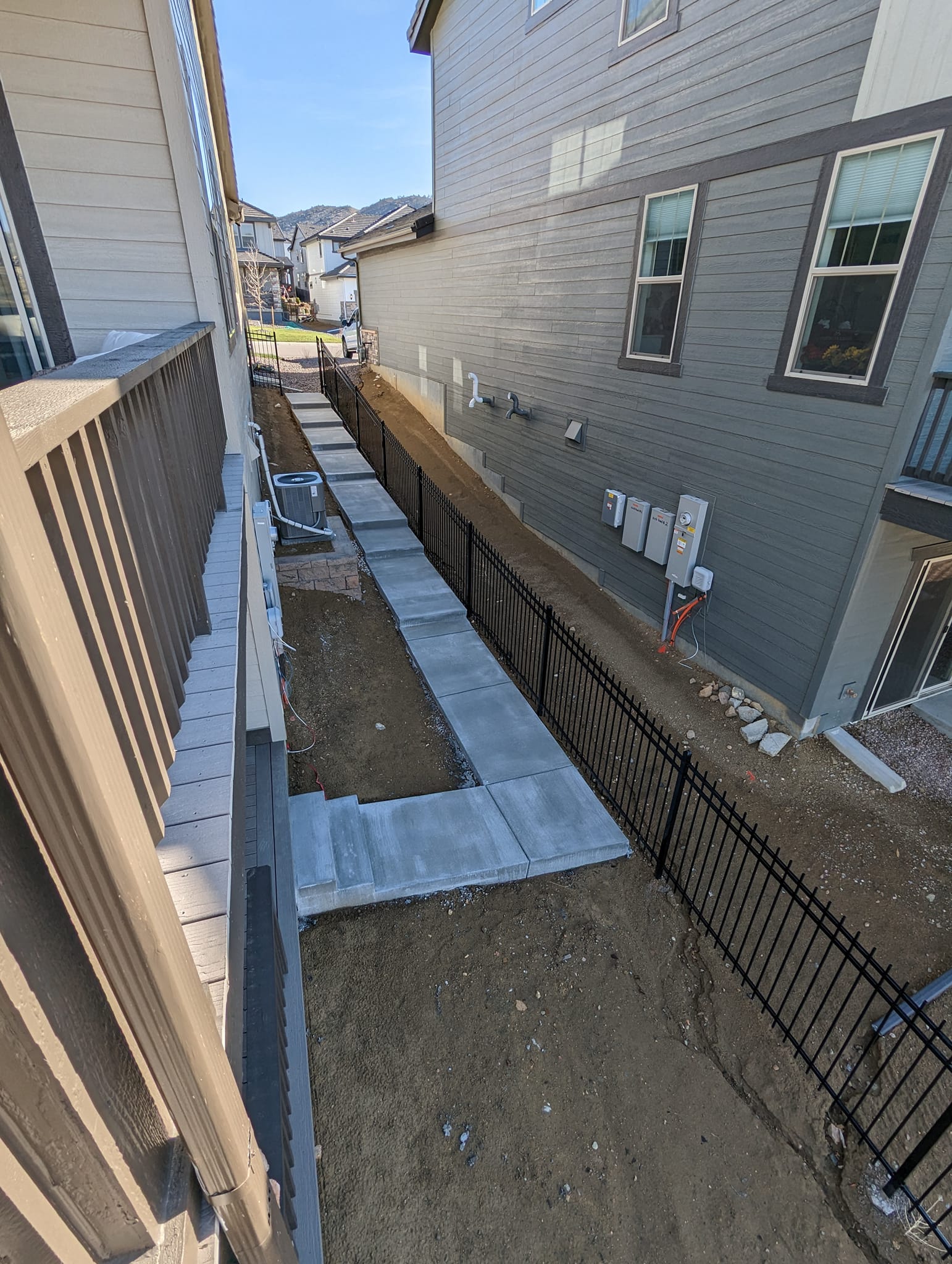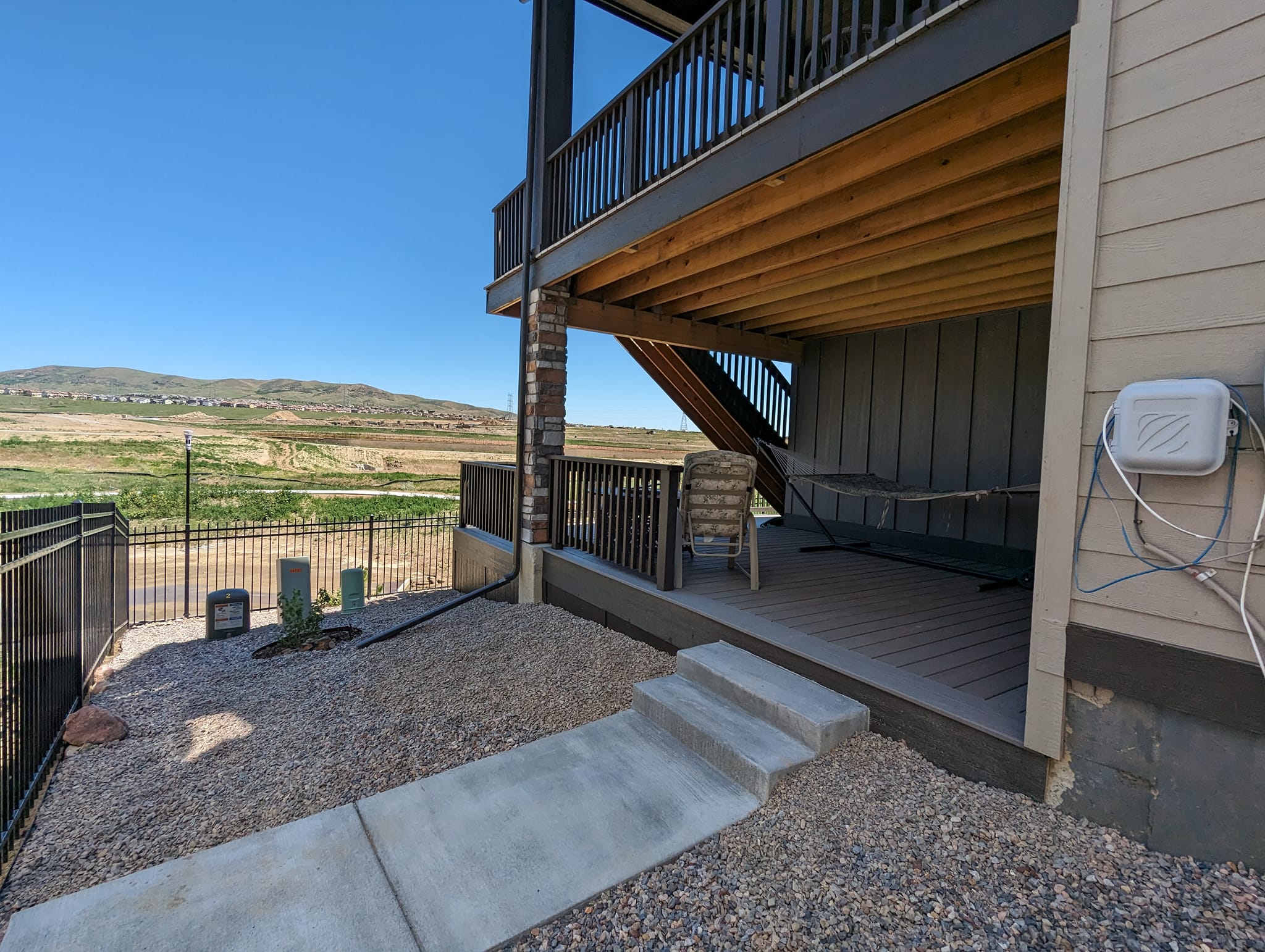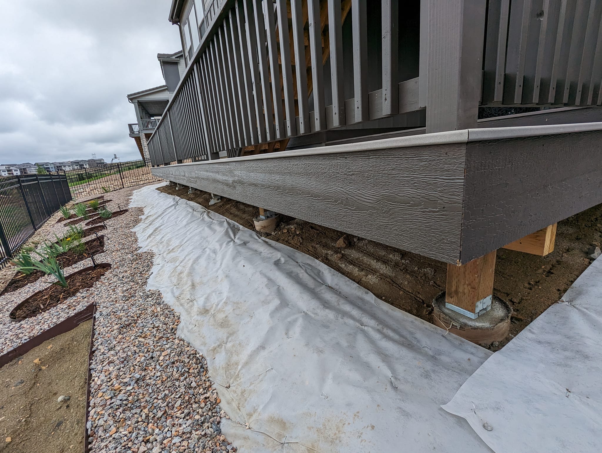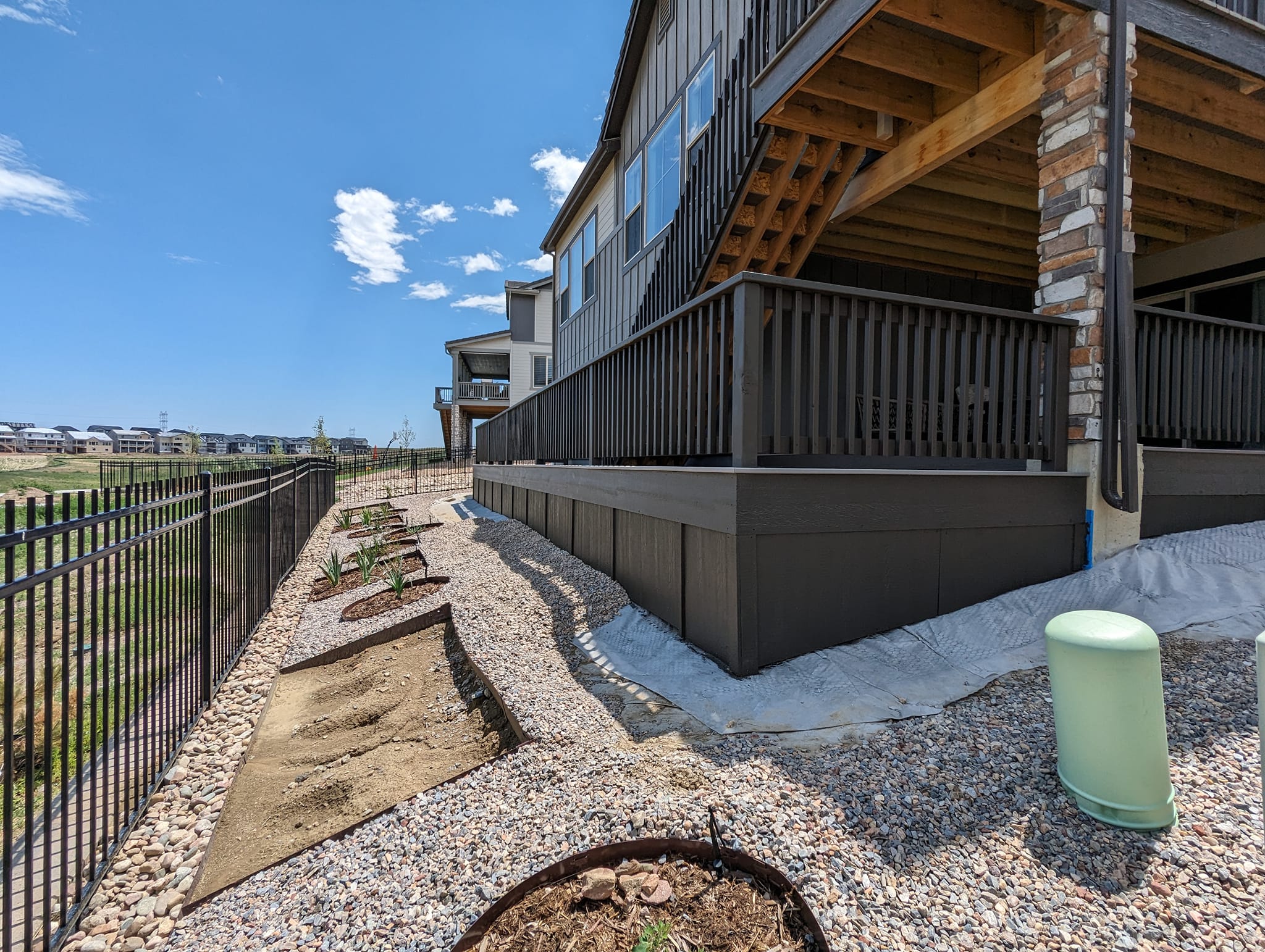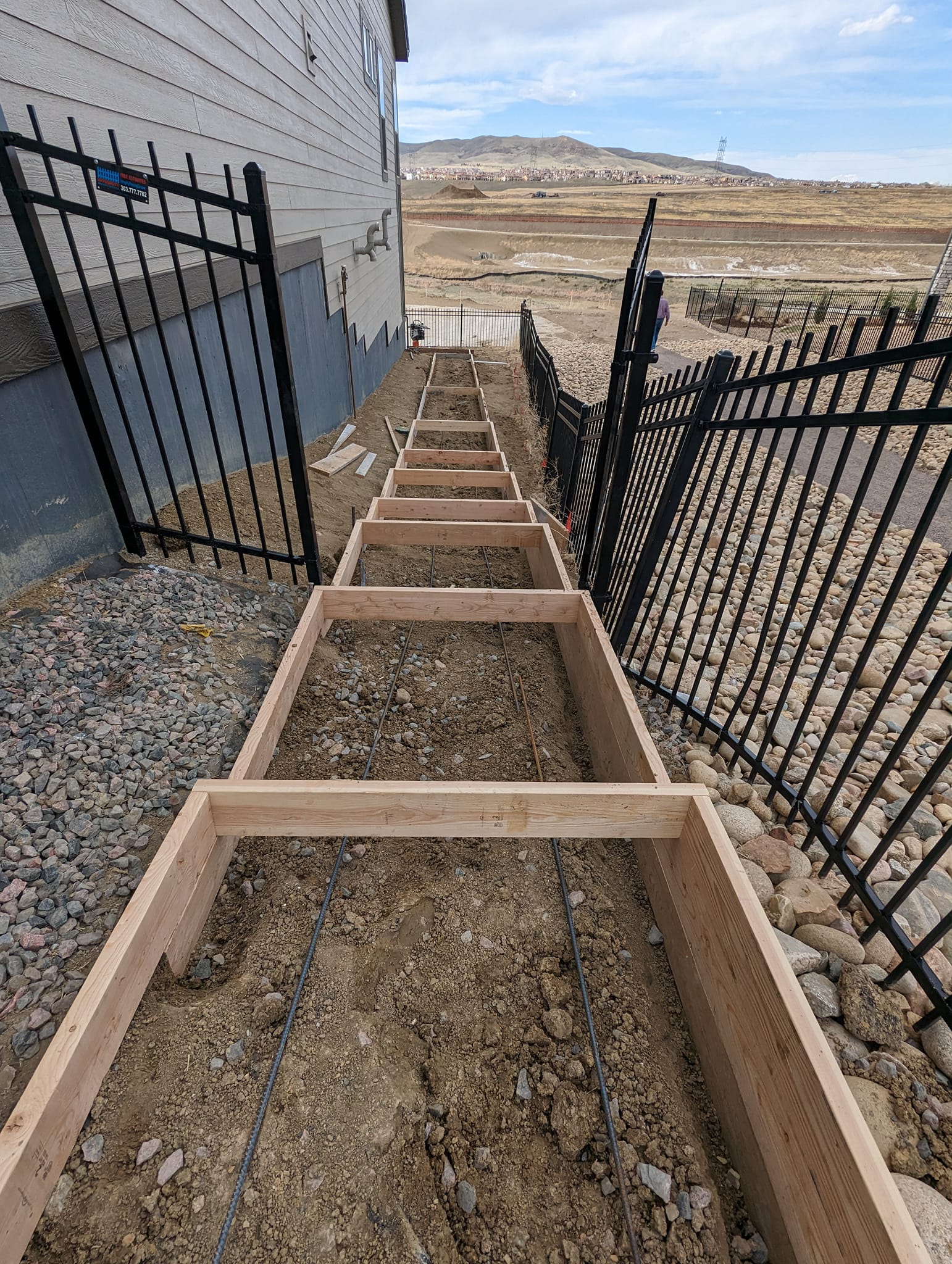 It's deck day! When we bought the house, the builder had landscaped the front yard, but the sides and back have been mud. Part 1 of our landscaping plan is to install a new deck in the back yard. It will come out from the basement door and wrap around the back of the house. (Foundation warranty and HOA rules are that we can't change the grade of the dirt, and it is a pretty steep slope, so we are going over the top with a deck in order to get some usable level ground)