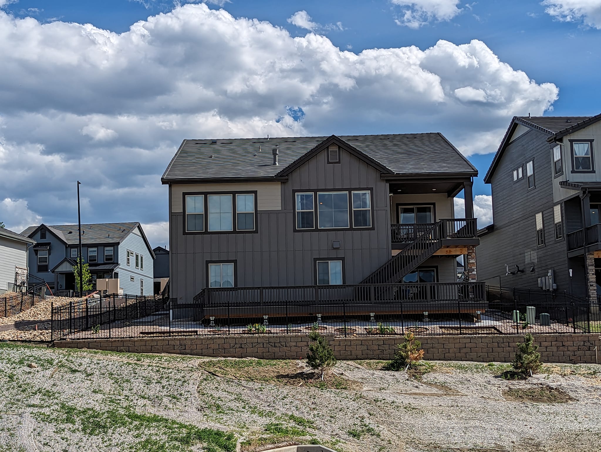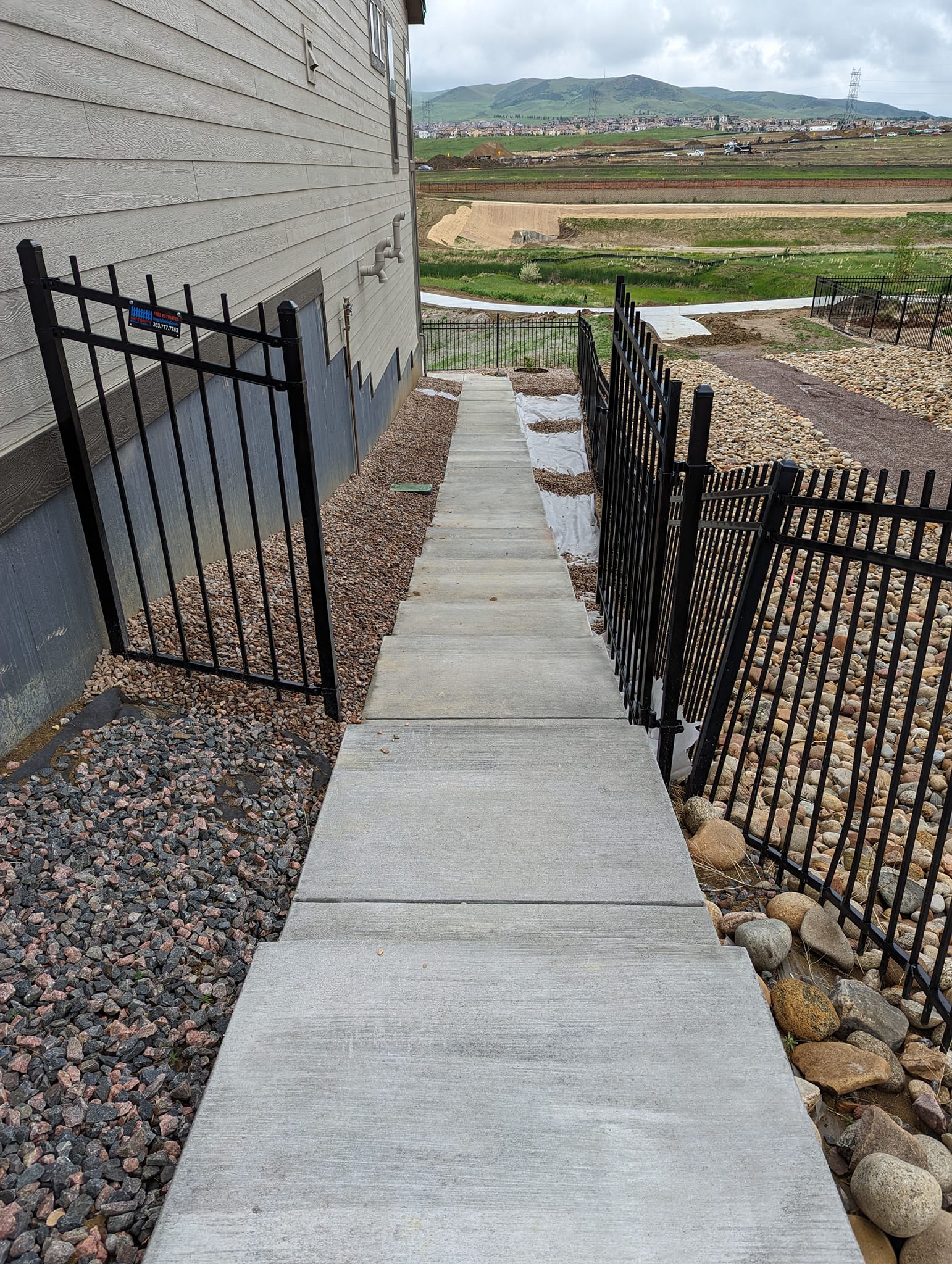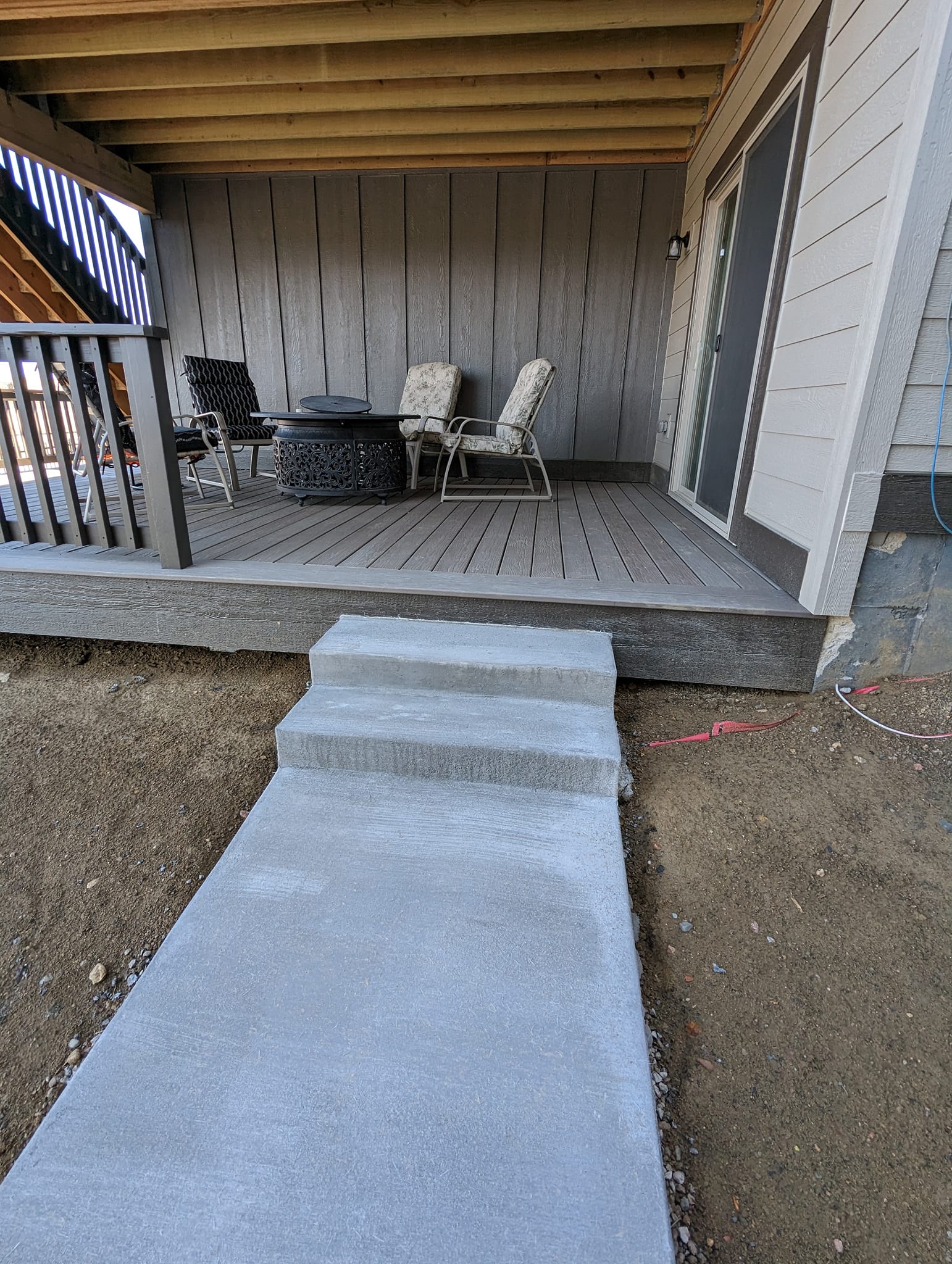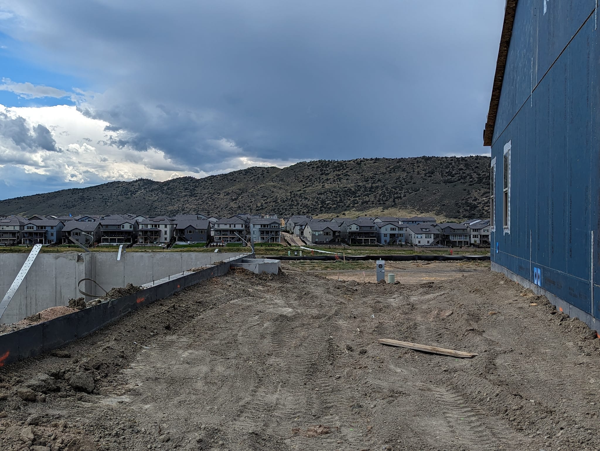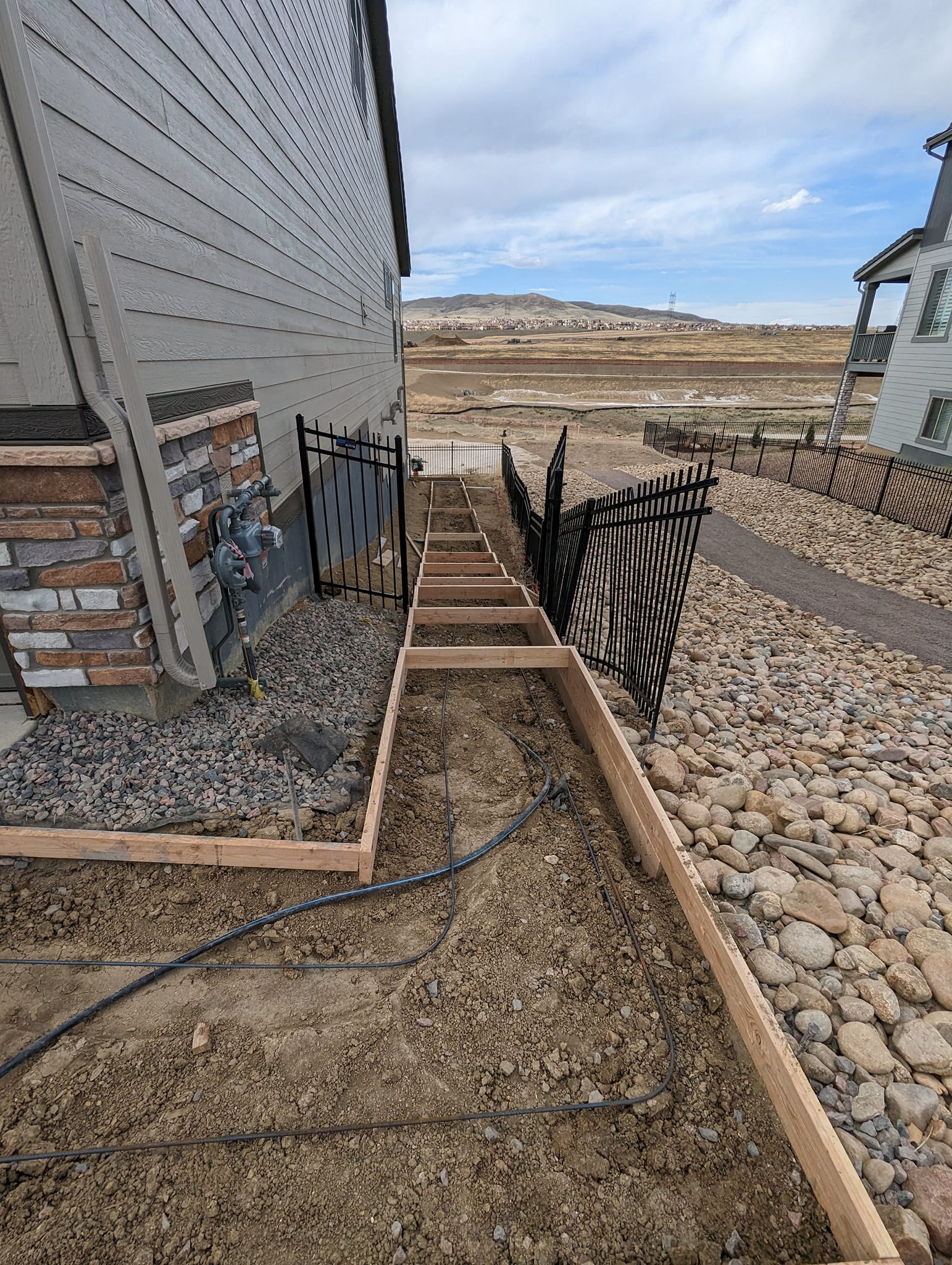 It's deck day! When we bought the house, the builder had landscaped the front yard, but the sides and back have been mud. Part 1 of our landscaping plan is to install a new deck in the back yard. It will come out from the basement door and wrap around the back of the house. (Foundation warranty and HOA rules are that we can't change the grade of the dirt, and it is a pretty steep slope, so we are going over the top with a deck in order to get some usable level ground)