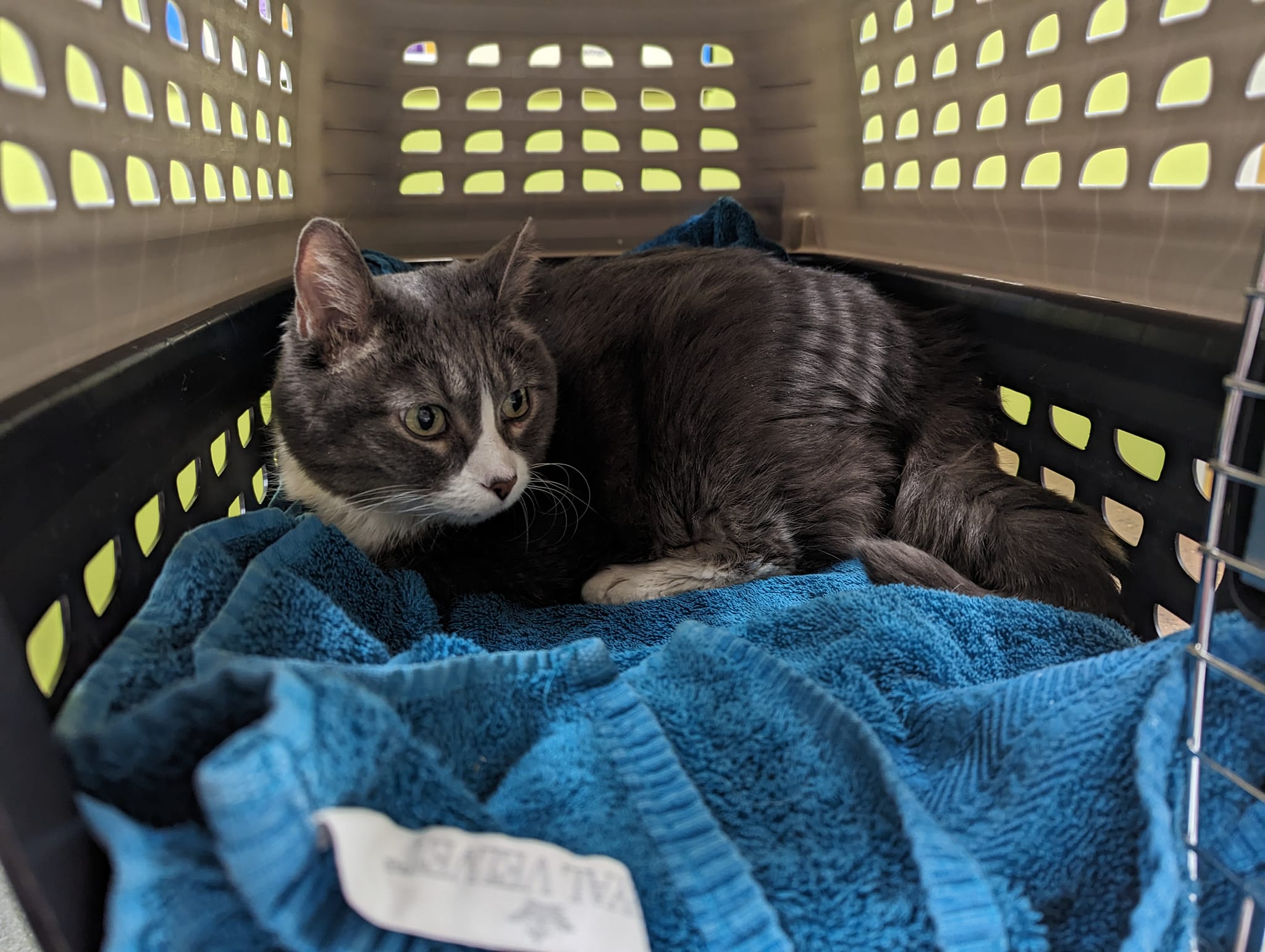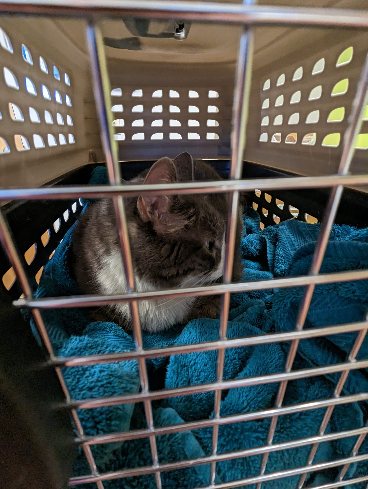 Waiting for the hospital discharge paperwork. Carrier, sweet carrier. Ziggy was happy to be loaded up and one step closer to heading home.