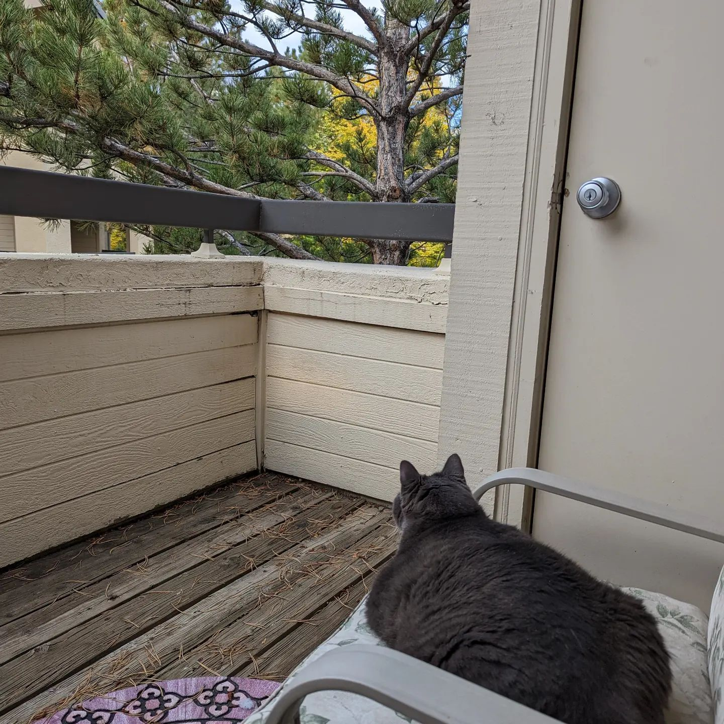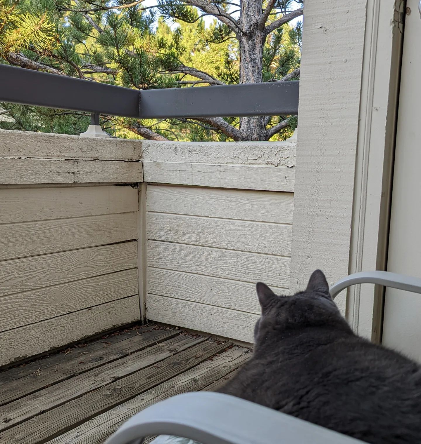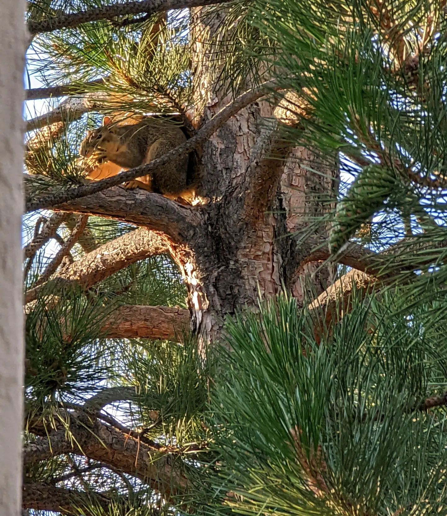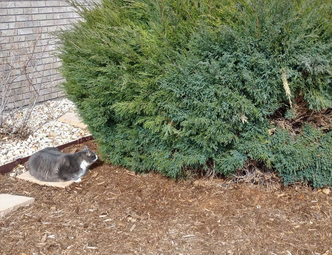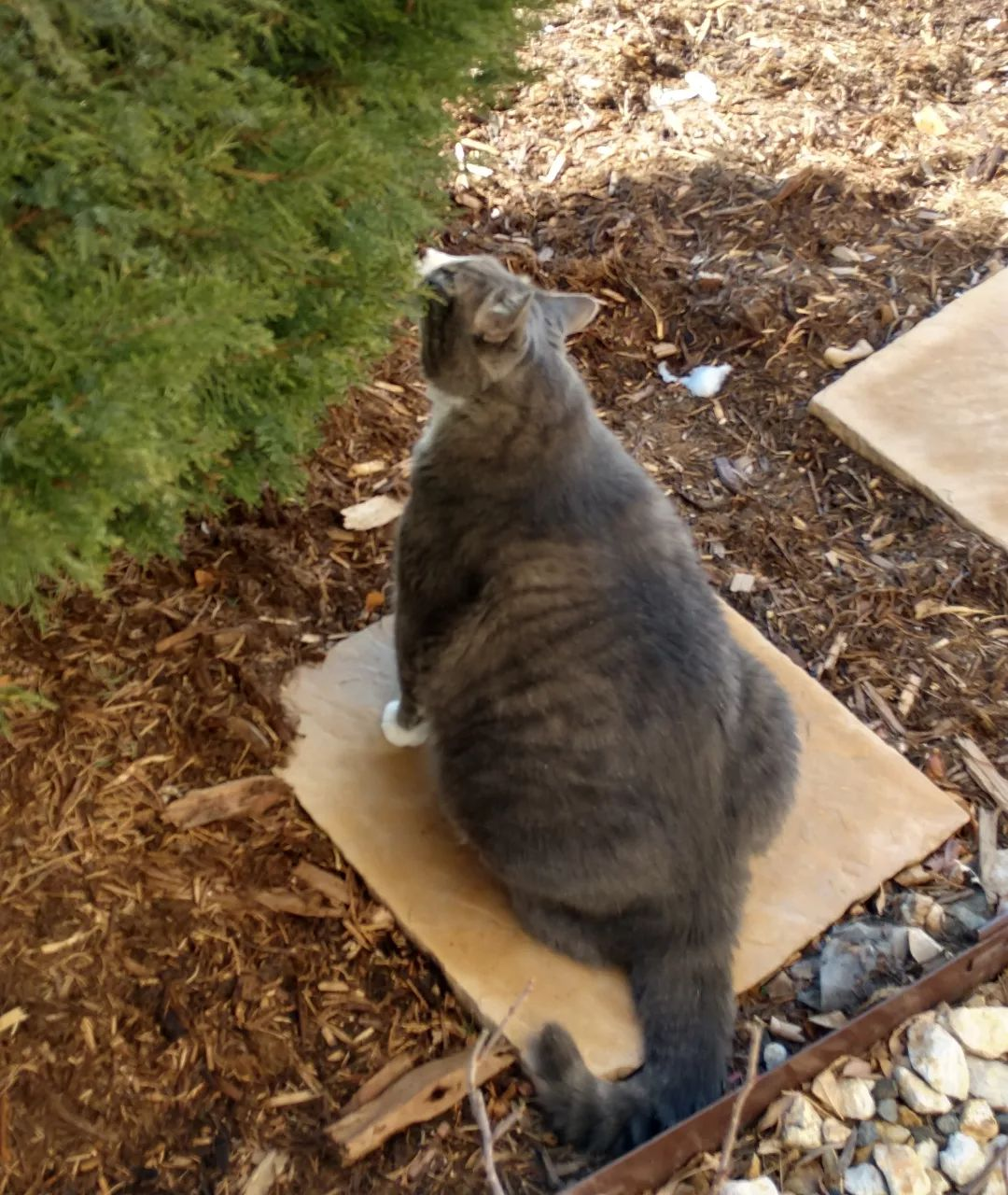 Looks like this is the guard post for the day. I messed up and hopefully we didn't wake up too many neighbors. I let Ziggy out without seeing the shy kitten was under one of the chairs in the back yard. Hissing and yeowls ensued. The kitten quickly realized that 3 feet up in a tree was sufficient to get away from Ziggy. Being reminded that she's an old lady by him sitting there looking down on her didn't make things better. But no one got hurt and the kitten was back at the front door within minutes. All part of the getting to know you process, I suppose. ?????? She's been in this spot for half an hour now.