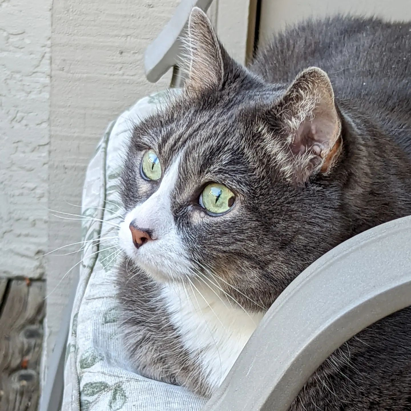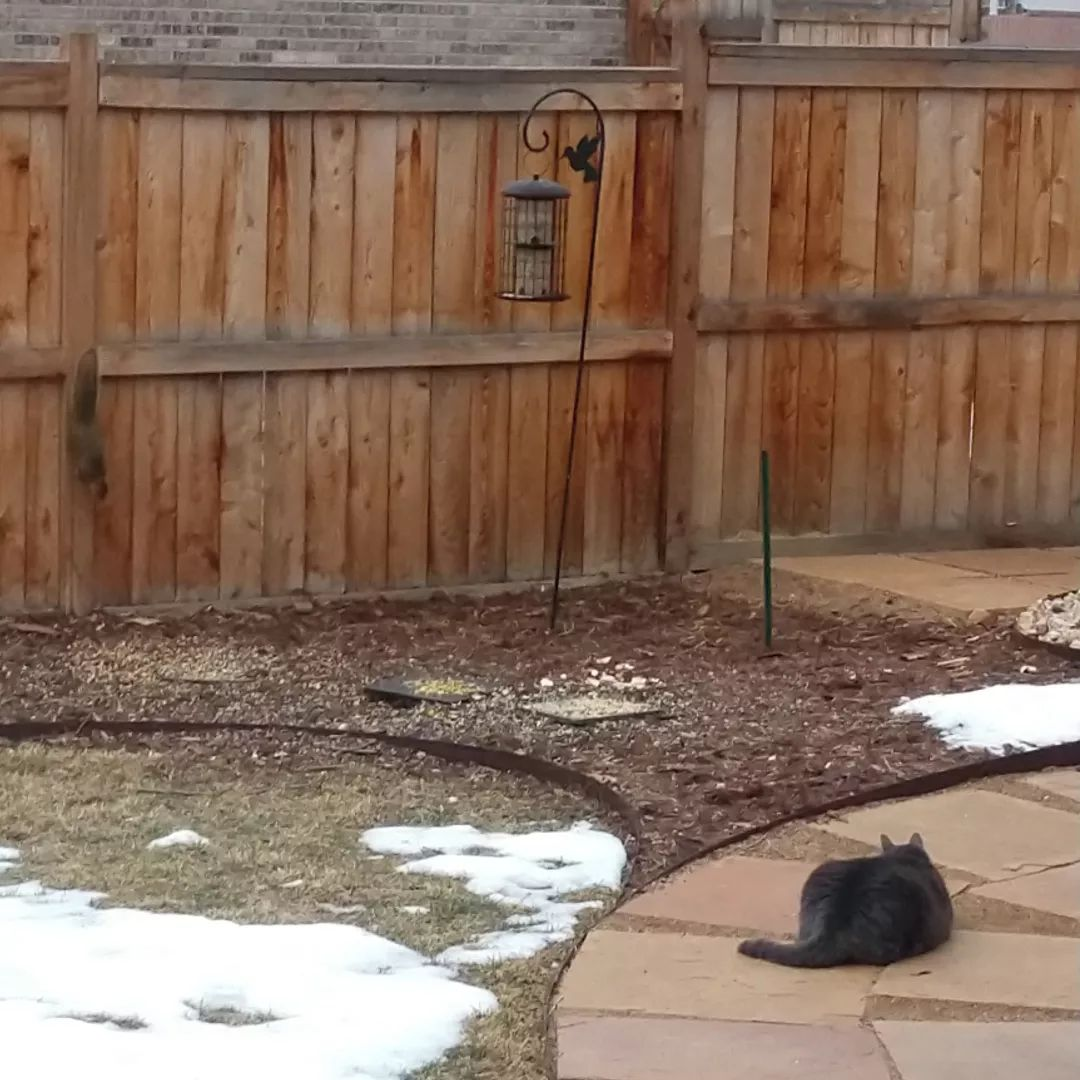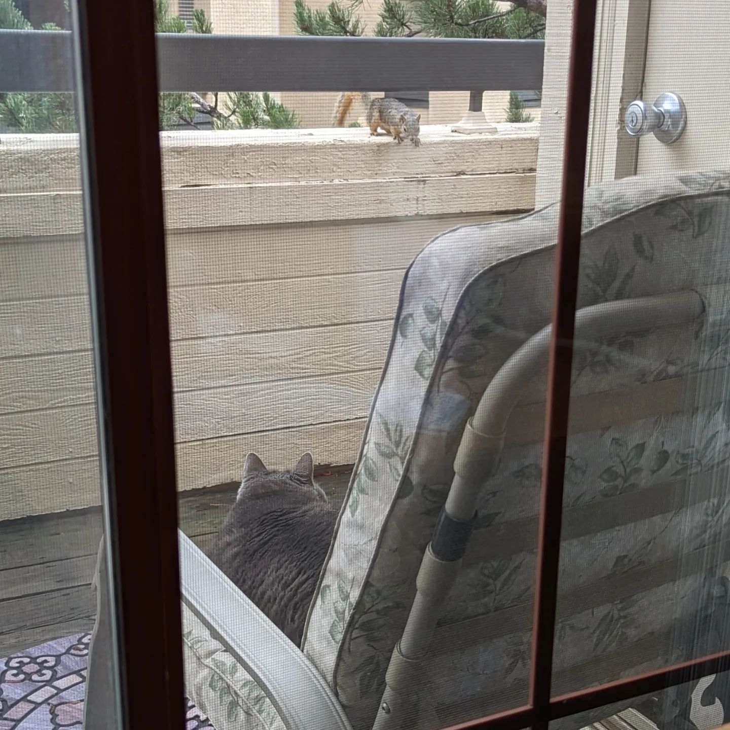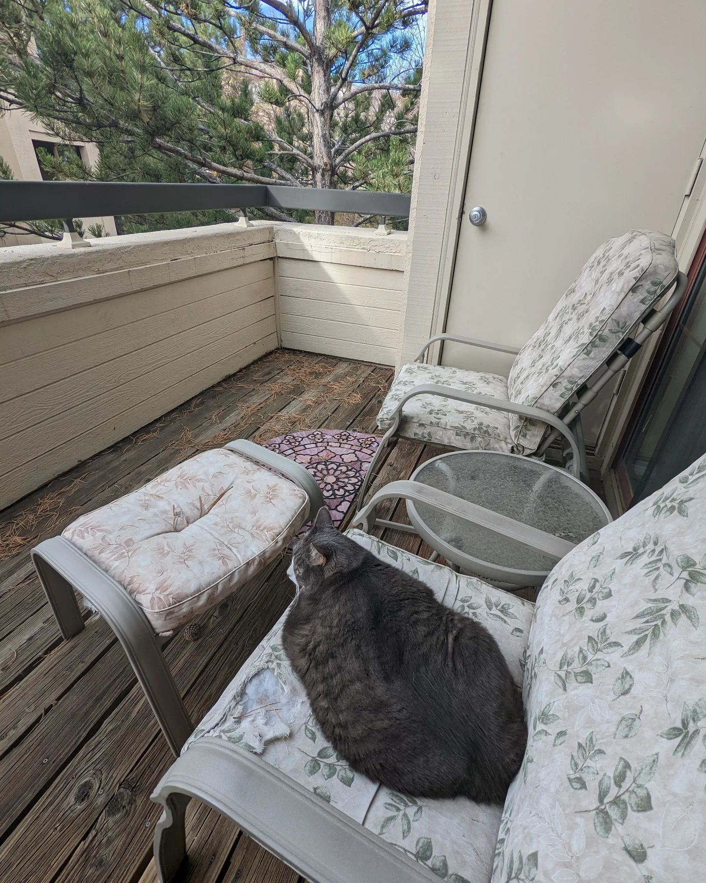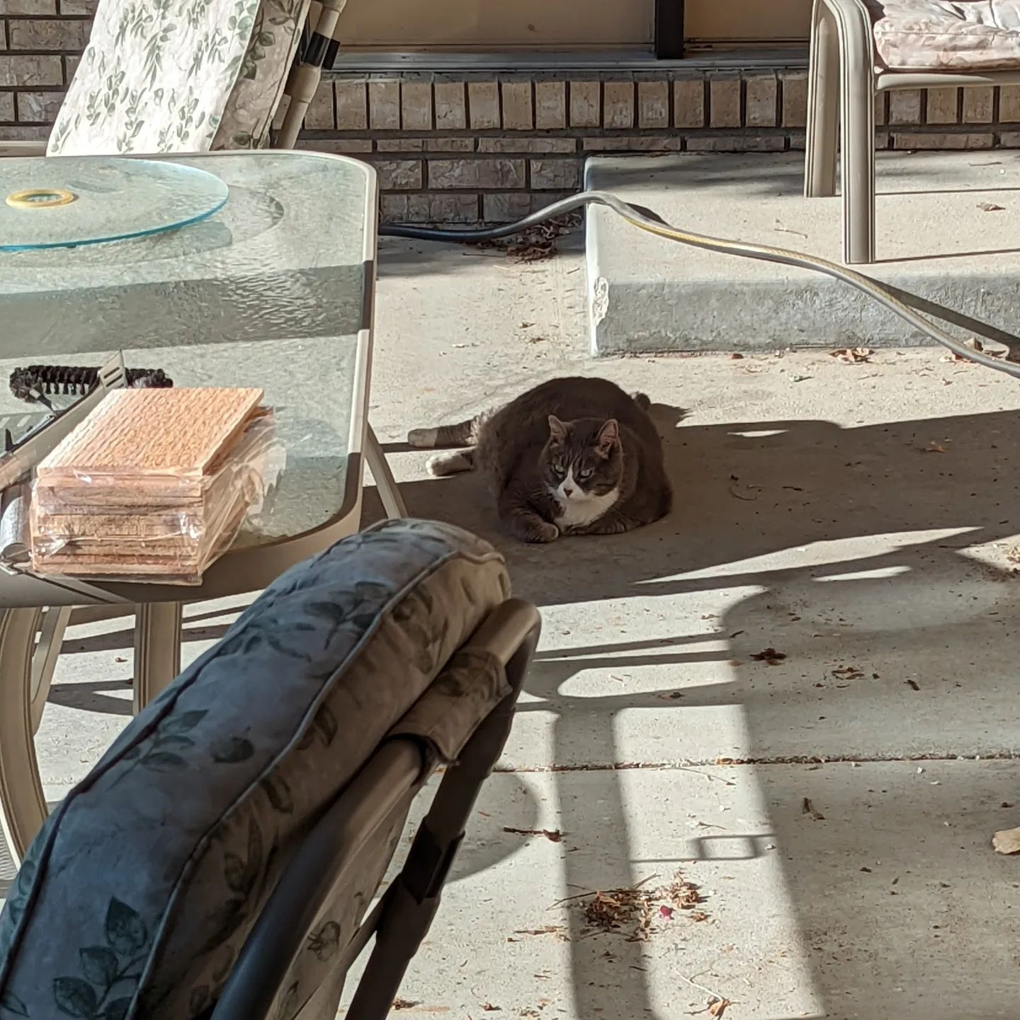 Looks like this is the guard post for the day. I messed up and hopefully we didn't wake up too many neighbors. I let Ziggy out without seeing the shy kitten was under one of the chairs in the back yard. Hissing and yeowls ensued. The kitten quickly realized that 3 feet up in a tree was sufficient to get away from Ziggy. Being reminded that she's an old lady by him sitting there looking down on her didn't make things better. But no one got hurt and the kitten was back at the front door within minutes. All part of the getting to know you process, I suppose. ?????? She's been in this spot for half an hour now.