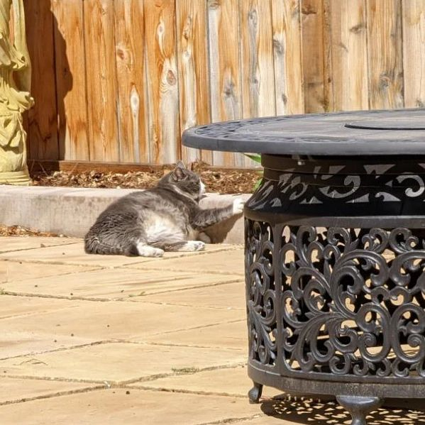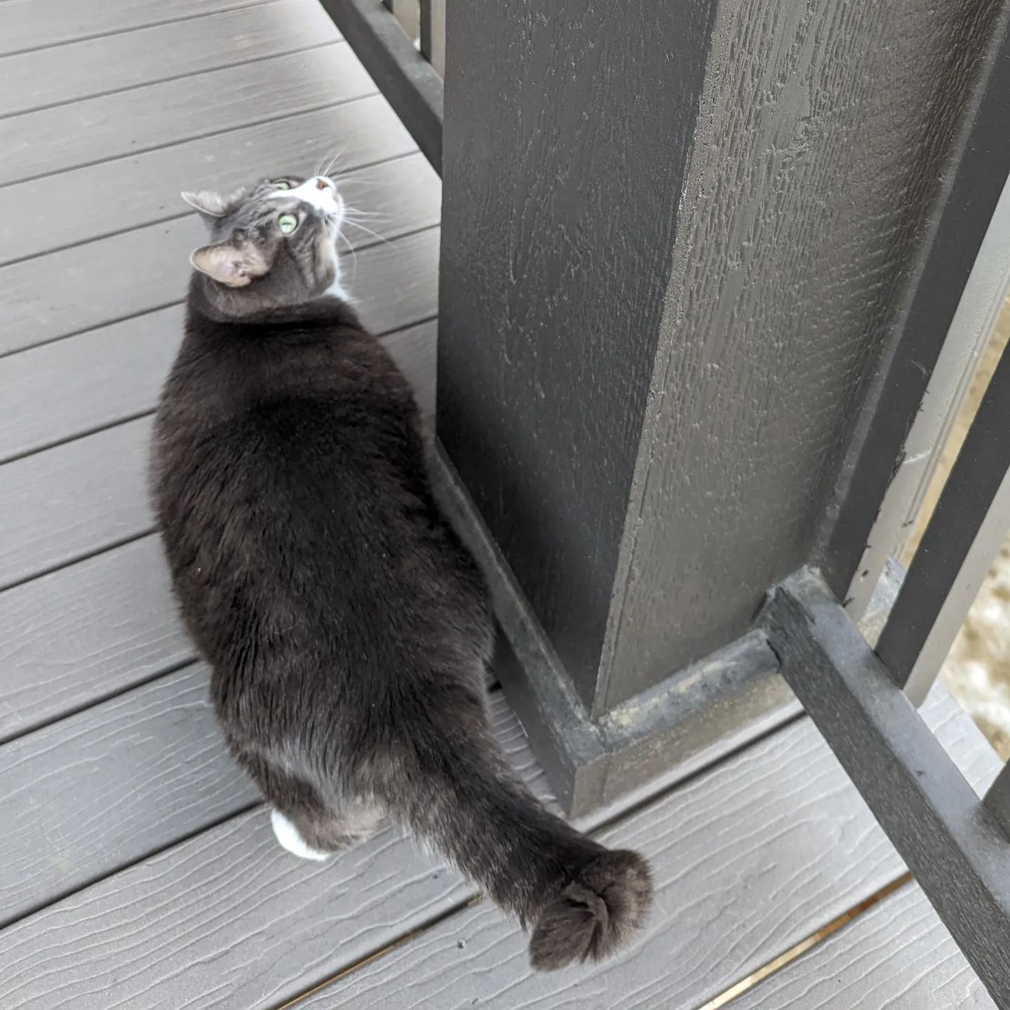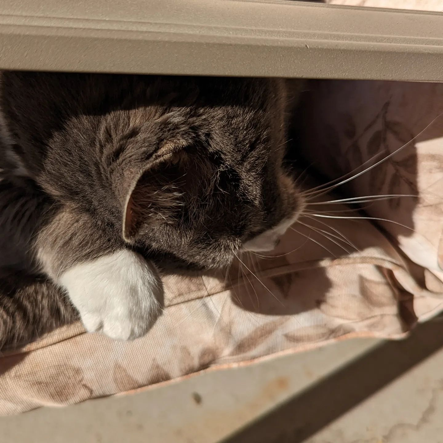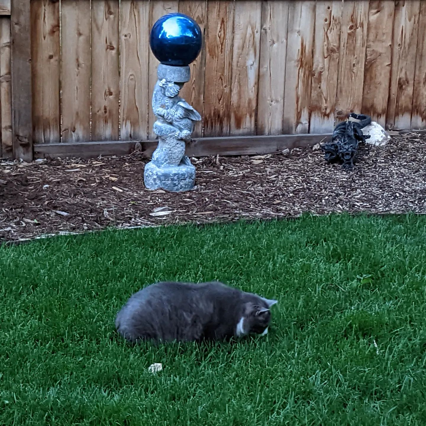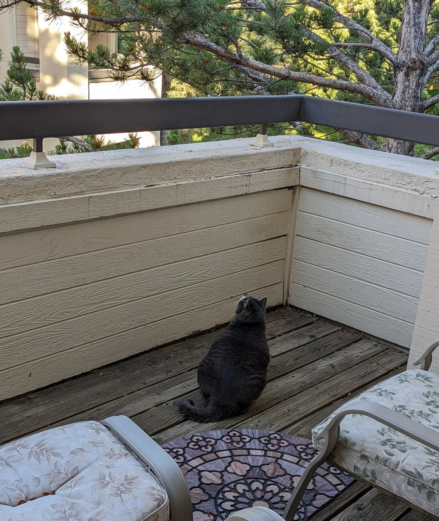 Looks like this is the guard post for the day. I messed up and hopefully we didn't wake up too many neighbors. I let Ziggy out without seeing the shy kitten was under one of the chairs in the back yard. Hissing and yeowls ensued. The kitten quickly realized that 3 feet up in a tree was sufficient to get away from Ziggy. Being reminded that she's an old lady by him sitting there looking down on her didn't make things better. But no one got hurt and the kitten was back at the front door within minutes. All part of the getting to know you process, I suppose. ?????? She's been in this spot for half an hour now.