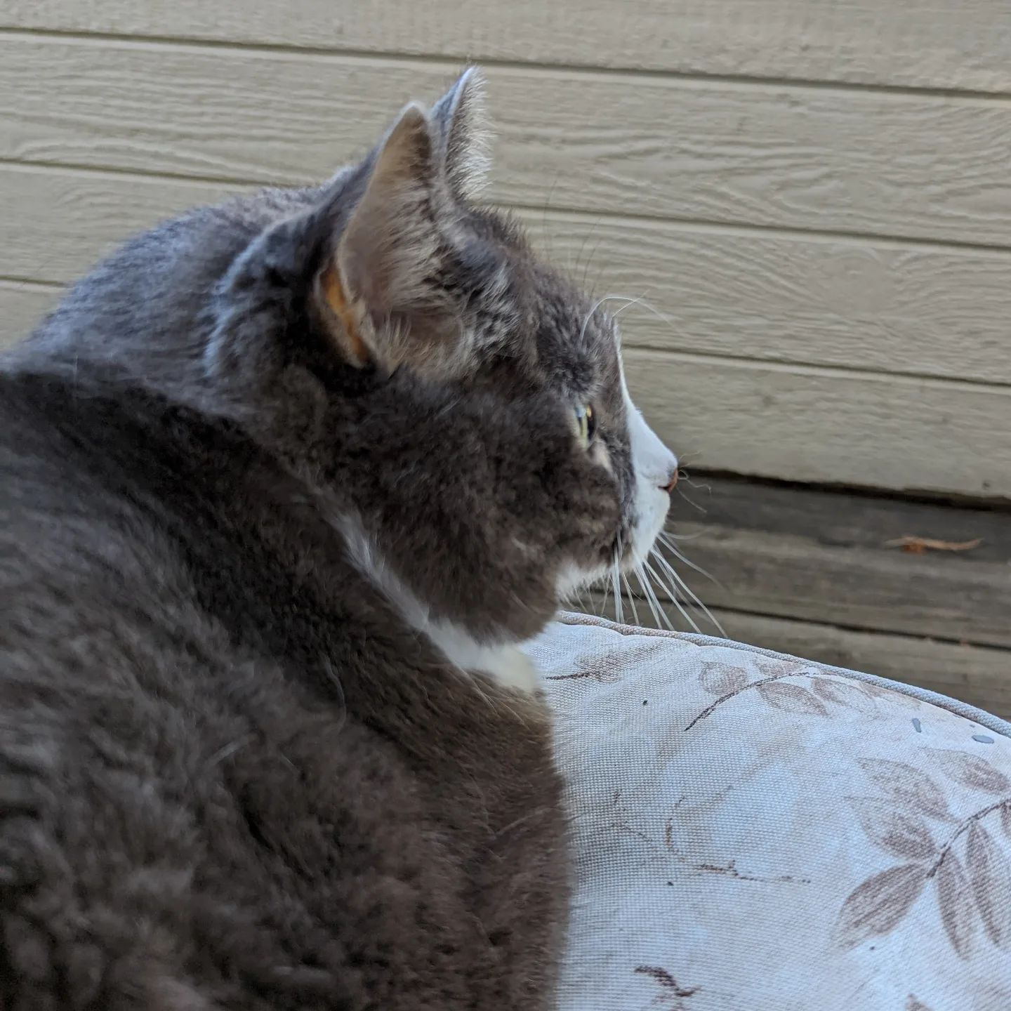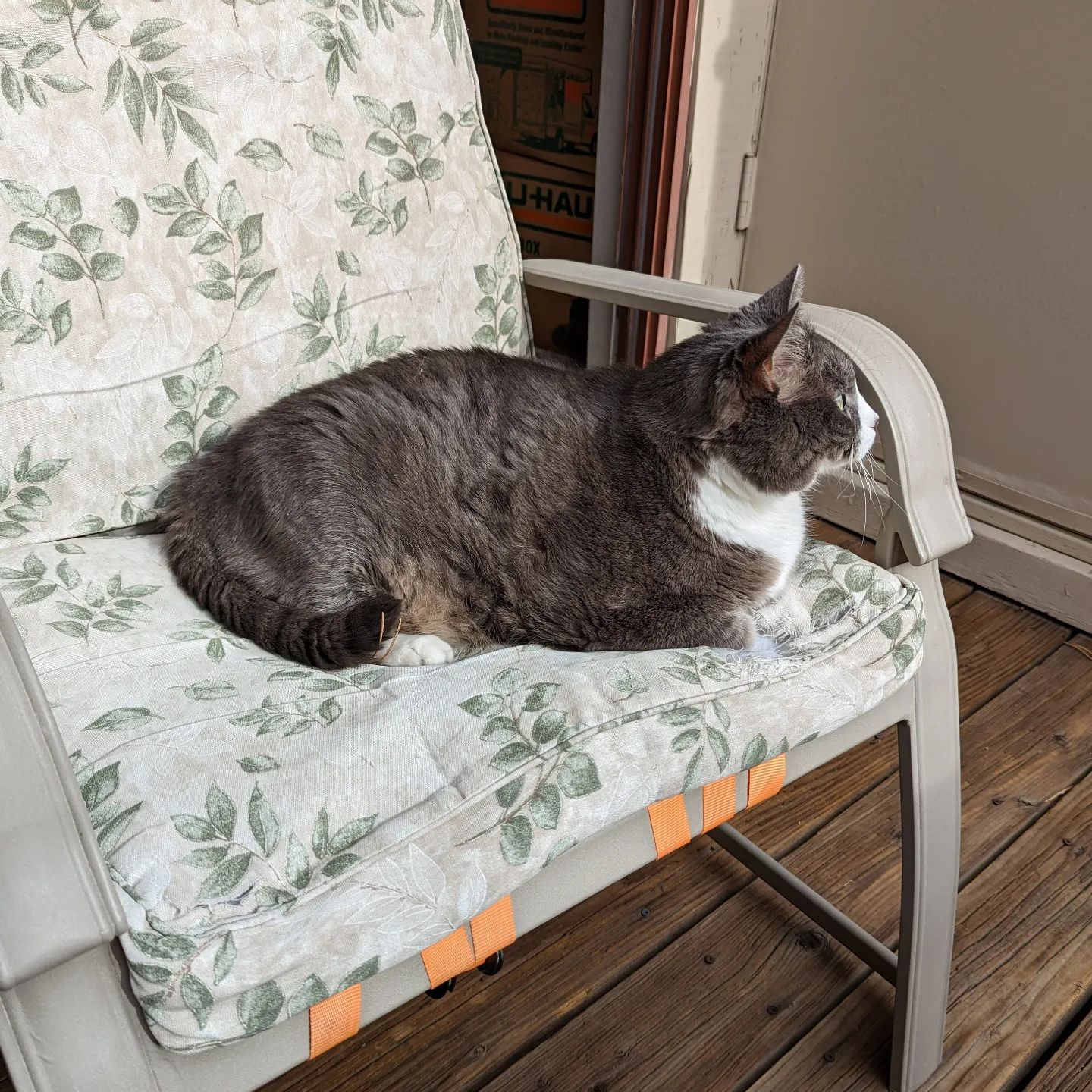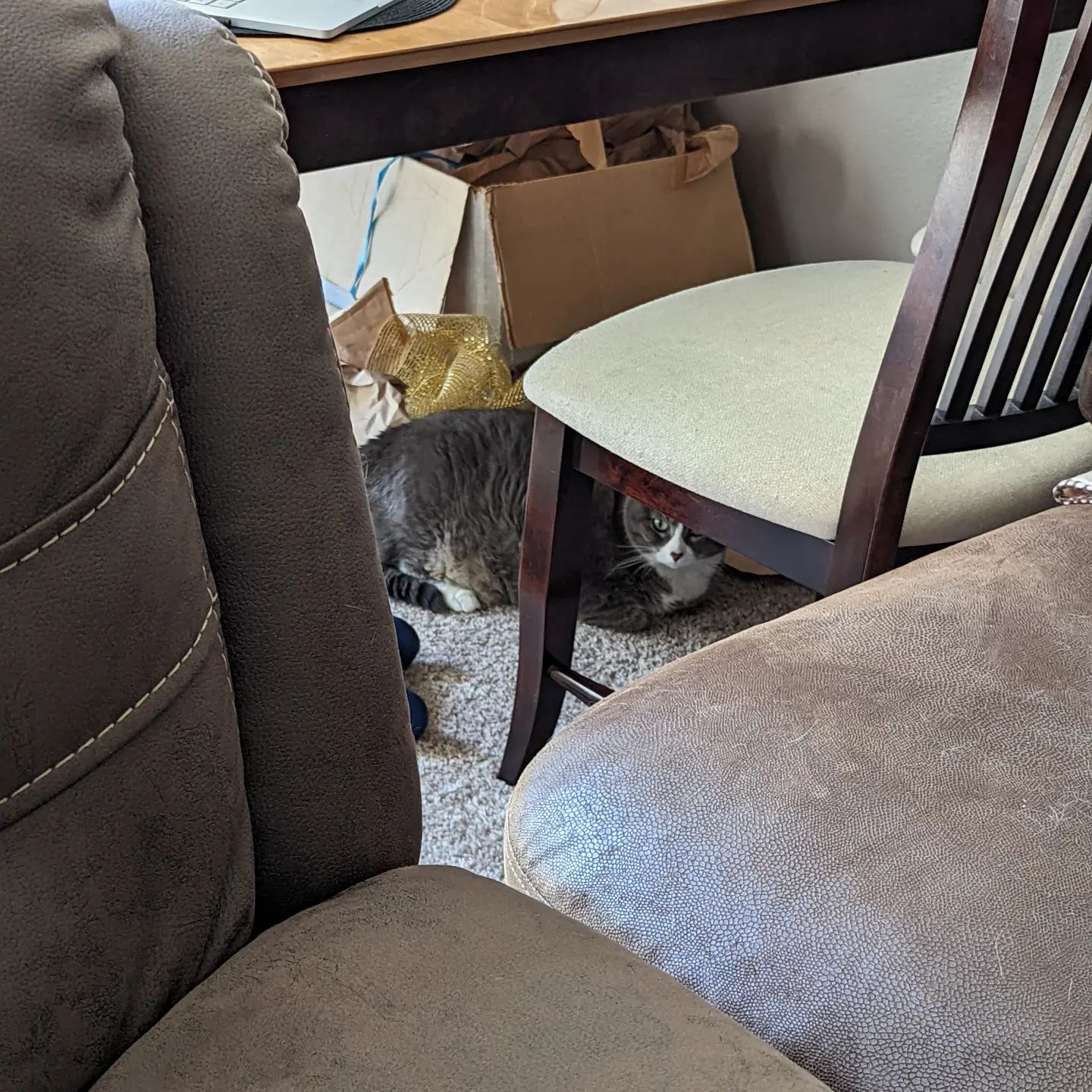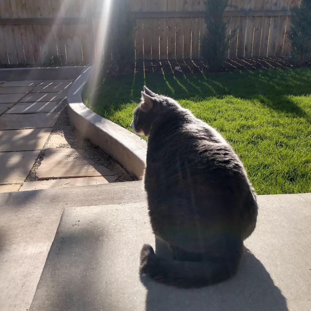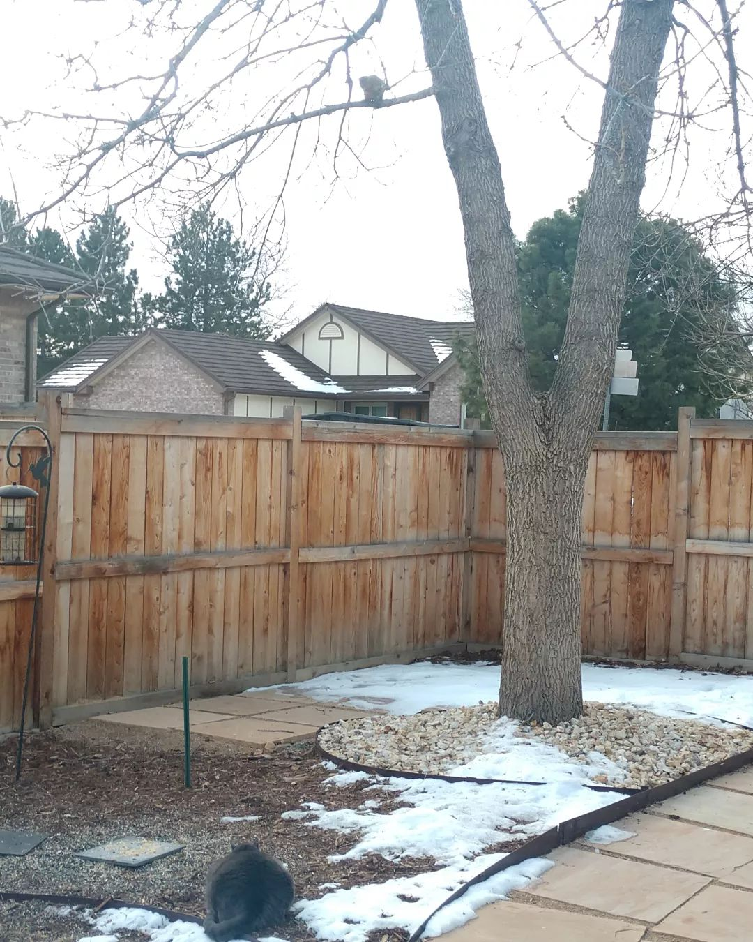 Looks like this is the guard post for the day. I messed up and hopefully we didn't wake up too many neighbors. I let Ziggy out without seeing the shy kitten was under one of the chairs in the back yard. Hissing and yeowls ensued. The kitten quickly realized that 3 feet up in a tree was sufficient to get away from Ziggy. Being reminded that she's an old lady by him sitting there looking down on her didn't make things better. But no one got hurt and the kitten was back at the front door within minutes. All part of the getting to know you process, I suppose. ?????? She's been in this spot for half an hour now.
