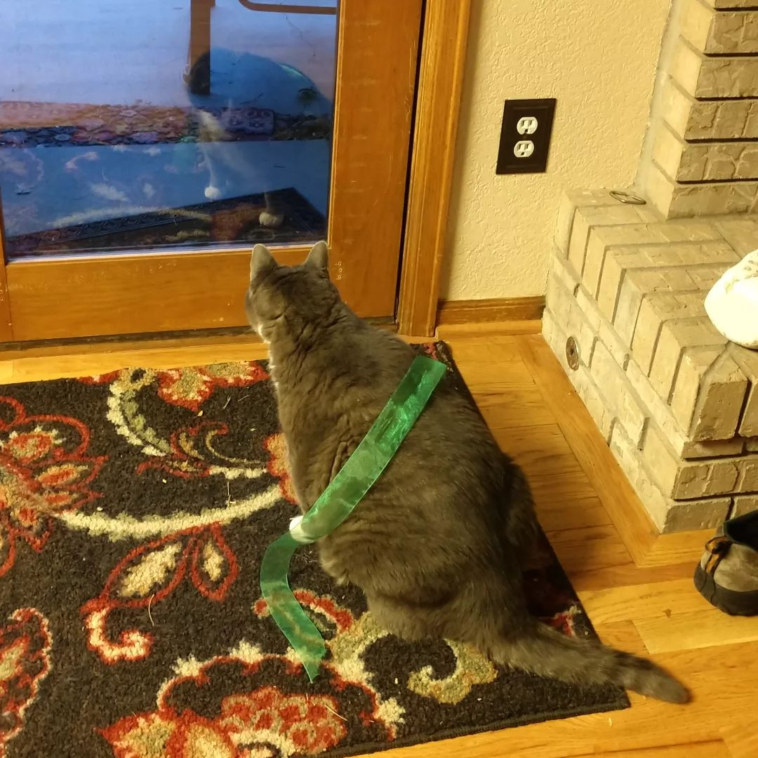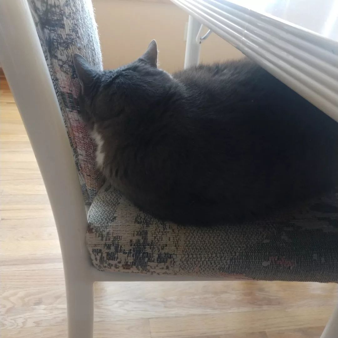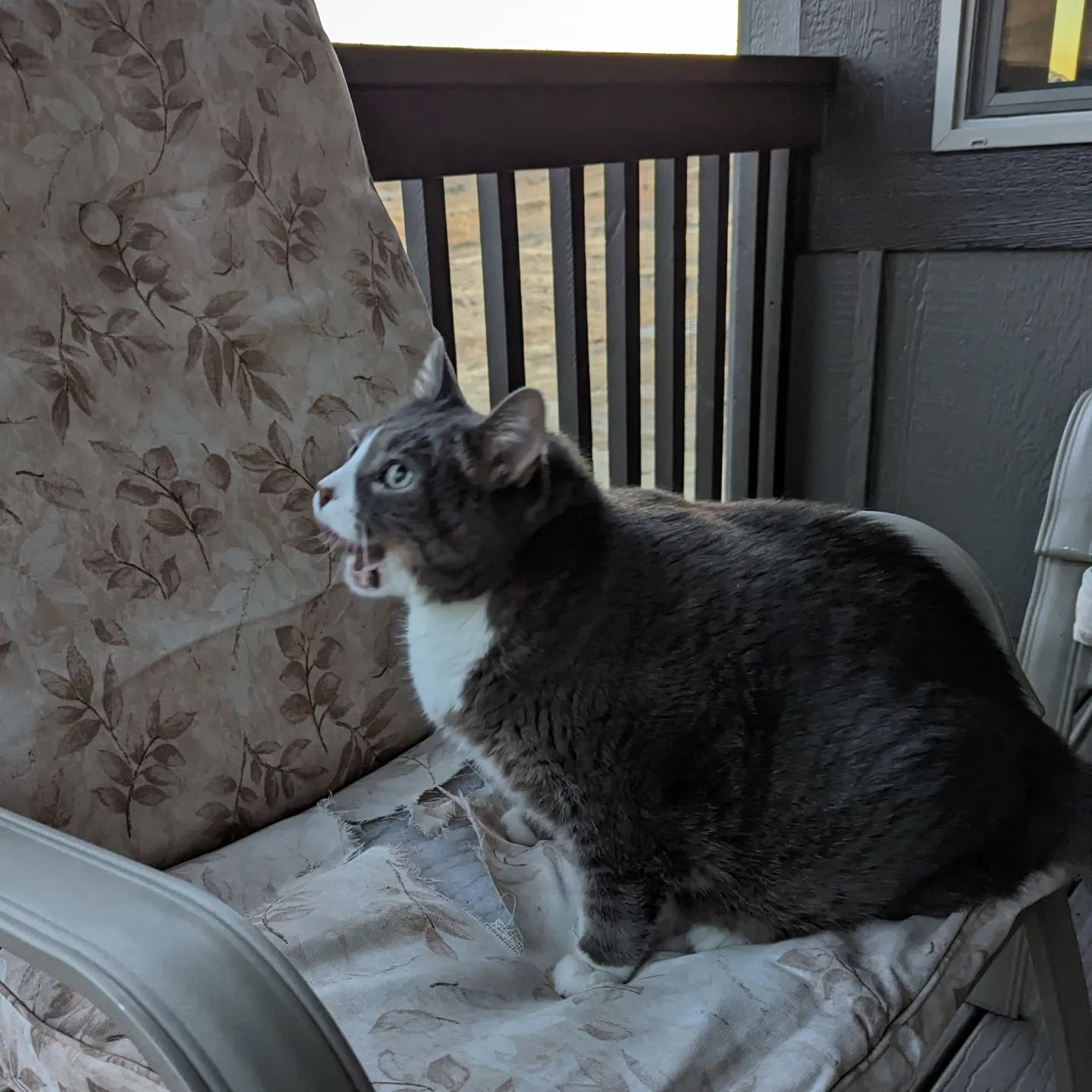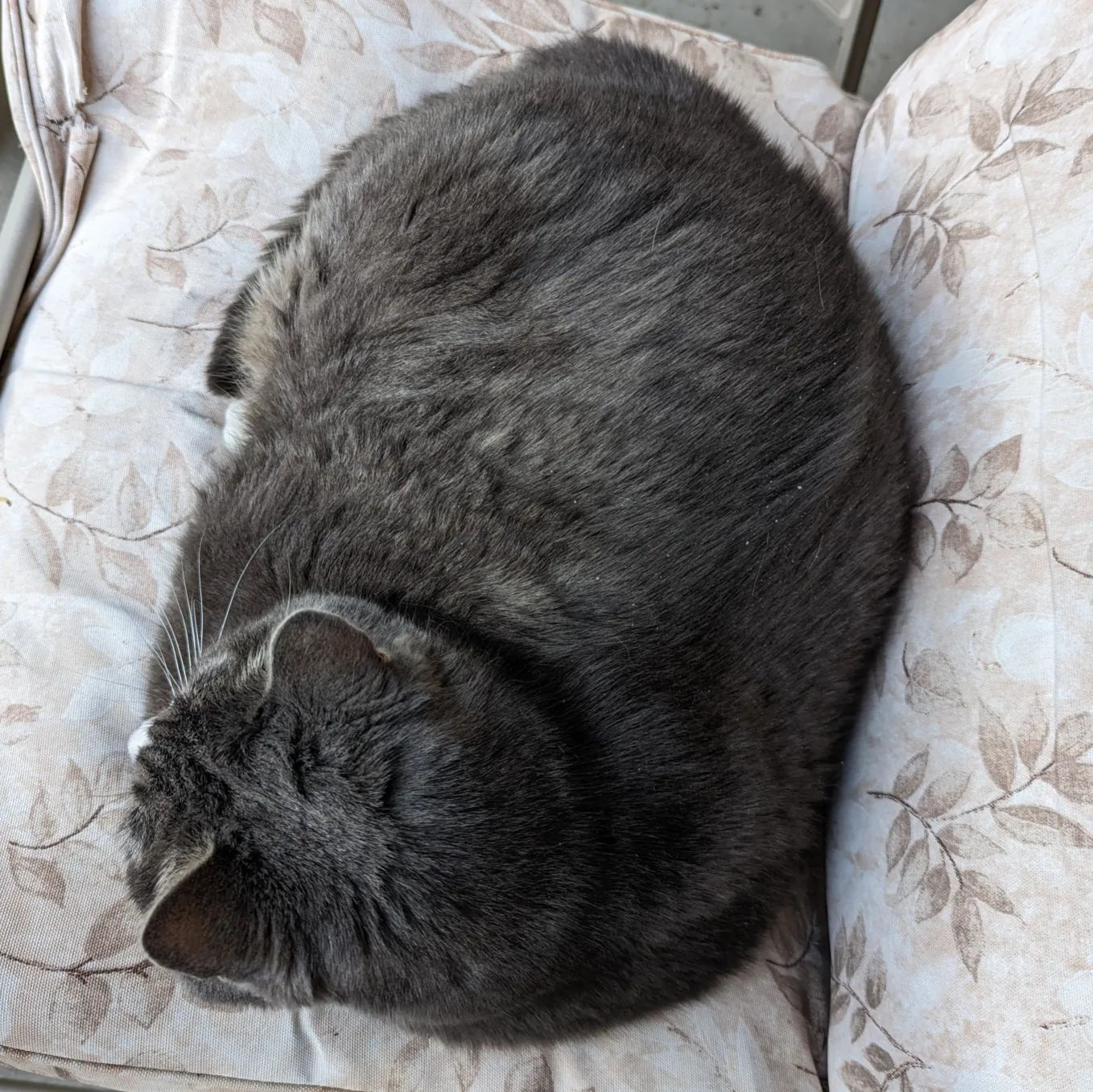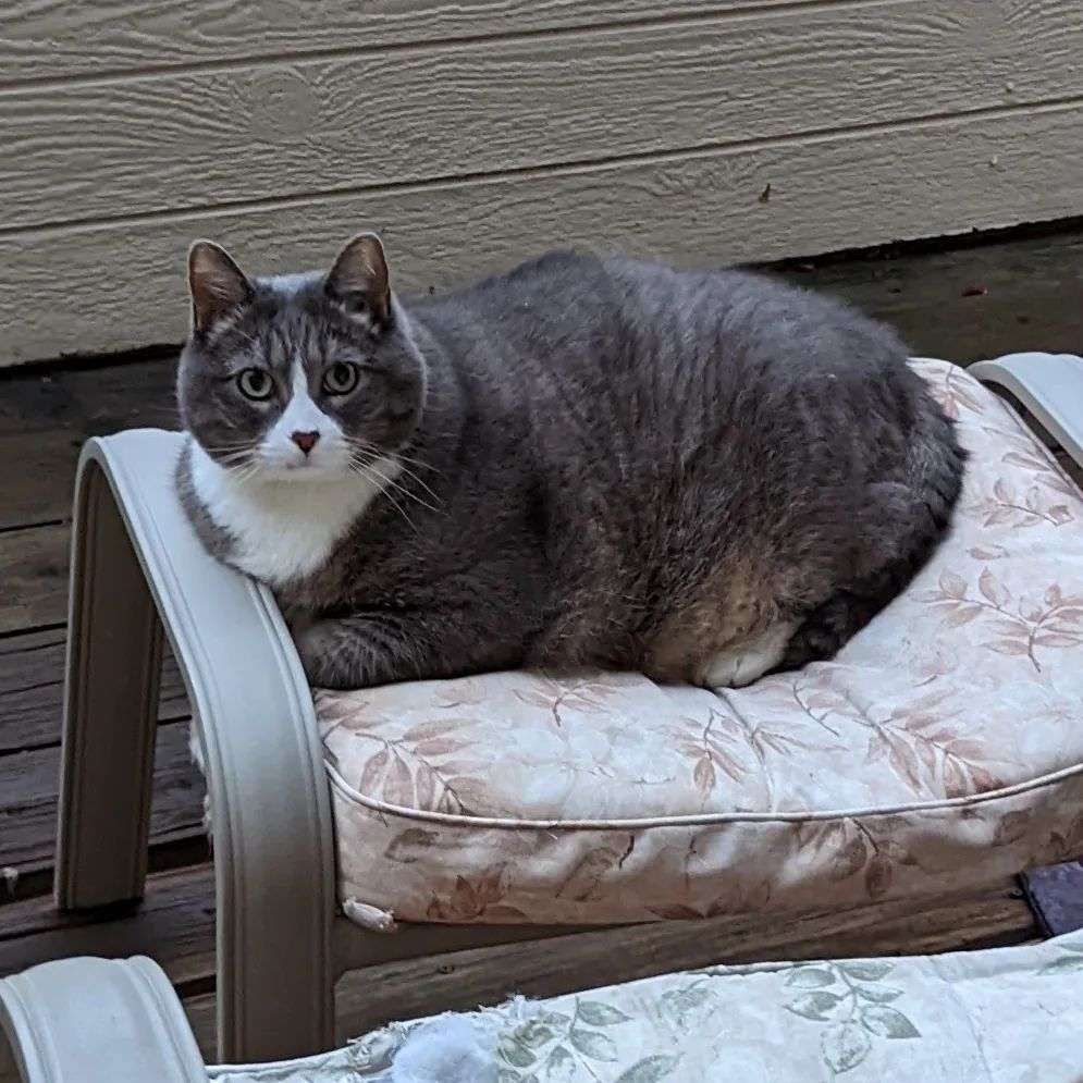 Looks like this is the guard post for the day. I messed up and hopefully we didn't wake up too many neighbors. I let Ziggy out without seeing the shy kitten was under one of the chairs in the back yard. Hissing and yeowls ensued. The kitten quickly realized that 3 feet up in a tree was sufficient to get away from Ziggy. Being reminded that she's an old lady by him sitting there looking down on her didn't make things better. But no one got hurt and the kitten was back at the front door within minutes. All part of the getting to know you process, I suppose. ?????? She's been in this spot for half an hour now.