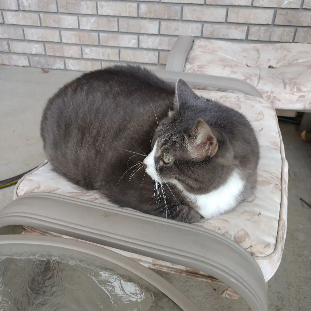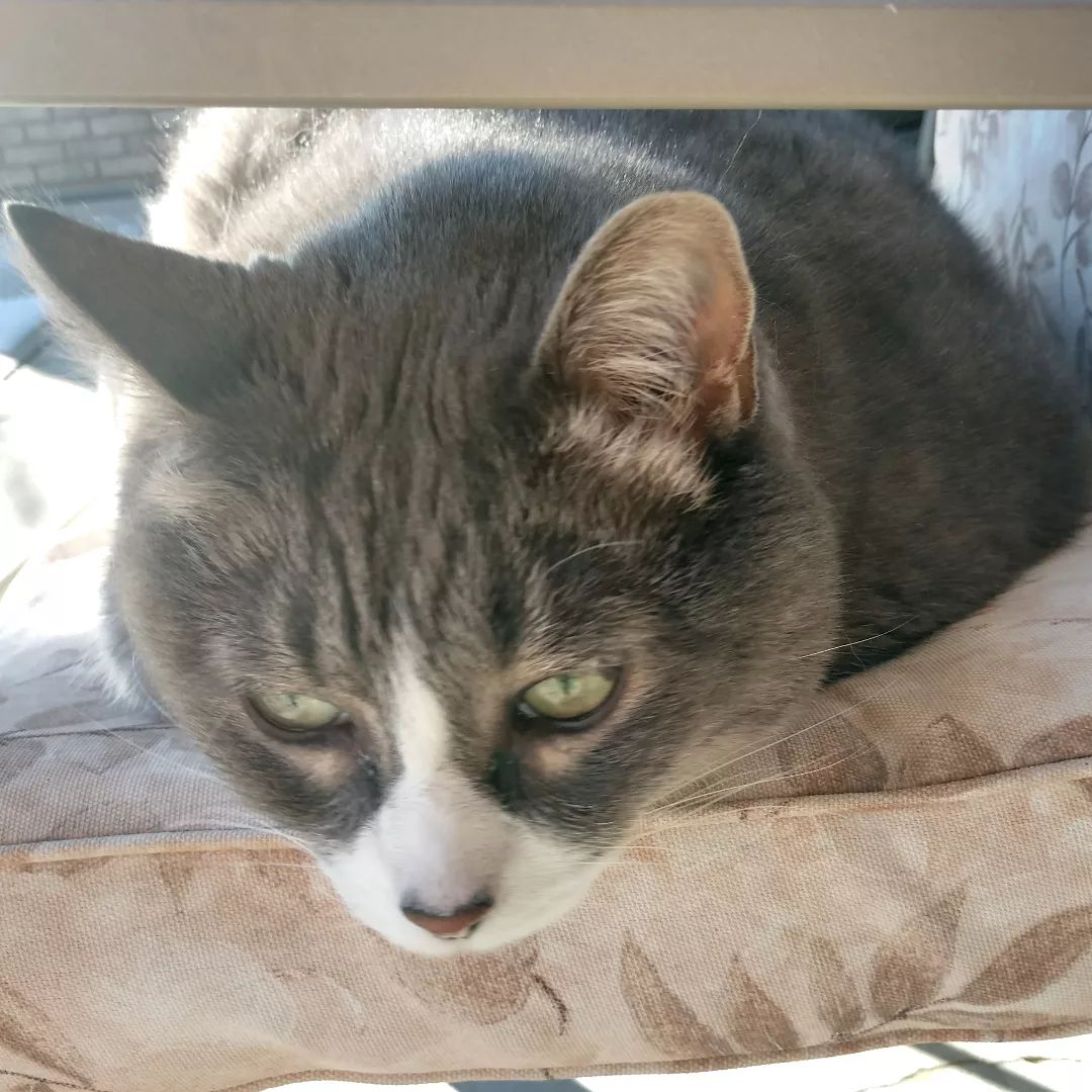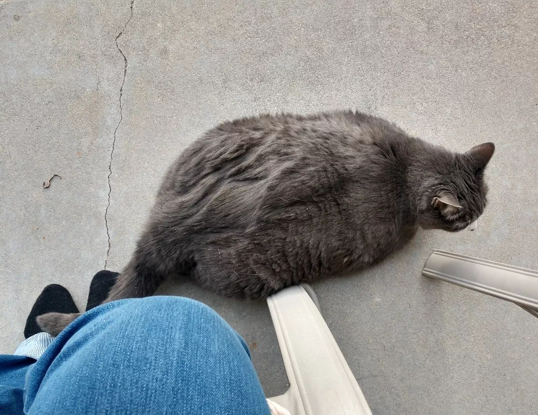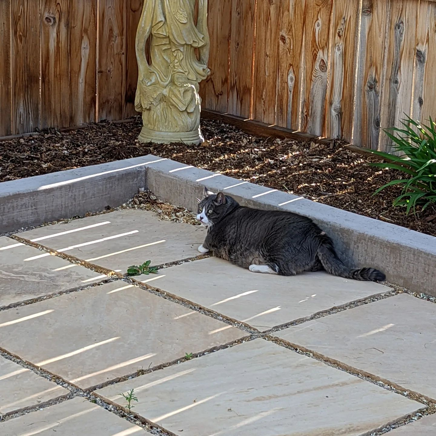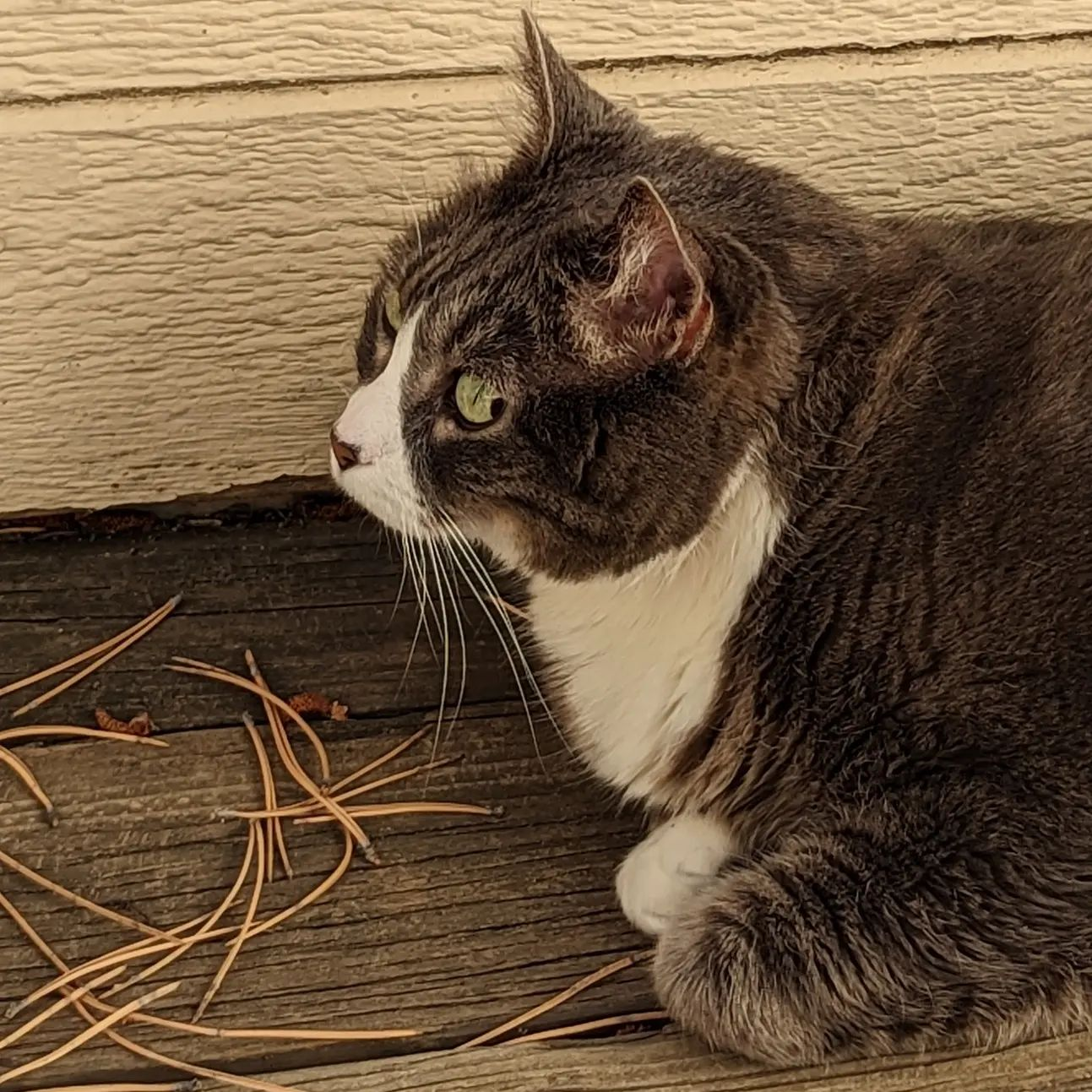 Looks like this is the guard post for the day. I messed up and hopefully we didn't wake up too many neighbors. I let Ziggy out without seeing the shy kitten was under one of the chairs in the back yard. Hissing and yeowls ensued. The kitten quickly realized that 3 feet up in a tree was sufficient to get away from Ziggy. Being reminded that she's an old lady by him sitting there looking down on her didn't make things better. But no one got hurt and the kitten was back at the front door within minutes. All part of the getting to know you process, I suppose. ?????? She's been in this spot for half an hour now.