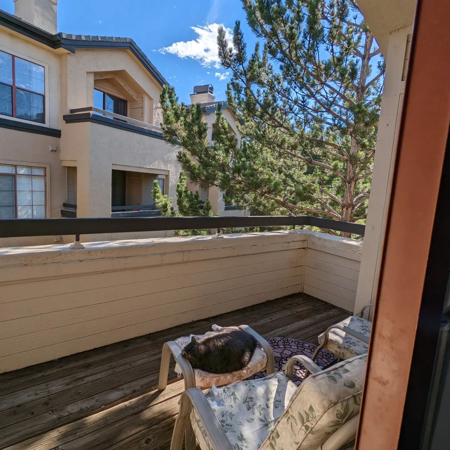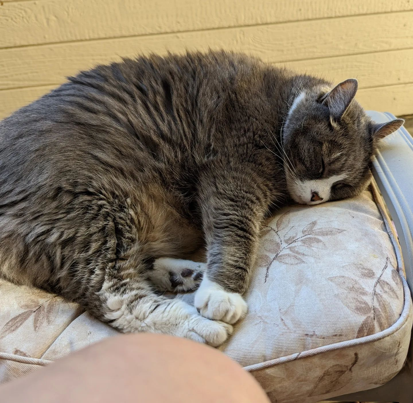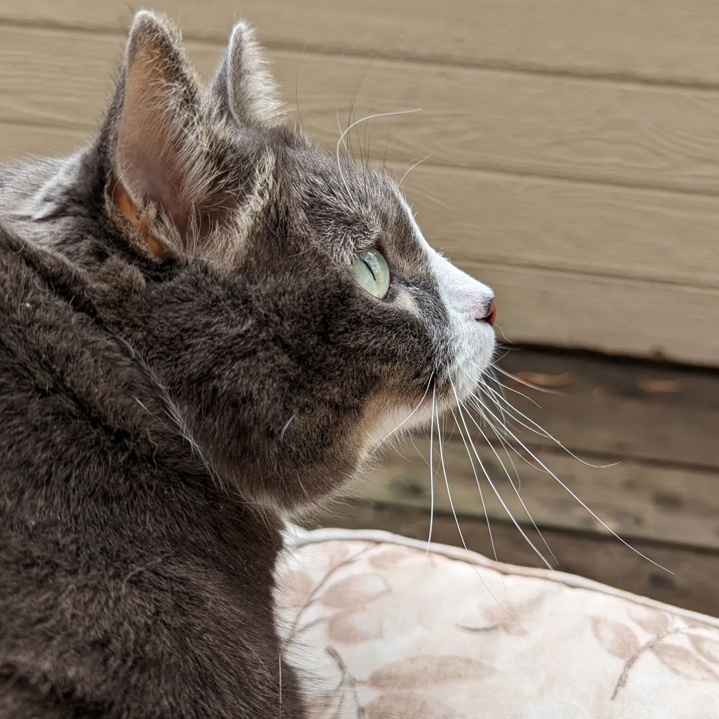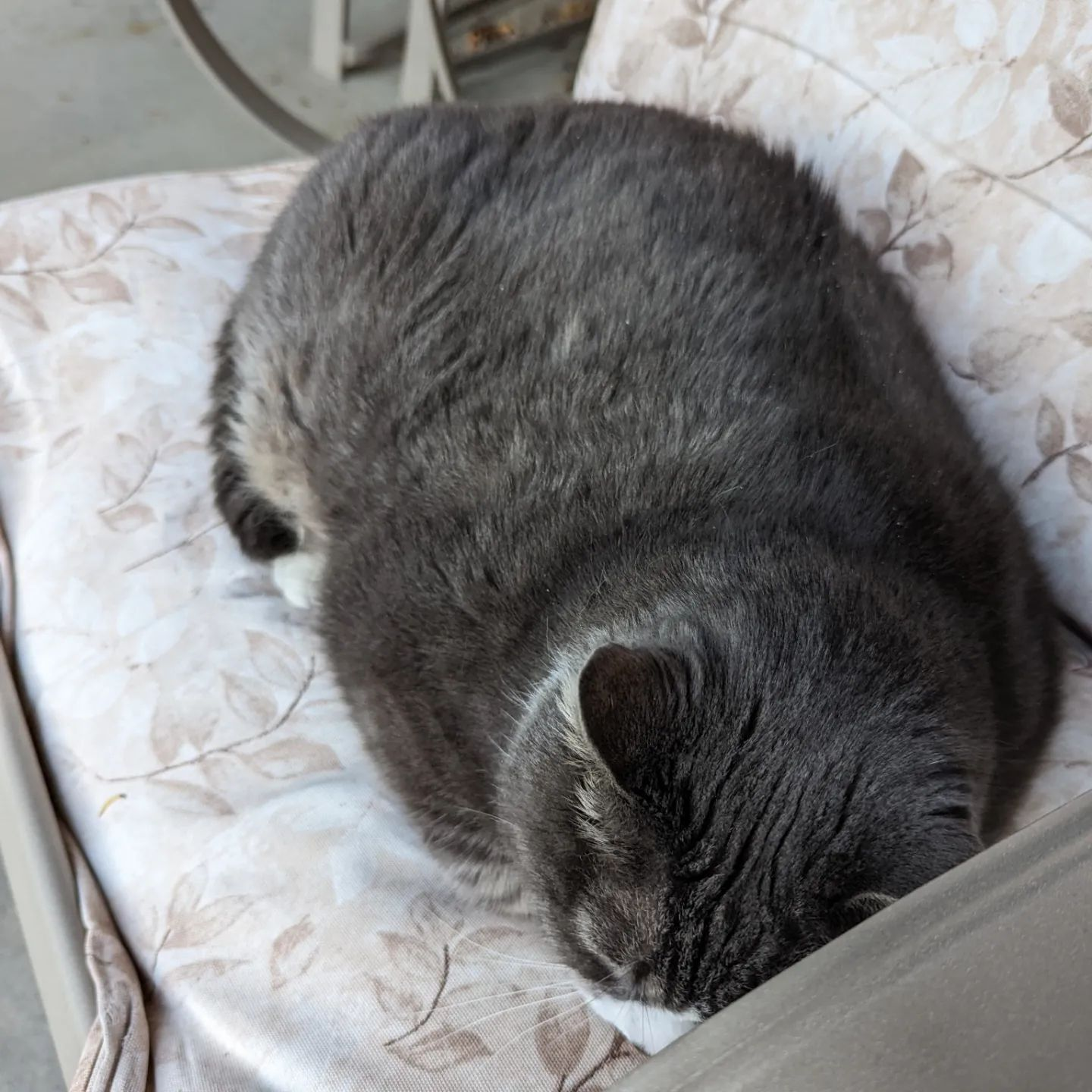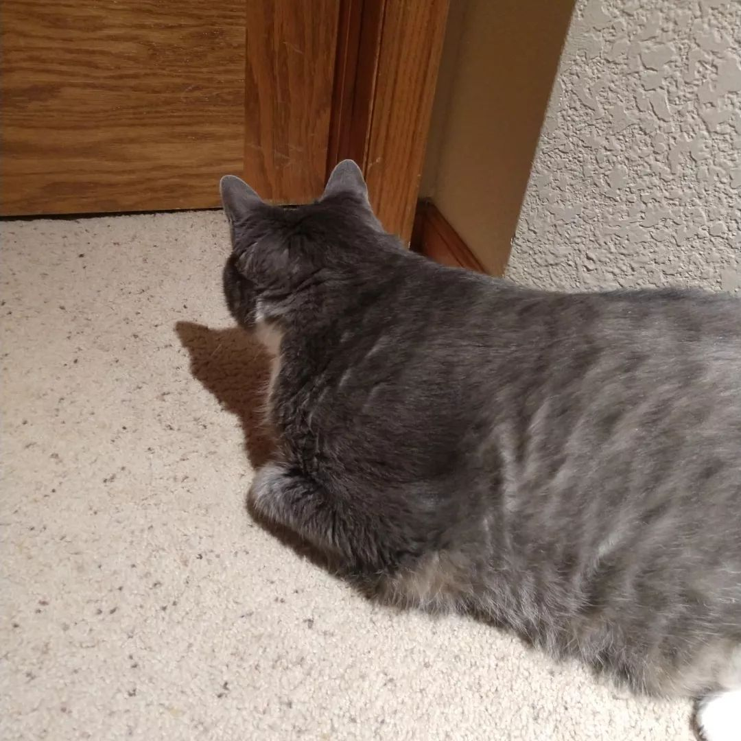 Looks like this is the guard post for the day. I messed up and hopefully we didn't wake up too many neighbors. I let Ziggy out without seeing the shy kitten was under one of the chairs in the back yard. Hissing and yeowls ensued. The kitten quickly realized that 3 feet up in a tree was sufficient to get away from Ziggy. Being reminded that she's an old lady by him sitting there looking down on her didn't make things better. But no one got hurt and the kitten was back at the front door within minutes. All part of the getting to know you process, I suppose. ?????? She's been in this spot for half an hour now.