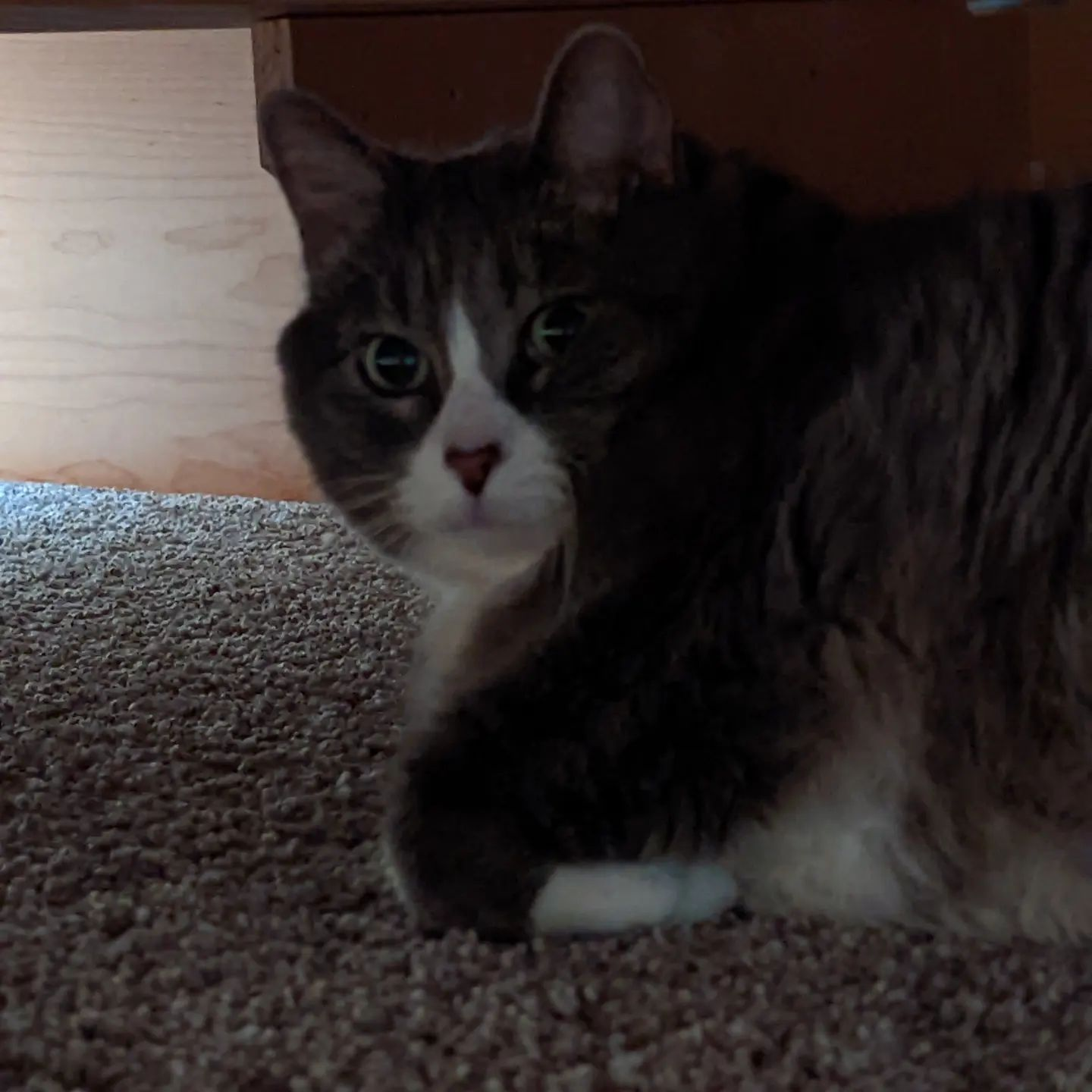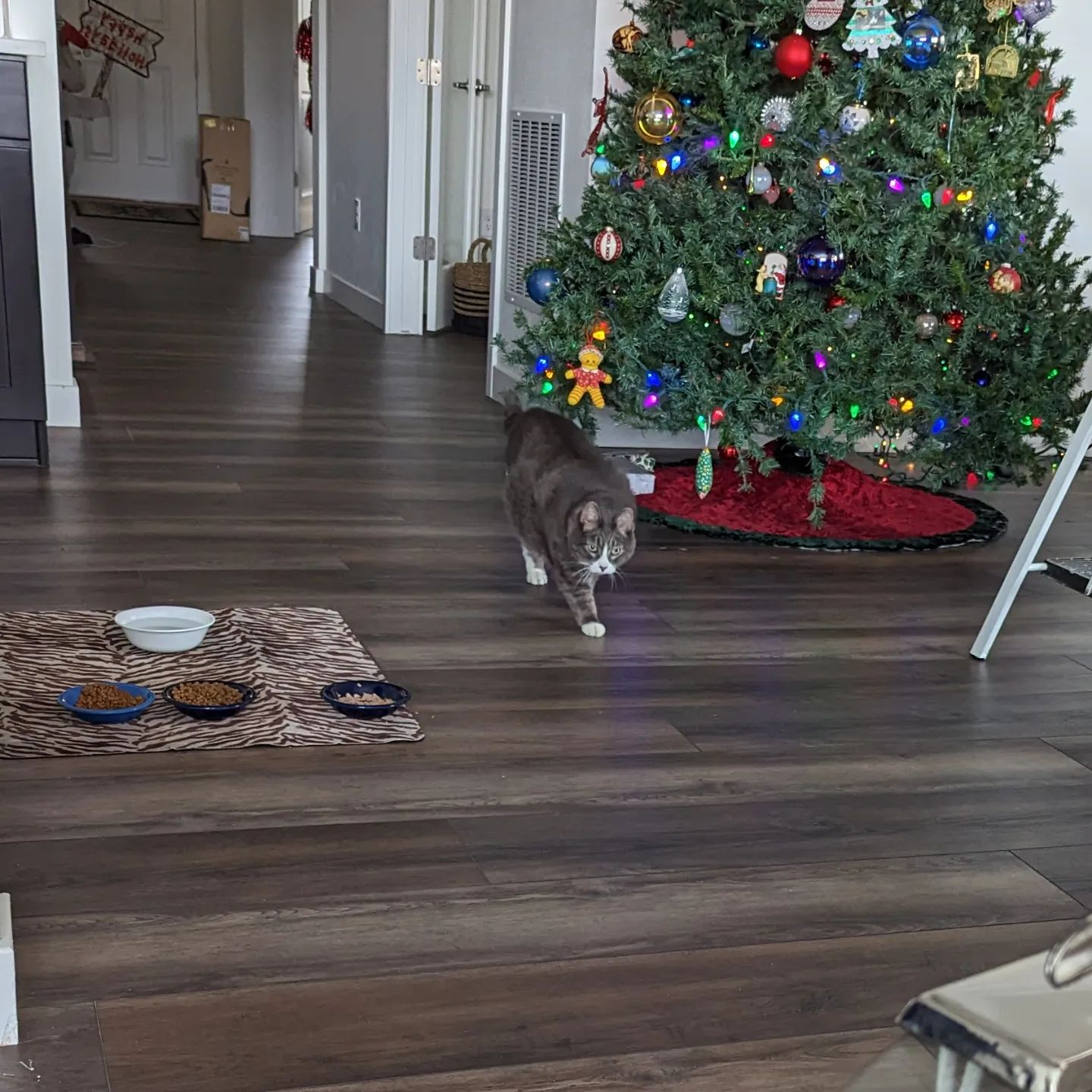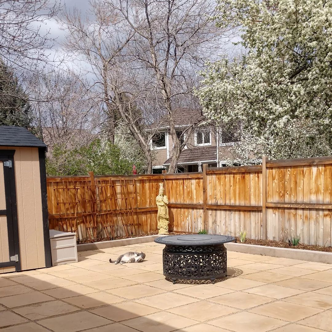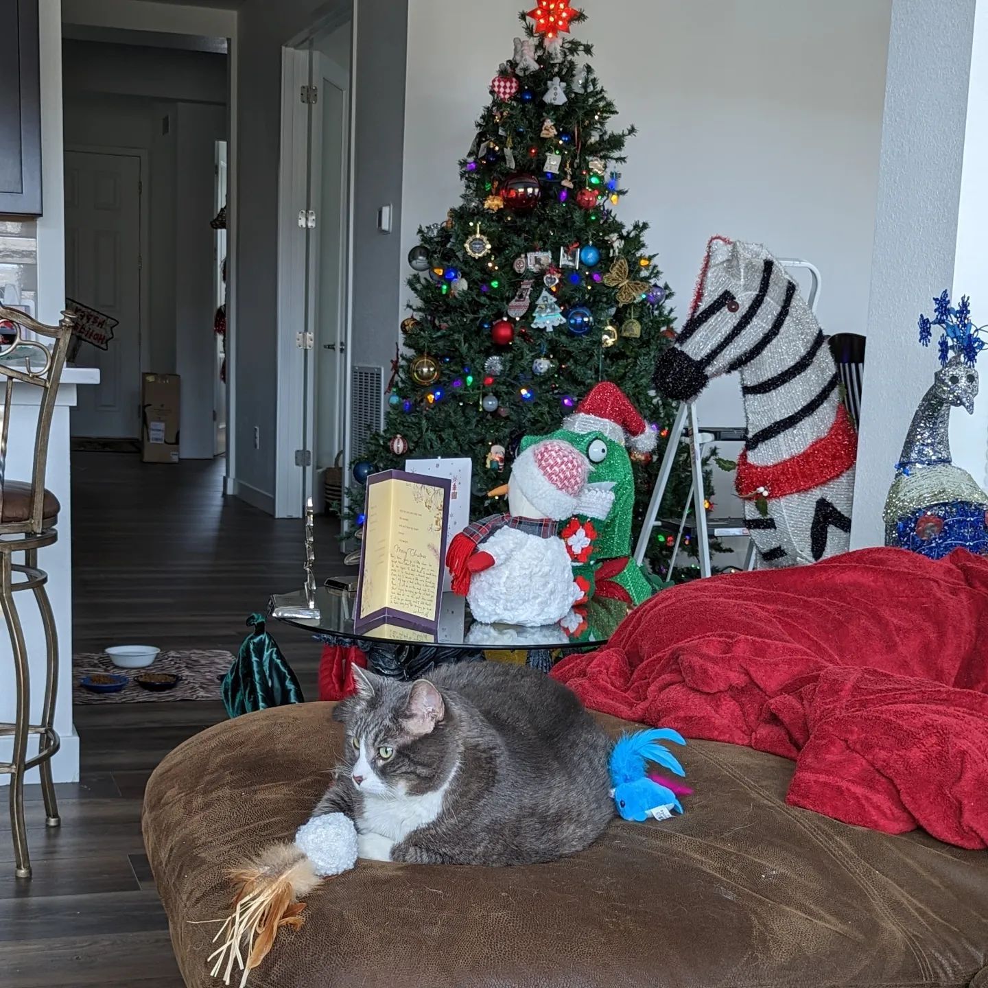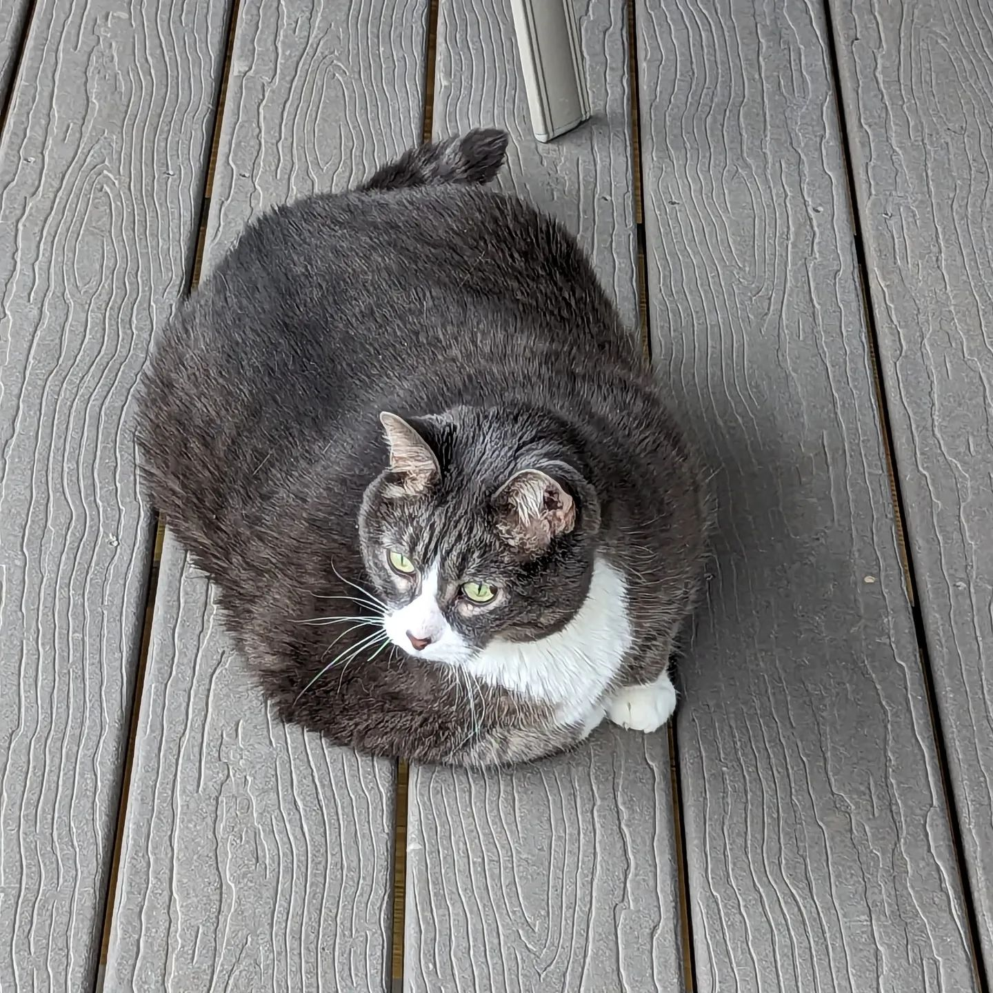 Looks like this is the guard post for the day. I messed up and hopefully we didn't wake up too many neighbors. I let Ziggy out without seeing the shy kitten was under one of the chairs in the back yard. Hissing and yeowls ensued. The kitten quickly realized that 3 feet up in a tree was sufficient to get away from Ziggy. Being reminded that she's an old lady by him sitting there looking down on her didn't make things better. But no one got hurt and the kitten was back at the front door within minutes. All part of the getting to know you process, I suppose. ?????? She's been in this spot for half an hour now.
