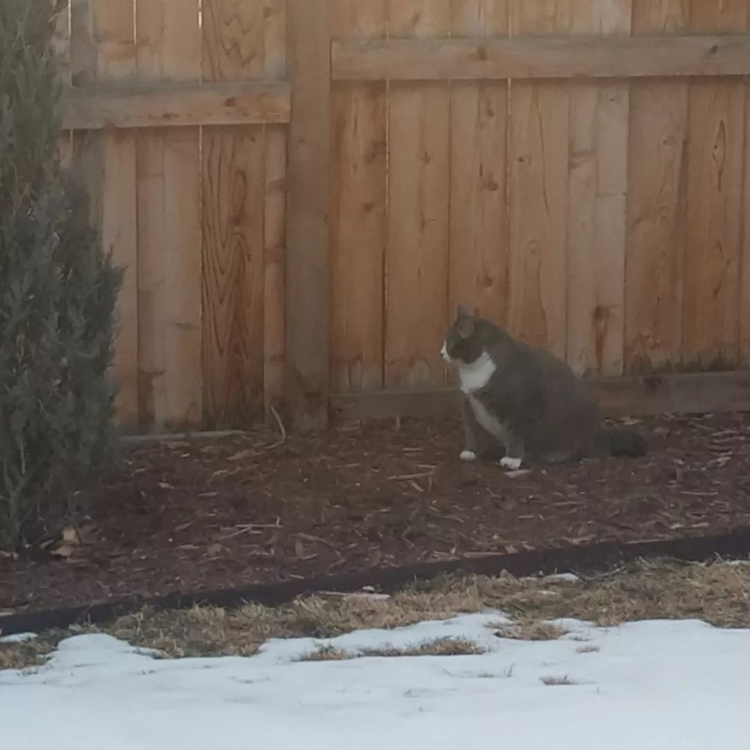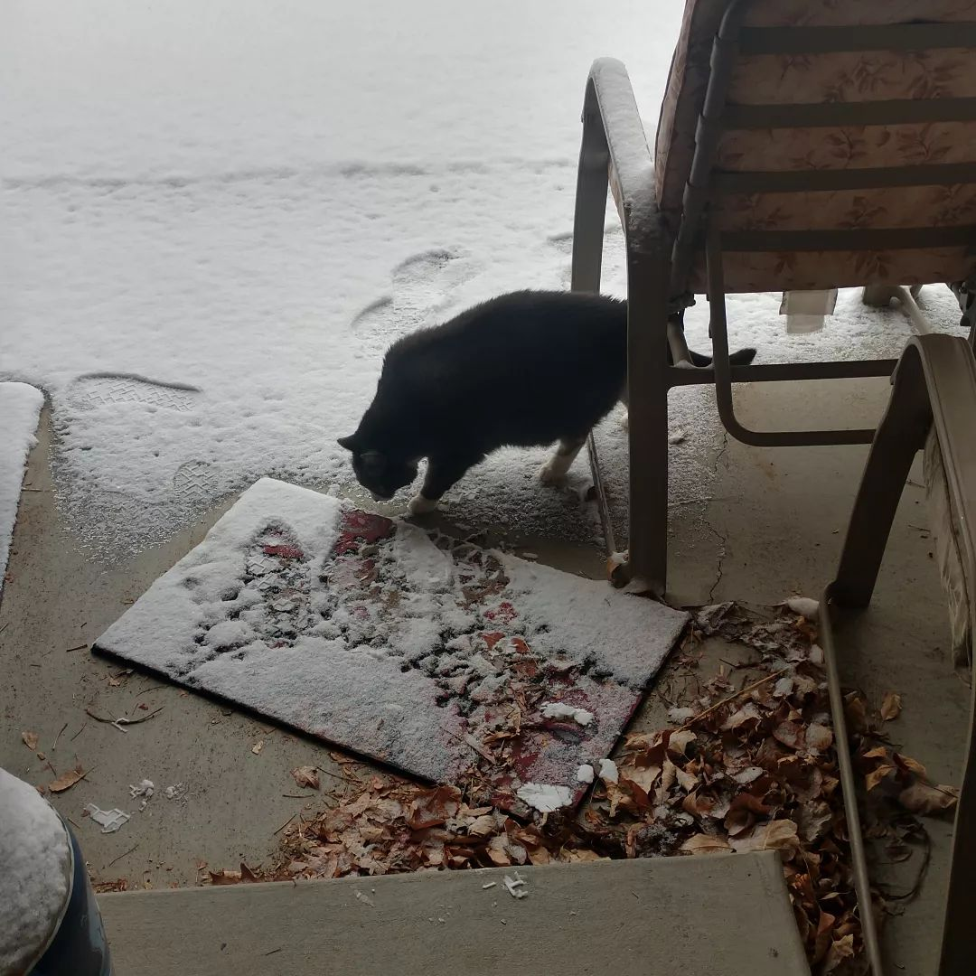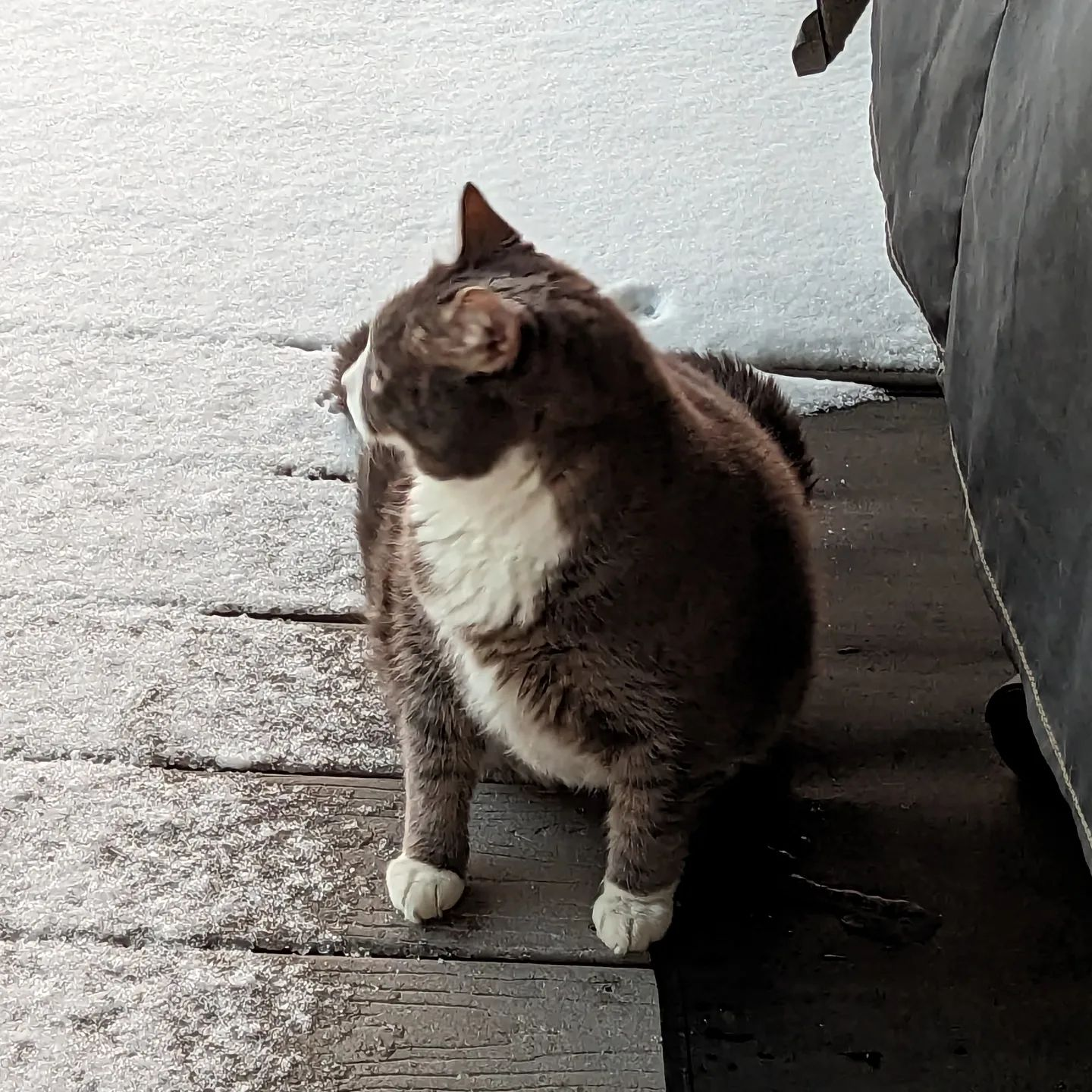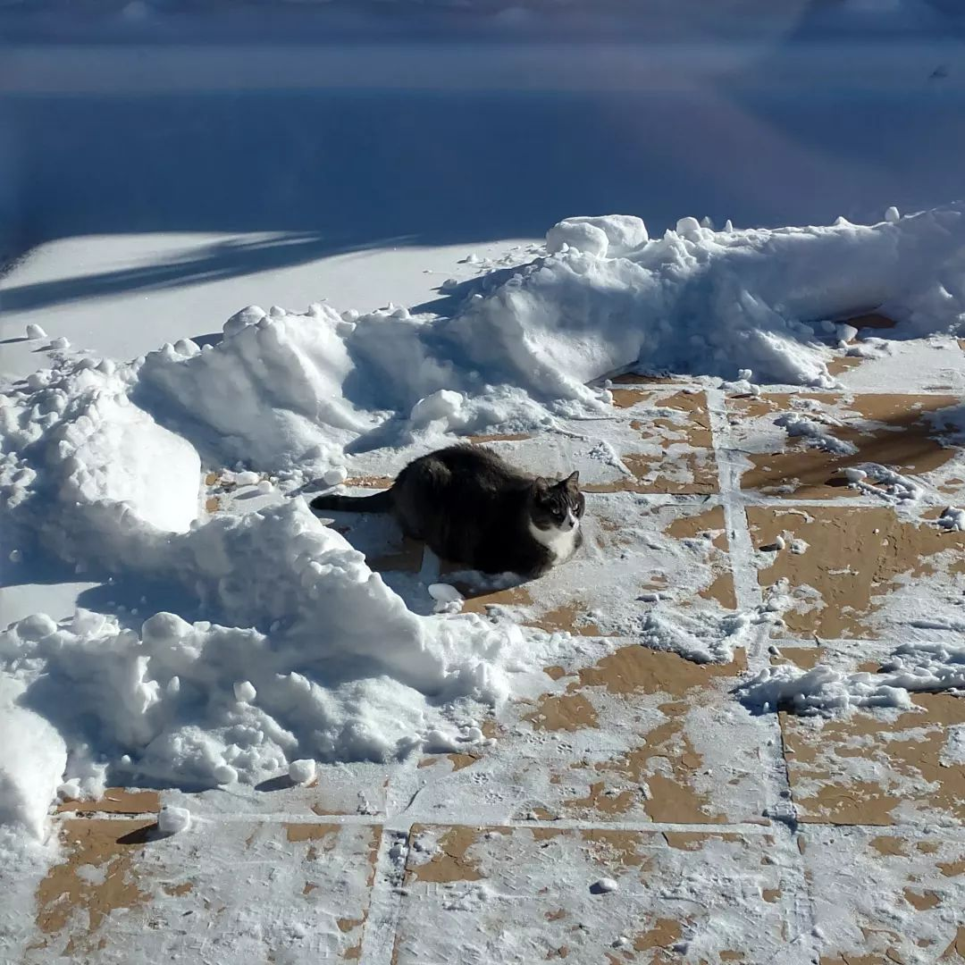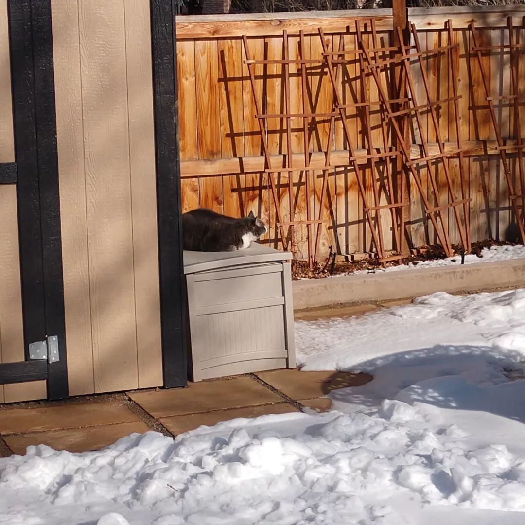 Thankfully, the kittens were in their home during the recent snowy and cold weather. The brave kitten came back this evening. Guard duty - high alert!