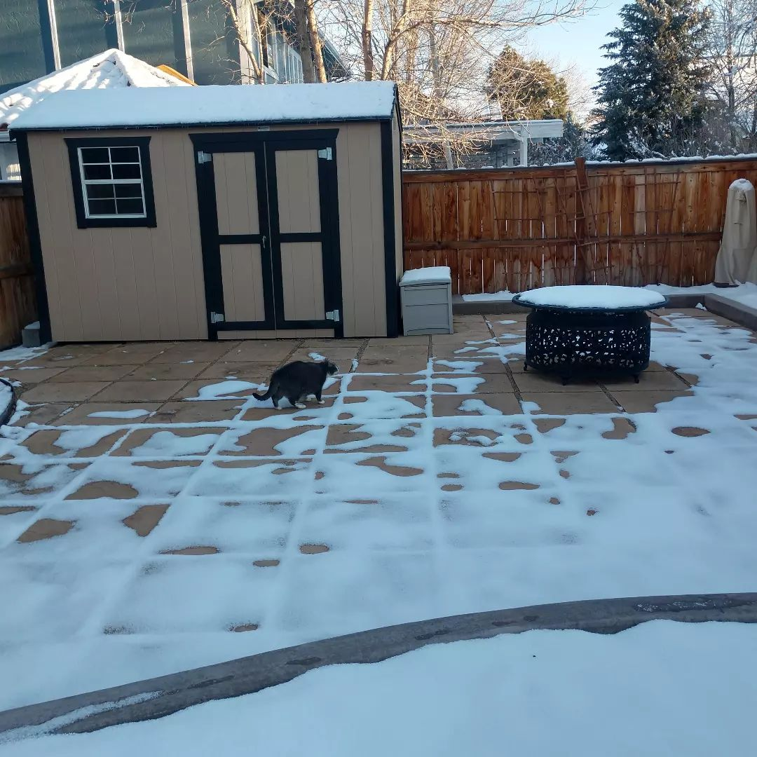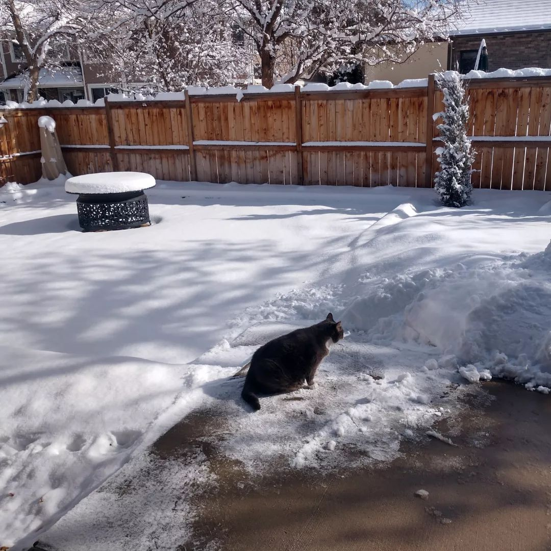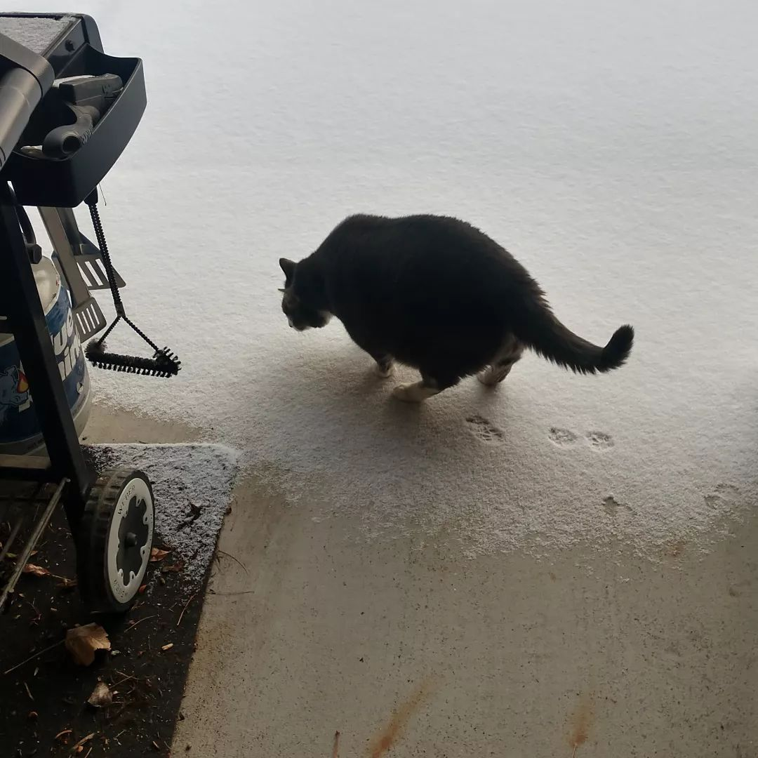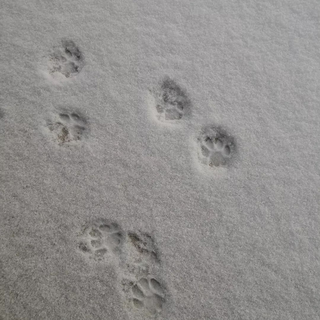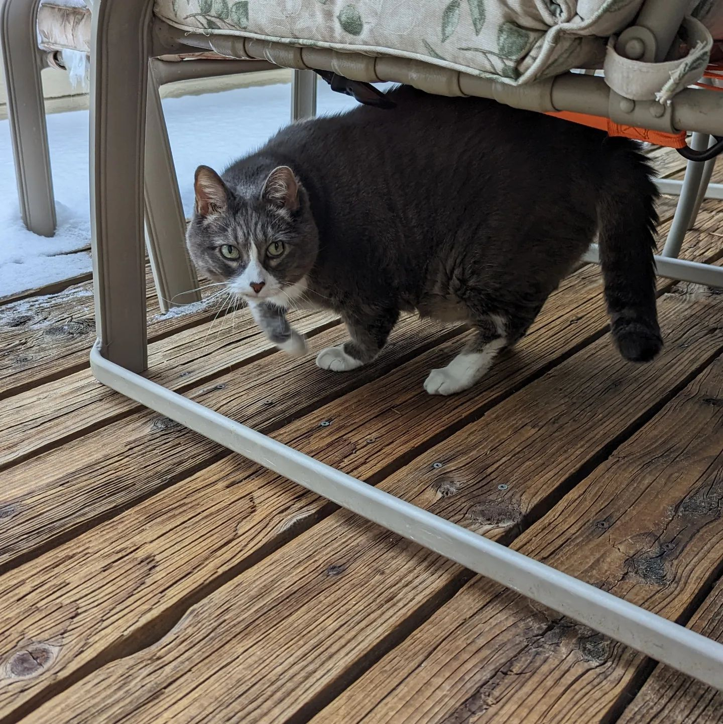 Thankfully, the kittens were in their home during the recent snowy and cold weather. The brave kitten came back this evening. Guard duty - high alert!
