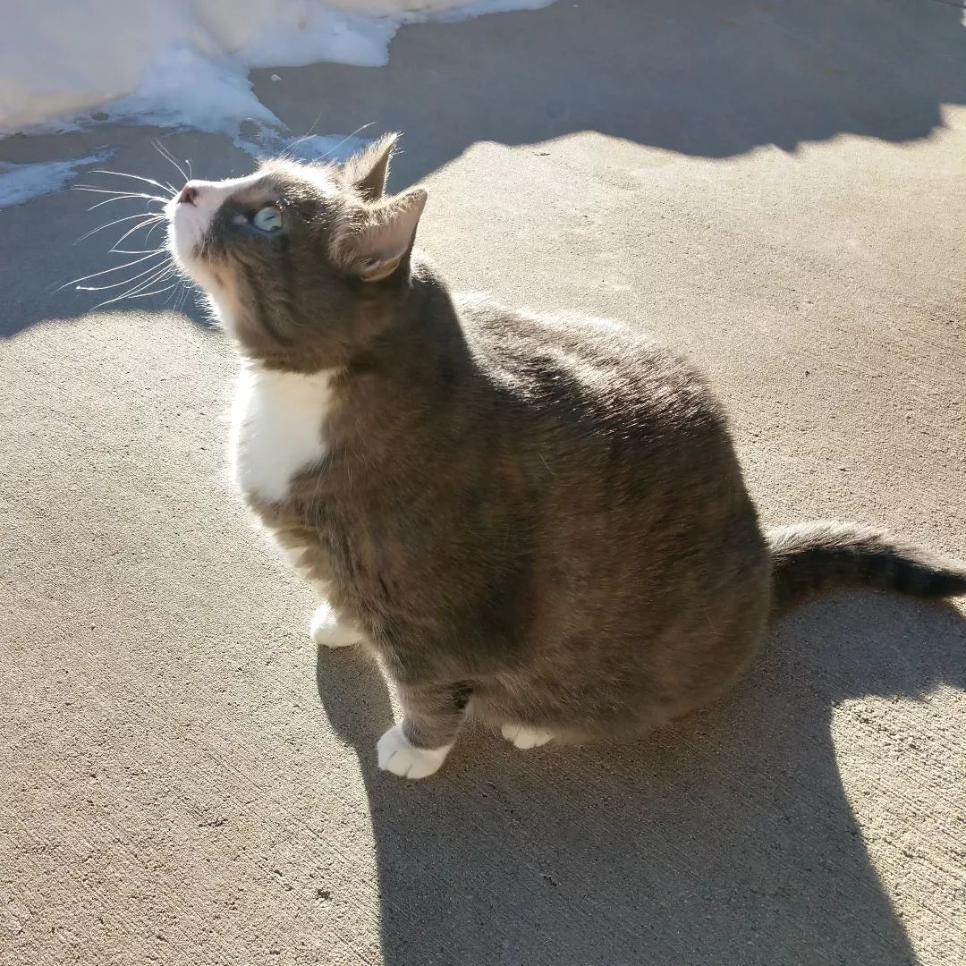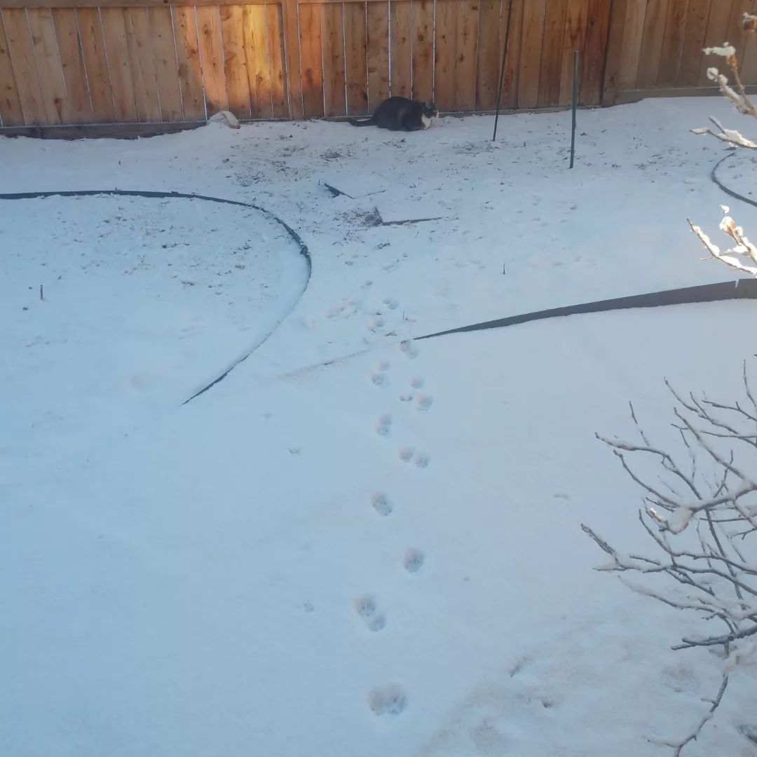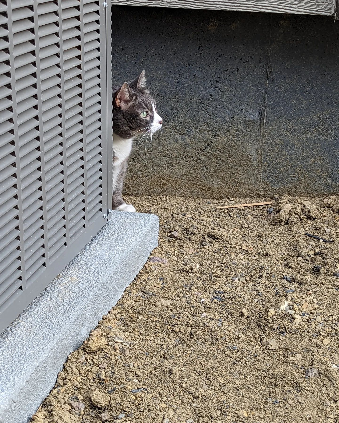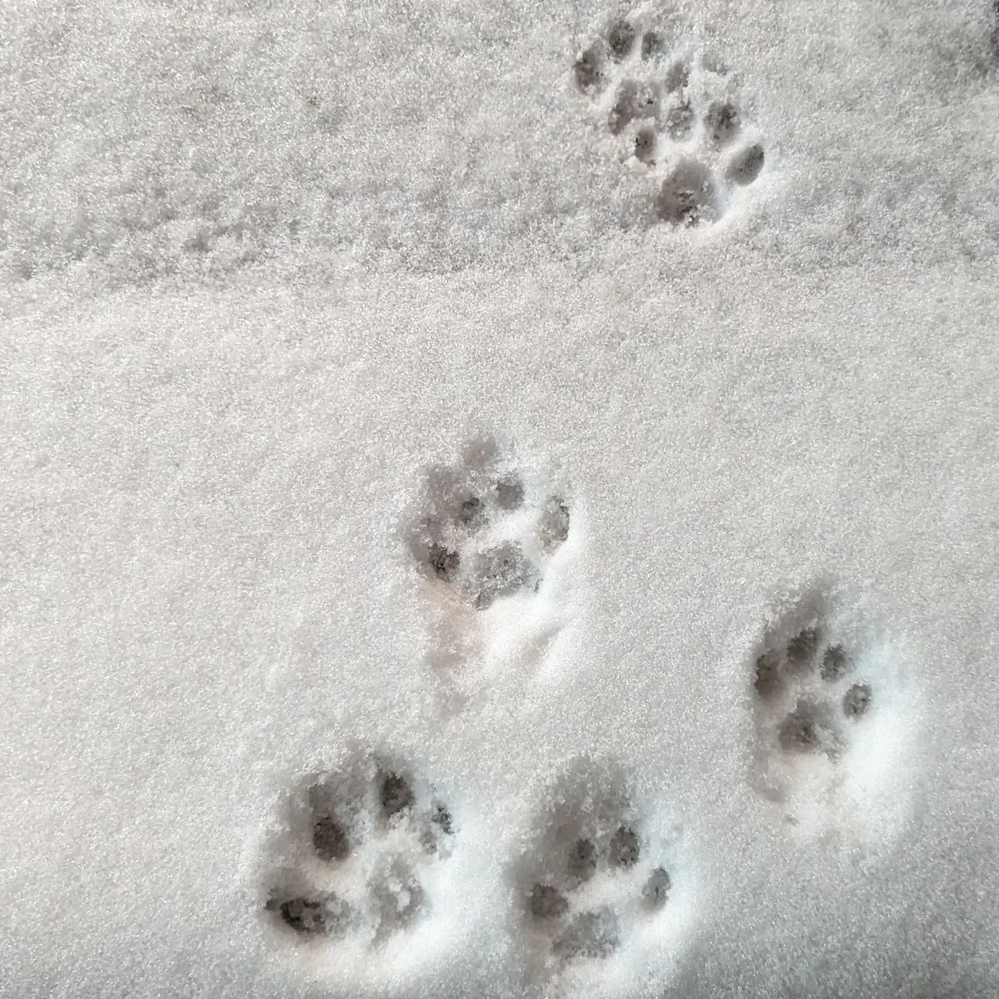 Thankfully, the kittens were in their home during the recent snowy and cold weather. The brave kitten came back this evening. Guard duty - high alert!
