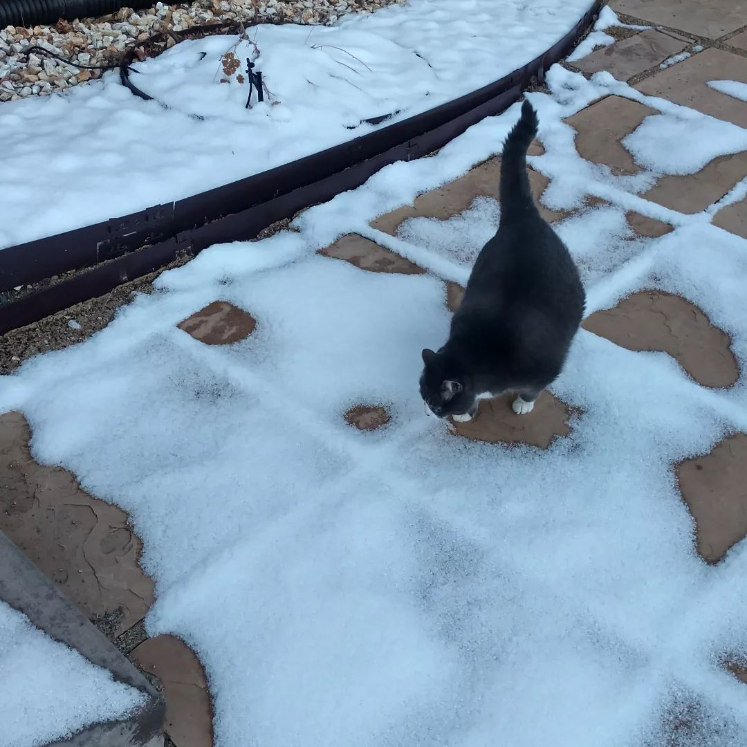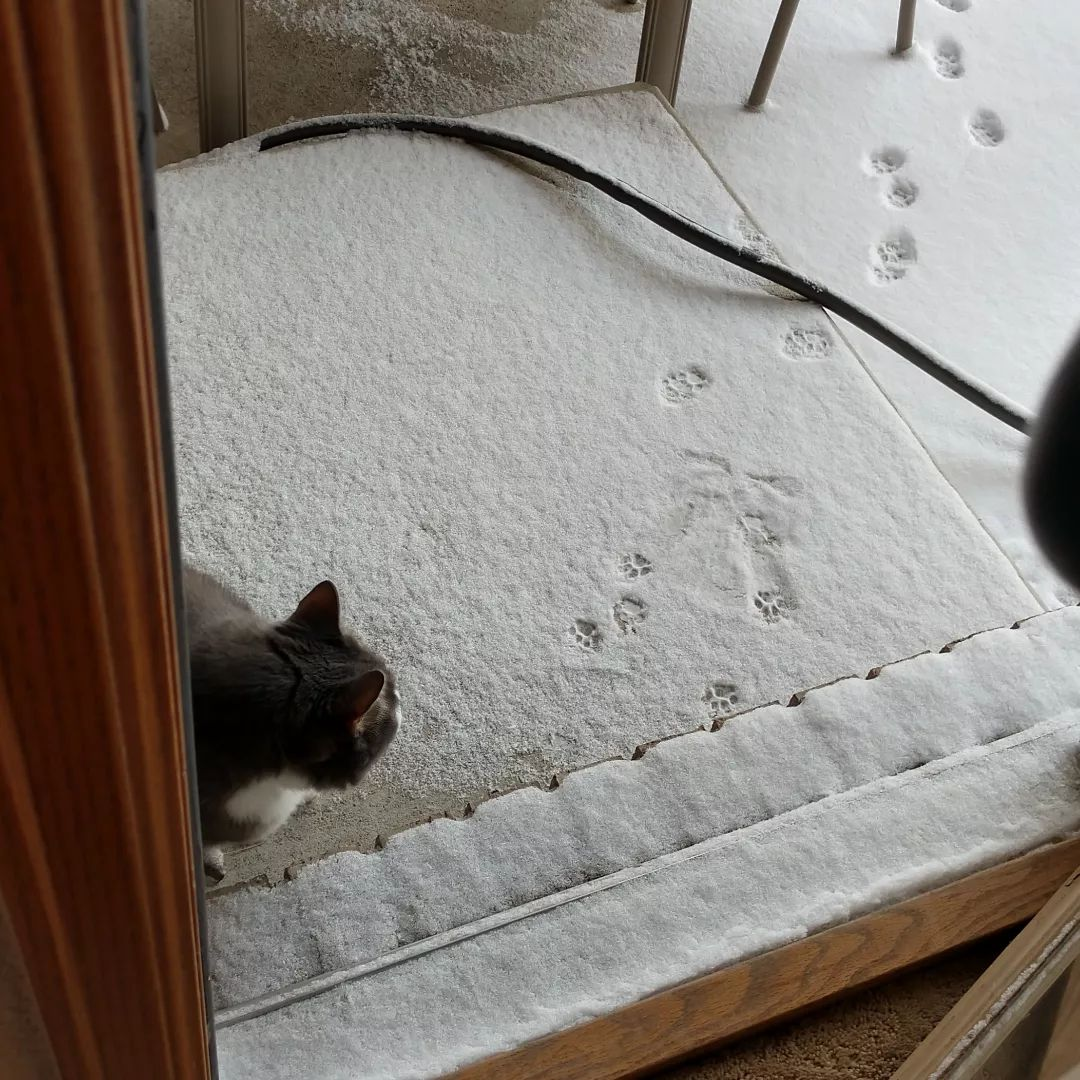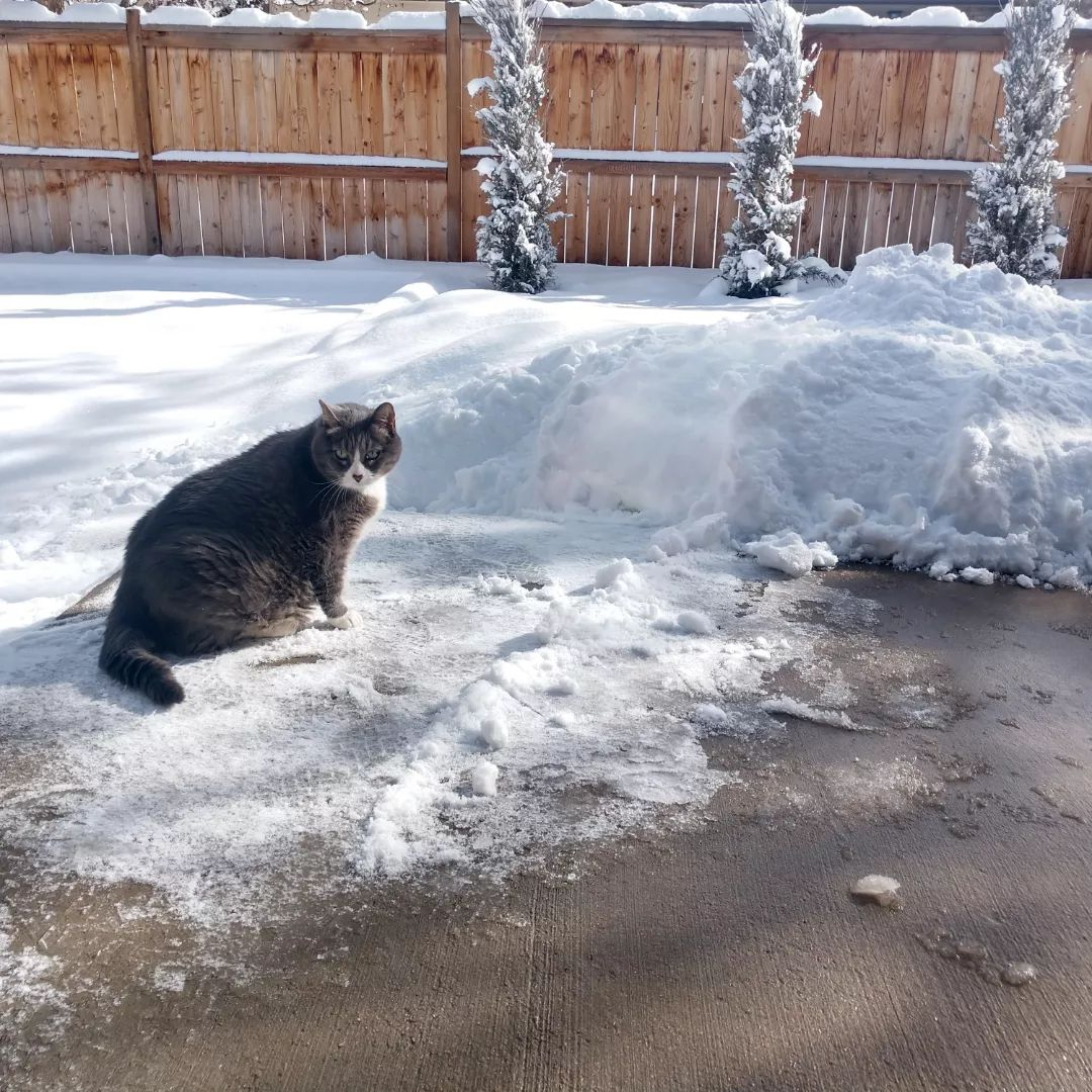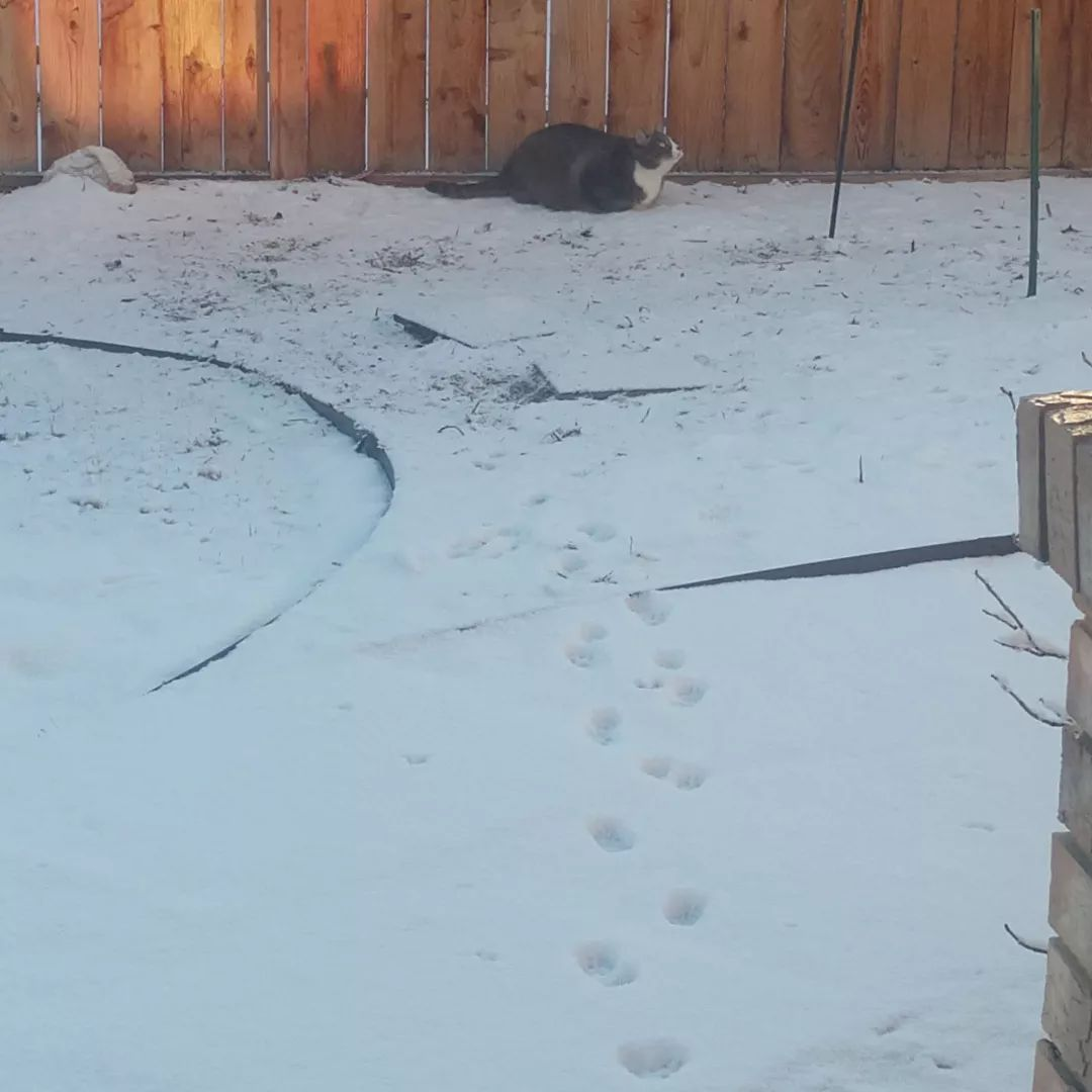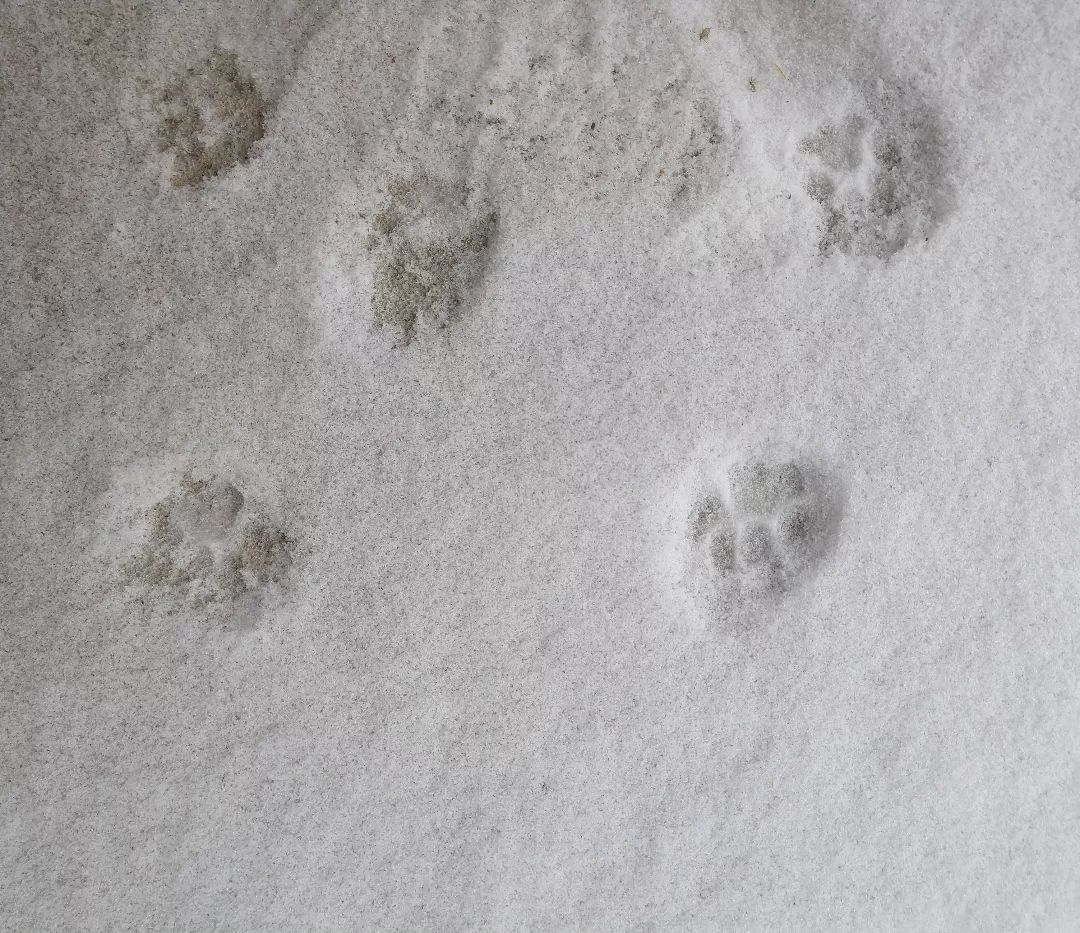 Thankfully, the kittens were in their home during the recent snowy and cold weather. The brave kitten came back this evening. Guard duty - high alert!