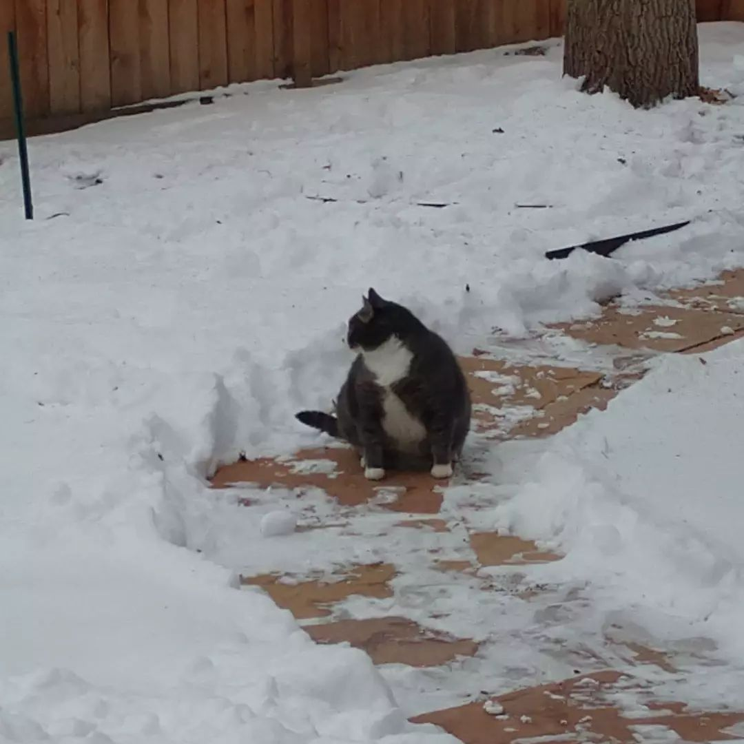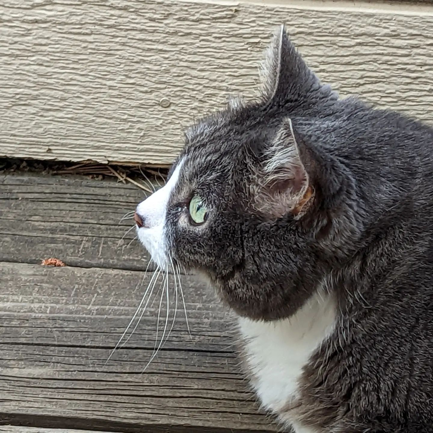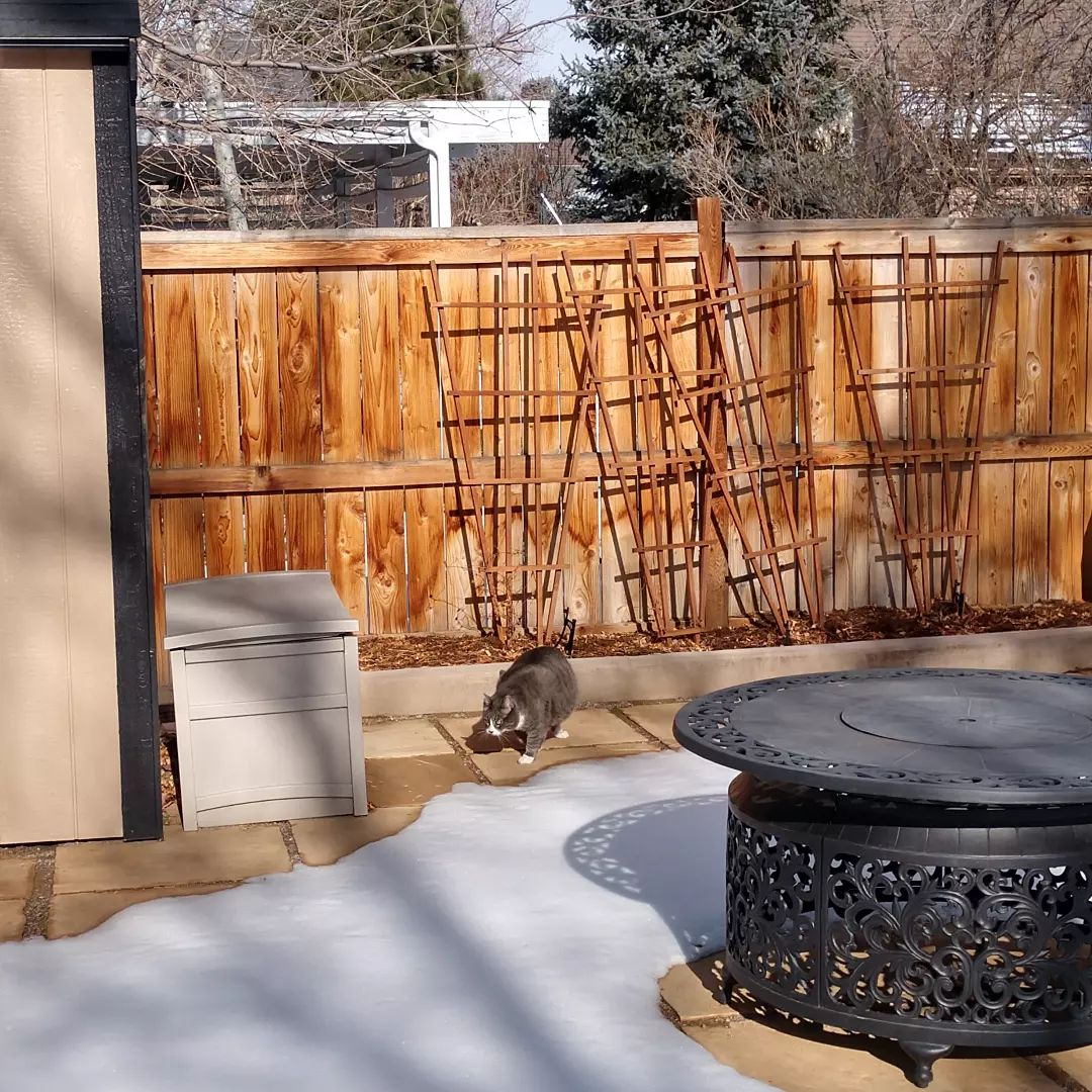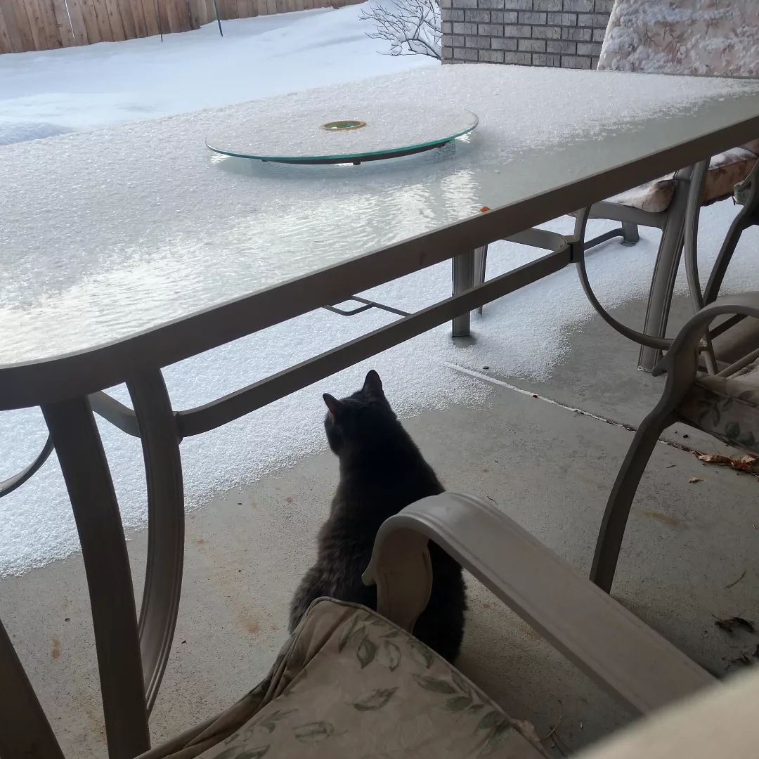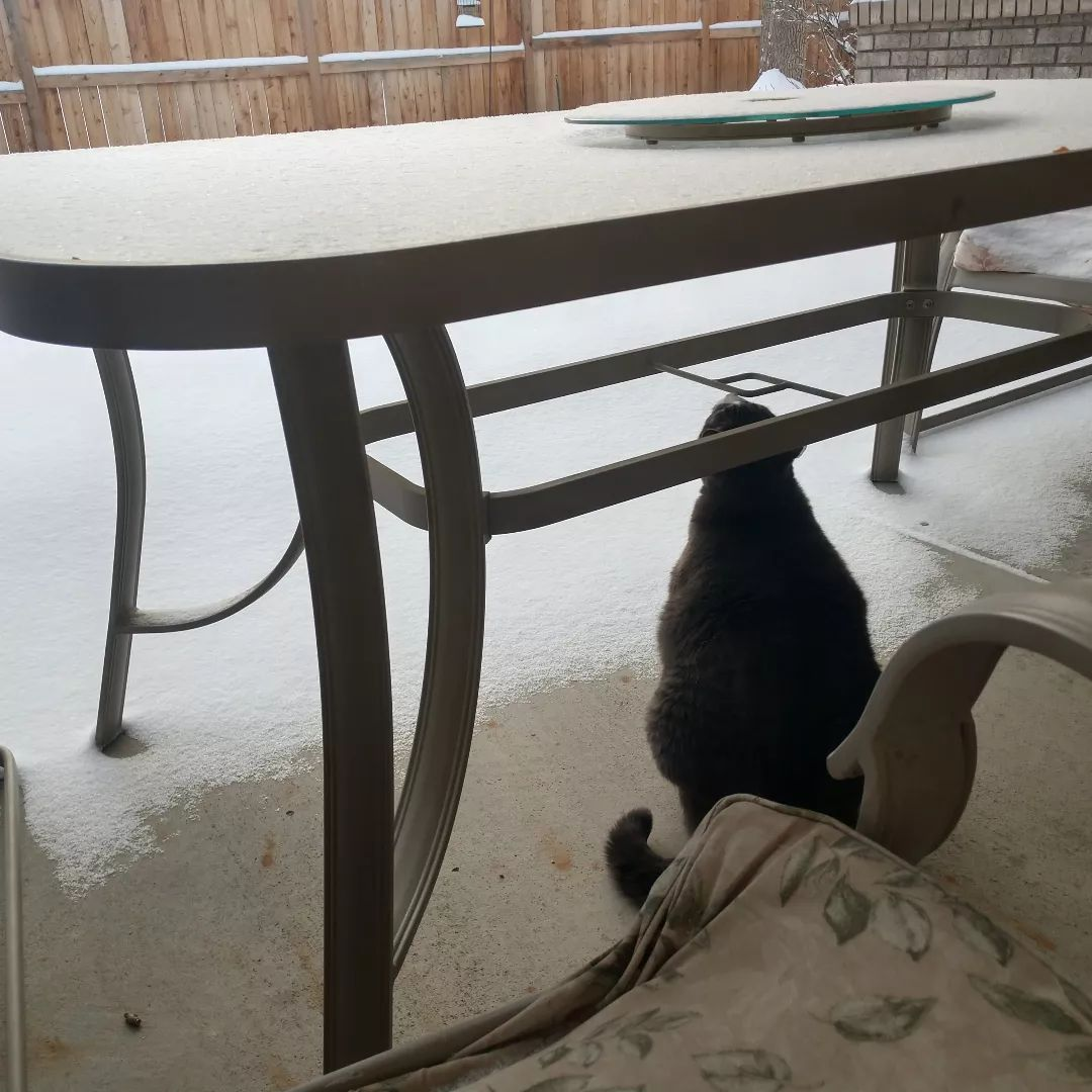 Thankfully, the kittens were in their home during the recent snowy and cold weather. The brave kitten came back this evening. Guard duty - high alert!
