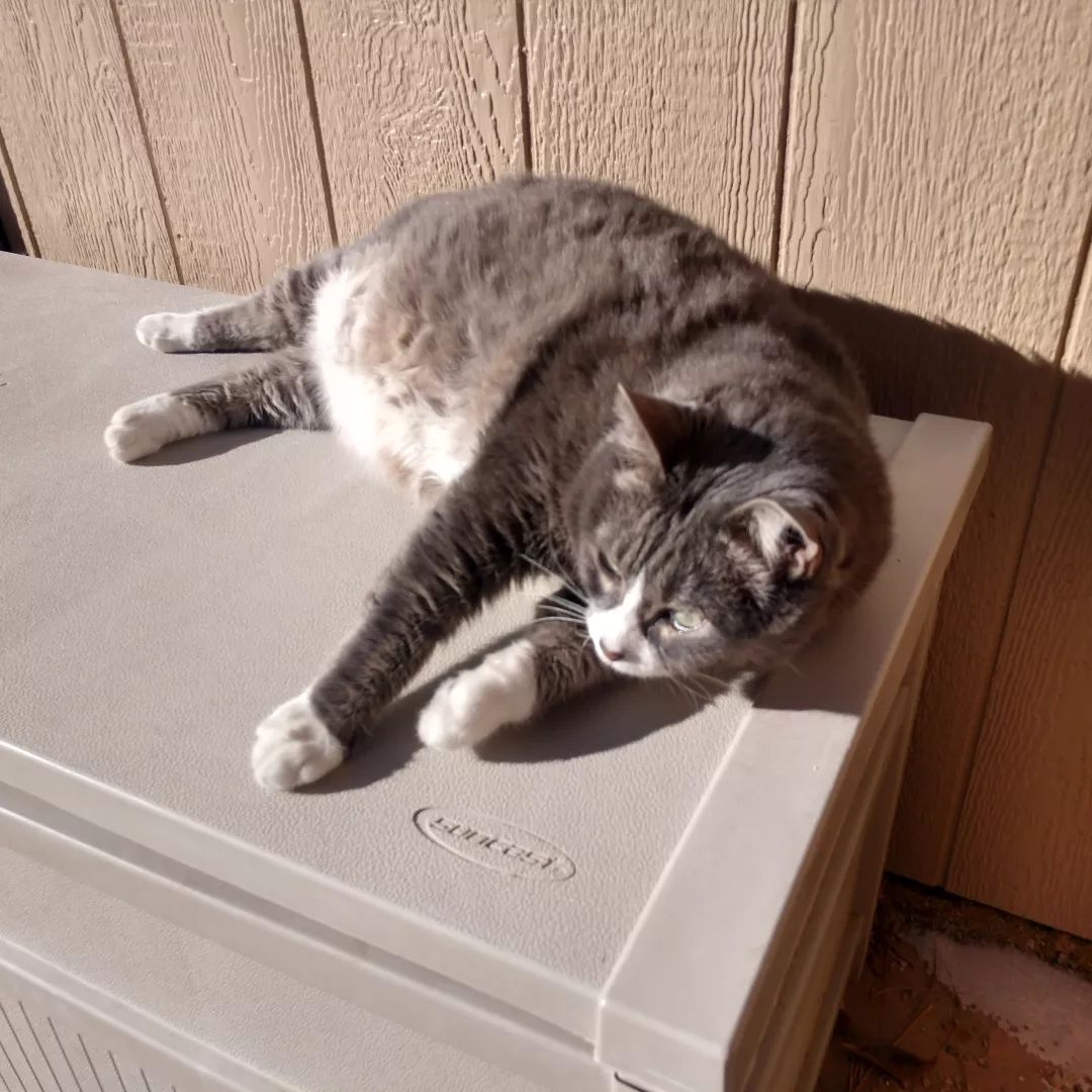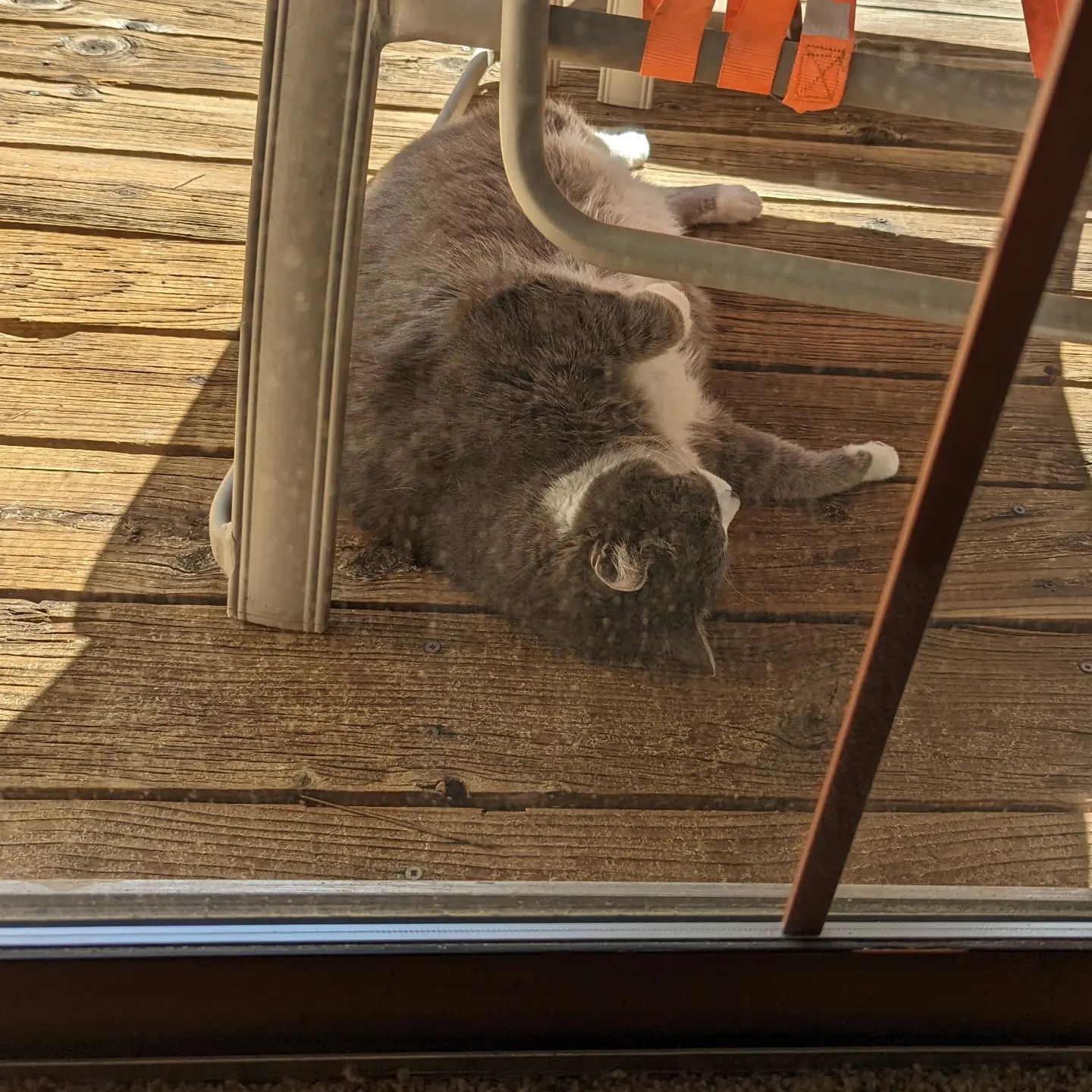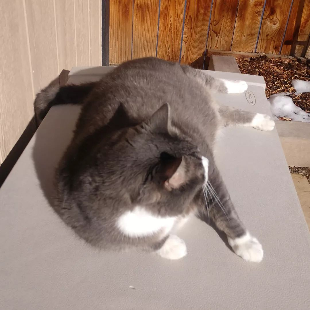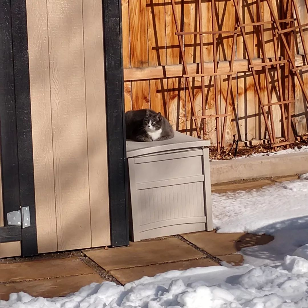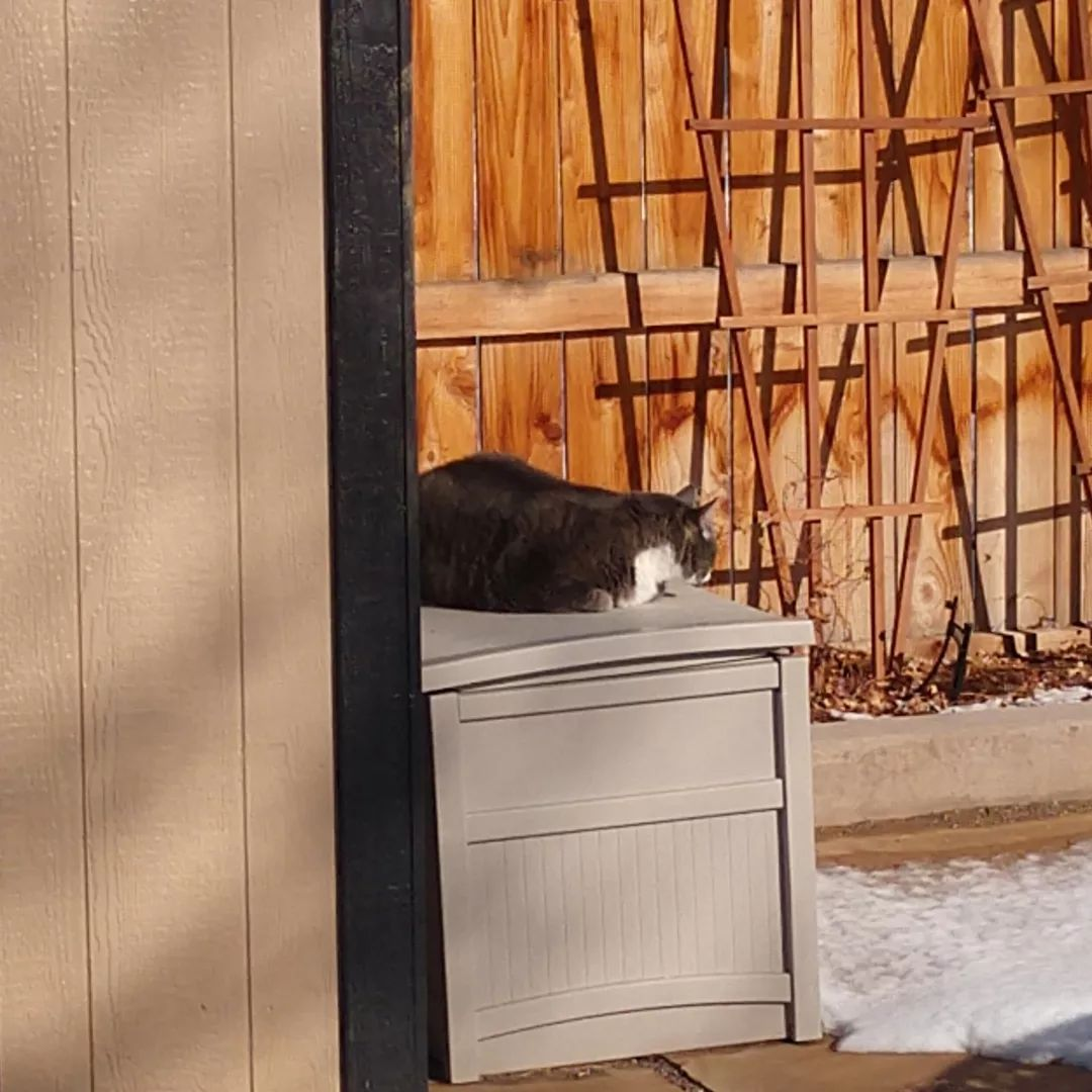 Loafing with a purpose. Ziggy is trying to toast on the woodbox, but it is only 38 deg outside (3.3 C)... but she will try to prove it's great and she doesn't need to come back inside. ????