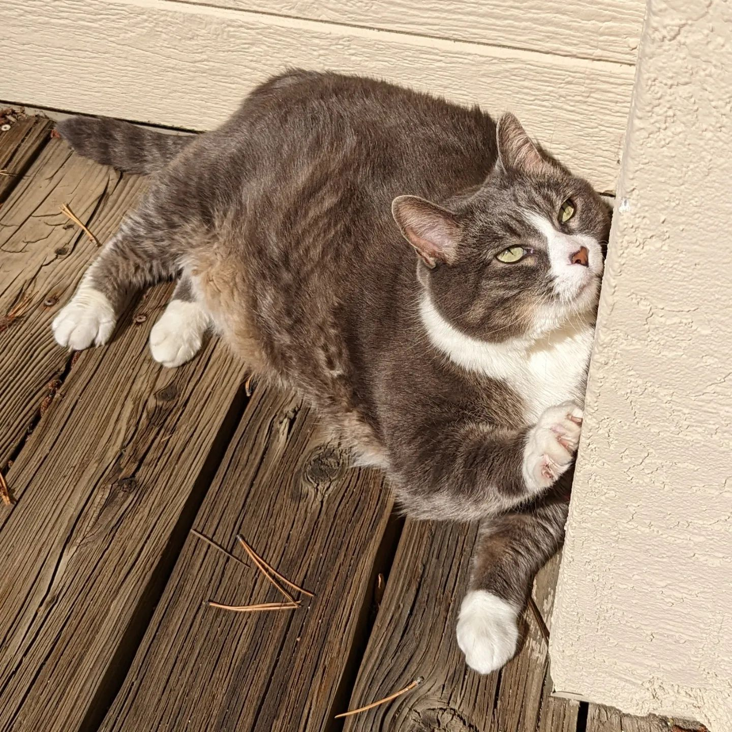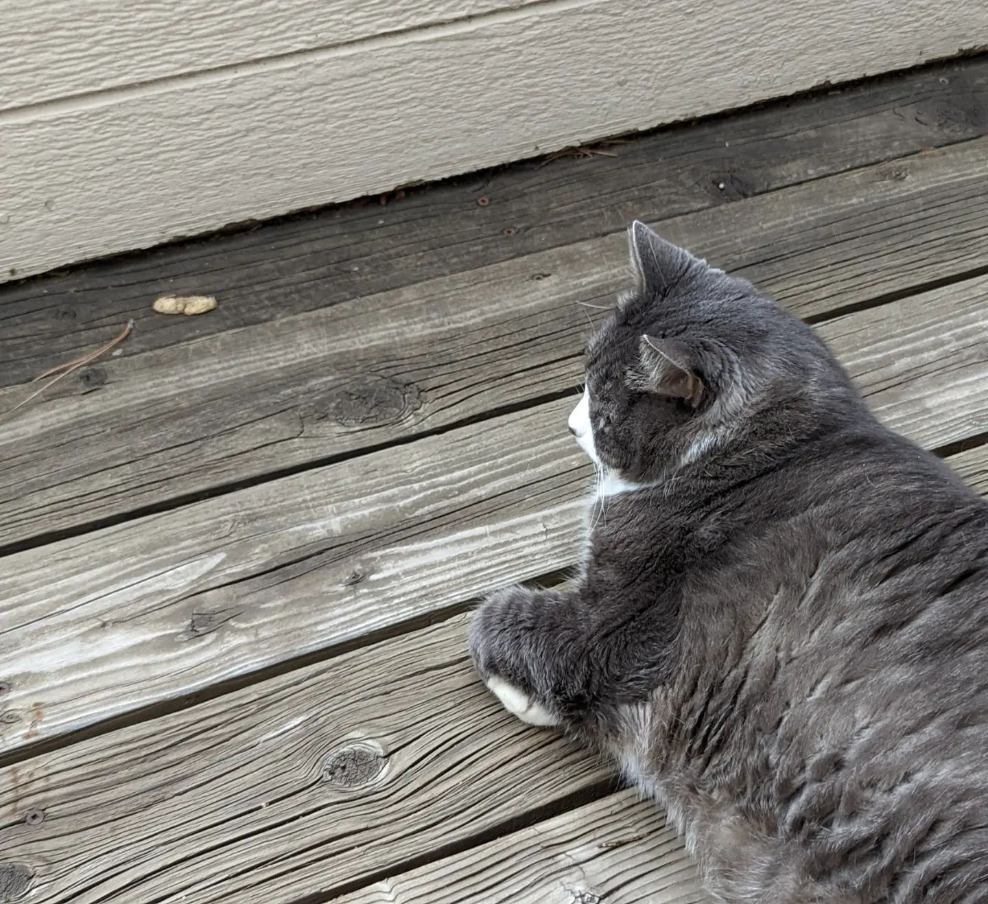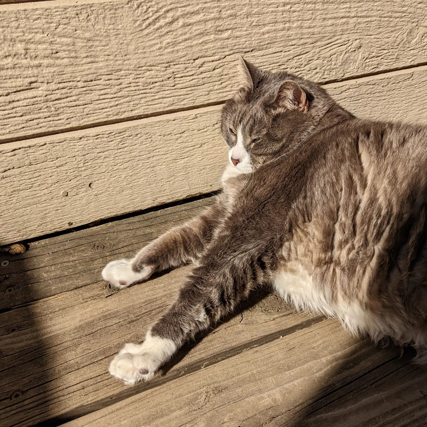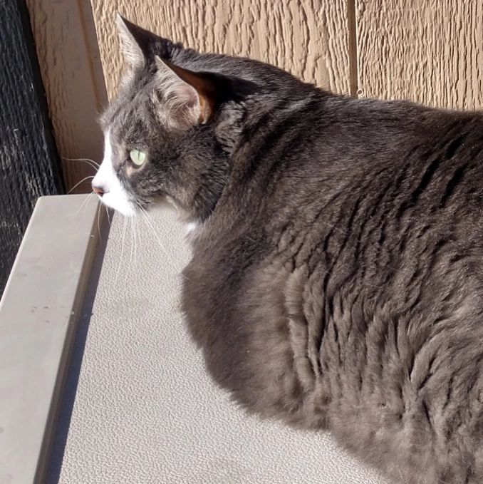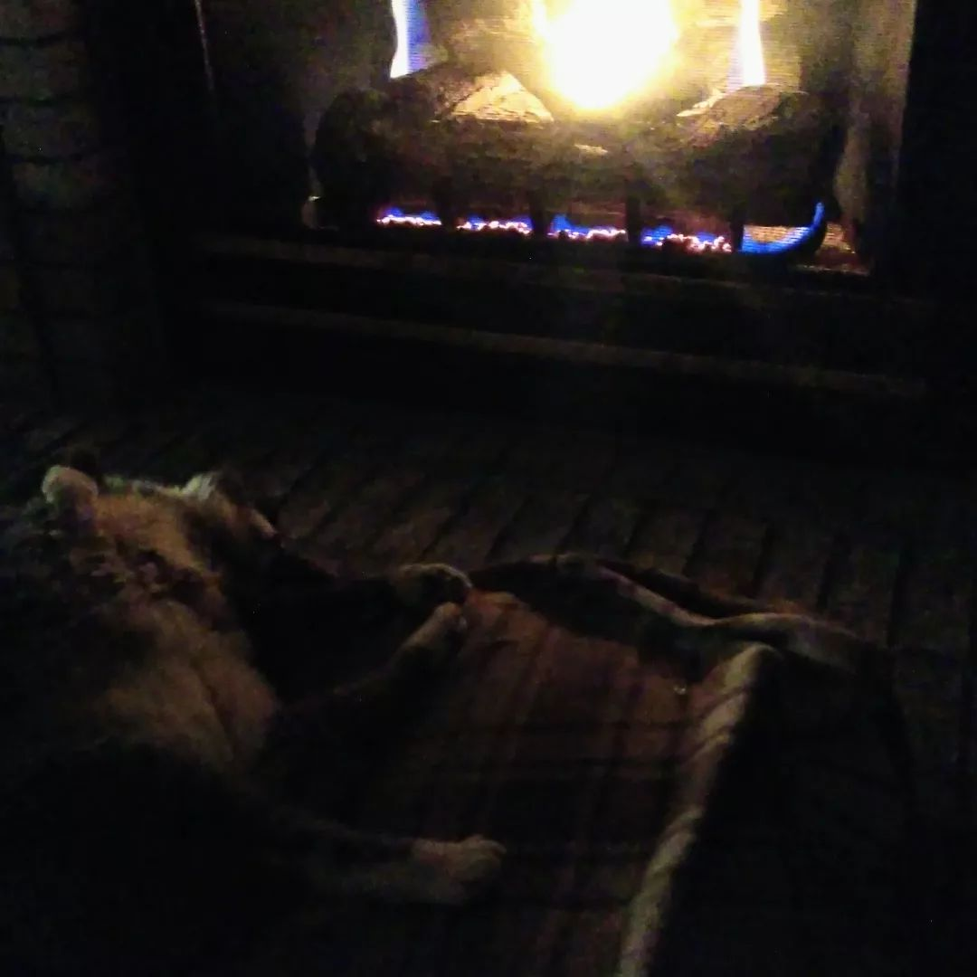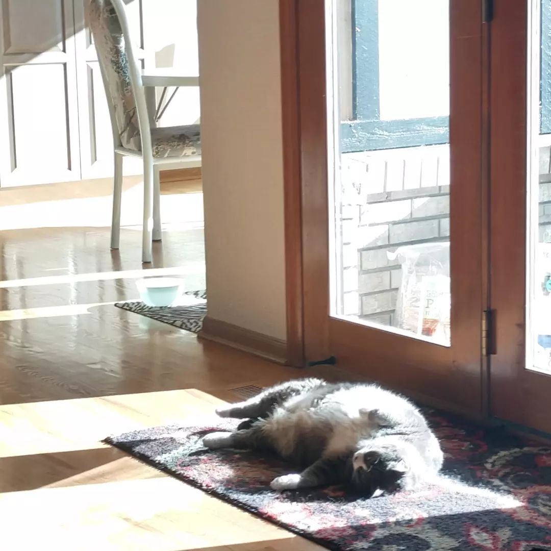 Loafing with a purpose. Ziggy is trying to toast on the woodbox, but it is only 38 deg outside (3.3 C)... but she will try to prove it's great and she doesn't need to come back inside. ????