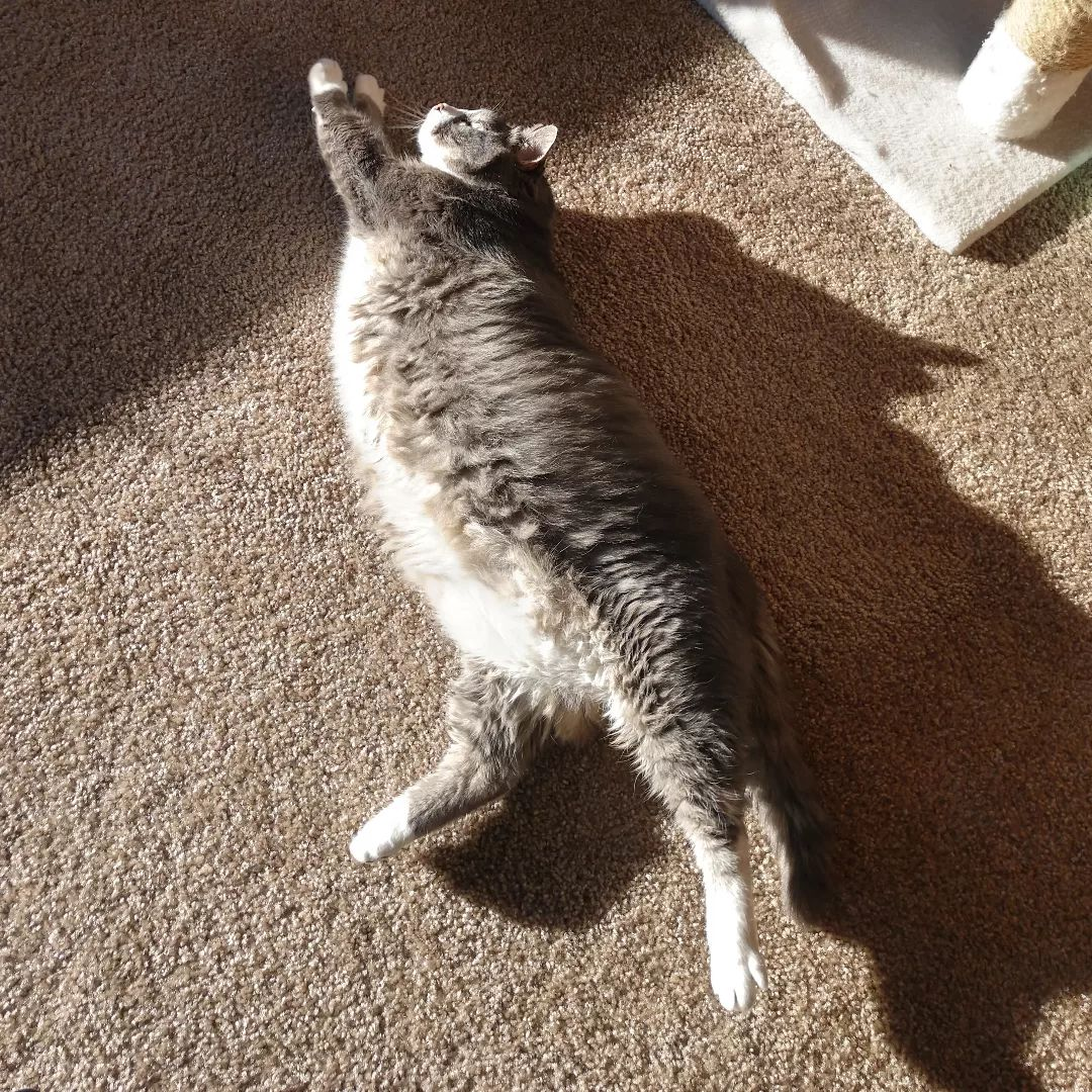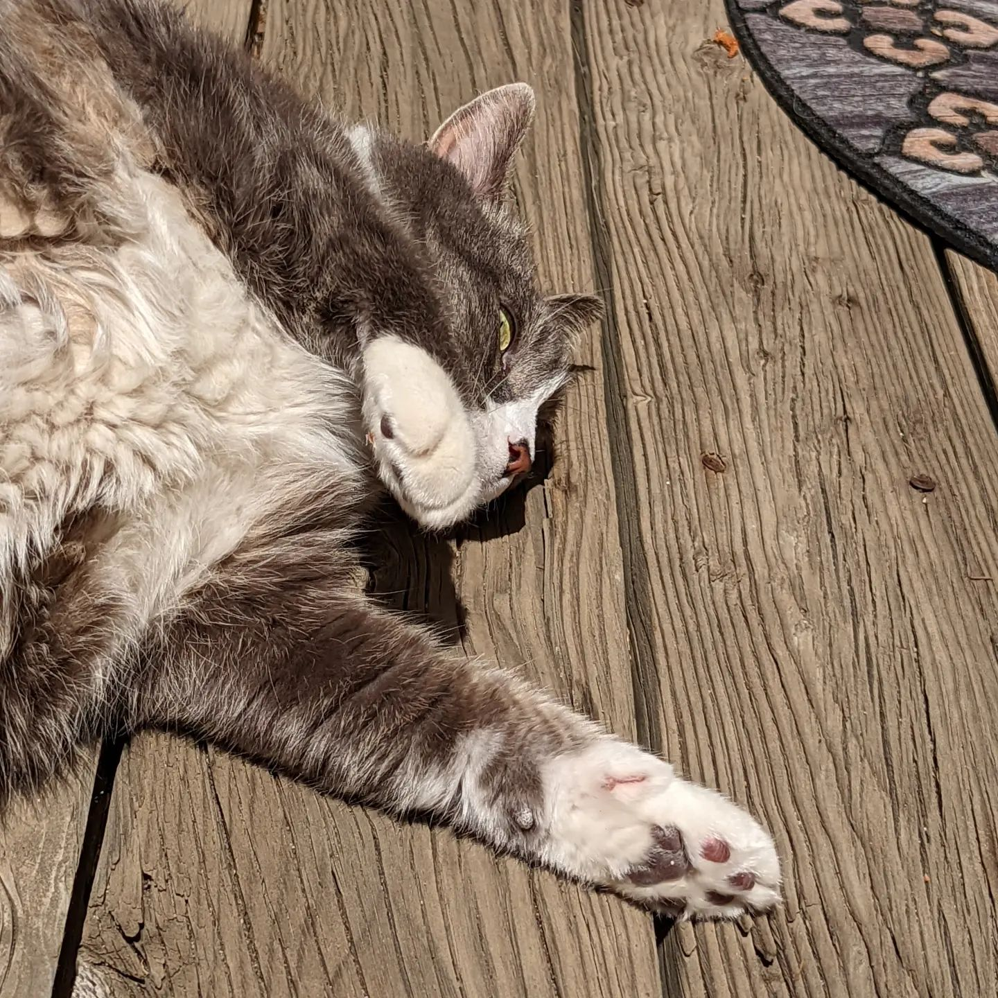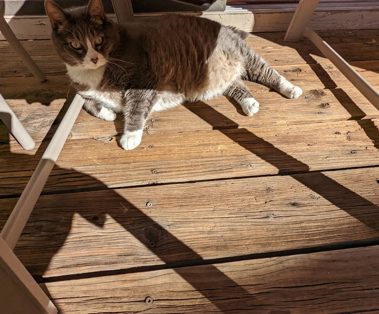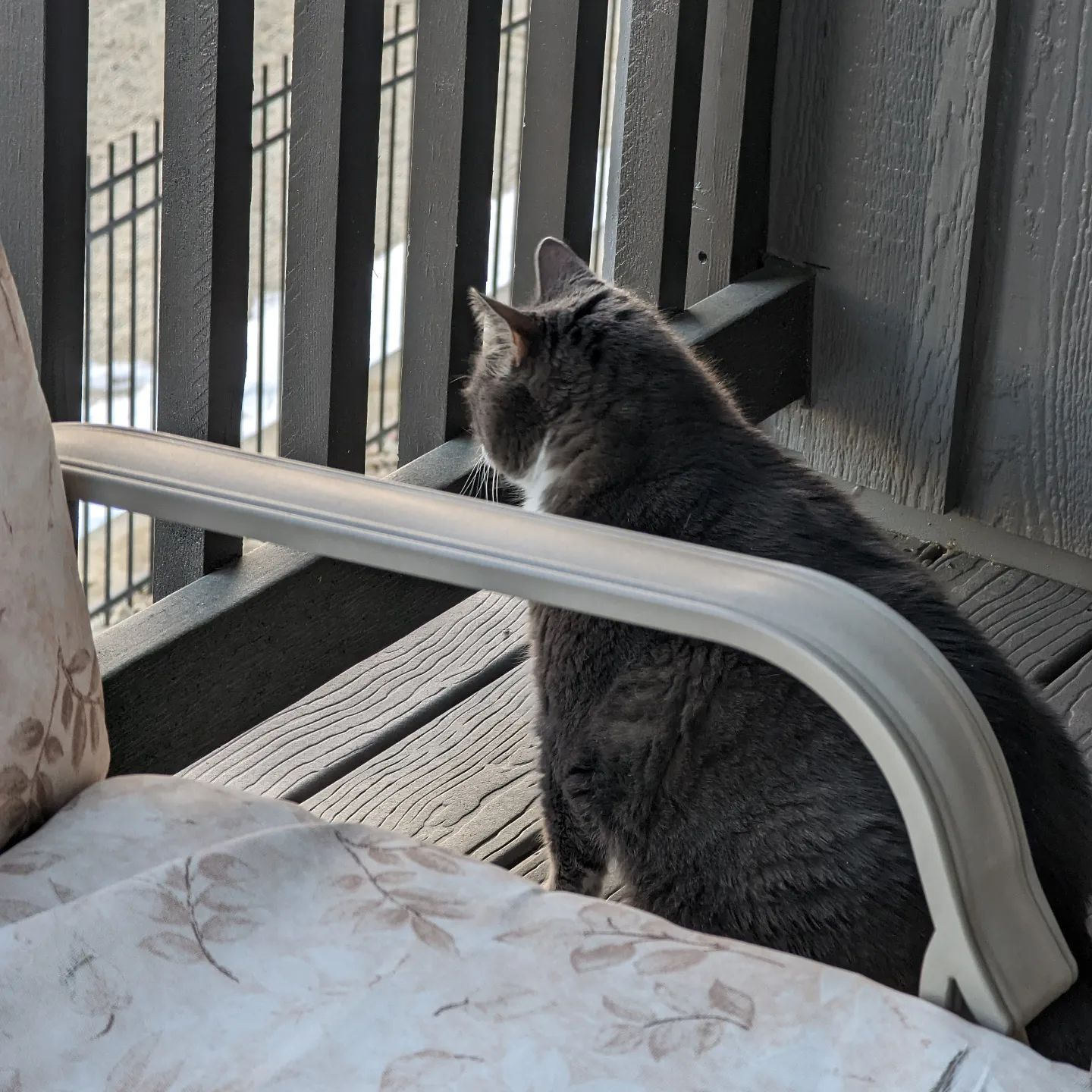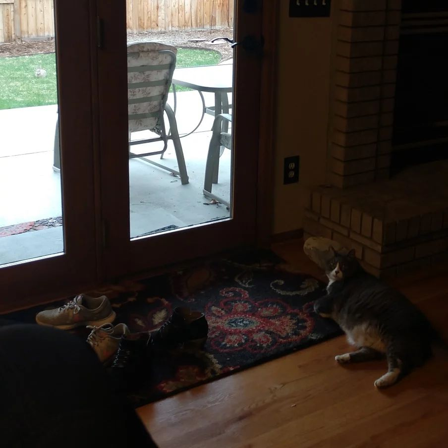 Loafing with a purpose. Ziggy is trying to toast on the woodbox, but it is only 38 deg outside (3.3 C)... but she will try to prove it's great and she doesn't need to come back inside. ????
