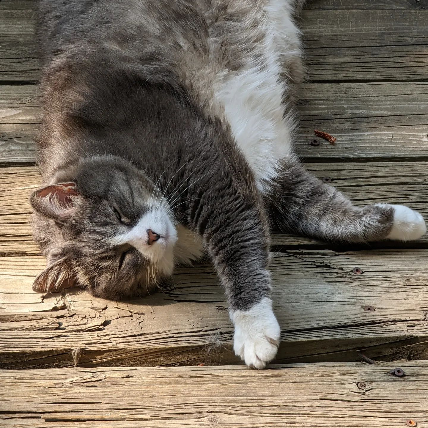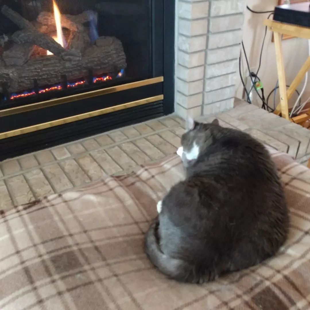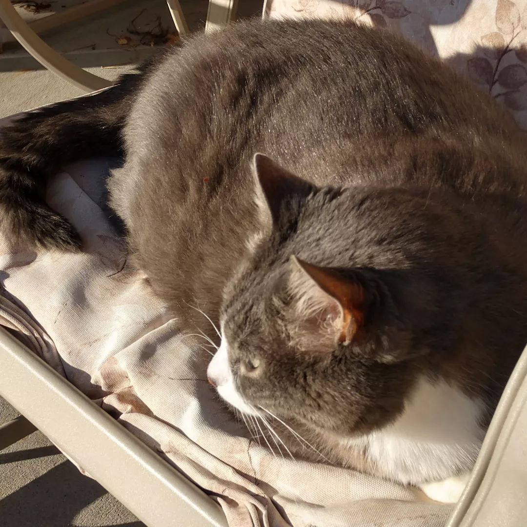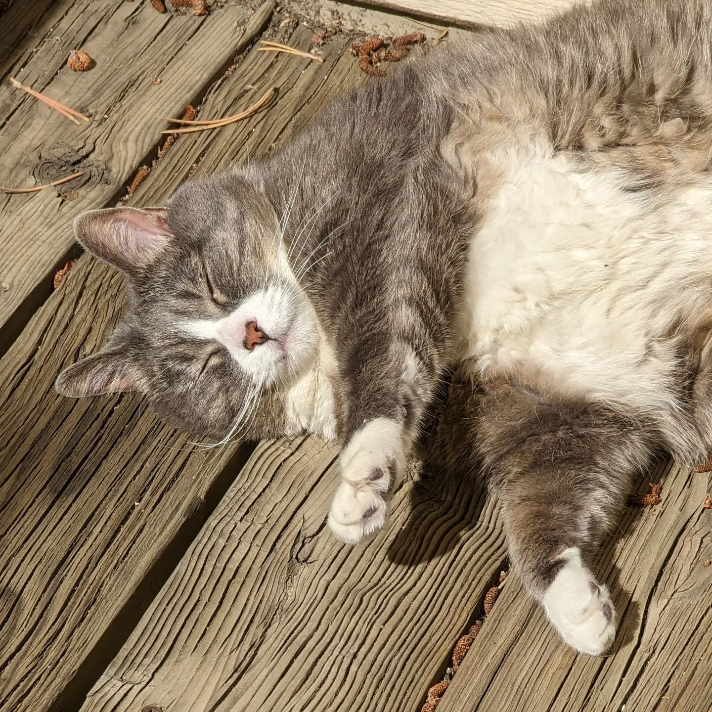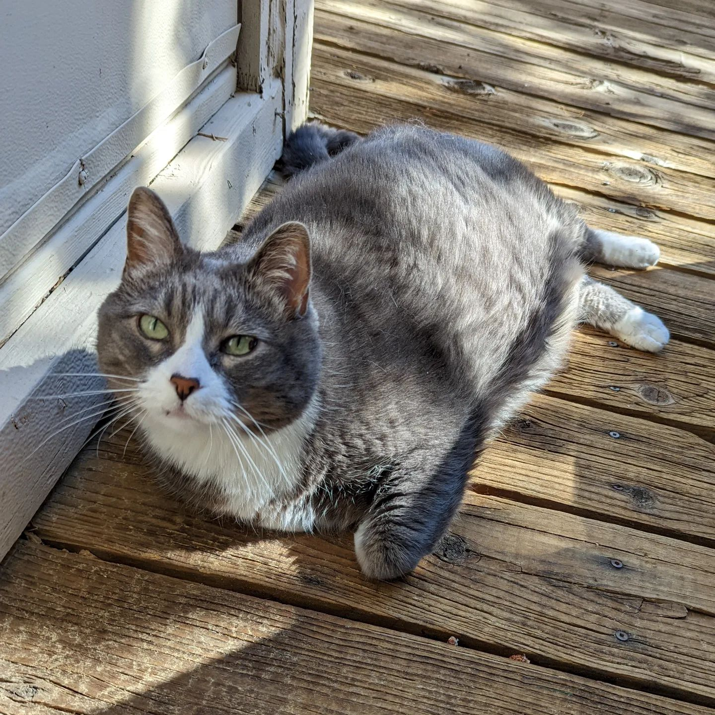 Loafing with a purpose. Ziggy is trying to toast on the woodbox, but it is only 38 deg outside (3.3 C)... but she will try to prove it's great and she doesn't need to come back inside. ????