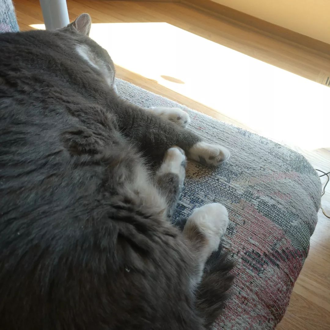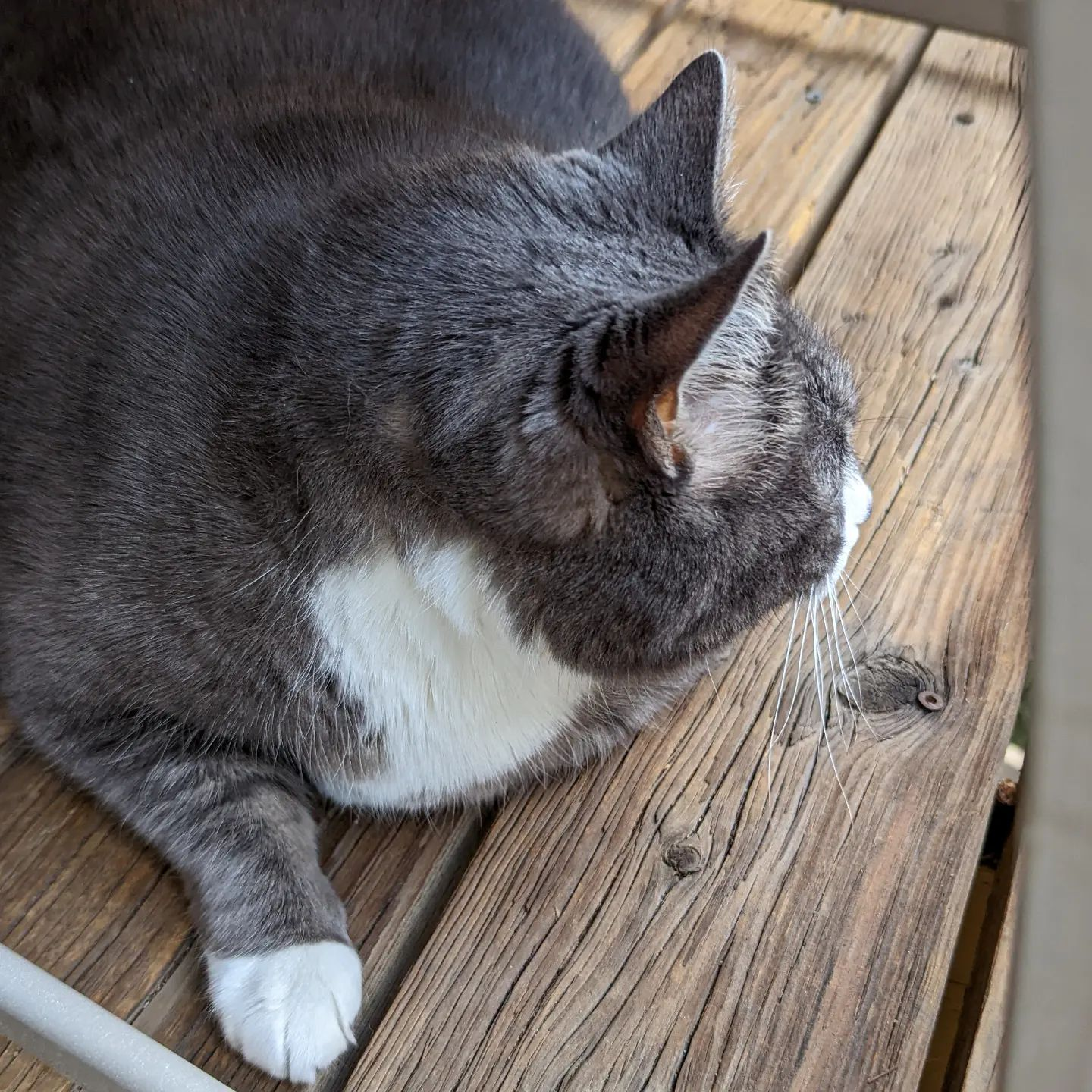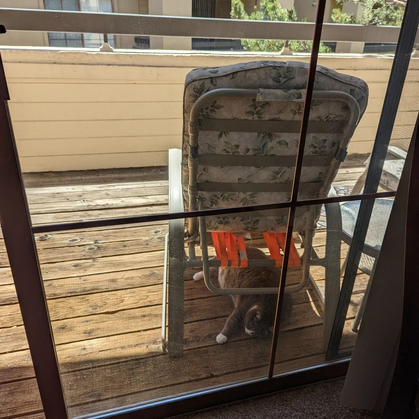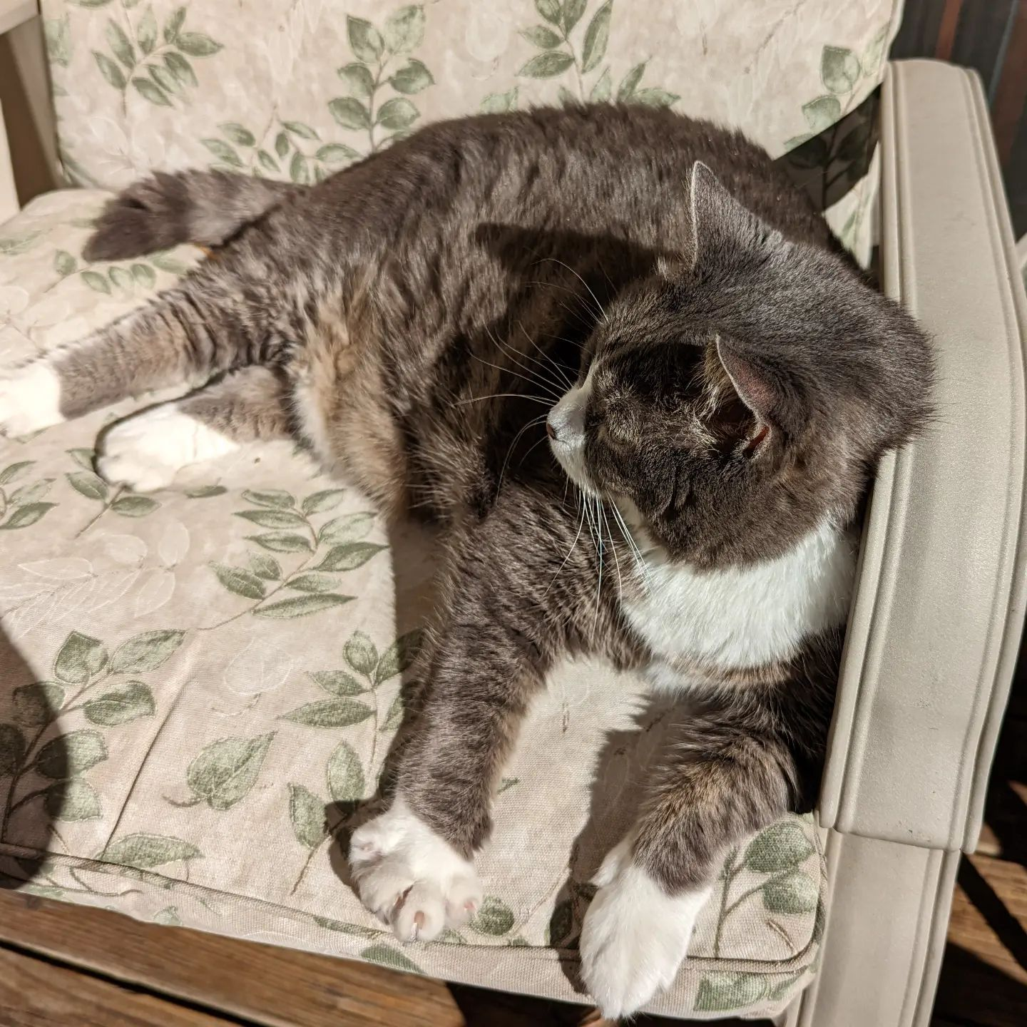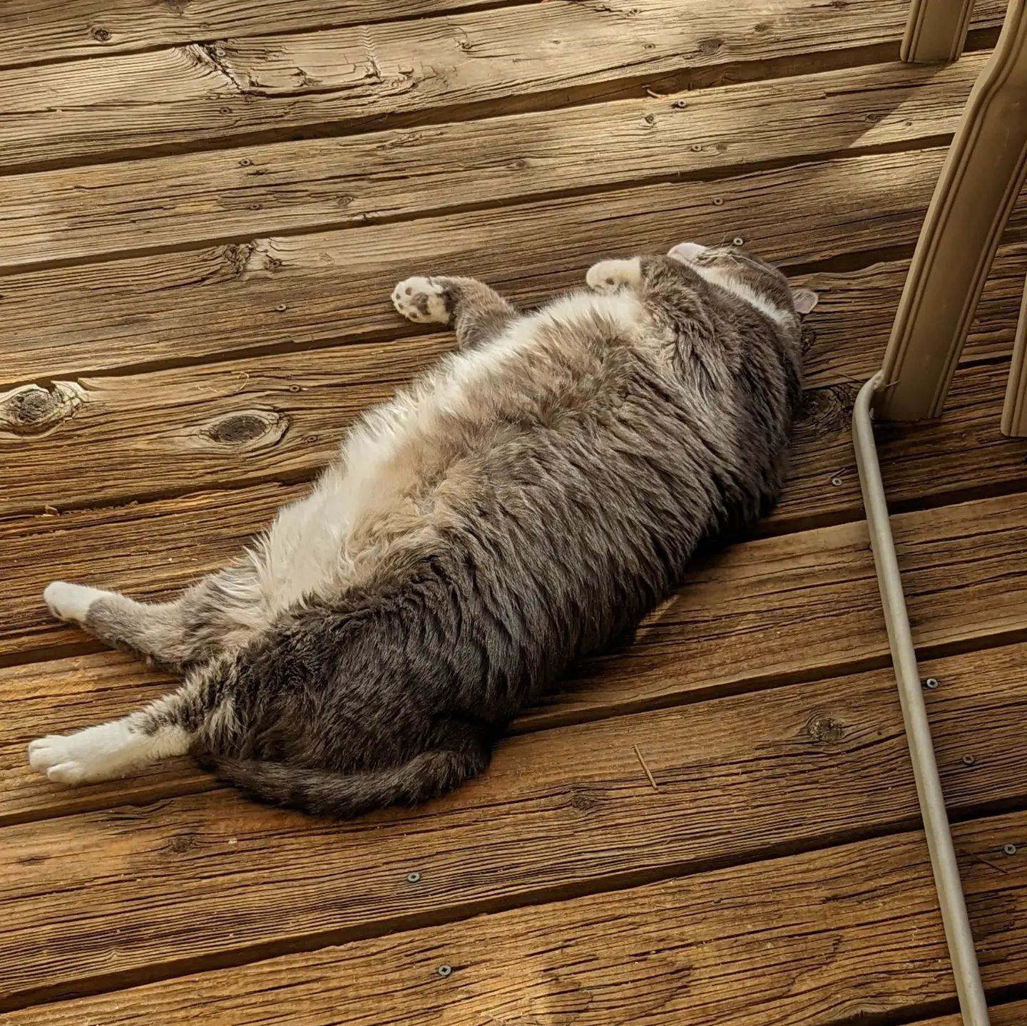 Loafing with a purpose. Ziggy is trying to toast on the woodbox, but it is only 38 deg outside (3.3 C)... but she will try to prove it's great and she doesn't need to come back inside. ????