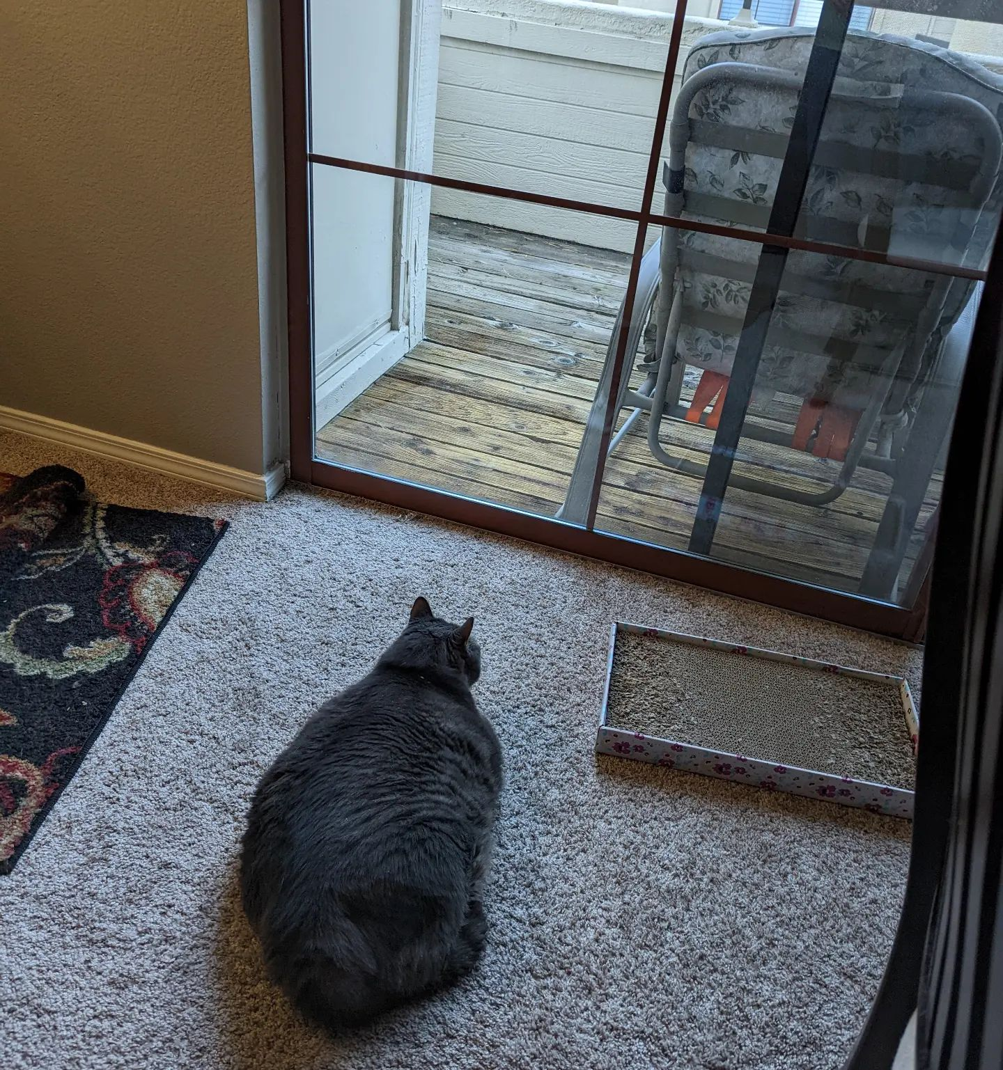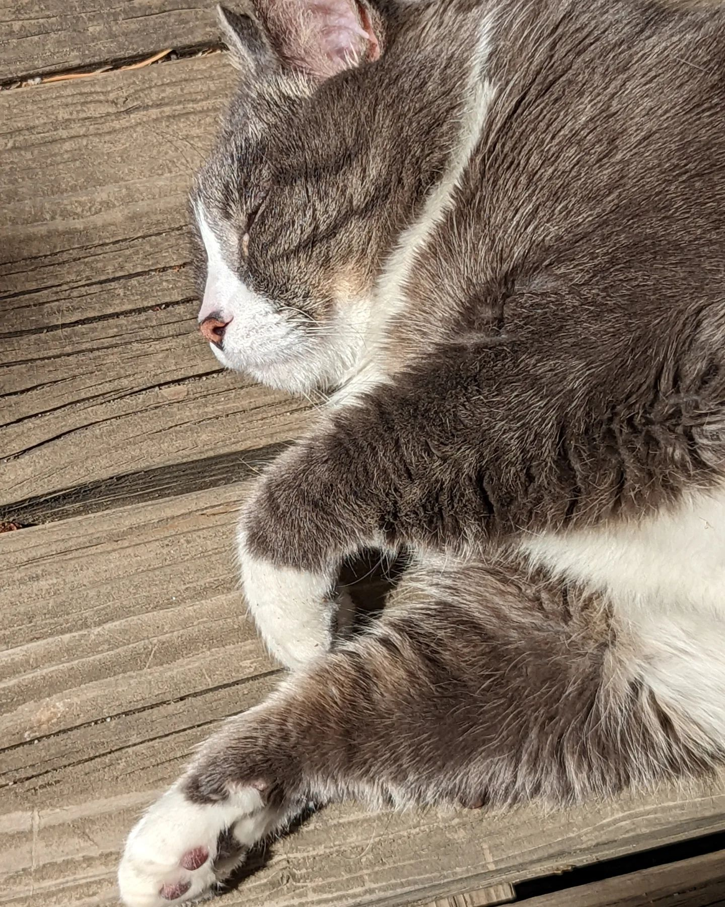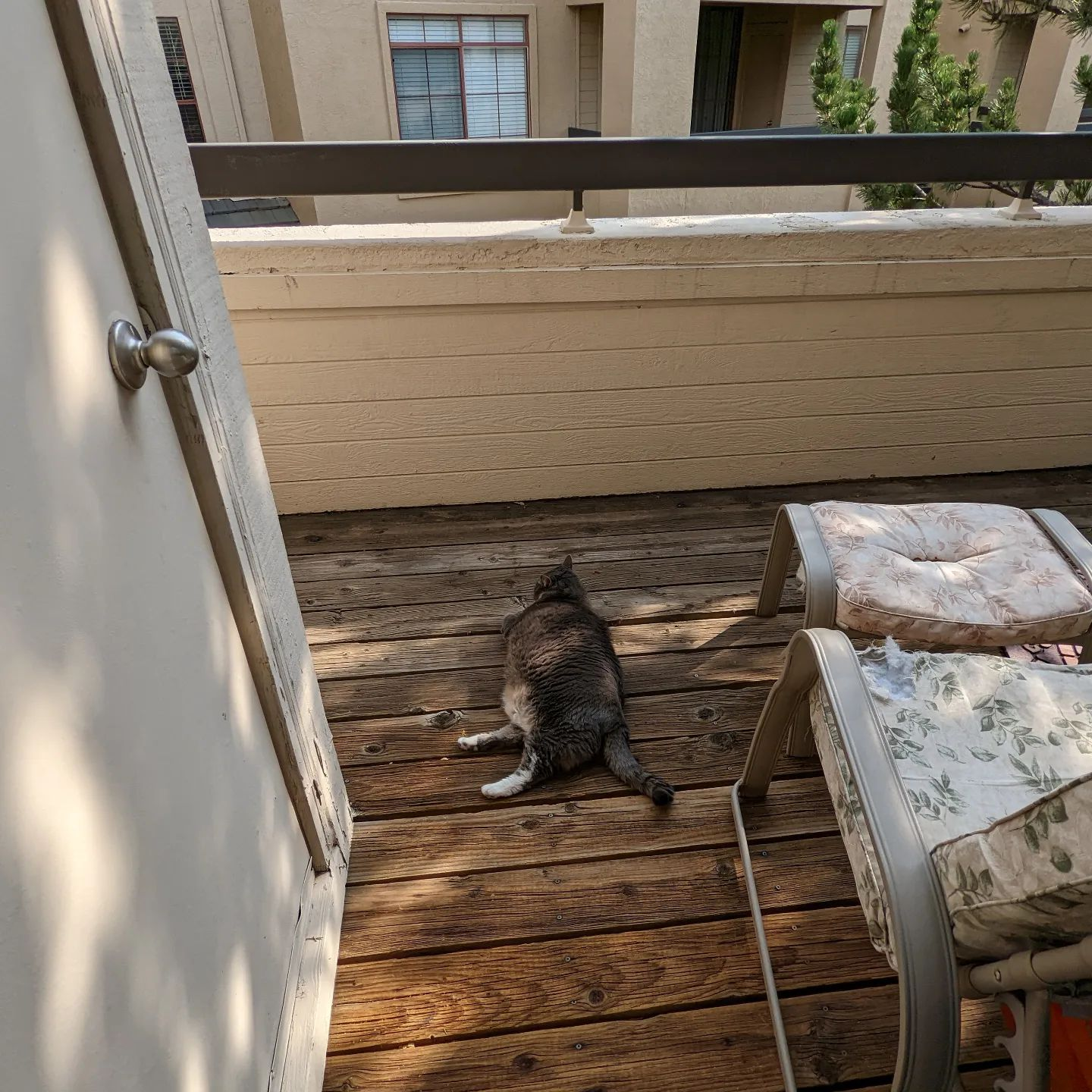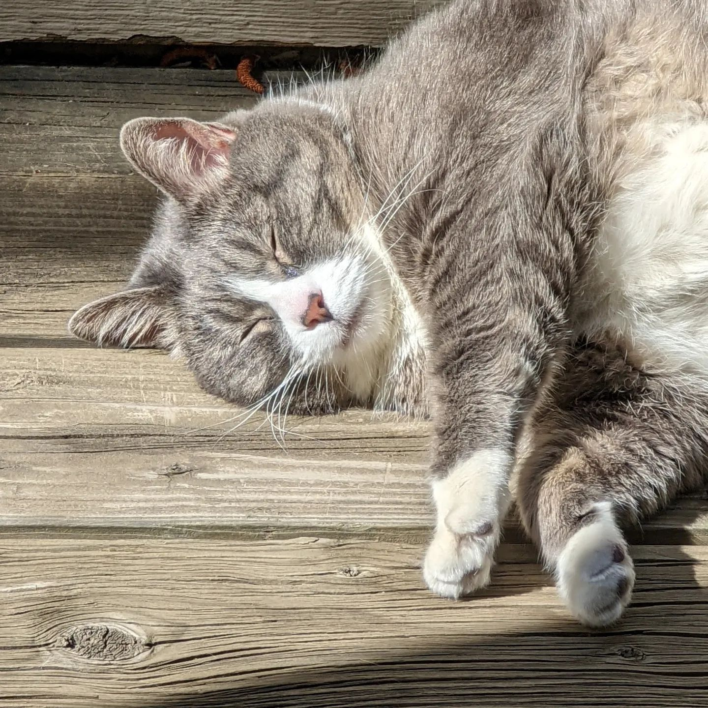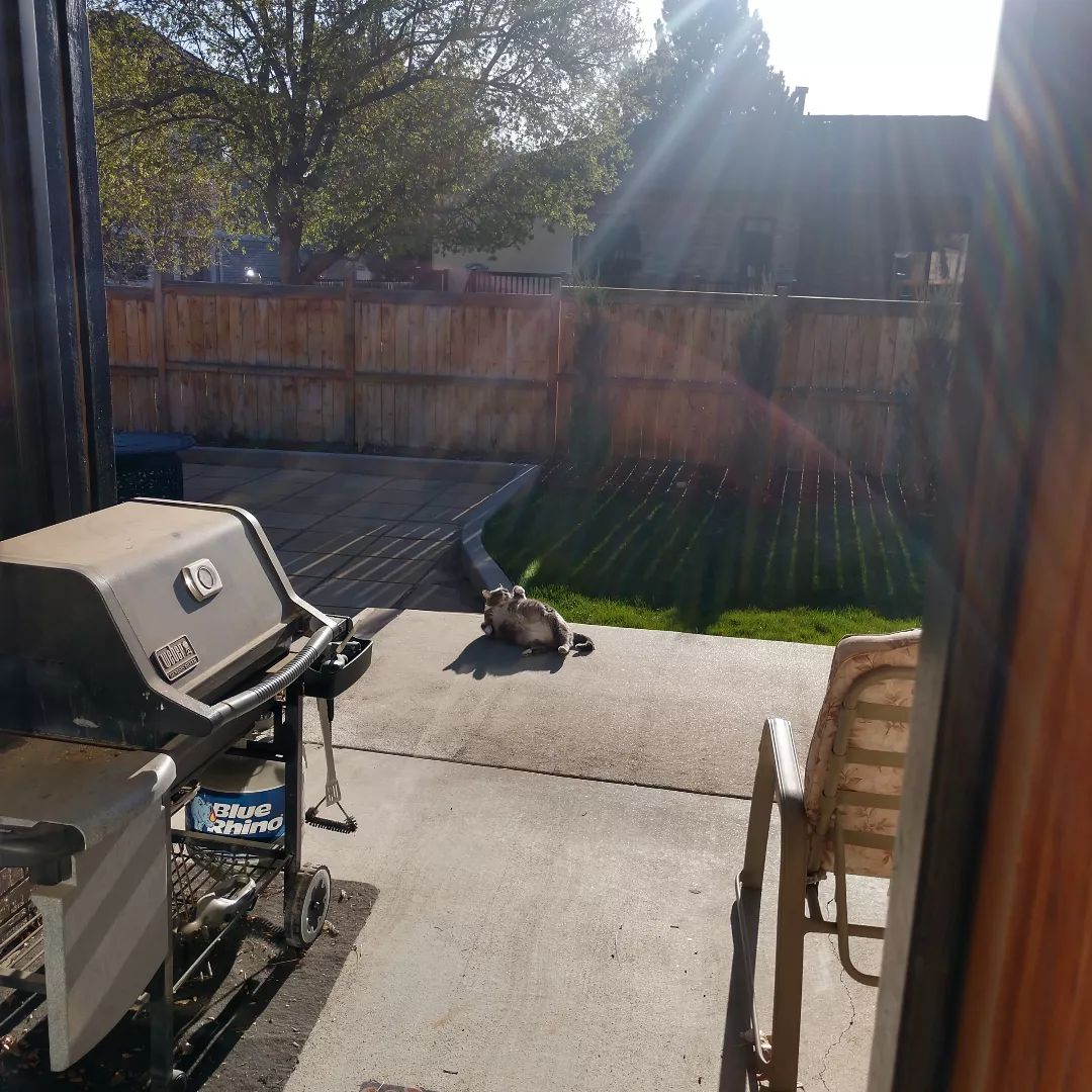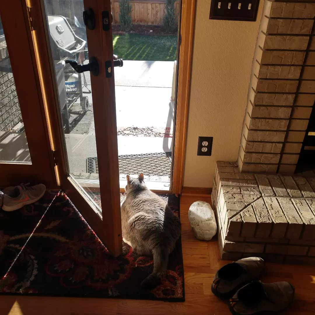 Loafing with a purpose. Ziggy is trying to toast on the woodbox, but it is only 38 deg outside (3.3 C)... but she will try to prove it's great and she doesn't need to come back inside. ????