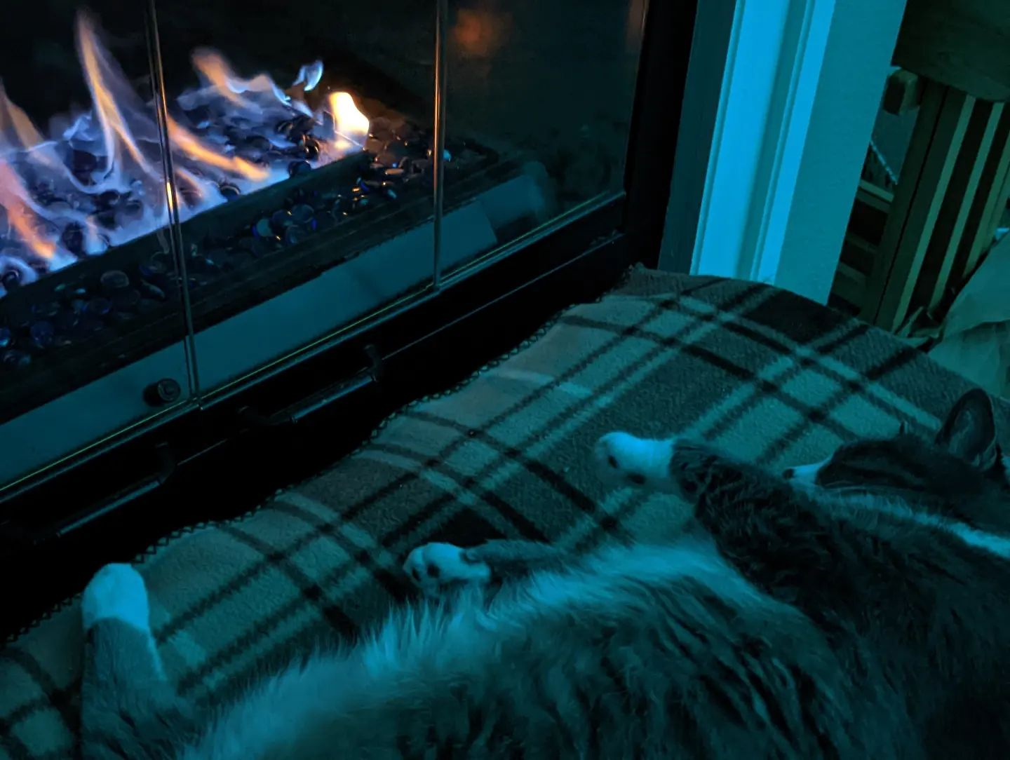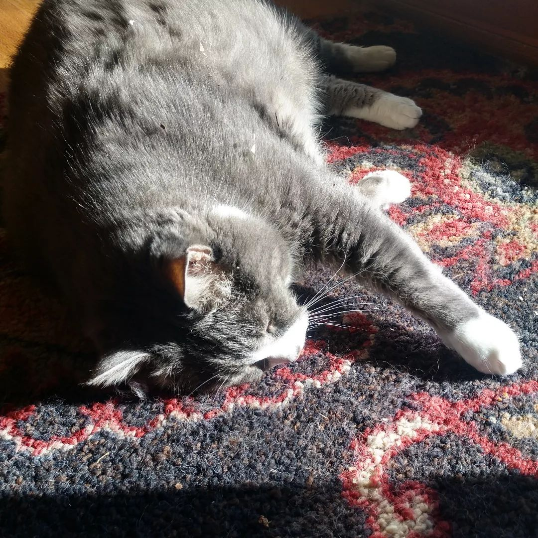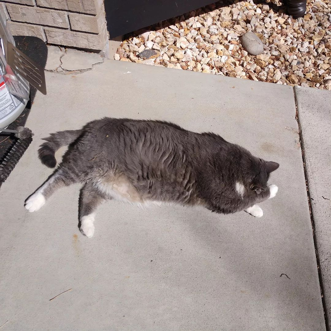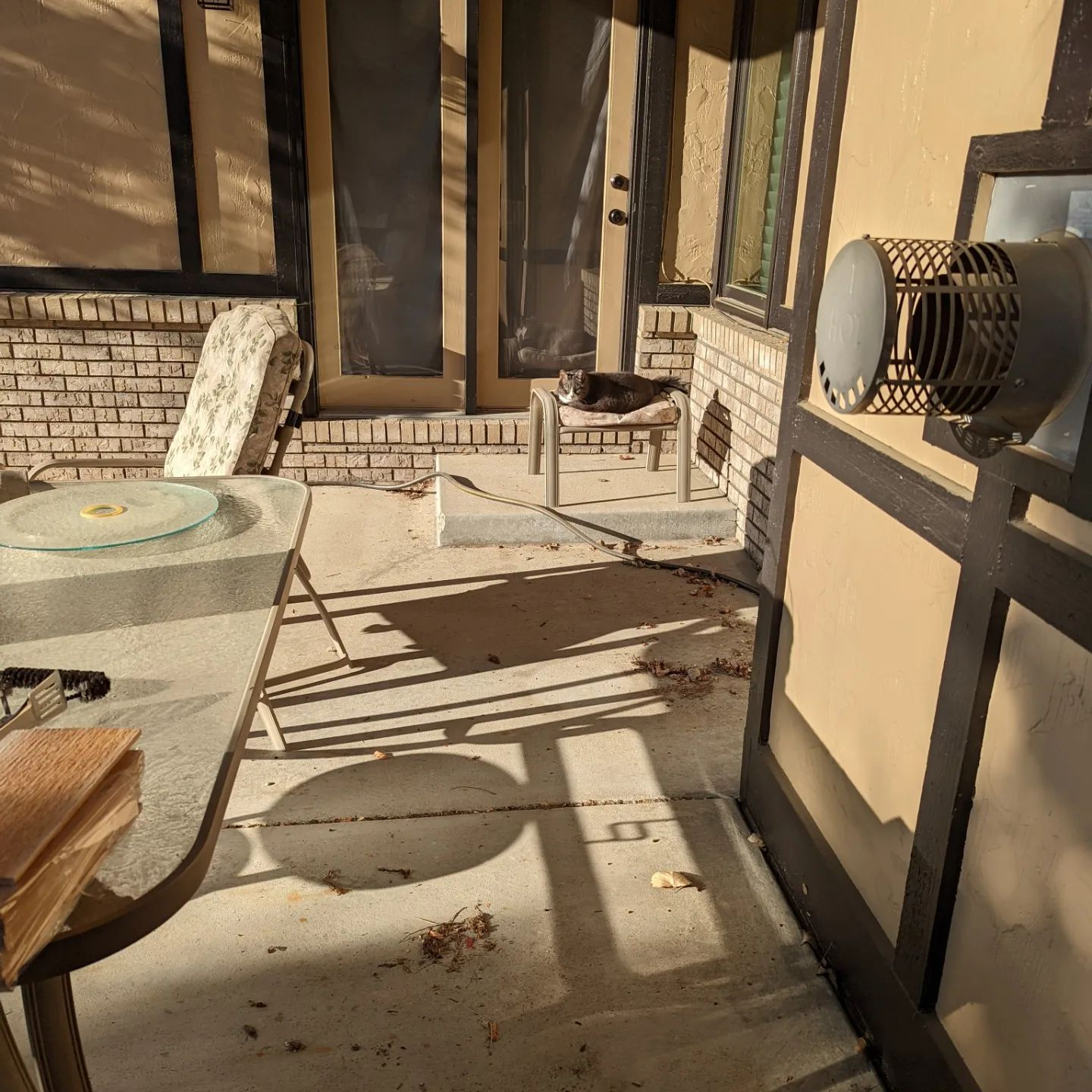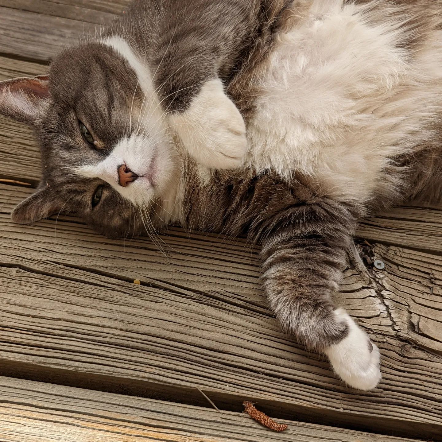Loafing with a purpose. Ziggy is trying to toast on the woodbox, but it is only 38 deg outside (3.3 C)... but she will try to prove it's great and she doesn't need to come back inside. ????