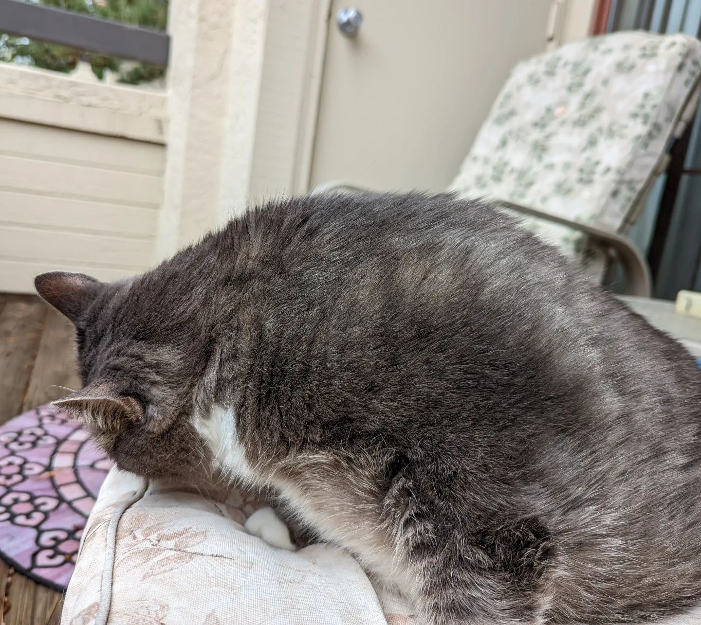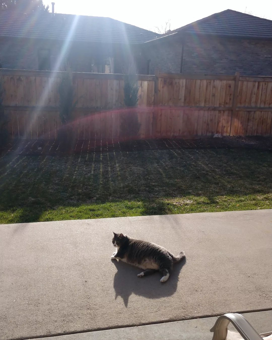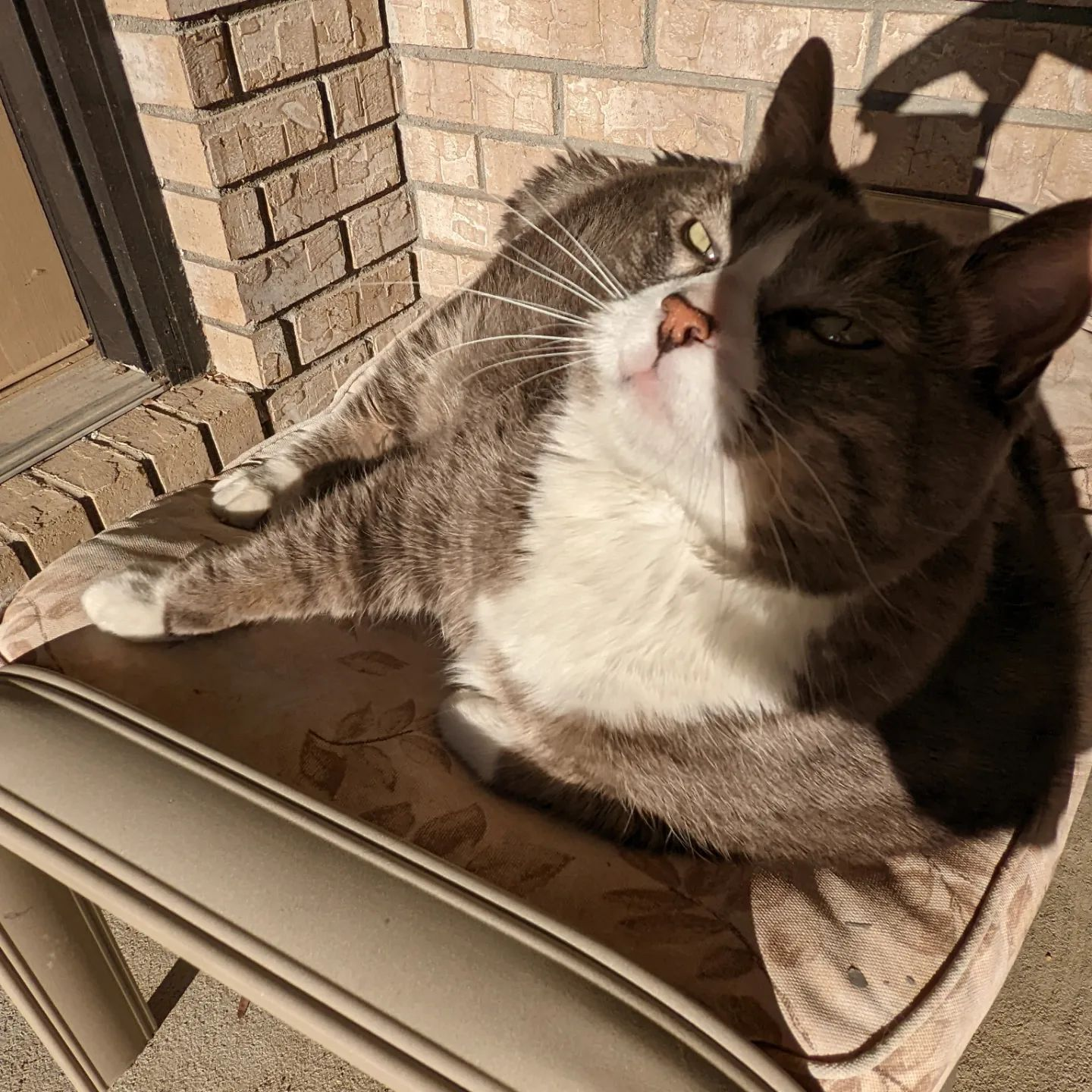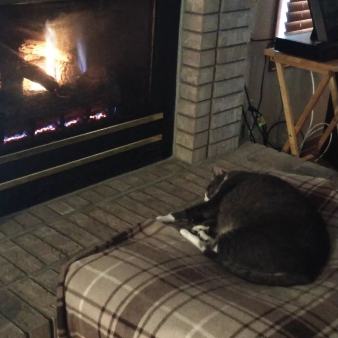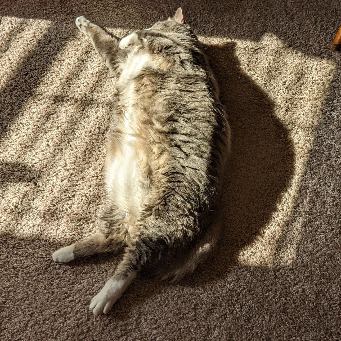 Loafing with a purpose. Ziggy is trying to toast on the woodbox, but it is only 38 deg outside (3.3 C)... but she will try to prove it's great and she doesn't need to come back inside. ????
