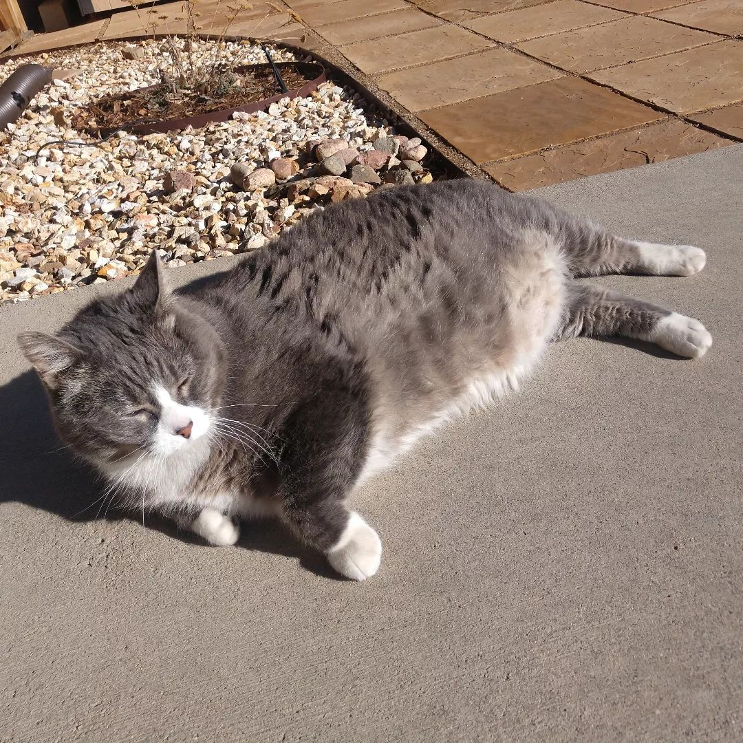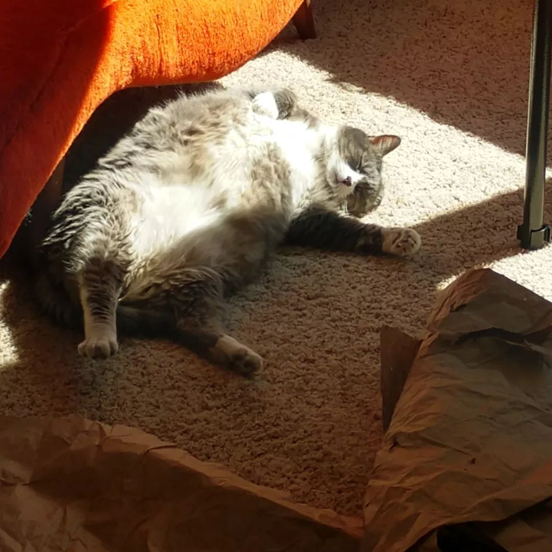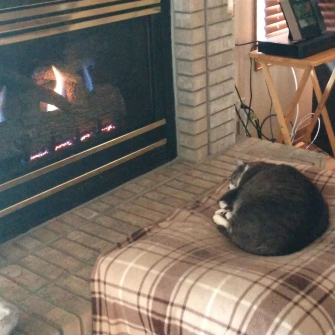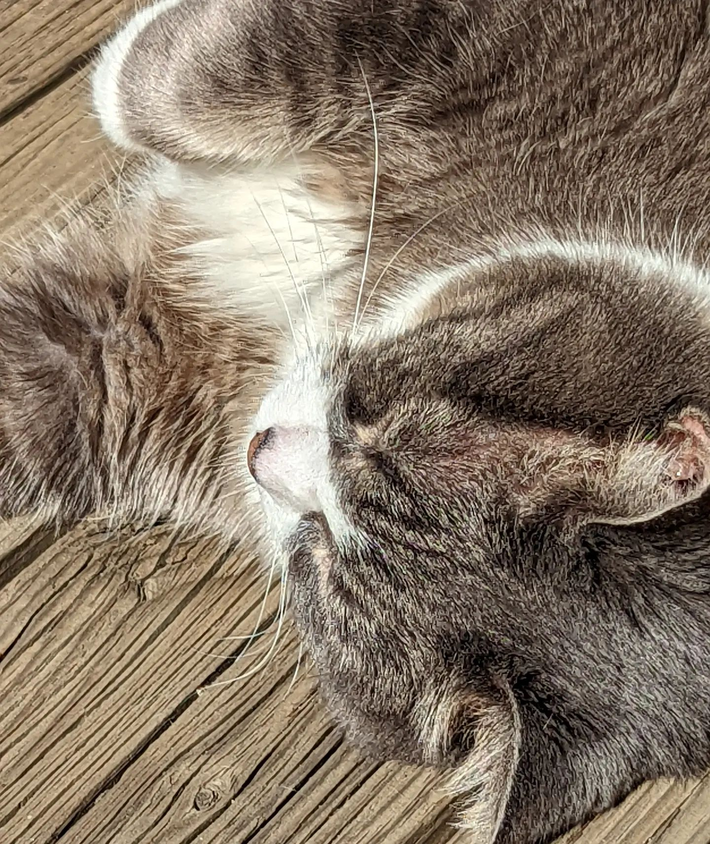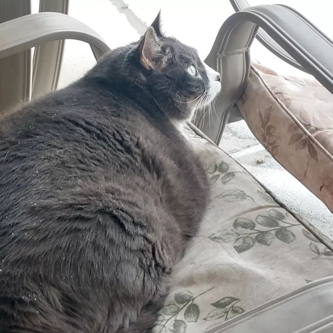Loafing with a purpose. Ziggy is trying to toast on the woodbox, but it is only 38 deg outside (3.3 C)... but she will try to prove it's great and she doesn't need to come back inside. ????