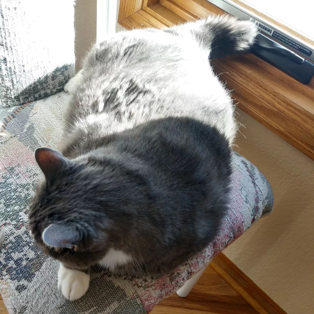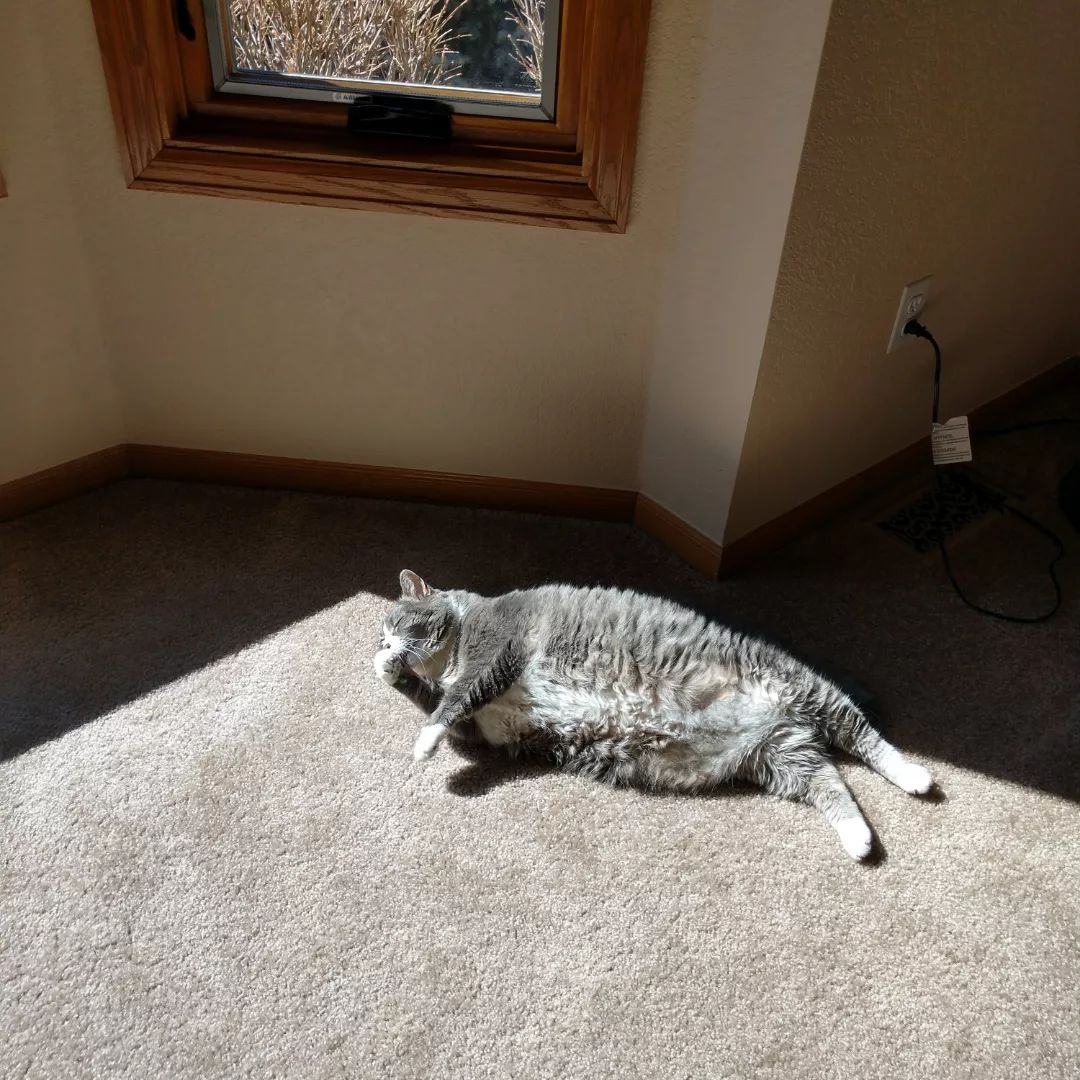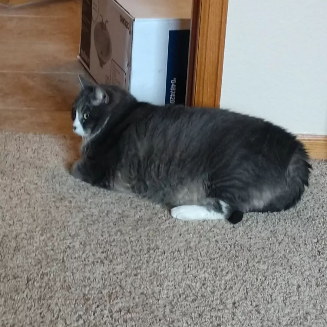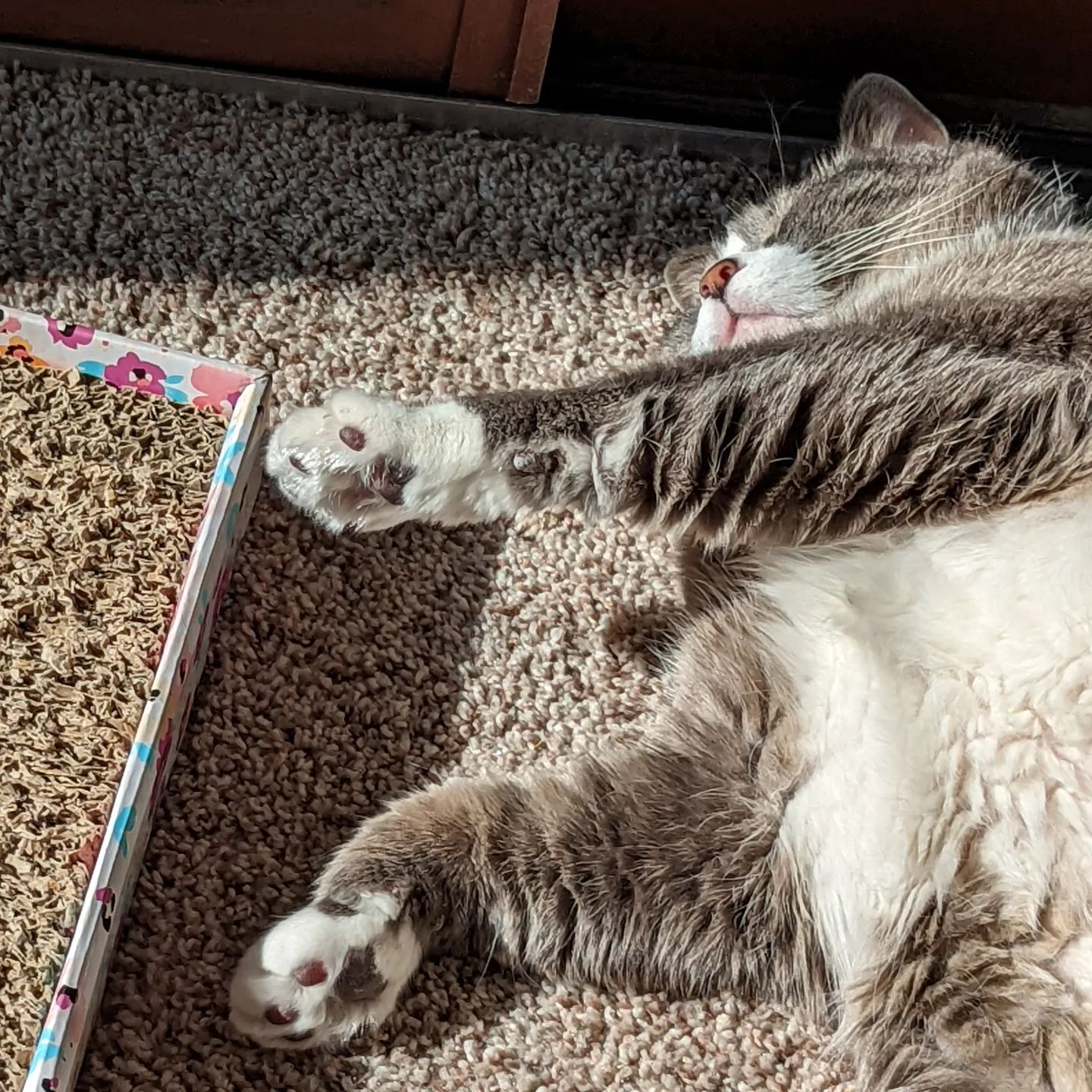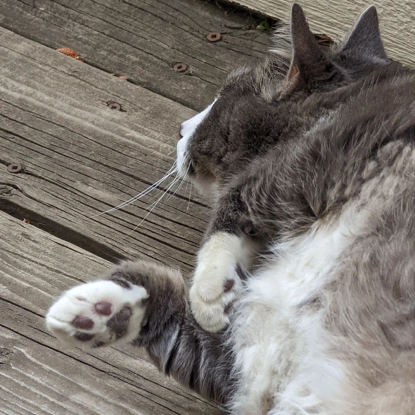 Loafing with a purpose. Ziggy is trying to toast on the woodbox, but it is only 38 deg outside (3.3 C)... but she will try to prove it's great and she doesn't need to come back inside. ????
