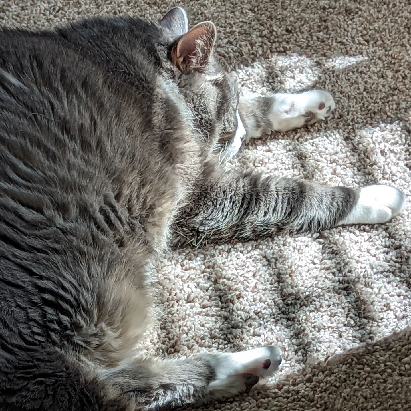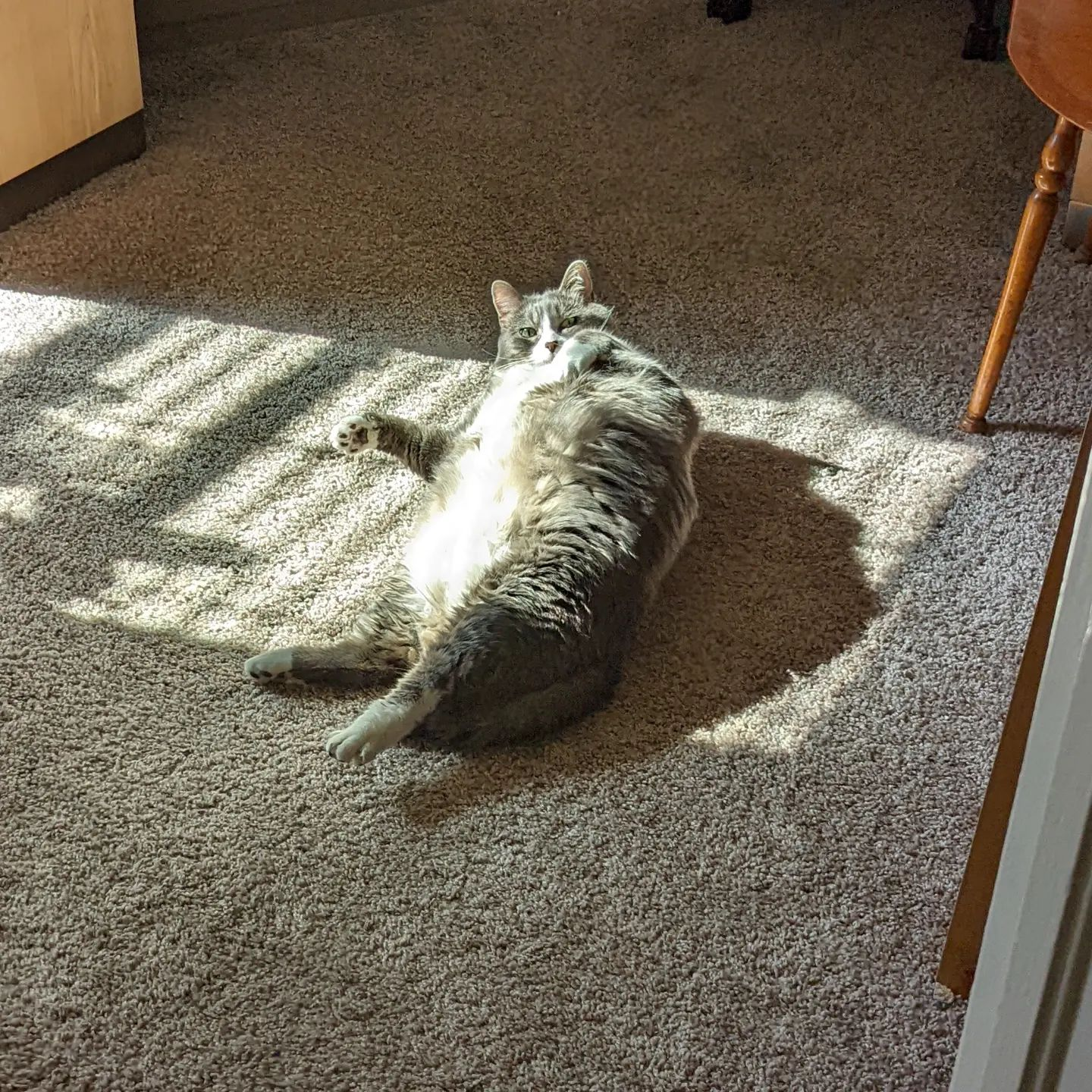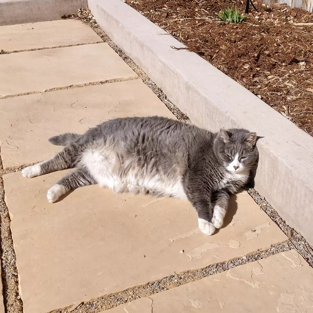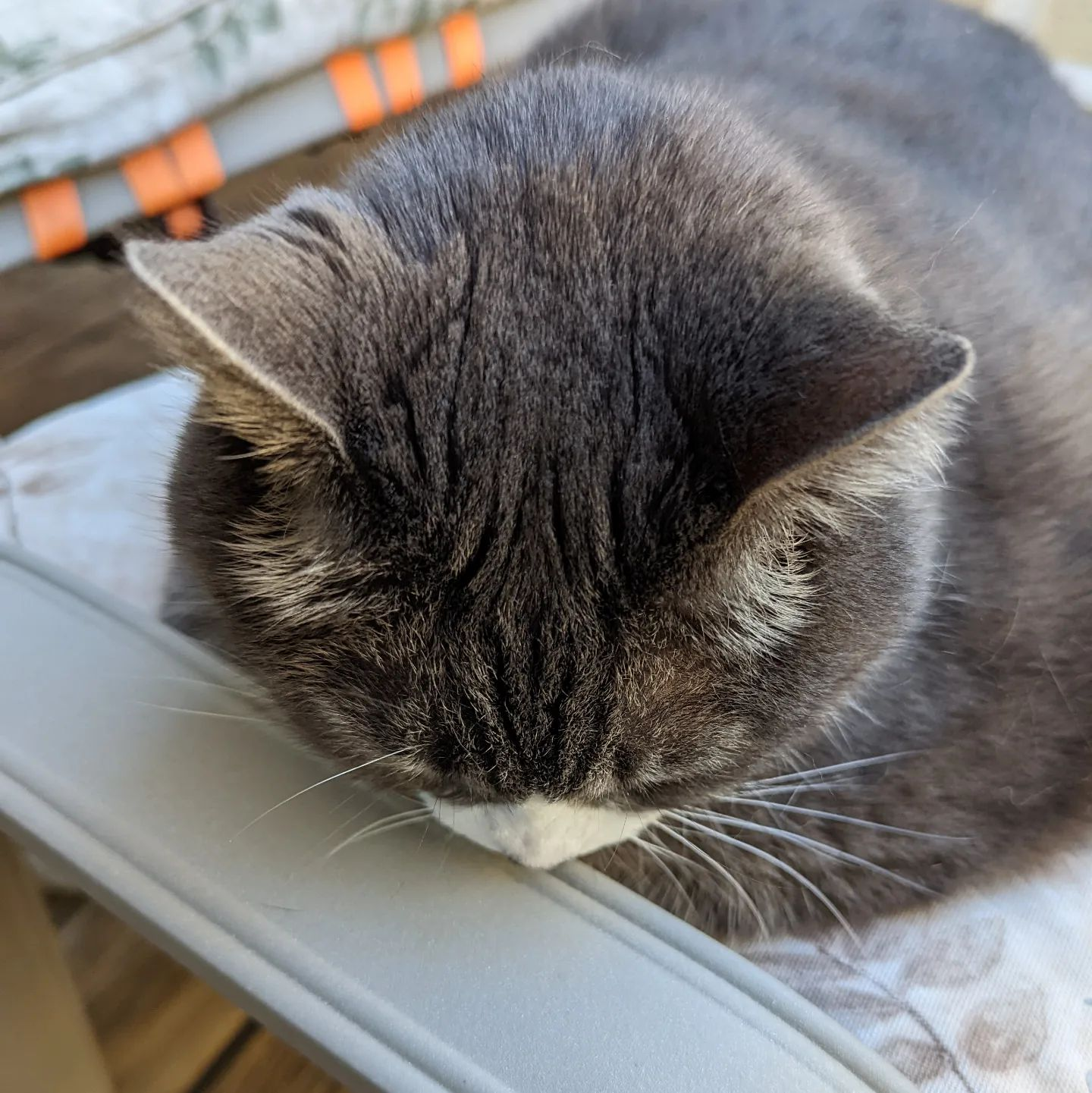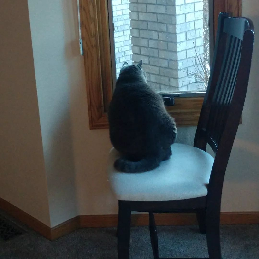 Loafing with a purpose. Ziggy is trying to toast on the woodbox, but it is only 38 deg outside (3.3 C)... but she will try to prove it's great and she doesn't need to come back inside. ????