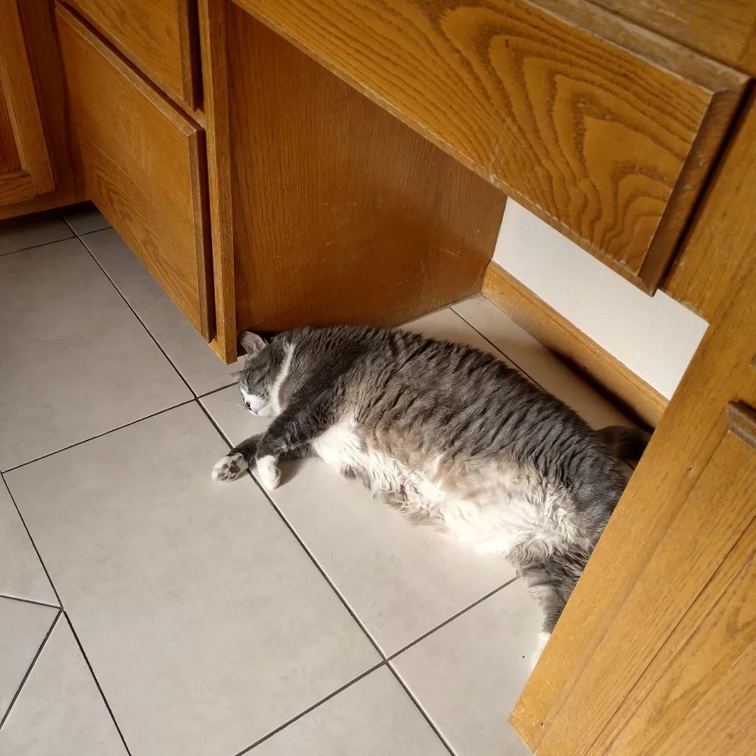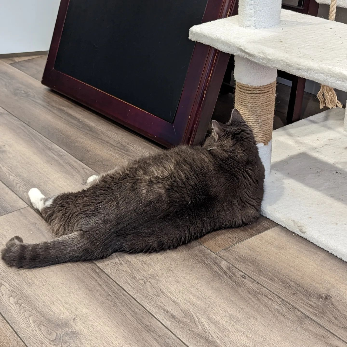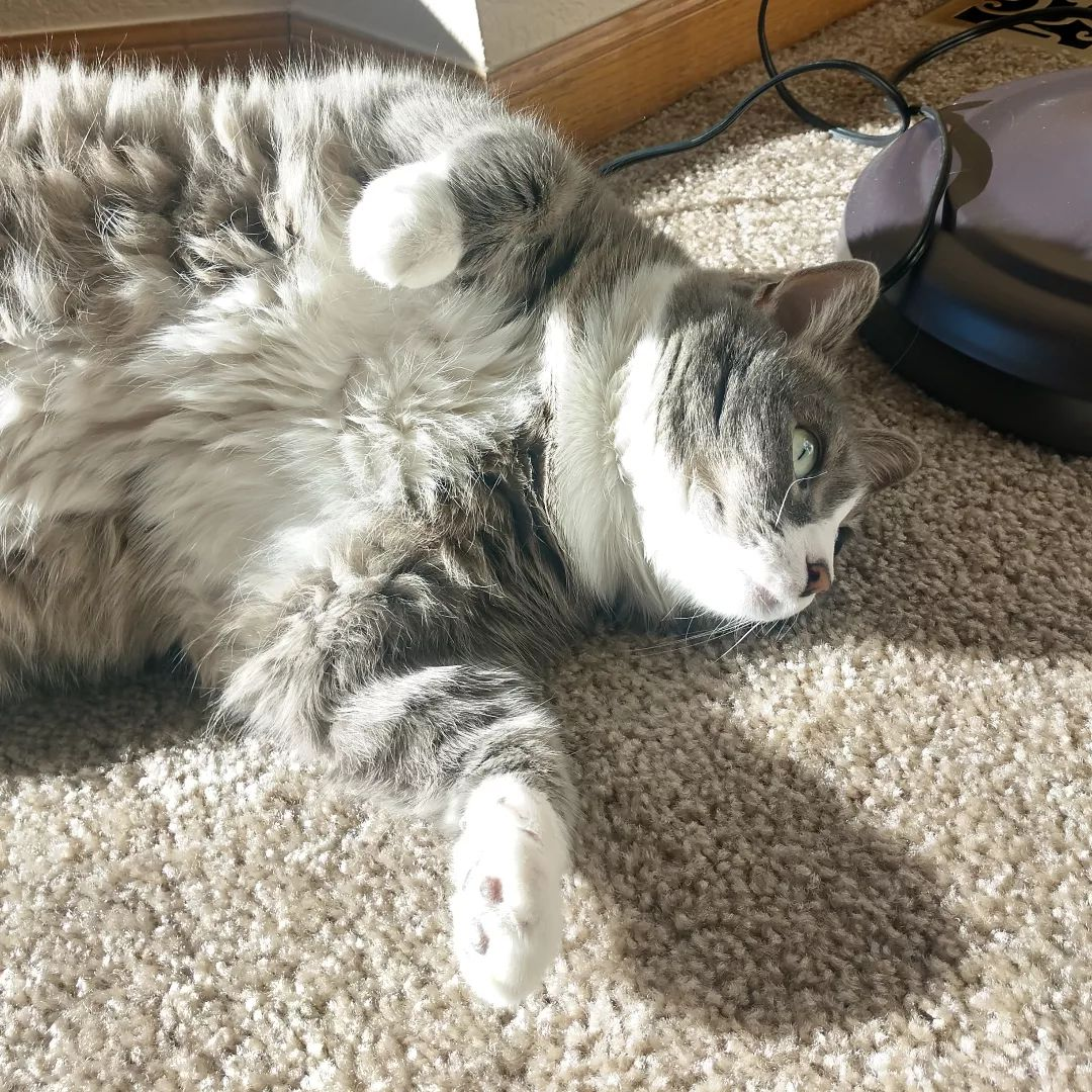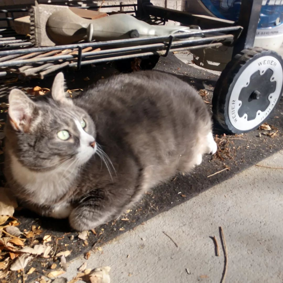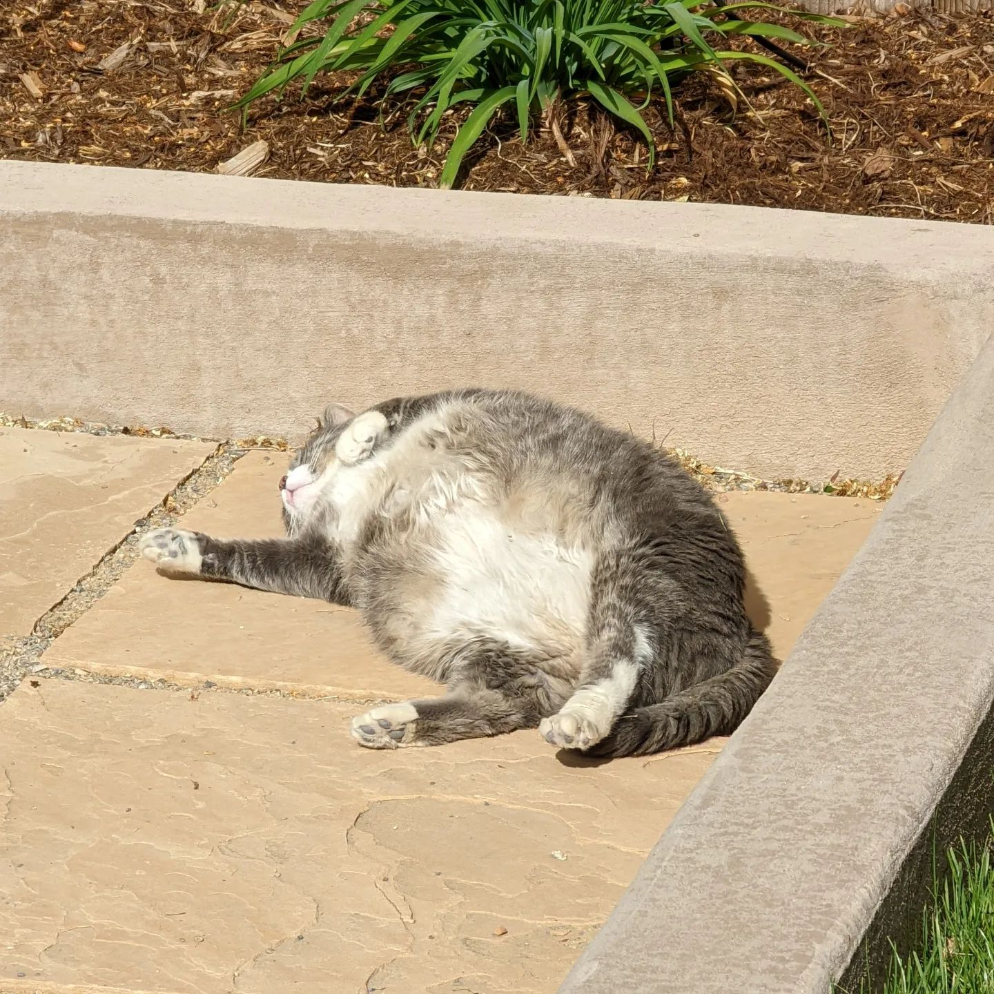 Loafing with a purpose. Ziggy is trying to toast on the woodbox, but it is only 38 deg outside (3.3 C)... but she will try to prove it's great and she doesn't need to come back inside. ????