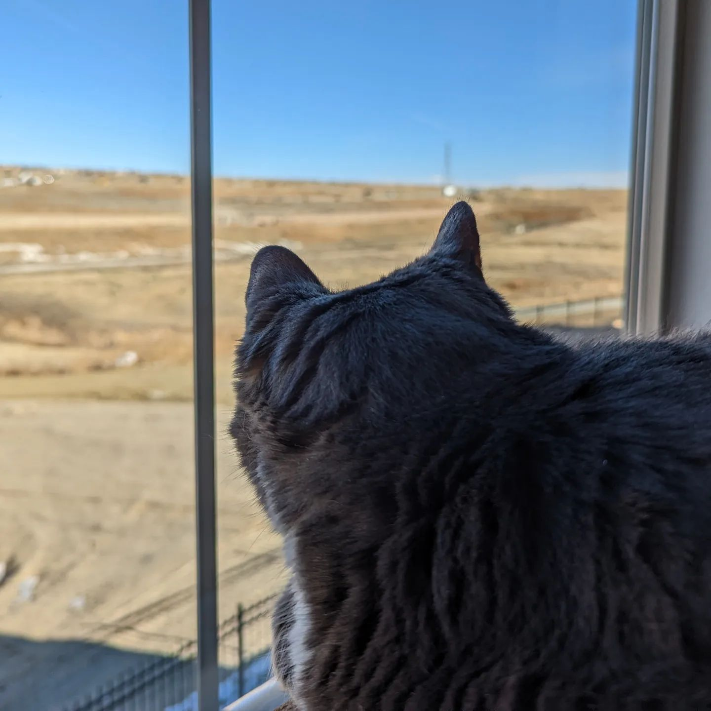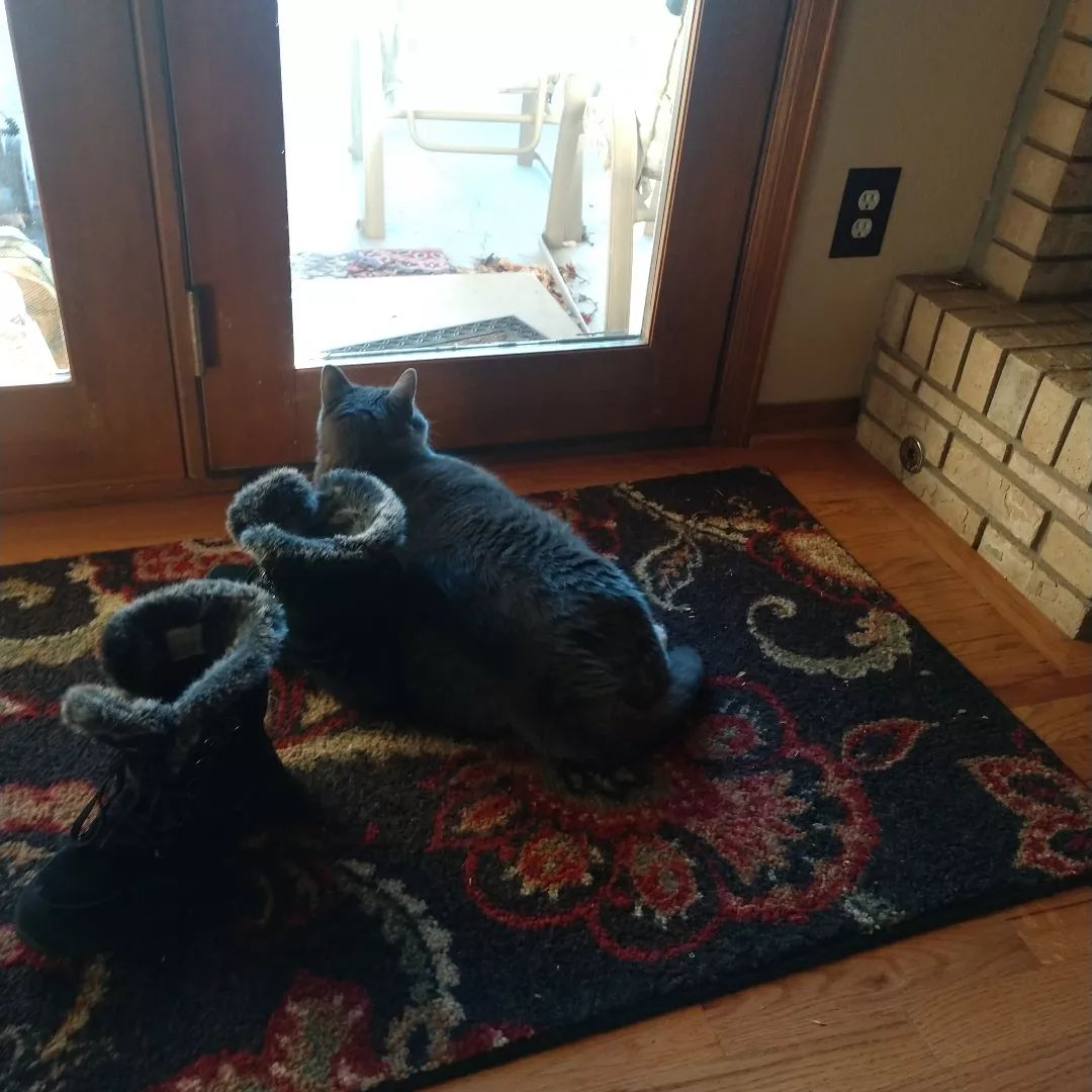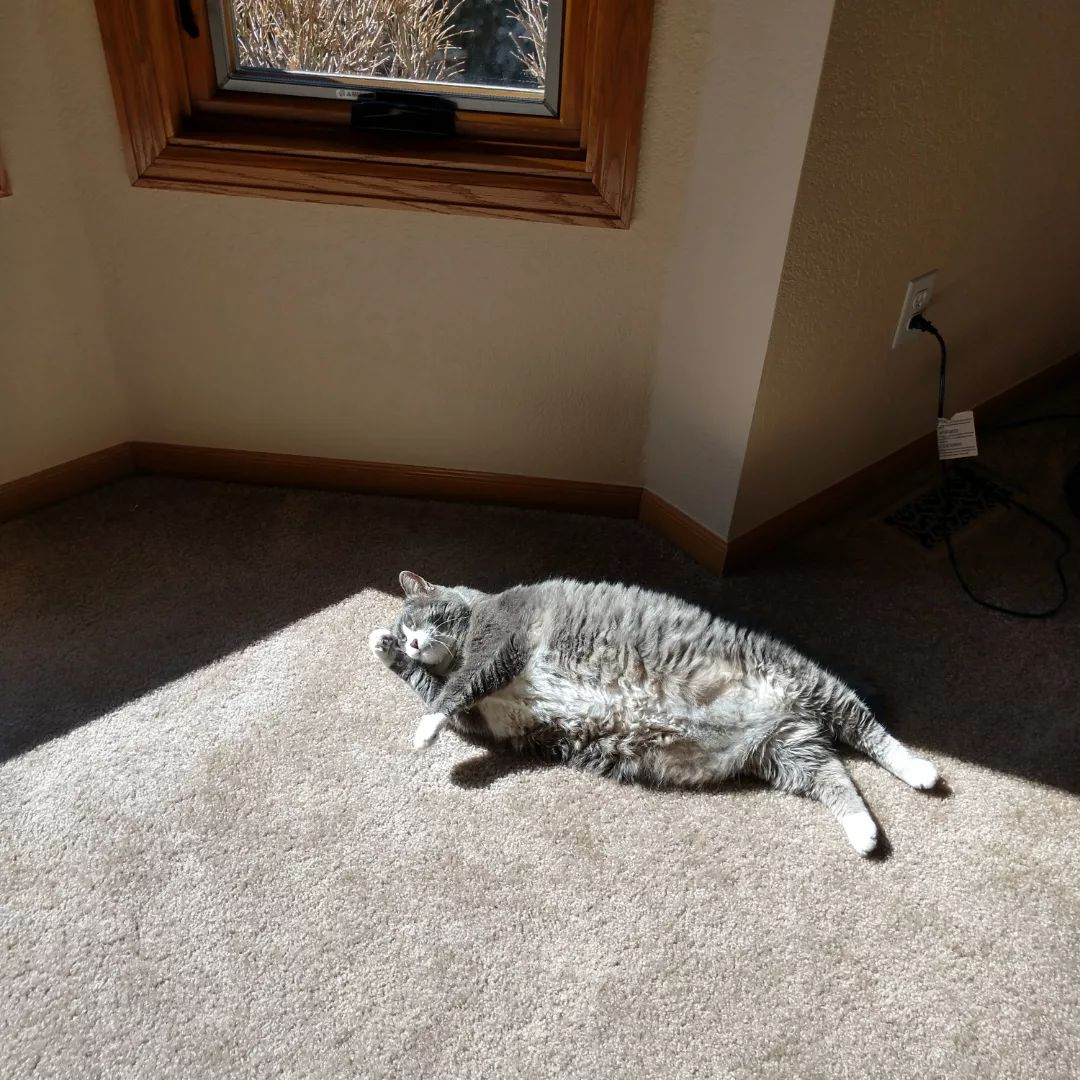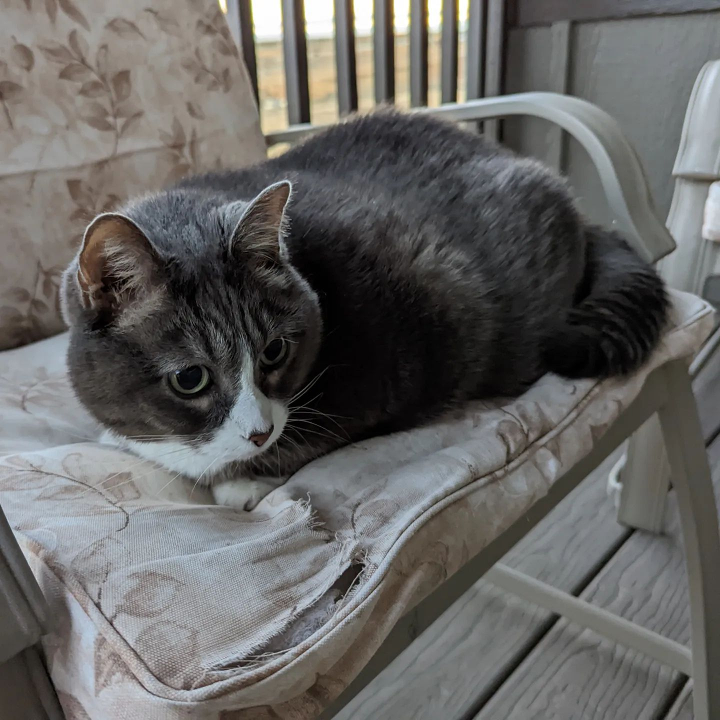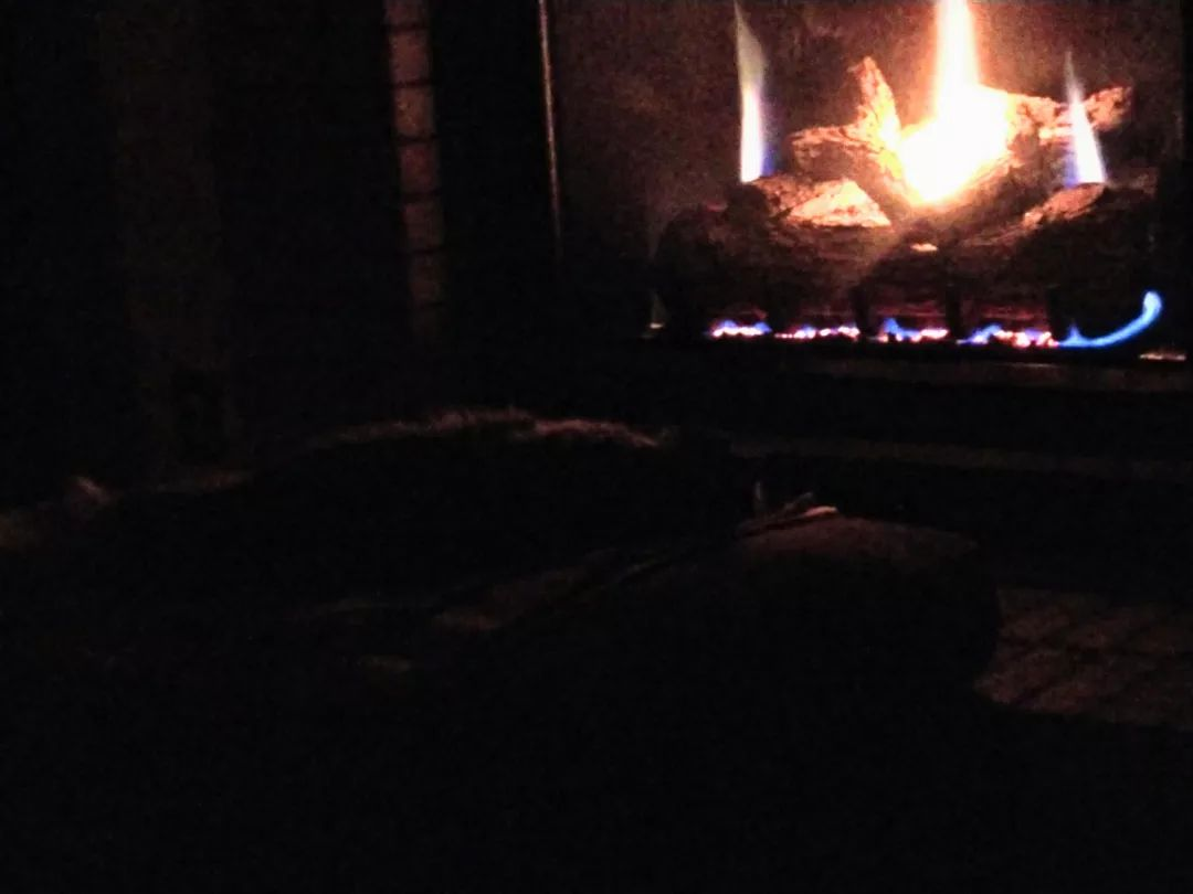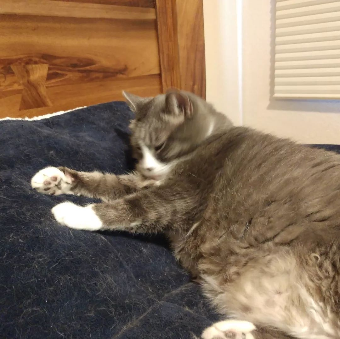 Loafing with a purpose. Ziggy is trying to toast on the woodbox, but it is only 38 deg outside (3.3 C)... but she will try to prove it's great and she doesn't need to come back inside. ????