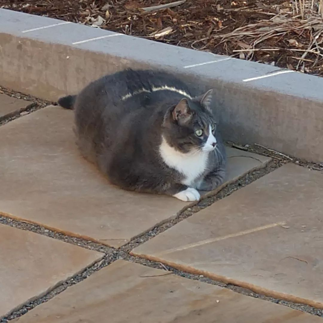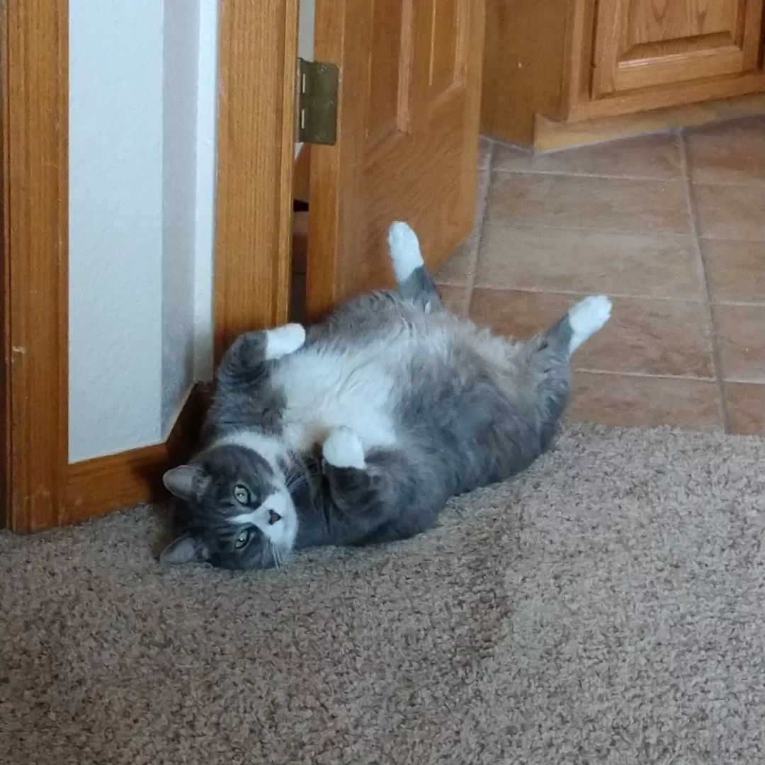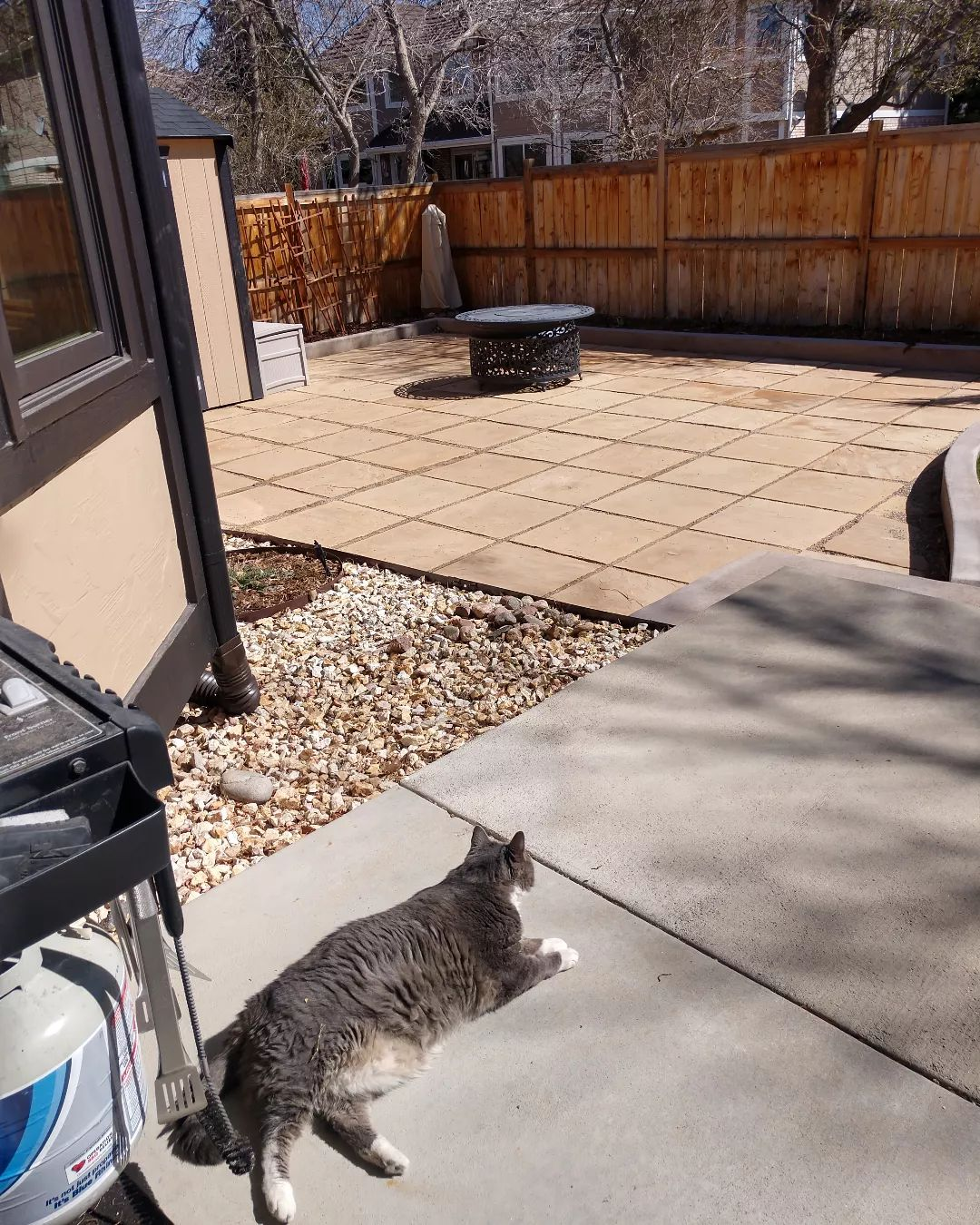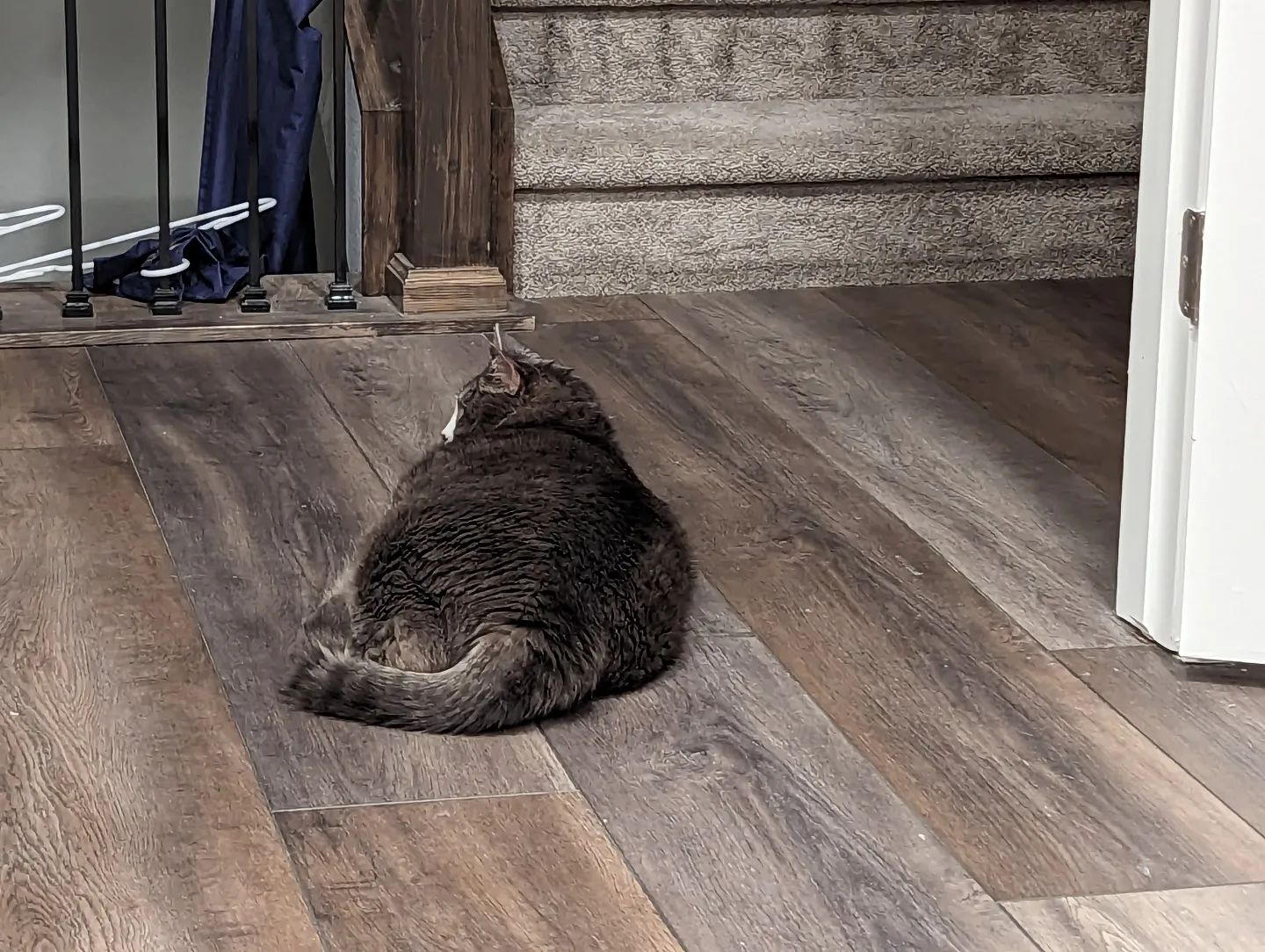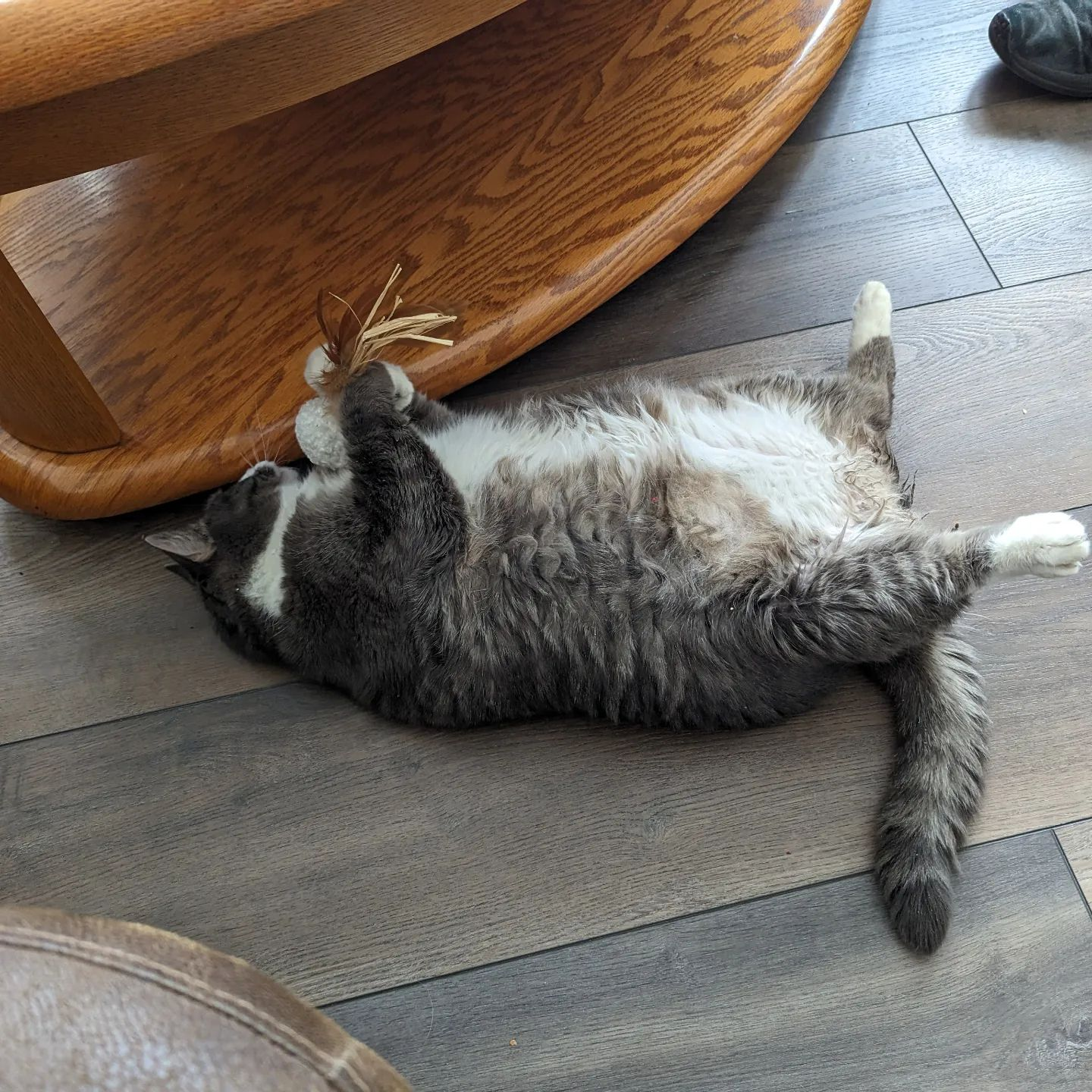 Loafing with a purpose. Ziggy is trying to toast on the woodbox, but it is only 38 deg outside (3.3 C)... but she will try to prove it's great and she doesn't need to come back inside. ????
