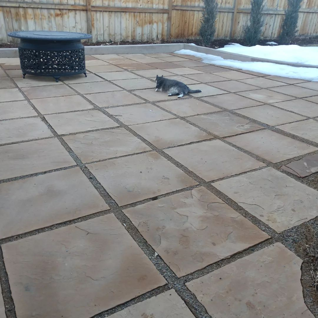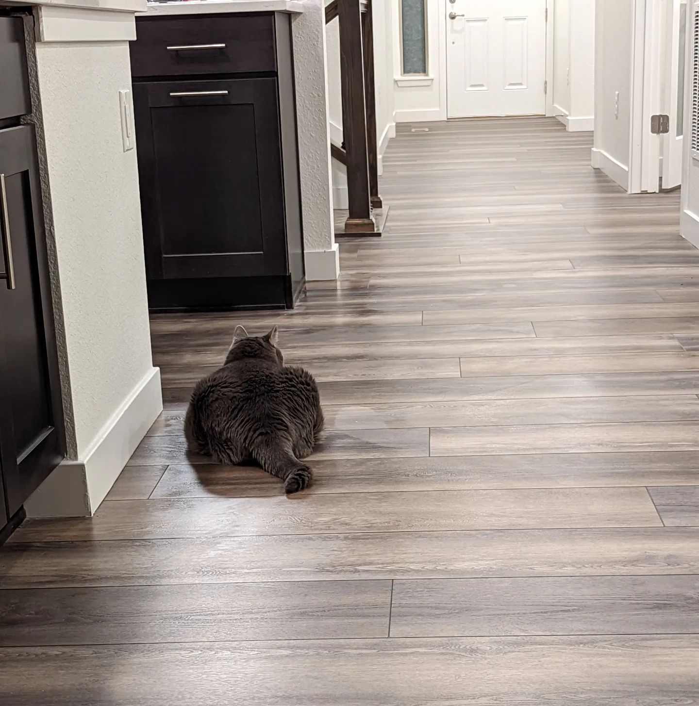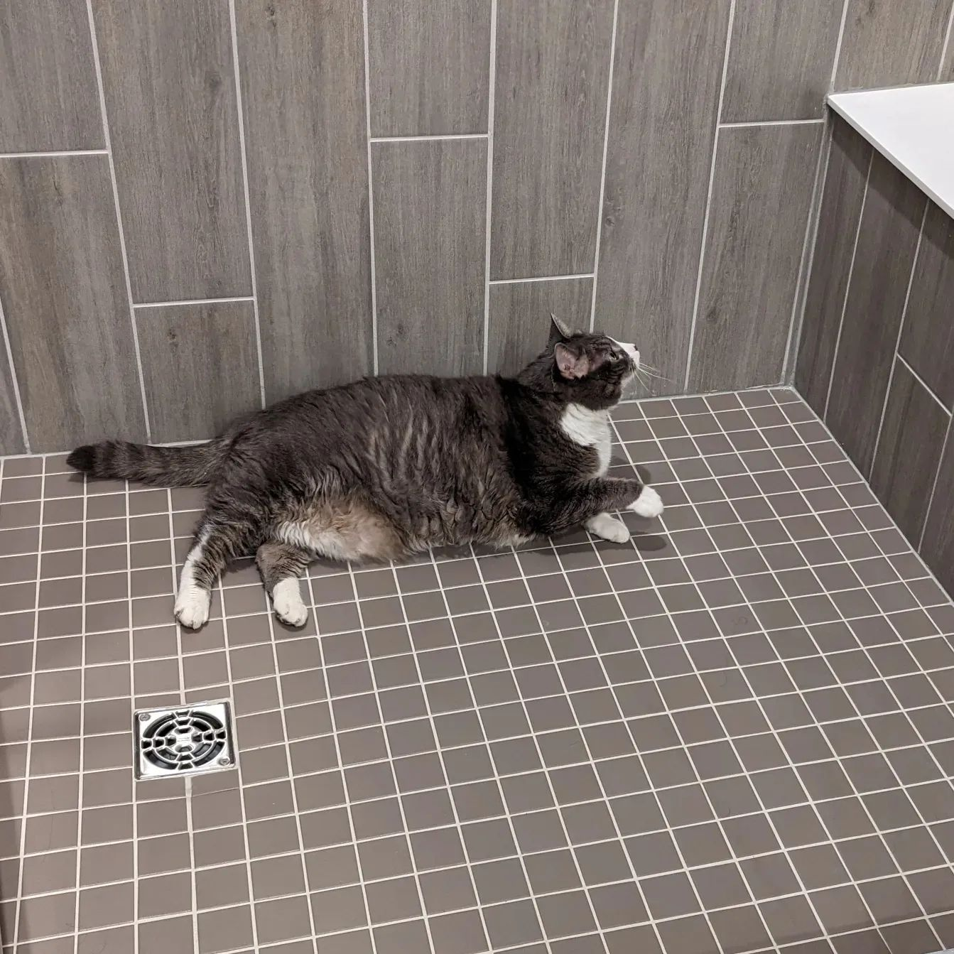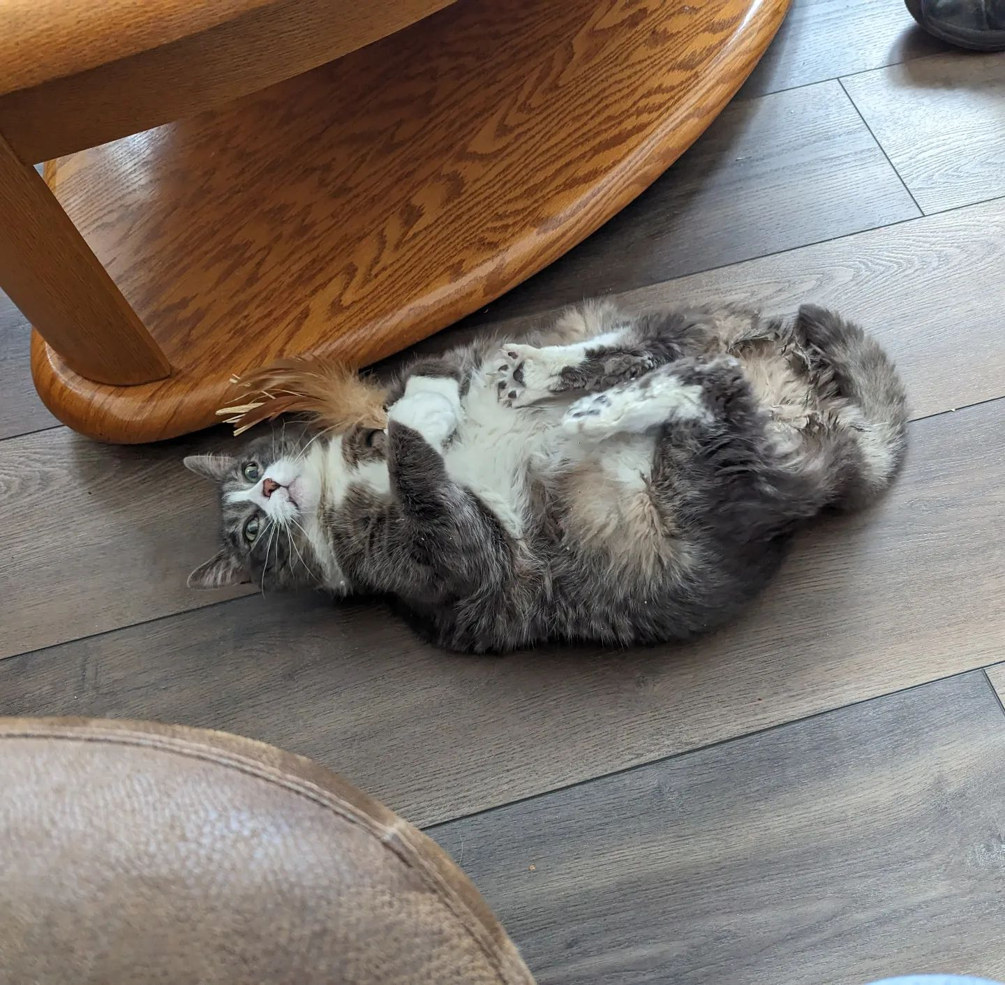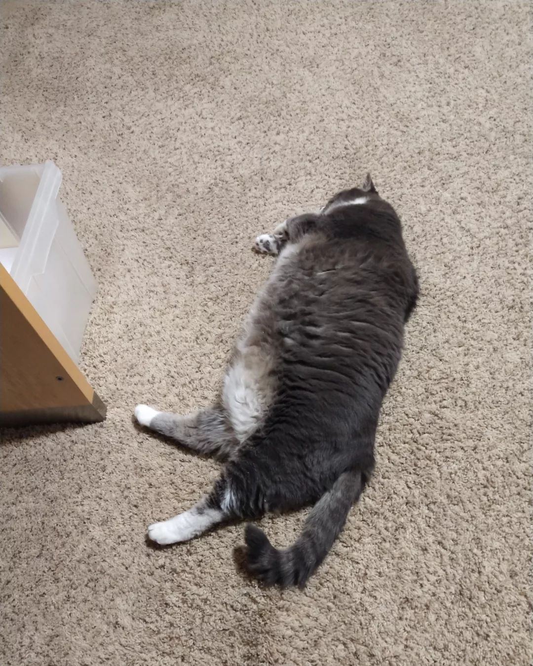 Loafing with a purpose. Ziggy is trying to toast on the woodbox, but it is only 38 deg outside (3.3 C)... but she will try to prove it's great and she doesn't need to come back inside. ????