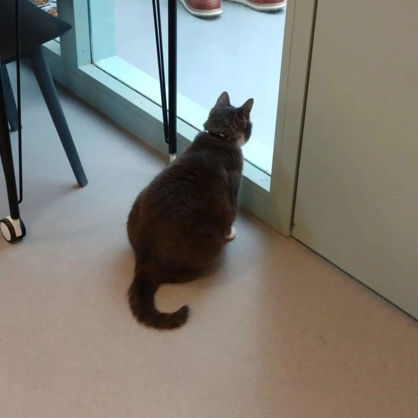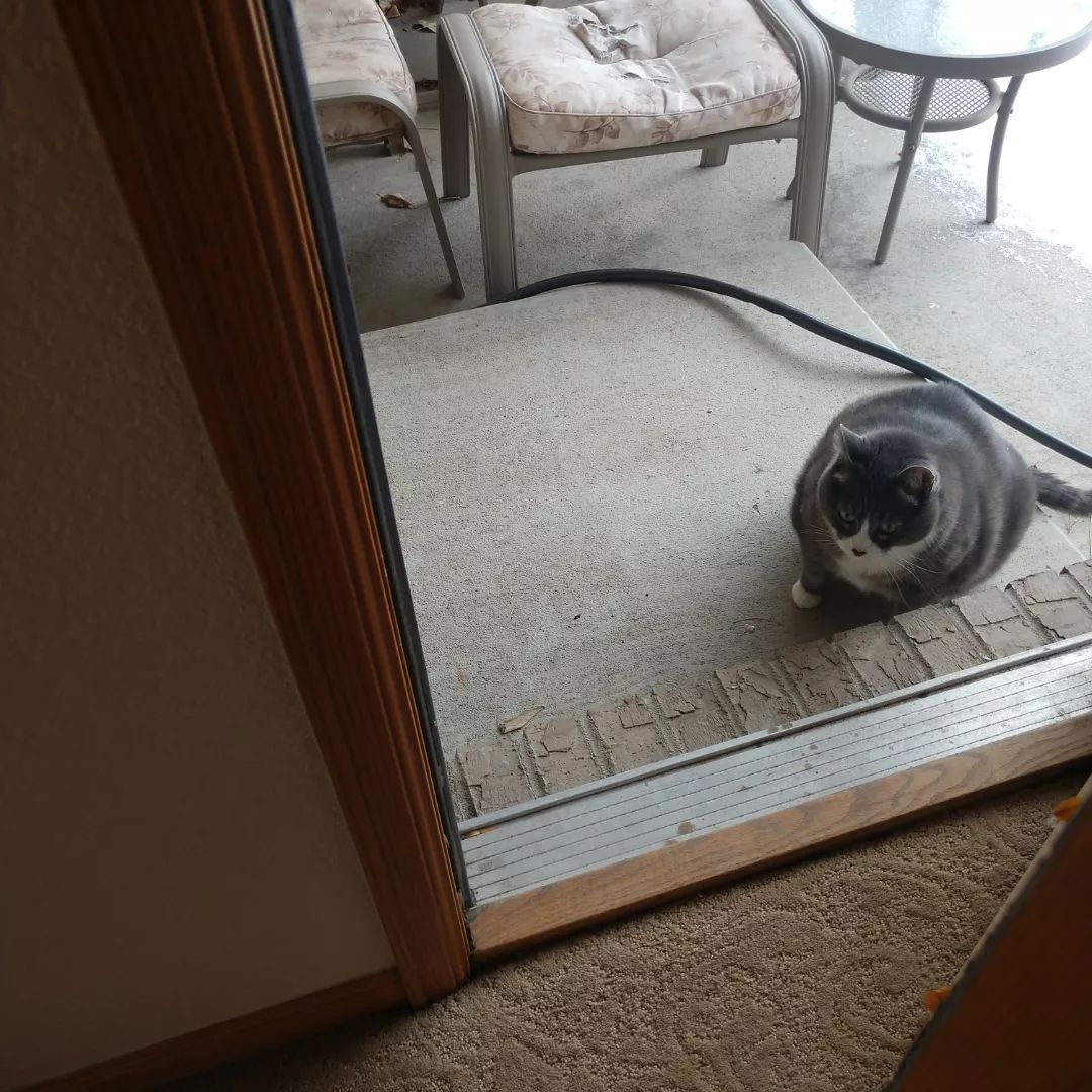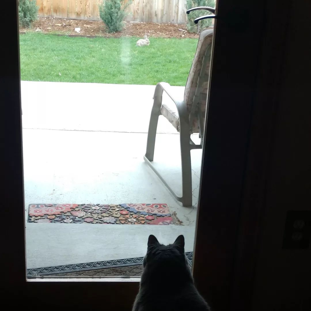 The brave kitten came by to visit this morning. Ziggy looks forward to seeing him every morning but isn't yet interested in having him inside.