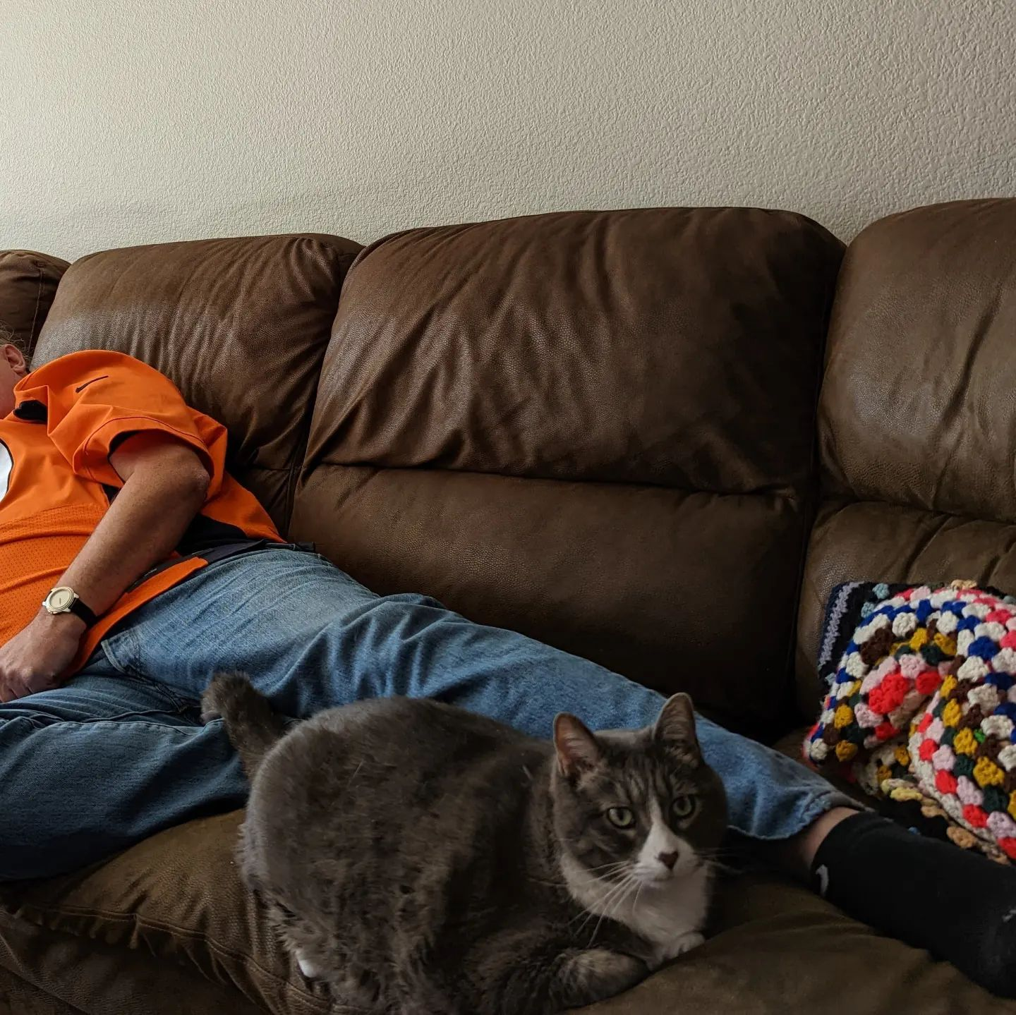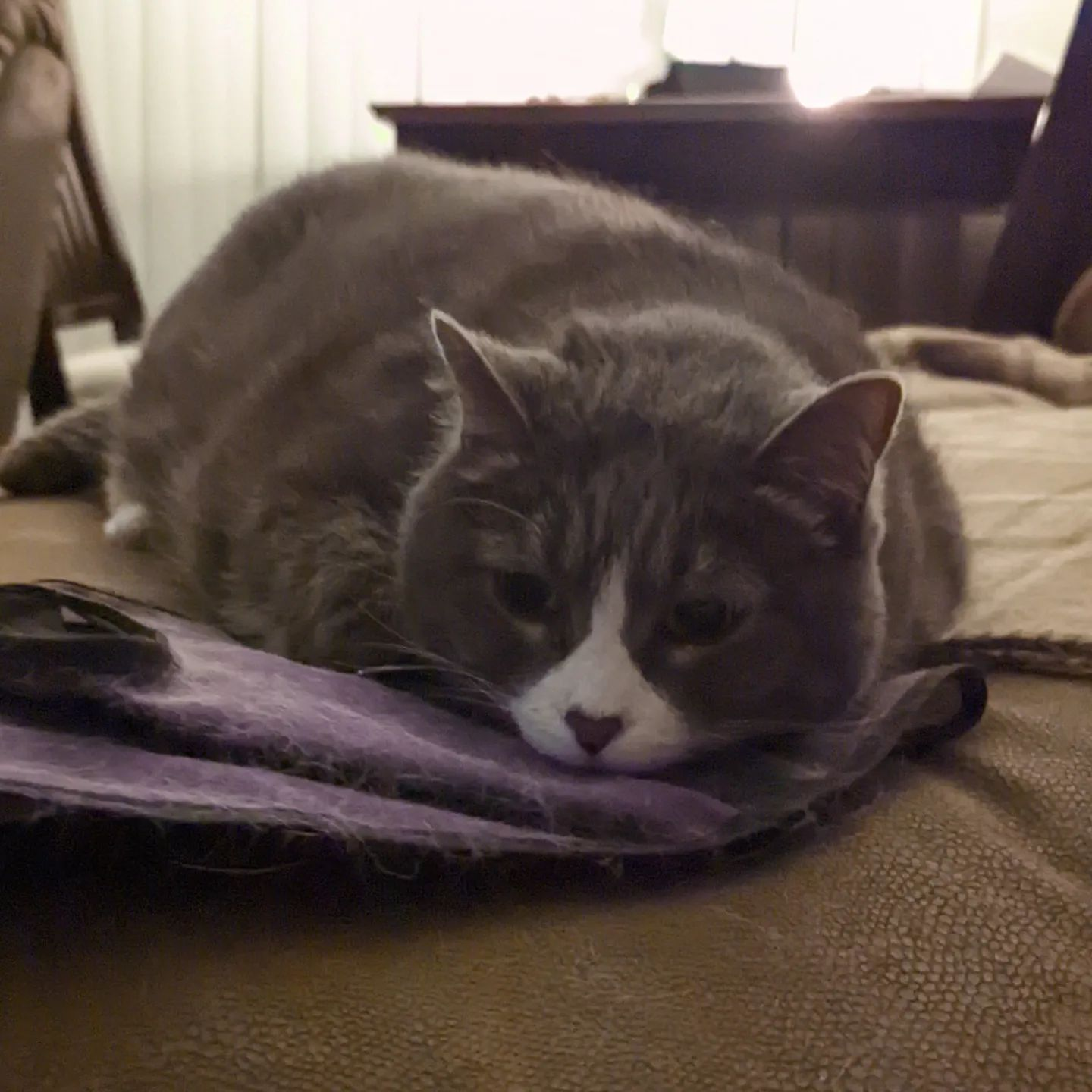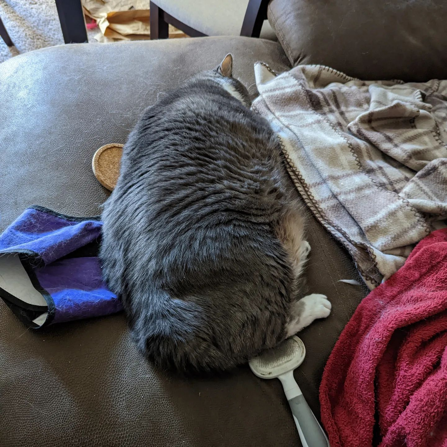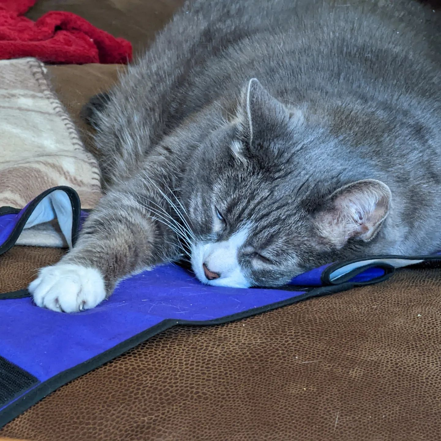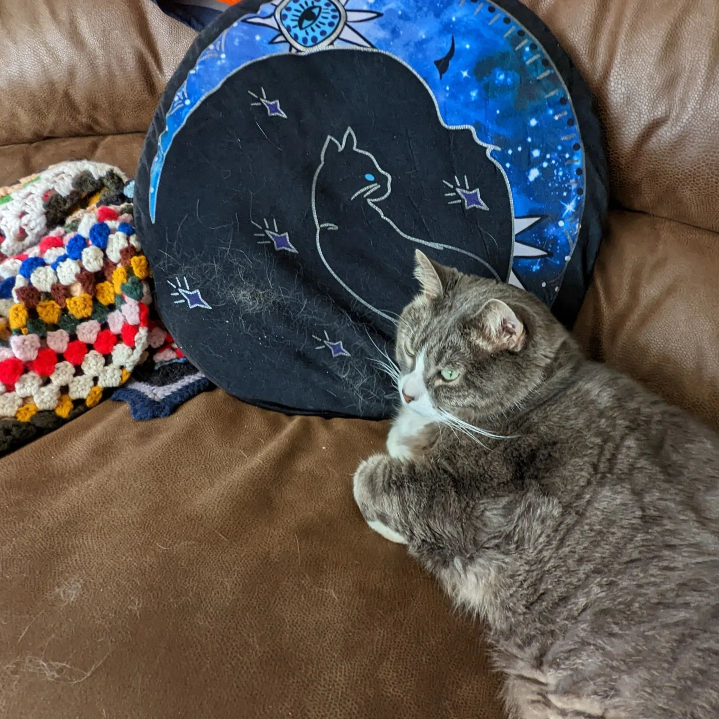 Cat condo as pillow.... Ziggy is not pleased that my hubby is sick and I am working. "Stupid everything"