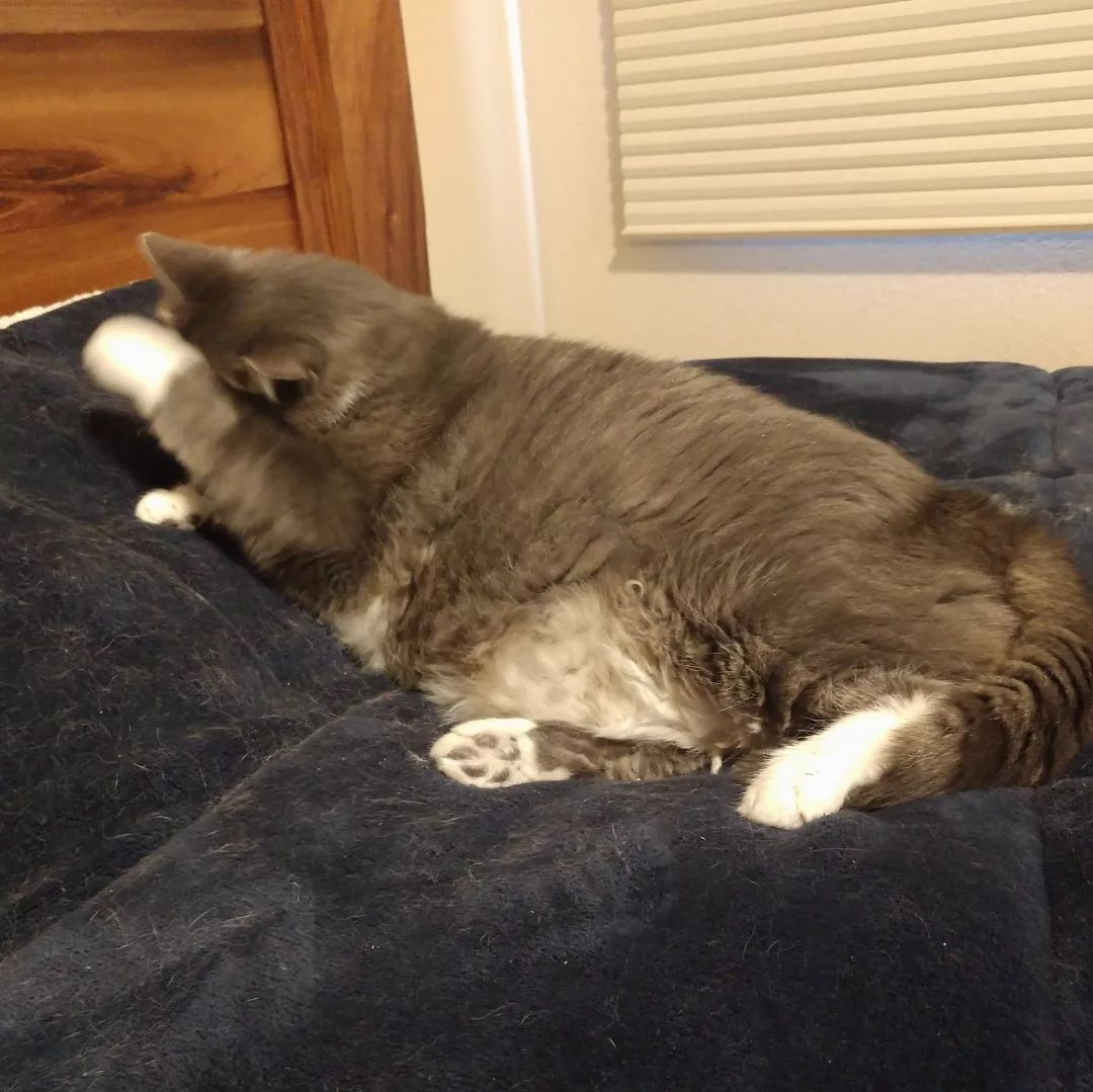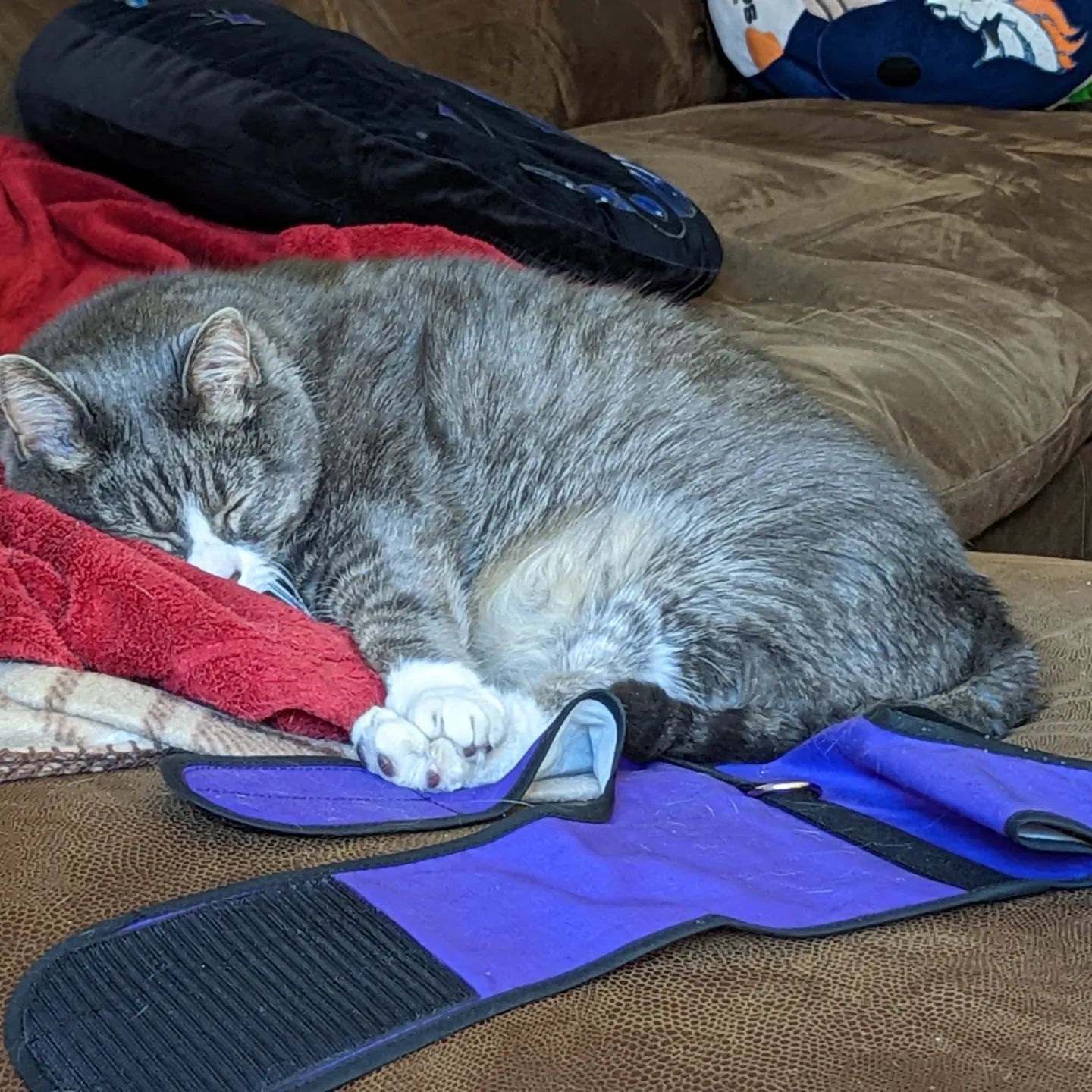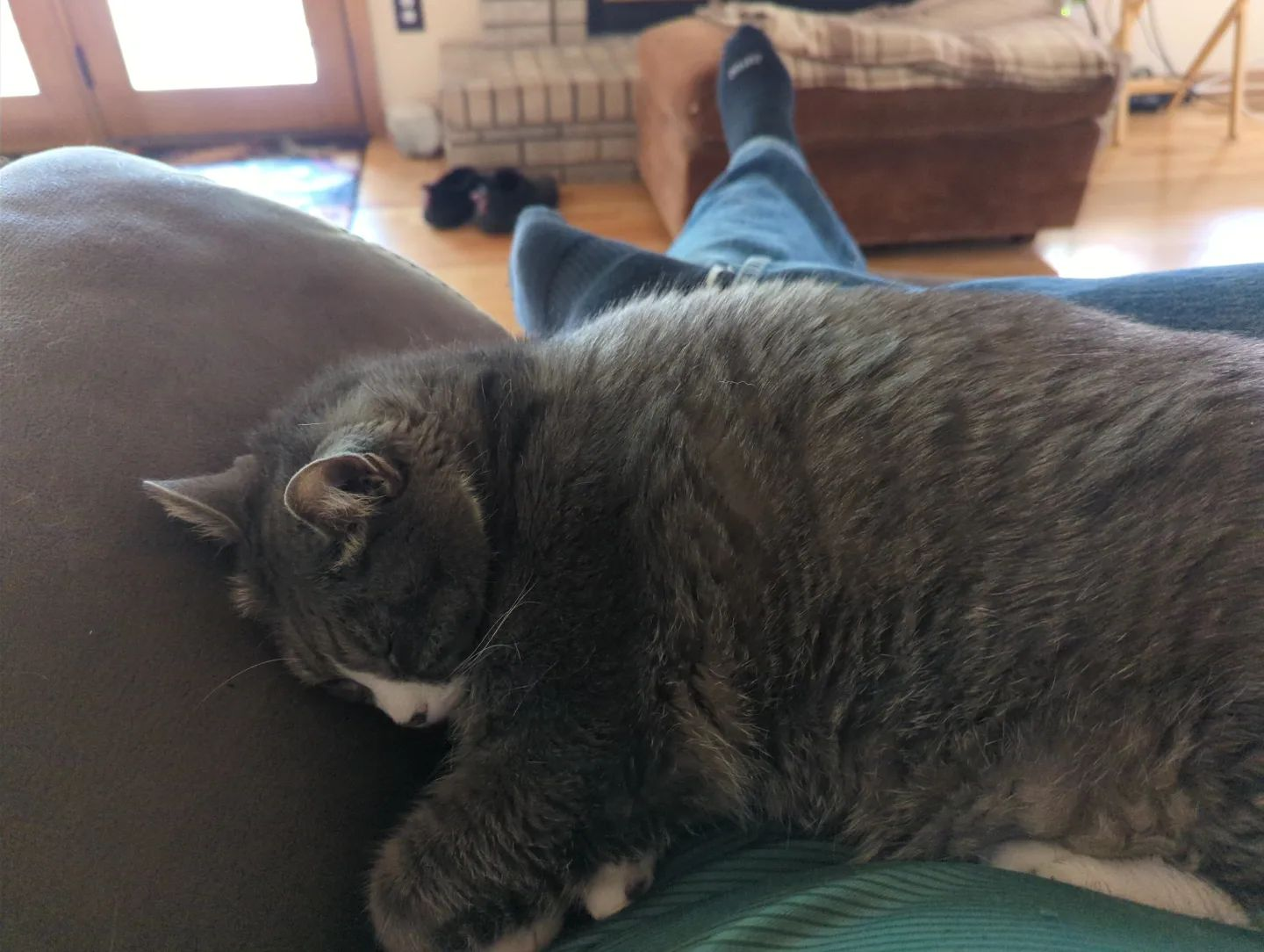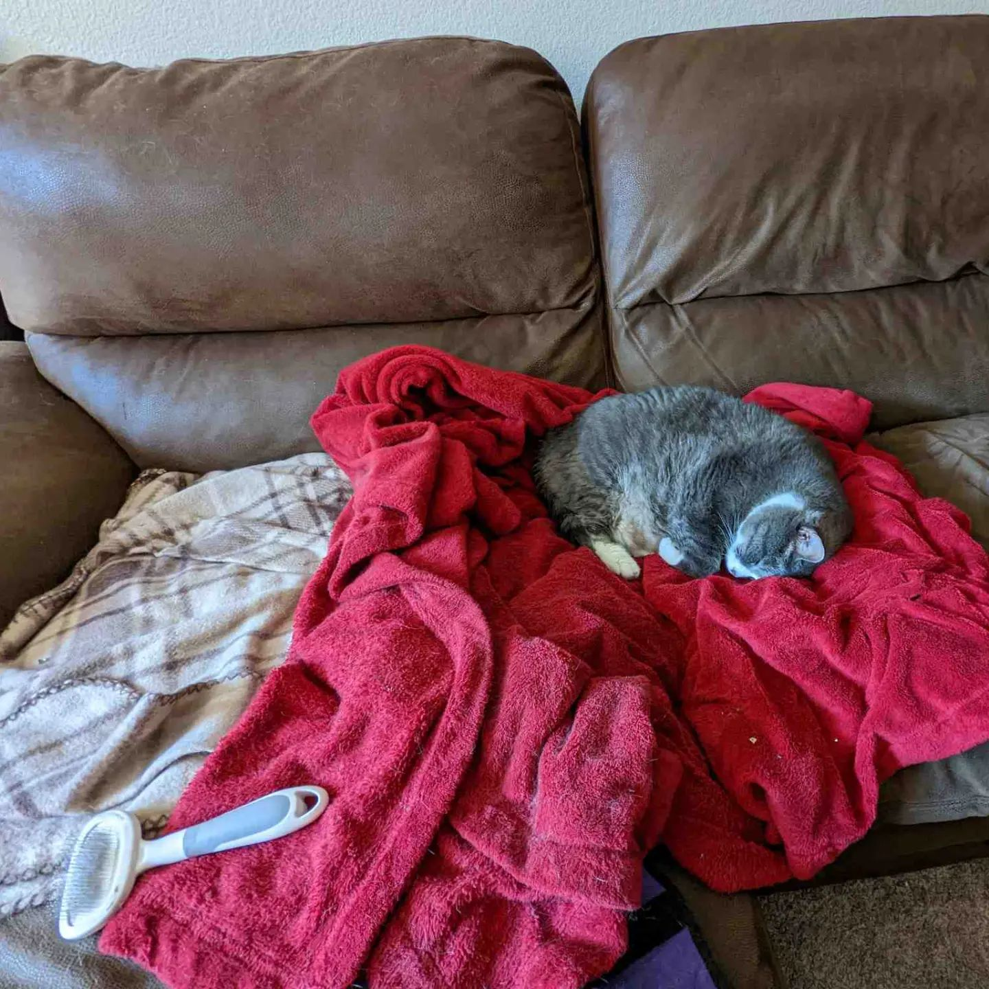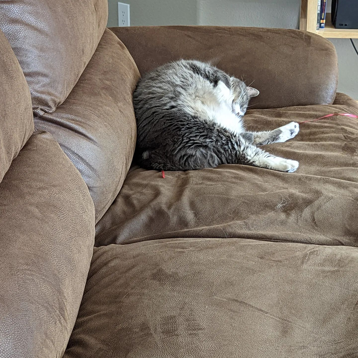 Cat condo as pillow.... Ziggy is not pleased that my hubby is sick and I am working. "Stupid everything"