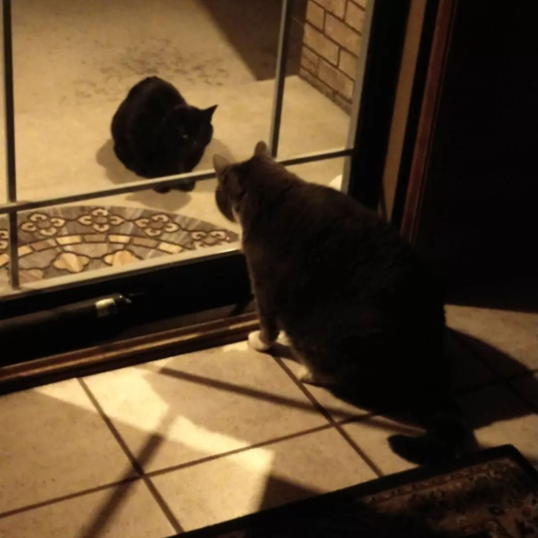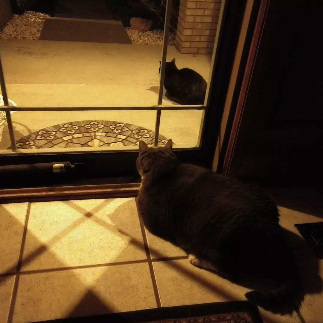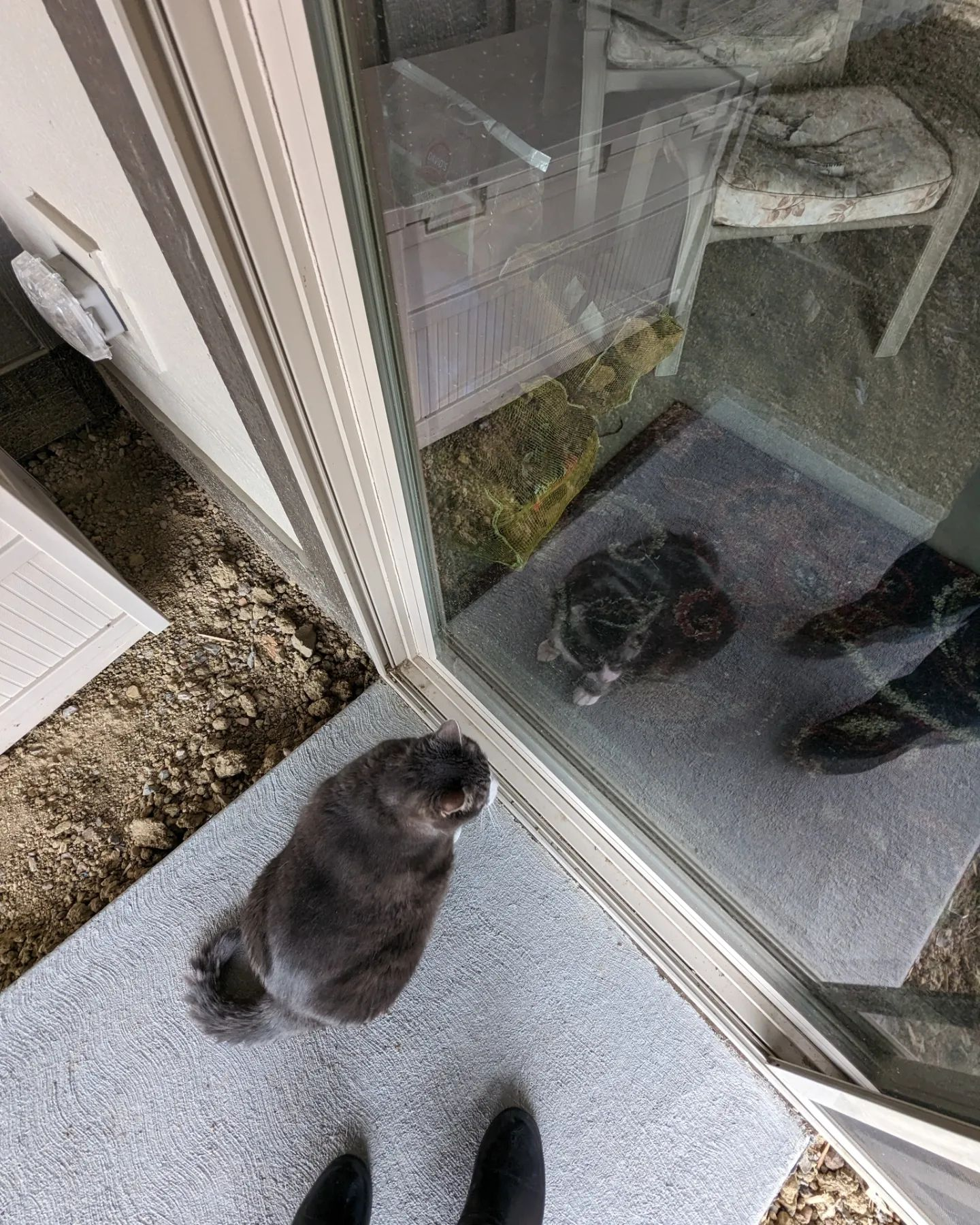 The brave kitten came by to have a chat with Ziggy. Growls gave way to chirps and loafing, and it seemed to end in a friendly manner. I can only assume he said, "I apologize for my brother's behavior earlier. He can be a bit of a hothead. Calling you an old lady was inappropriate."